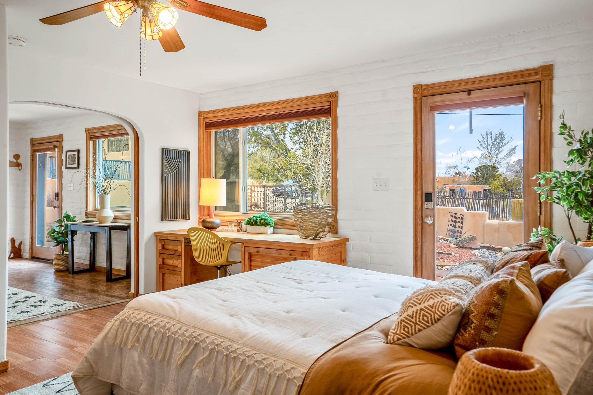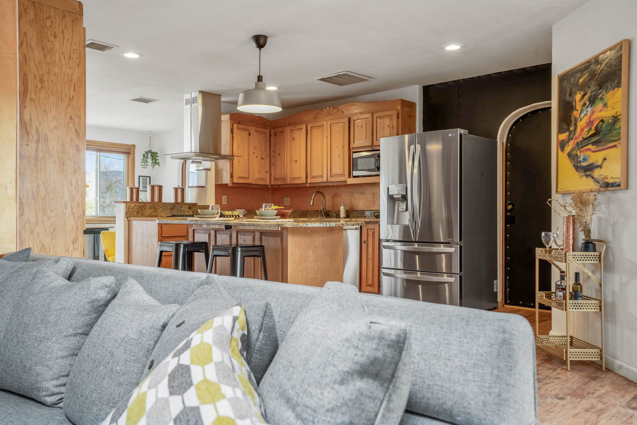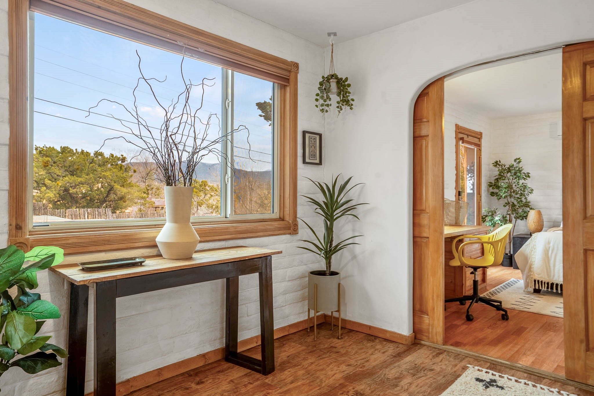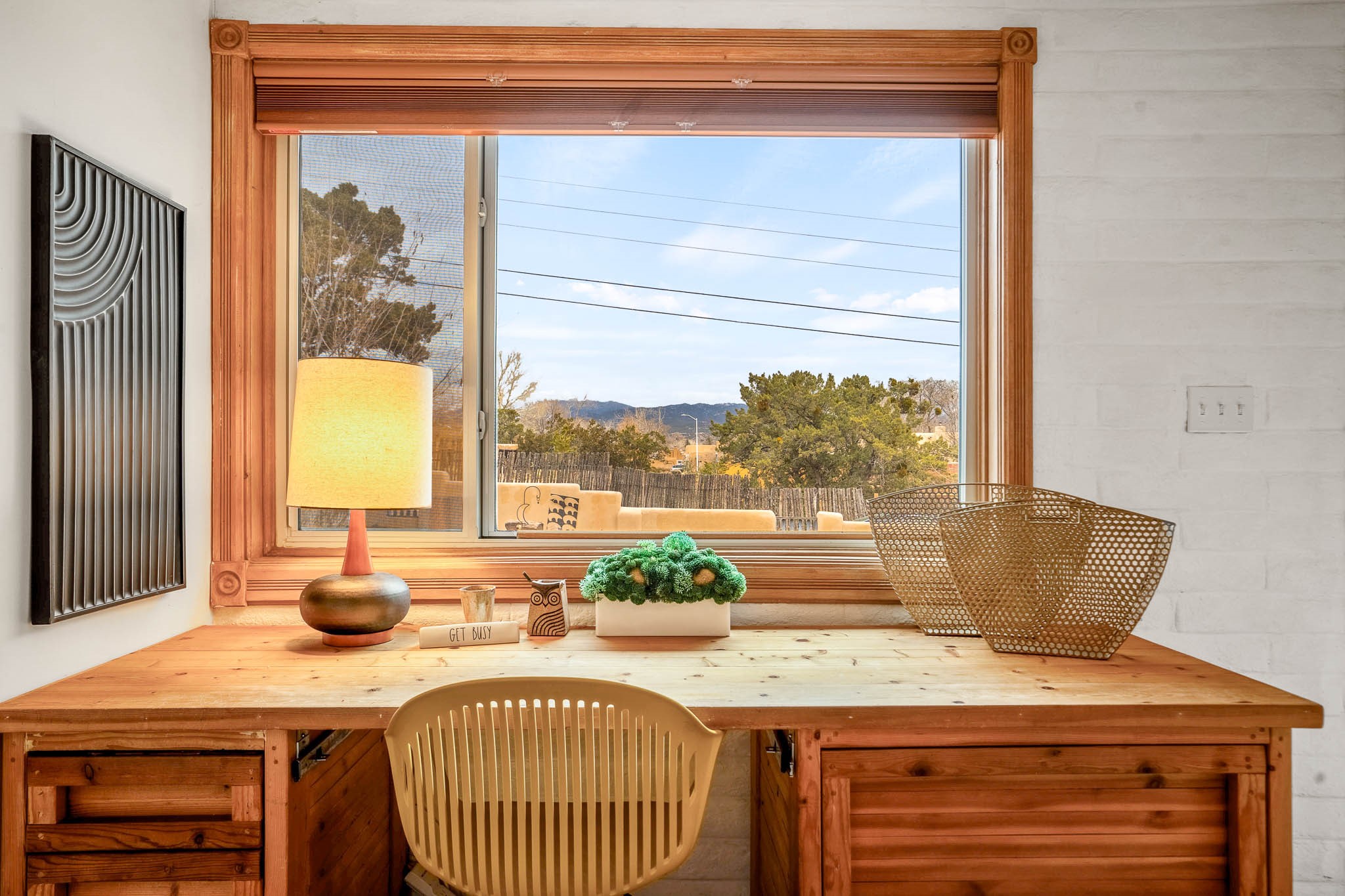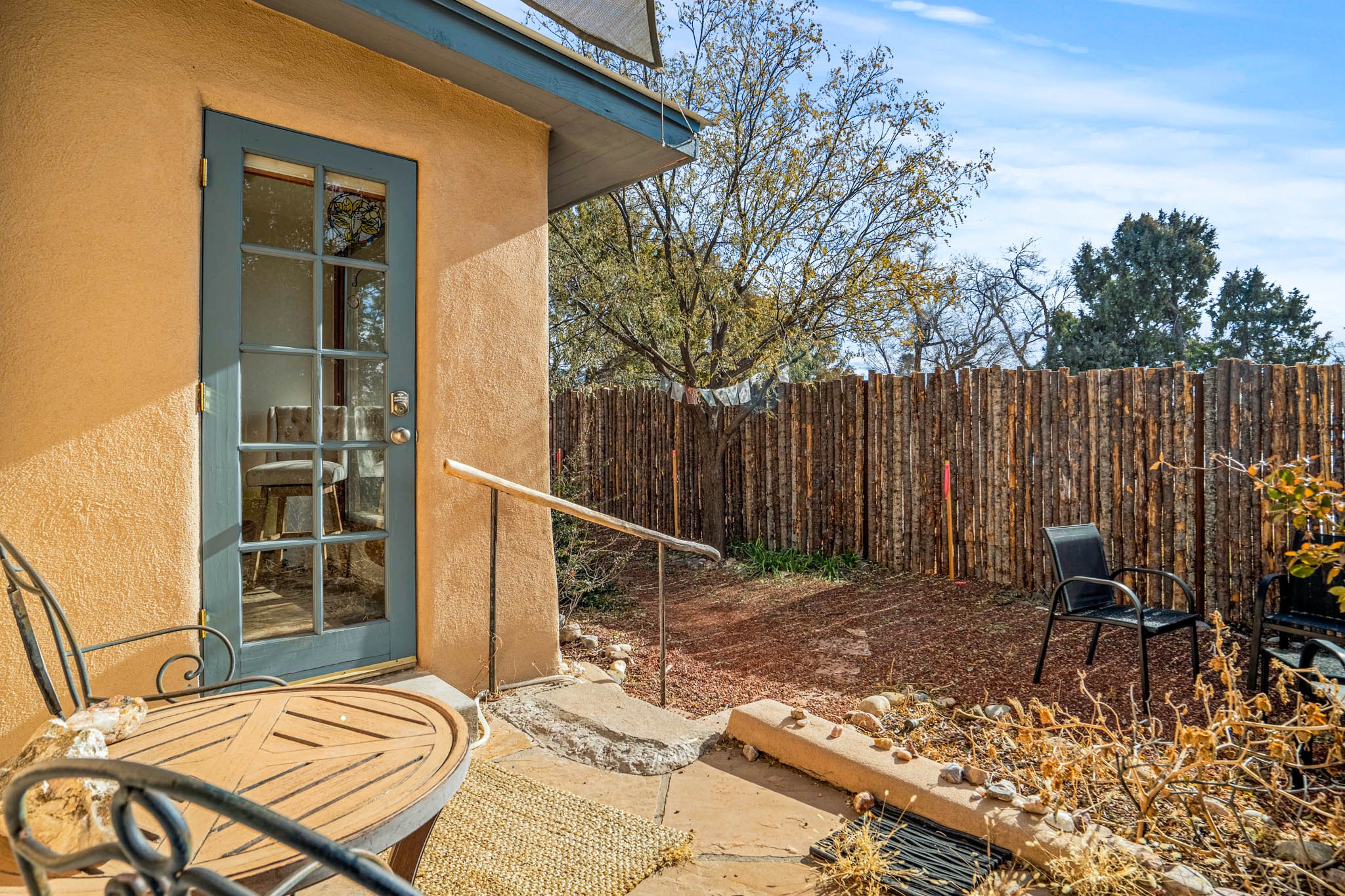 Just minutes from the Plaza, this charming 1,385 sq. ft. home offers the perfect blend of Southwestern character, modern updates, and exceptional flexibility. Set on a spacious lot with views of the Sangre de Cristo Mountains, the property provides easy access to the Ortiz Dog Park, River Trail, and the Co-op. The 1089 sq. ft. main house features an inviting open-concept design with a renovated kitchen, complete with granite countertops, an island, and a cozy living room with an artistic wood-burning fireplace. The primary suite enjoys mountain views, a bathroom, and a generous walk-in shower. An attached one-car garage adds convenience. Currently configured as a home with an attached 305 sq. ft. studio casita--rented on a monthly basis--the property offers great investment potential. The casita includes a full bathroom, kitchenette, and private entrance, making it ideal as a guest space or rental. With a simple modification, the home can easily be converted back to a two-bedroom, three-bathroom residence. This unique property offers a great downtown location, mountain views, and flexible living options--a rare opportunity in the heart of Santa Fe