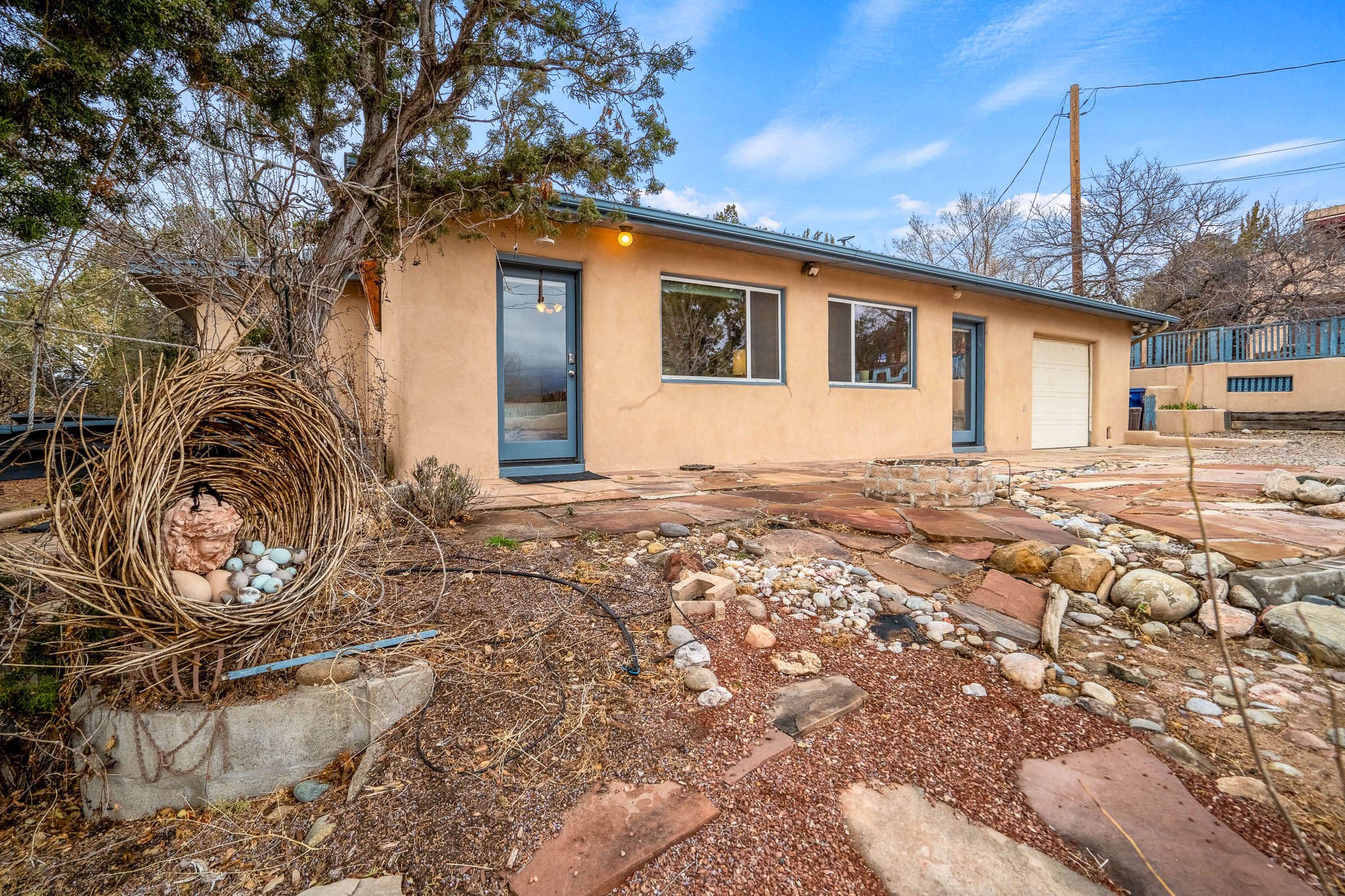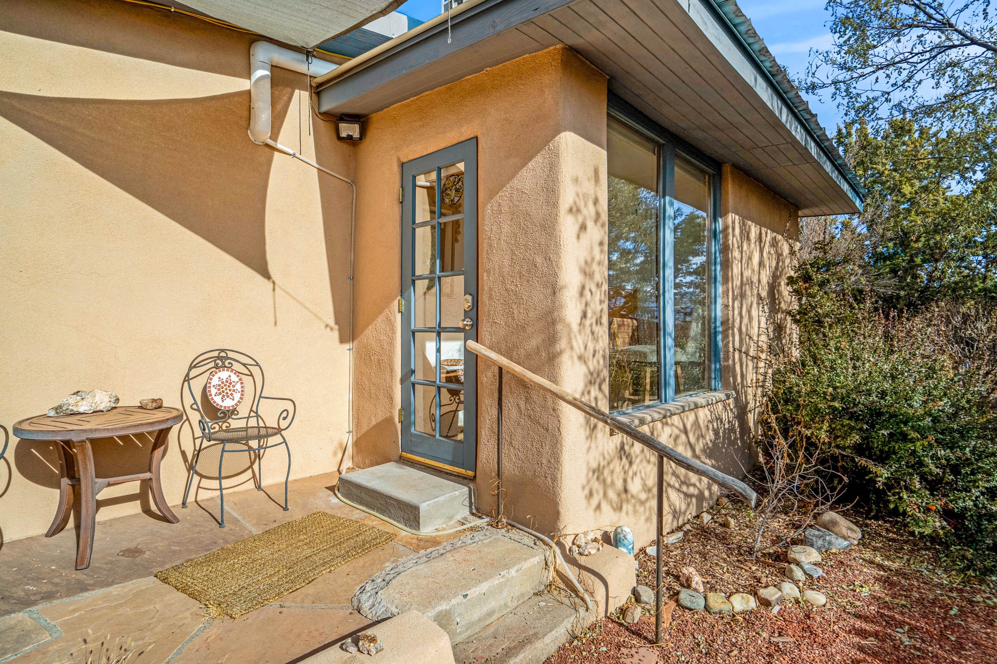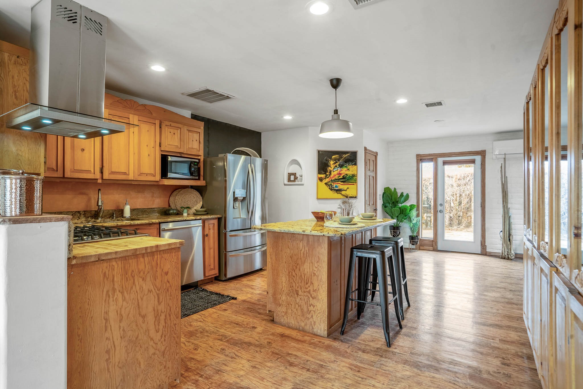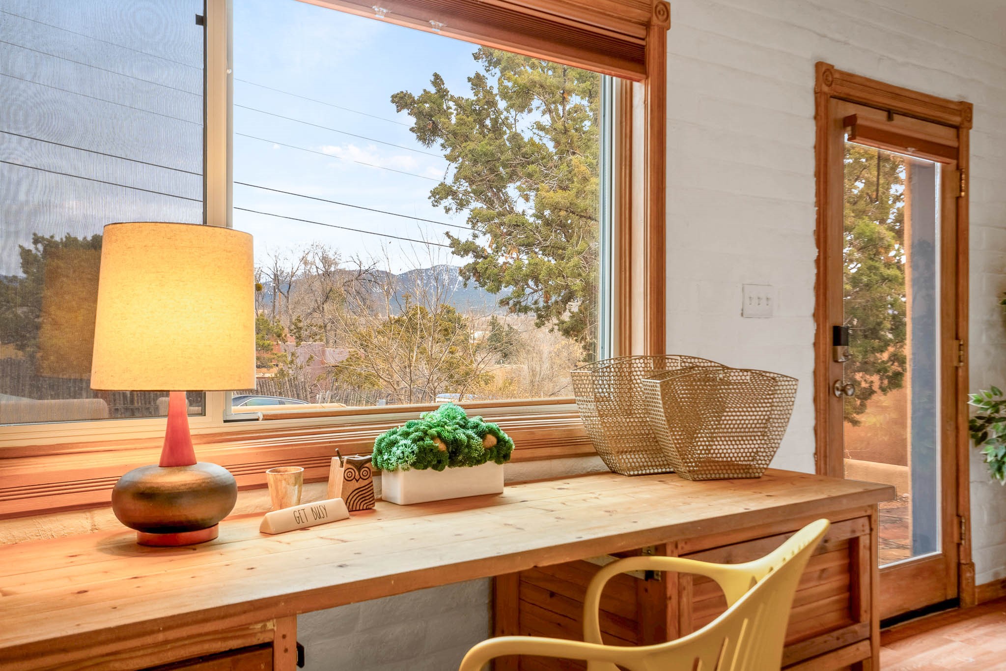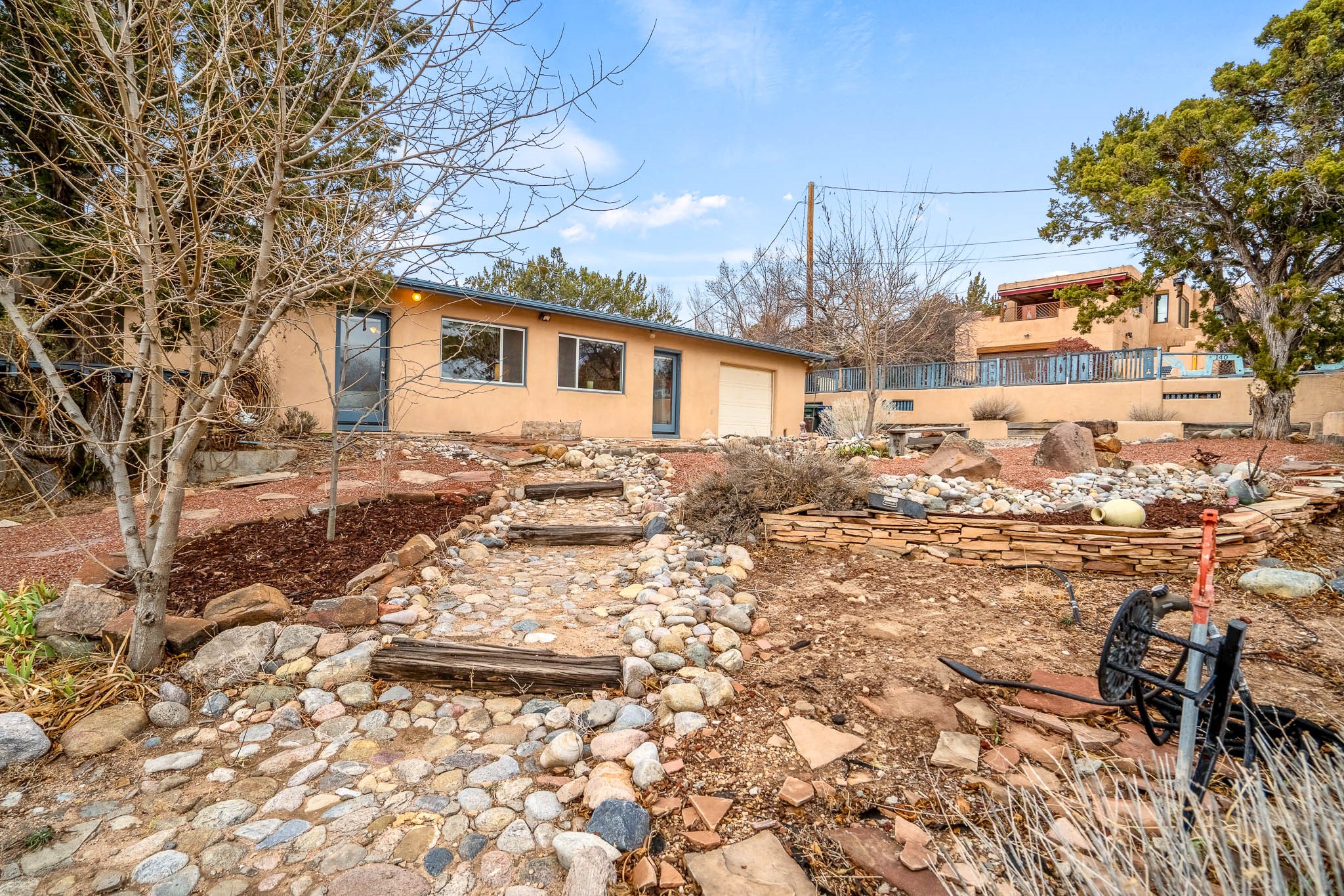 Just minutes from the Plaza, this charming 1,385 sq. ft. home offers the perfect blend of Southwestern character, modern updates, and exceptional flexibility. Set on a spacious lot with views of the Sangre de Cristo Mountains, the property provides easy access to the Ortiz Dog Park, River Trail, and the Co-op. The 1089 sq. ft. main house features an inviting open-concept design with a renovated kitchen, complete with granite countertops, an island, and a cozy living room with an artistic wood-burning fireplace. The primary suite enjoys mountain views, a bathroom, and a generous walk-in shower. An attached one-car garage adds convenience. Currently configured as a home with an attached 305 sq. ft. studio casita--rented on a monthly basis--the property offers great investment potential. The casita includes a full bathroom, kitchenette, and private entrance, making it ideal as a guest space or rental. With a simple modification, the home can easily be converted back to a two-bedroom, three-bathroom residence. This unique property offers a great downtown location, mountain views, and flexible living options--a rare opportunity in the heart of Santa Fe