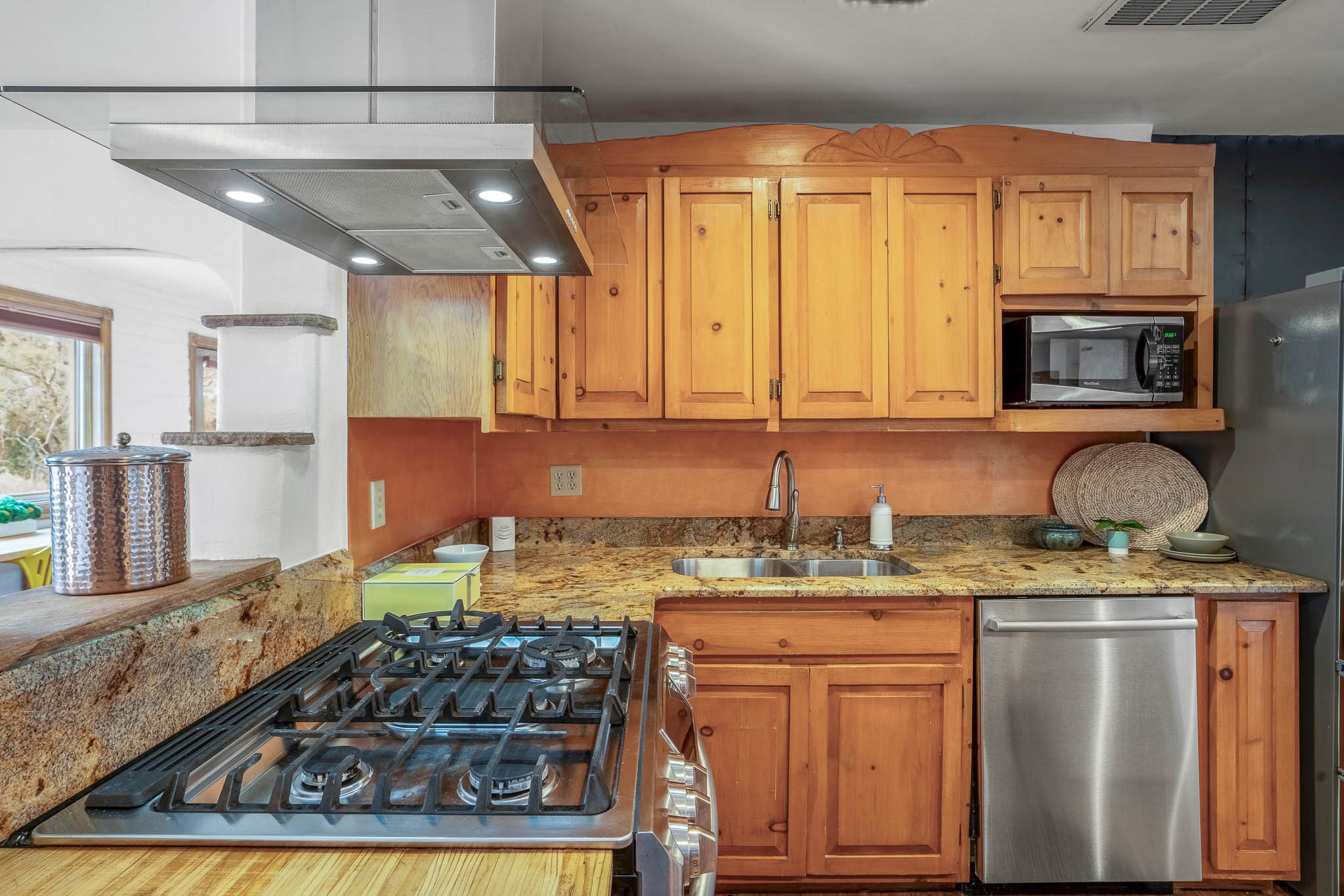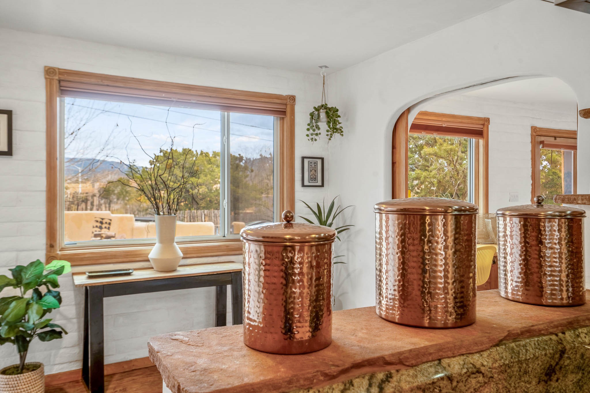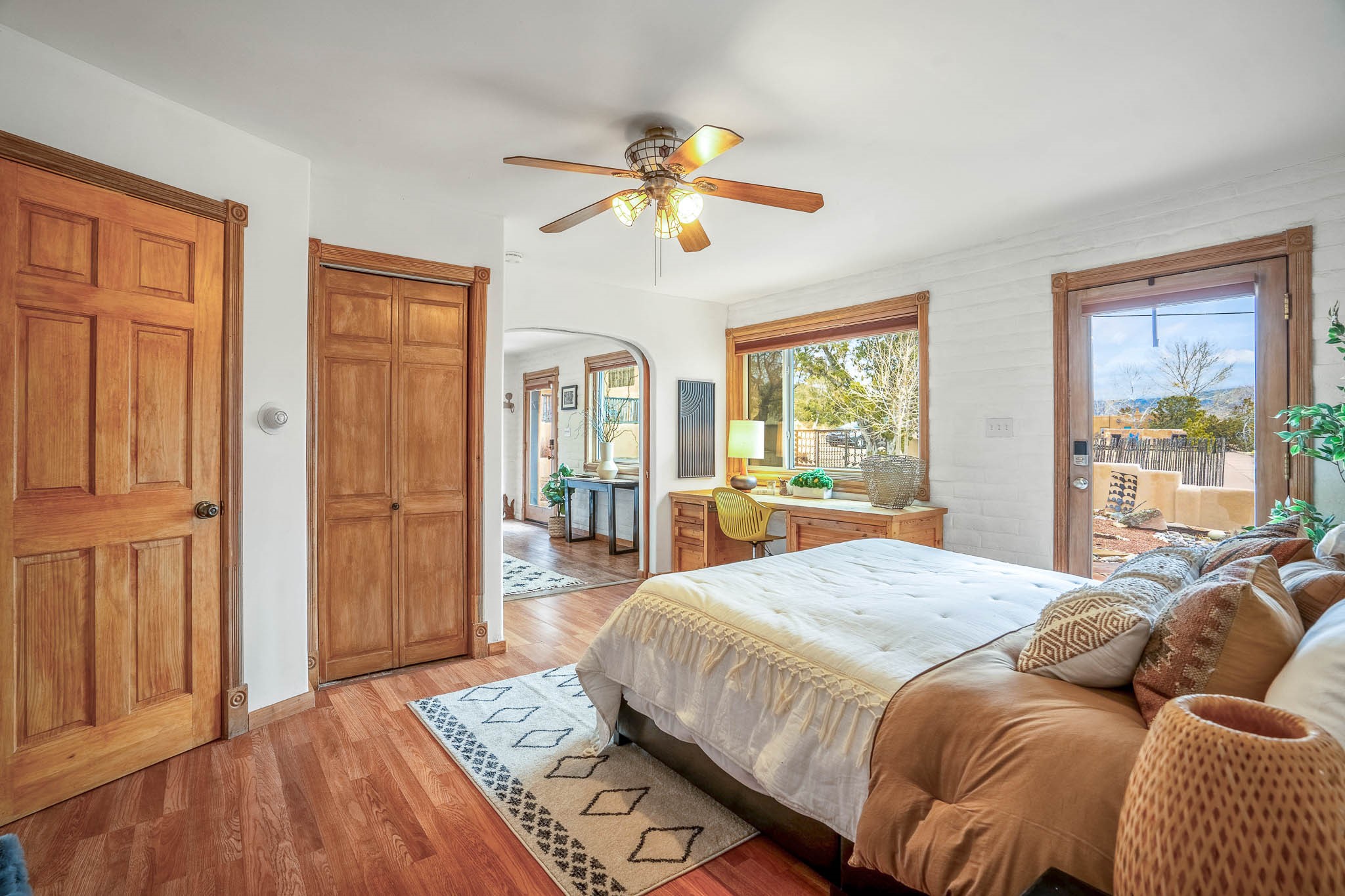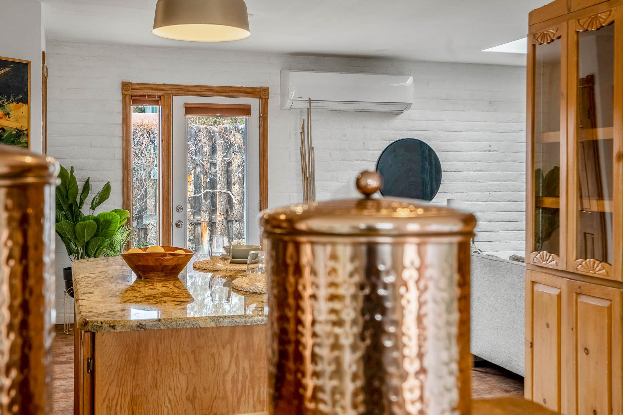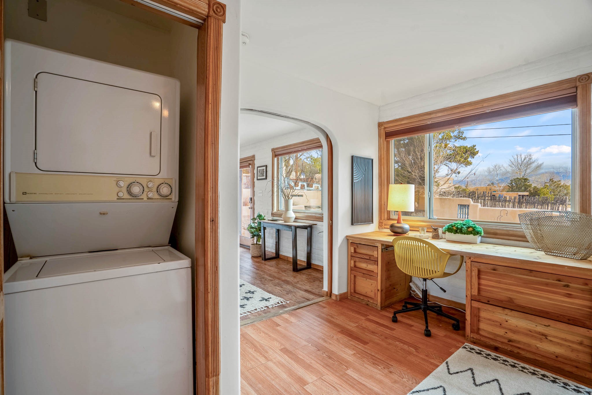Just minutes from the Plaza, this charming 1,385 sq. ft. home offers the perfect blend of Southwestern character, modern updates, and exceptional flexibility. Set on a spacious lot with views of the Sangre de Cristo Mountains, the property provides easy access to the Ortiz Dog Park, River Trail, and the Co-op. The 1089 sq. ft. main house features an inviting open-concept design with a renovated kitchen, complete with granite countertops, an island, and a cozy living room with an artistic wood-burning fireplace. The primary suite enjoys mountain views, a bathroom, and a generous walk-in shower. An attached one-car garage adds convenience. Currently configured as a home with an attached 305 sq. ft. studio casita--rented on a monthly basis--the property offers great investment potential. The casita includes a full bathroom, kitchenette, and private entrance, making it ideal as a guest space or rental. With a simple modification, the home can easily be converted back to a two-bedroom, three-bathroom residence. This unique property offers a great downtown location, mountain views, and flexible living options--a rare opportunity in the heart of Santa Fe