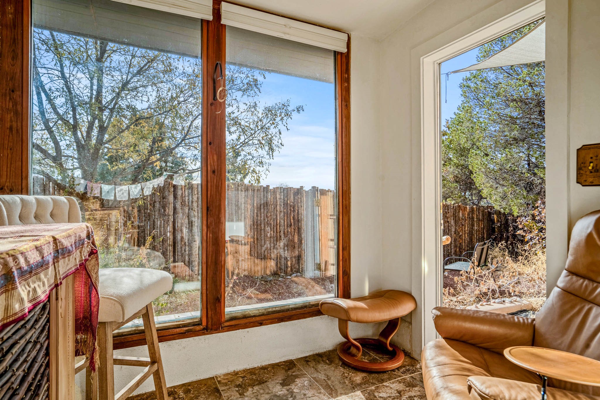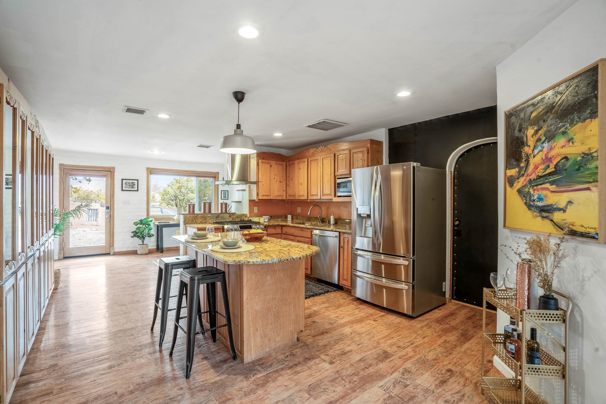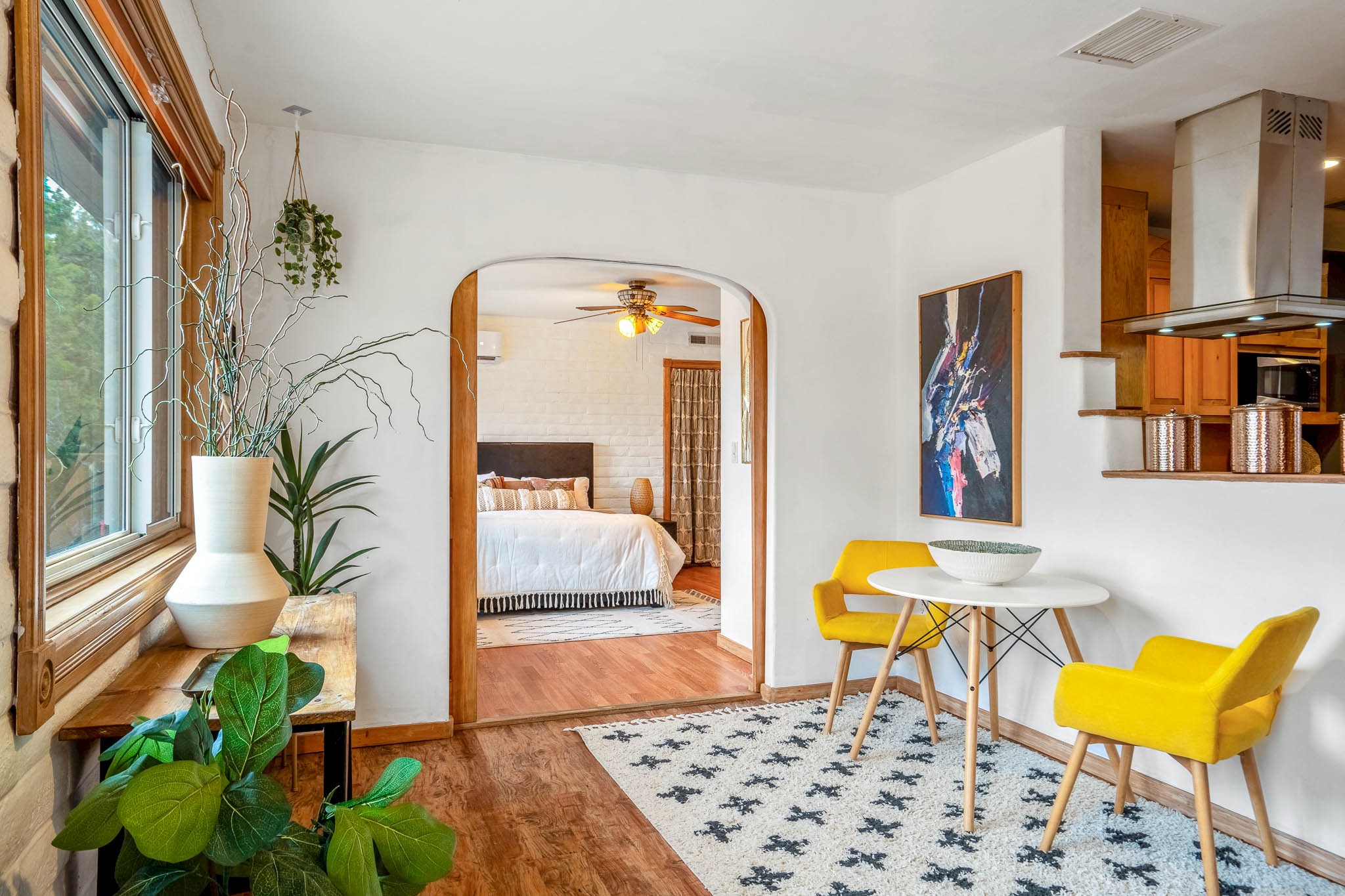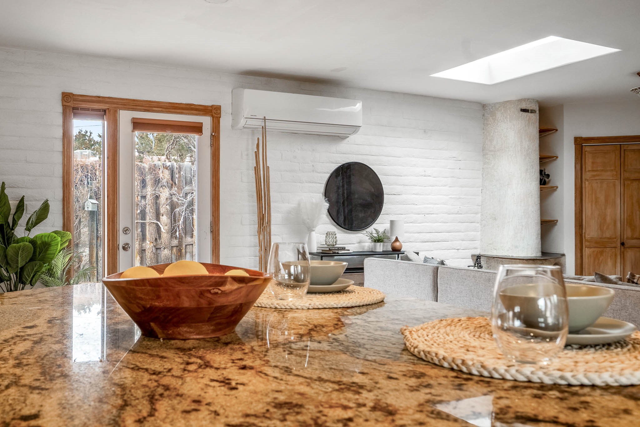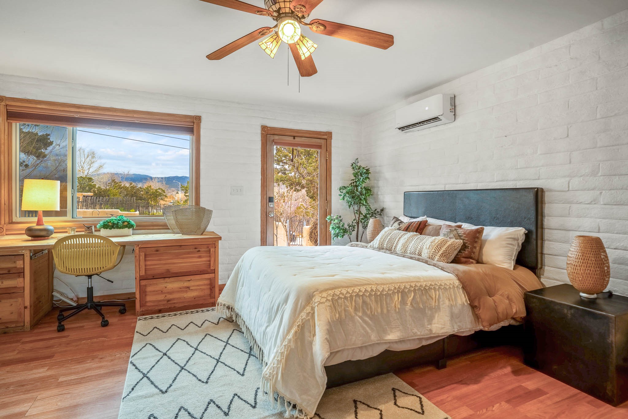 Just minutes from the Plaza, this charming 1,385 sq. ft. home offers the perfect blend of Southwestern character, modern updates, and exceptional flexibility. Set on a spacious lot with views of the Sangre de Cristo Mountains, the property provides easy access to the Ortiz Dog Park, River Trail, and the Co-op. The 1089 sq. ft. main house features an inviting open-concept design with a renovated kitchen, complete with granite countertops, an island, and a cozy living room with an artistic wood-burning fireplace. The primary suite enjoys mountain views, a bathroom, and a generous walk-in shower. An attached one-car garage adds convenience. Currently configured as a home with an attached 305 sq. ft. studio casita--rented on a monthly basis--the property offers great investment potential. The casita includes a full bathroom, kitchenette, and private entrance, making it ideal as a guest space or rental. With a simple modification, the home can easily be converted back to a two-bedroom, three-bathroom residence. This unique property offers a great downtown location, mountain views, and flexible living options--a rare opportunity in the heart of Santa Fe