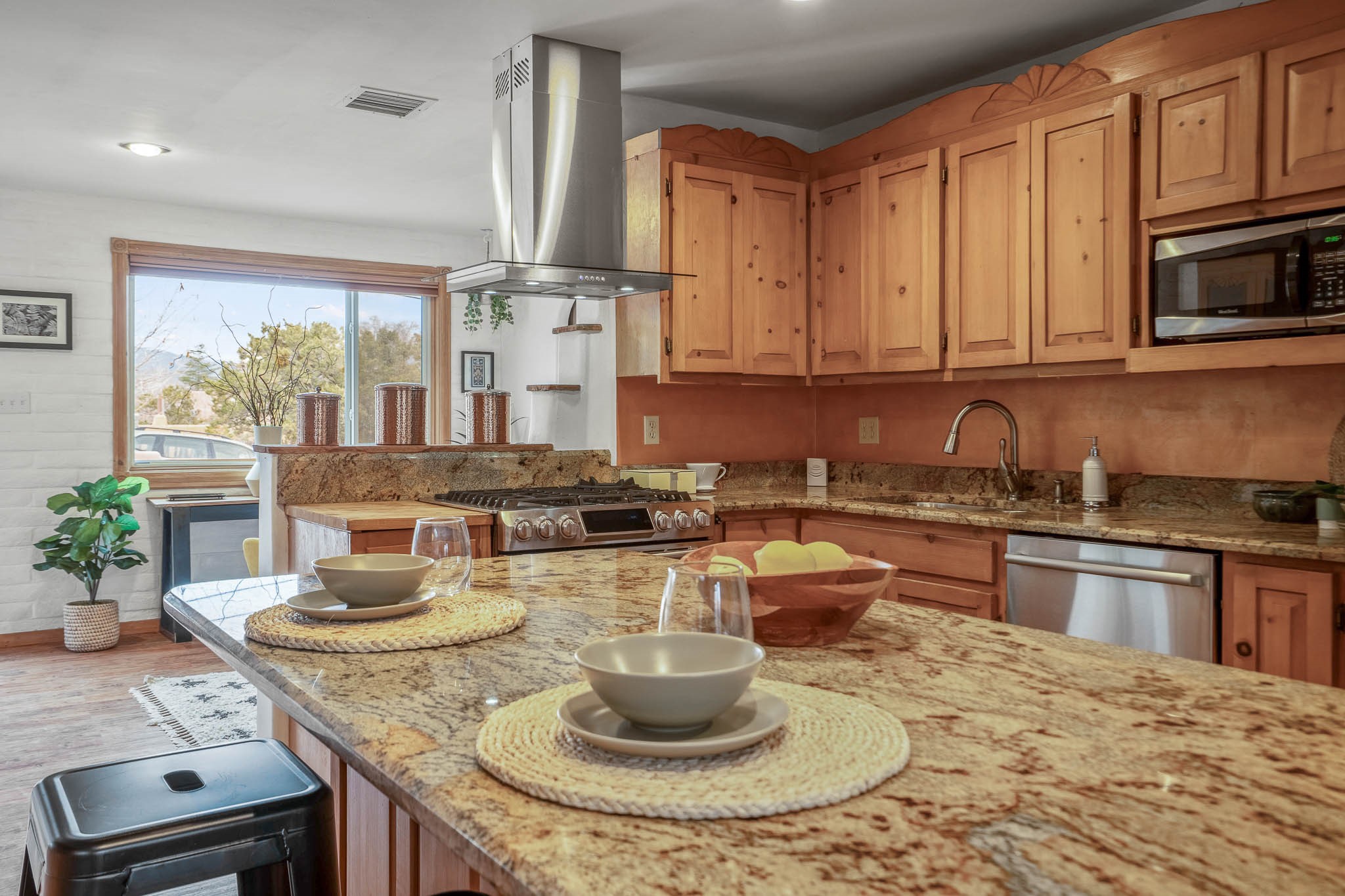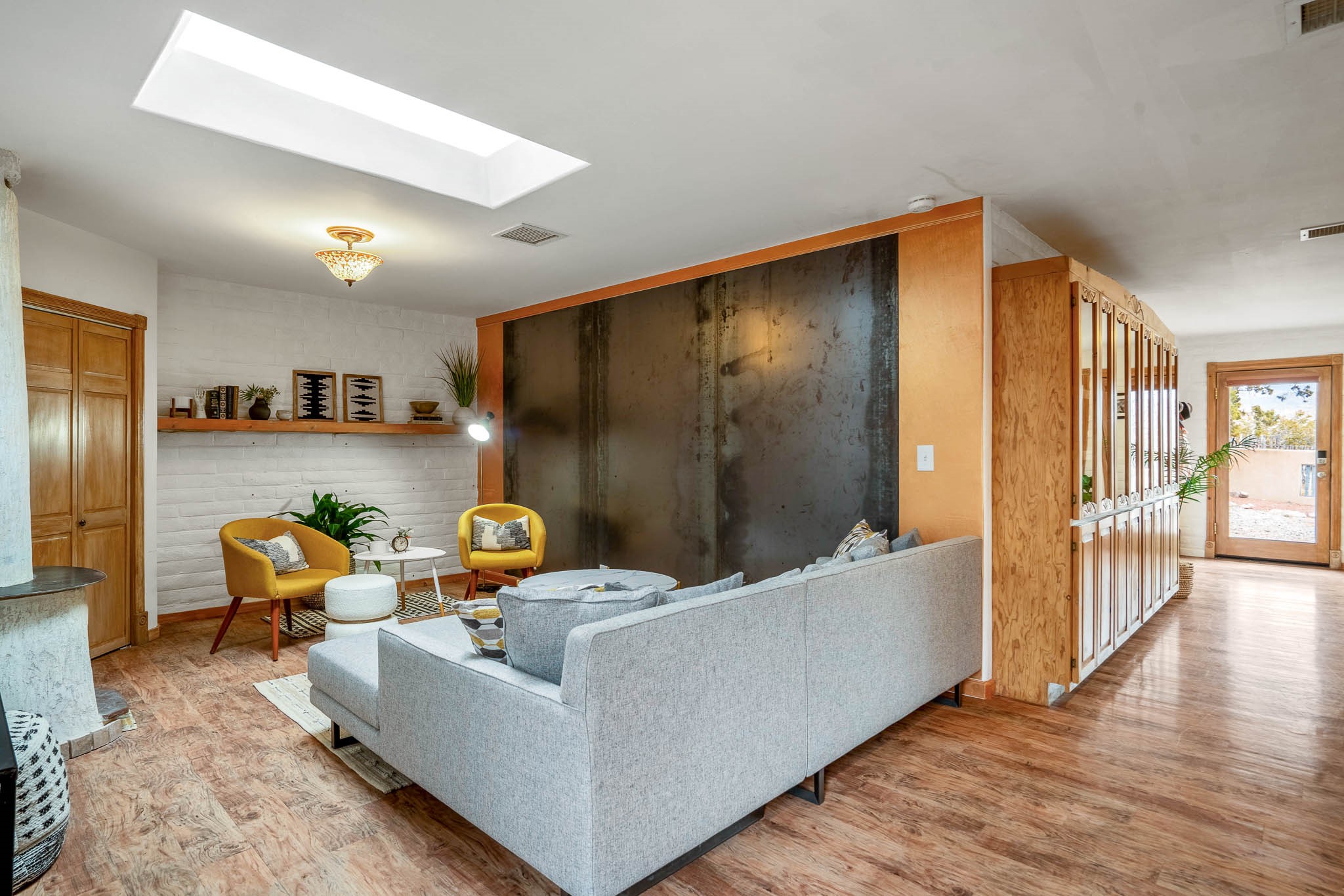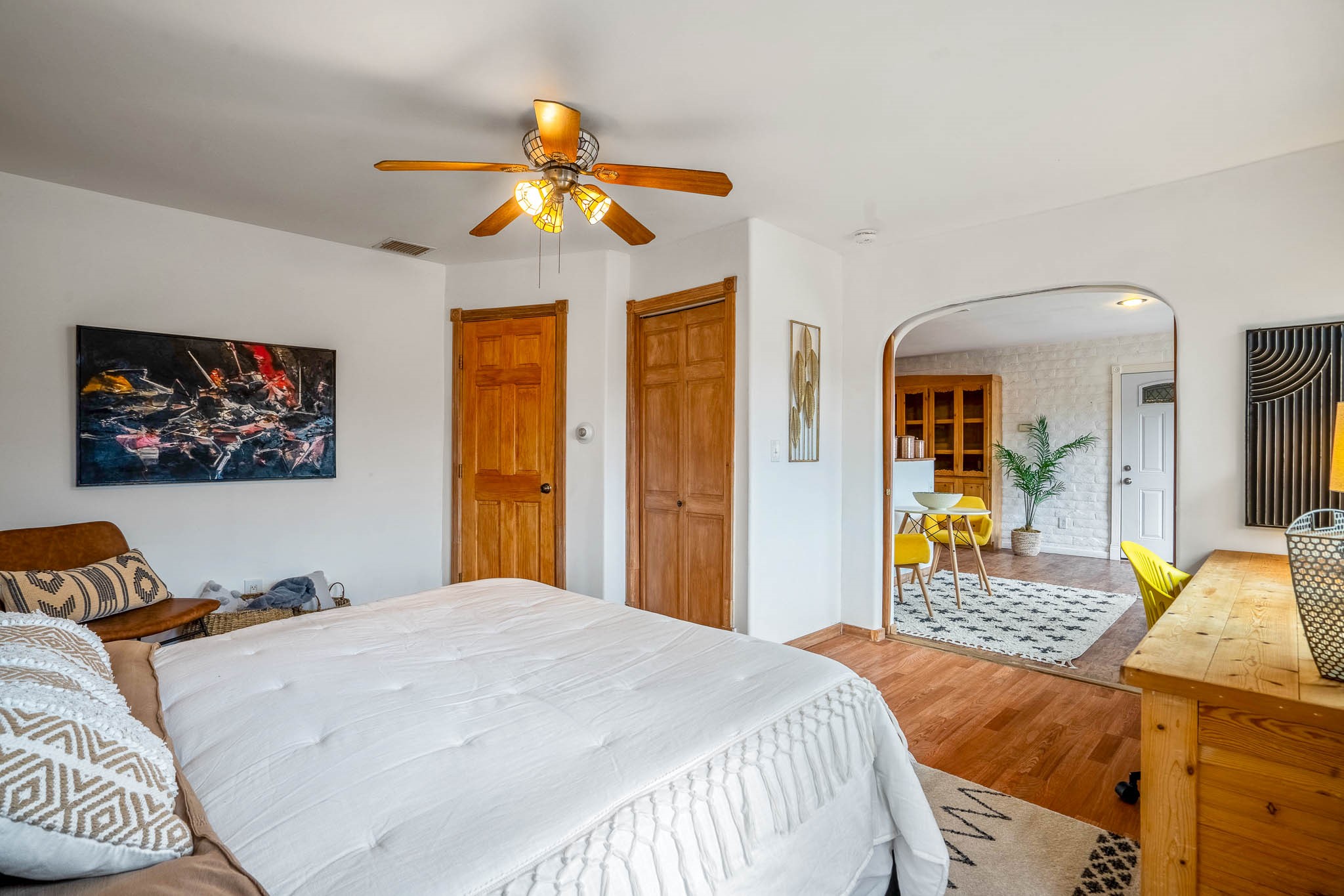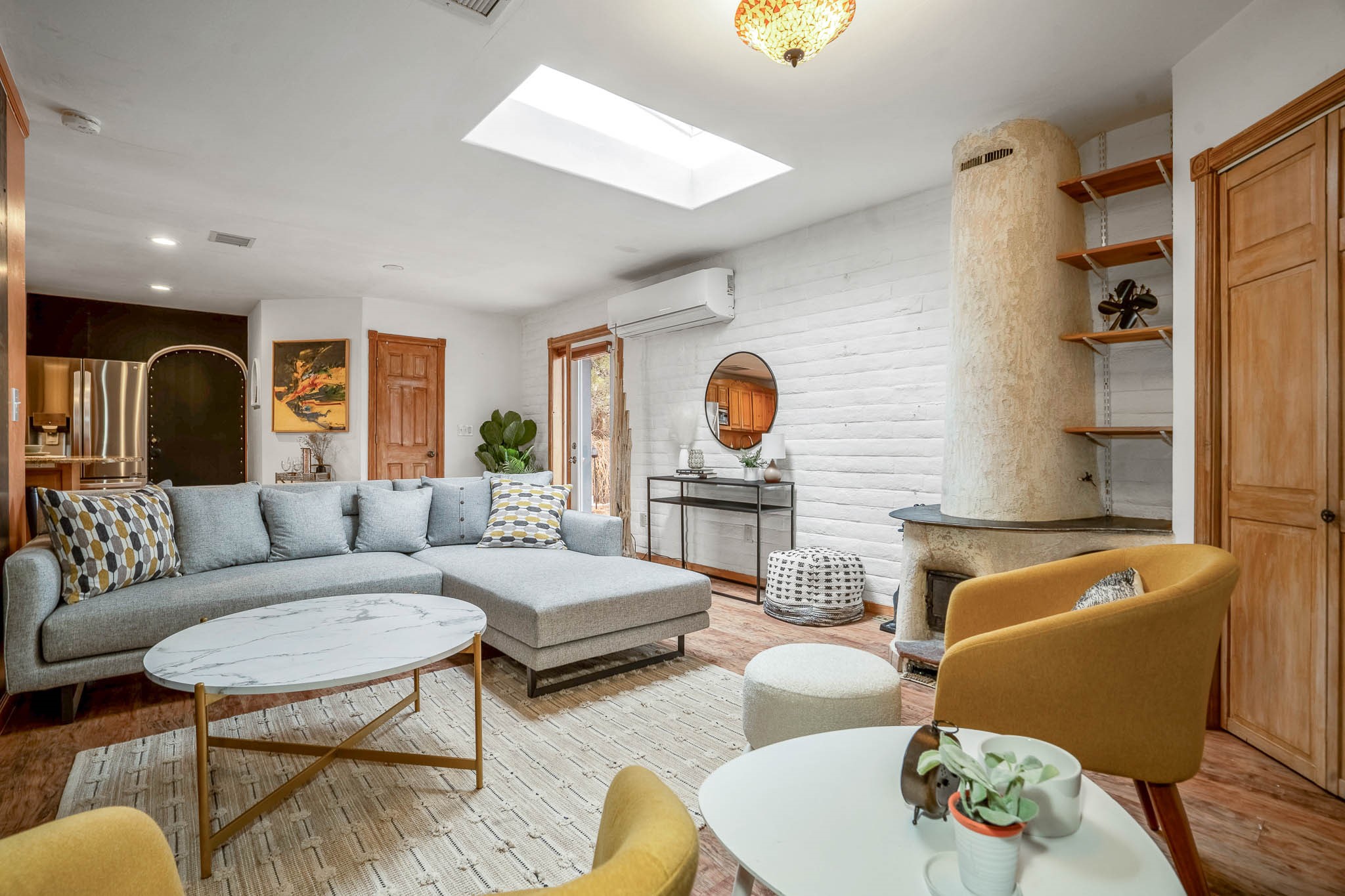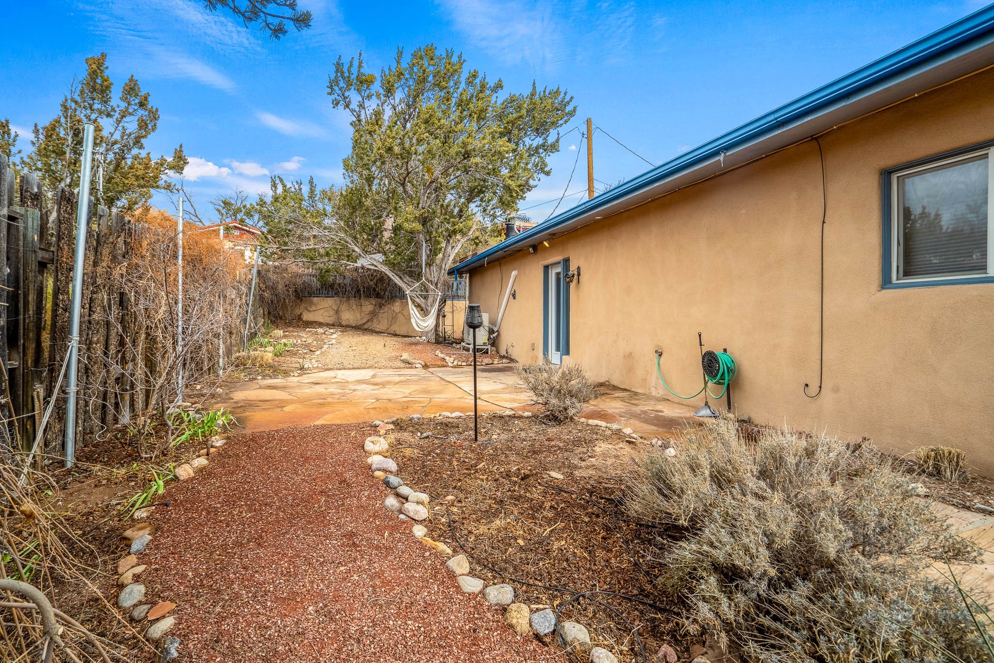 Just minutes from the Plaza, this charming 1,385 sq. ft. home offers the perfect blend of Southwestern character, modern updates, and exceptional flexibility. Set on a spacious lot with views of the Sangre de Cristo Mountains, the property provides easy access to the Ortiz Dog Park, River Trail, and the Co-op. The 1089 sq. ft. main house features an inviting open-concept design with a renovated kitchen, complete with granite countertops, an island, and a cozy living room with an artistic wood-burning fireplace. The primary suite enjoys mountain views, a bathroom, and a generous walk-in shower. An attached one-car garage adds convenience. Currently configured as a home with an attached 305 sq. ft. studio casita--rented on a monthly basis--the property offers great investment potential. The casita includes a full bathroom, kitchenette, and private entrance, making it ideal as a guest space or rental. With a simple modification, the home can easily be converted back to a two-bedroom, three-bathroom residence. This unique property offers a great downtown location, mountain views, and flexible living options--a rare opportunity in the heart of Santa Fe