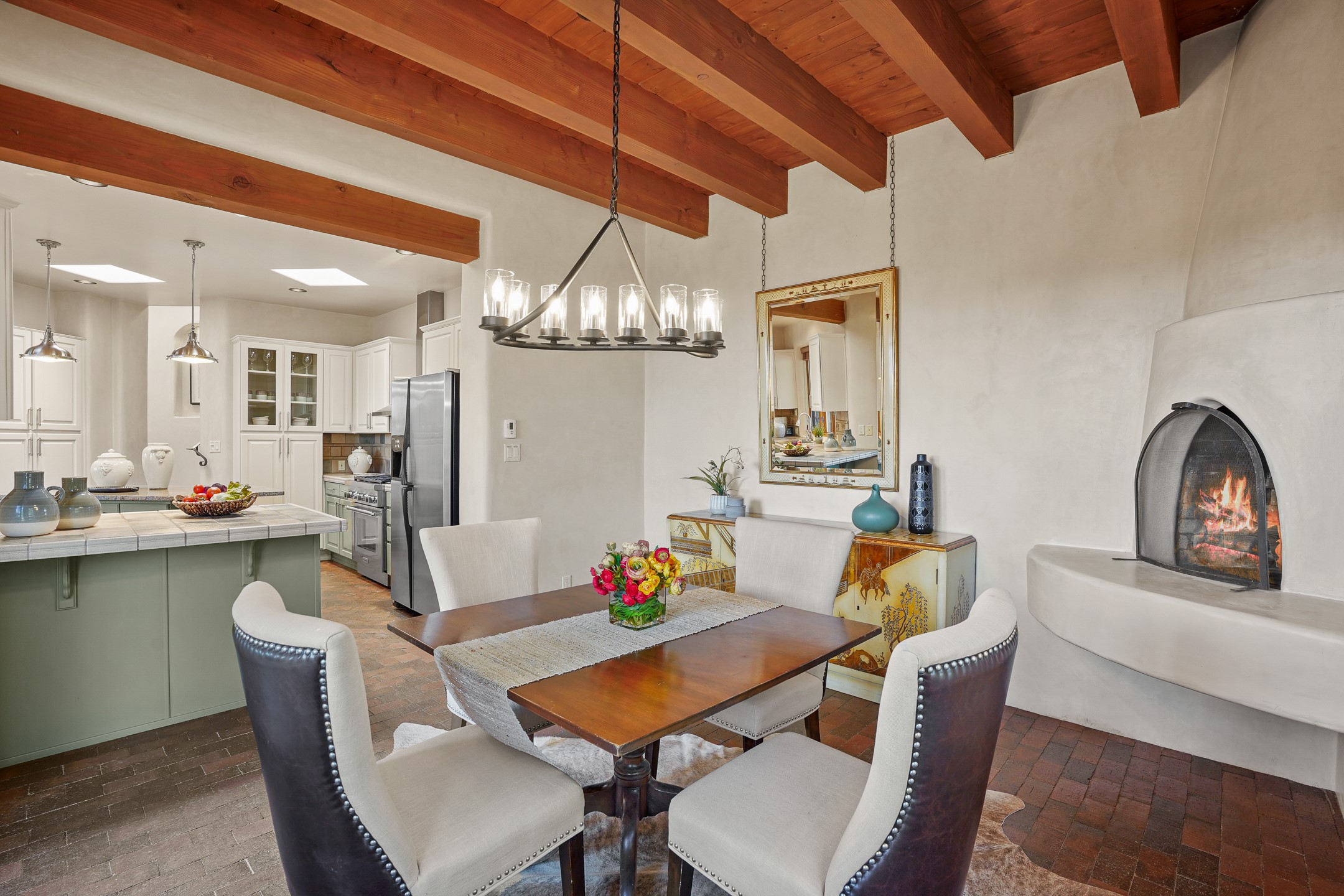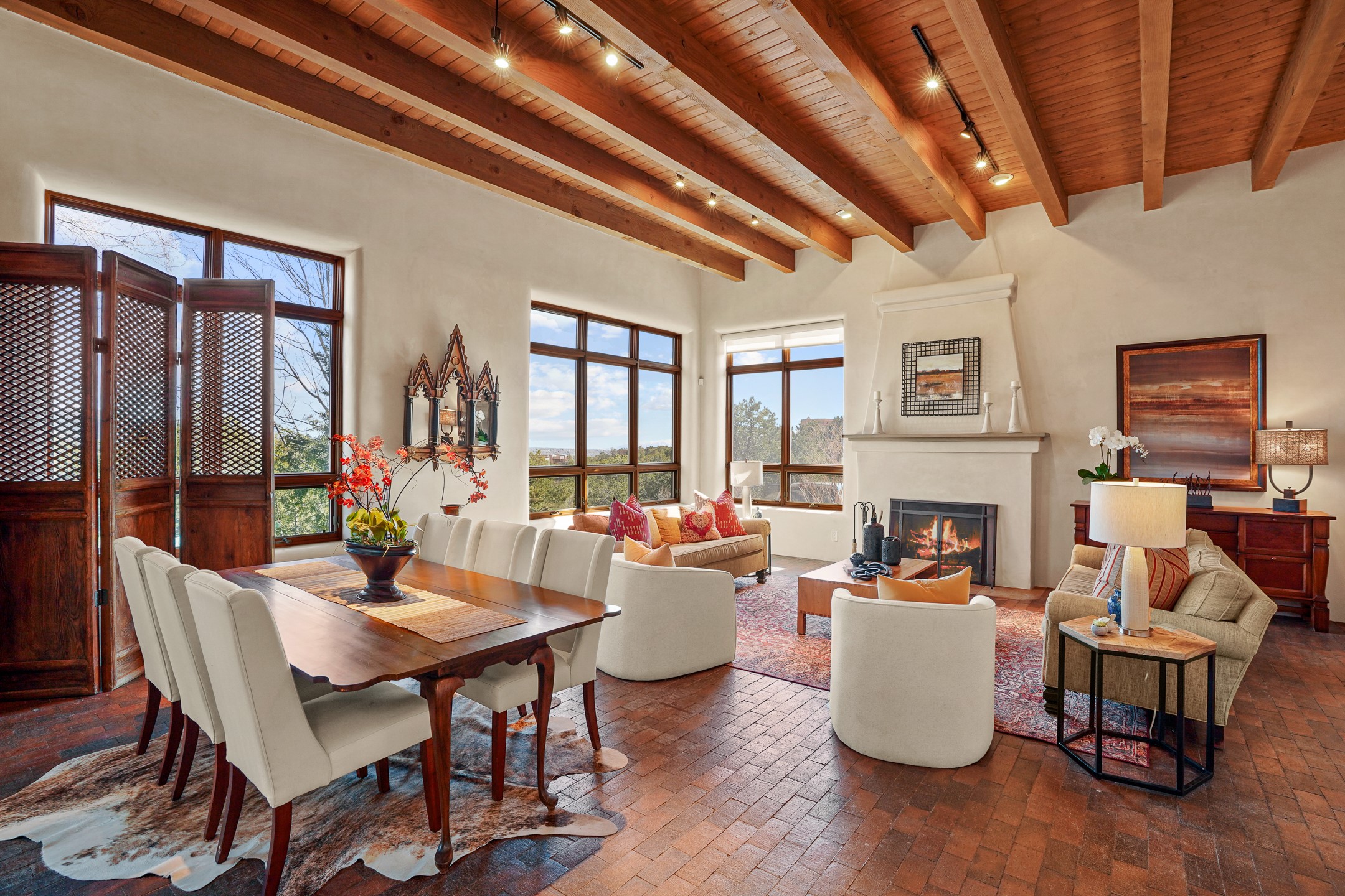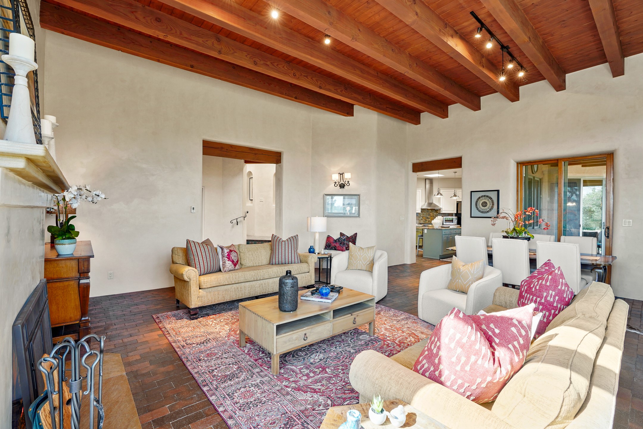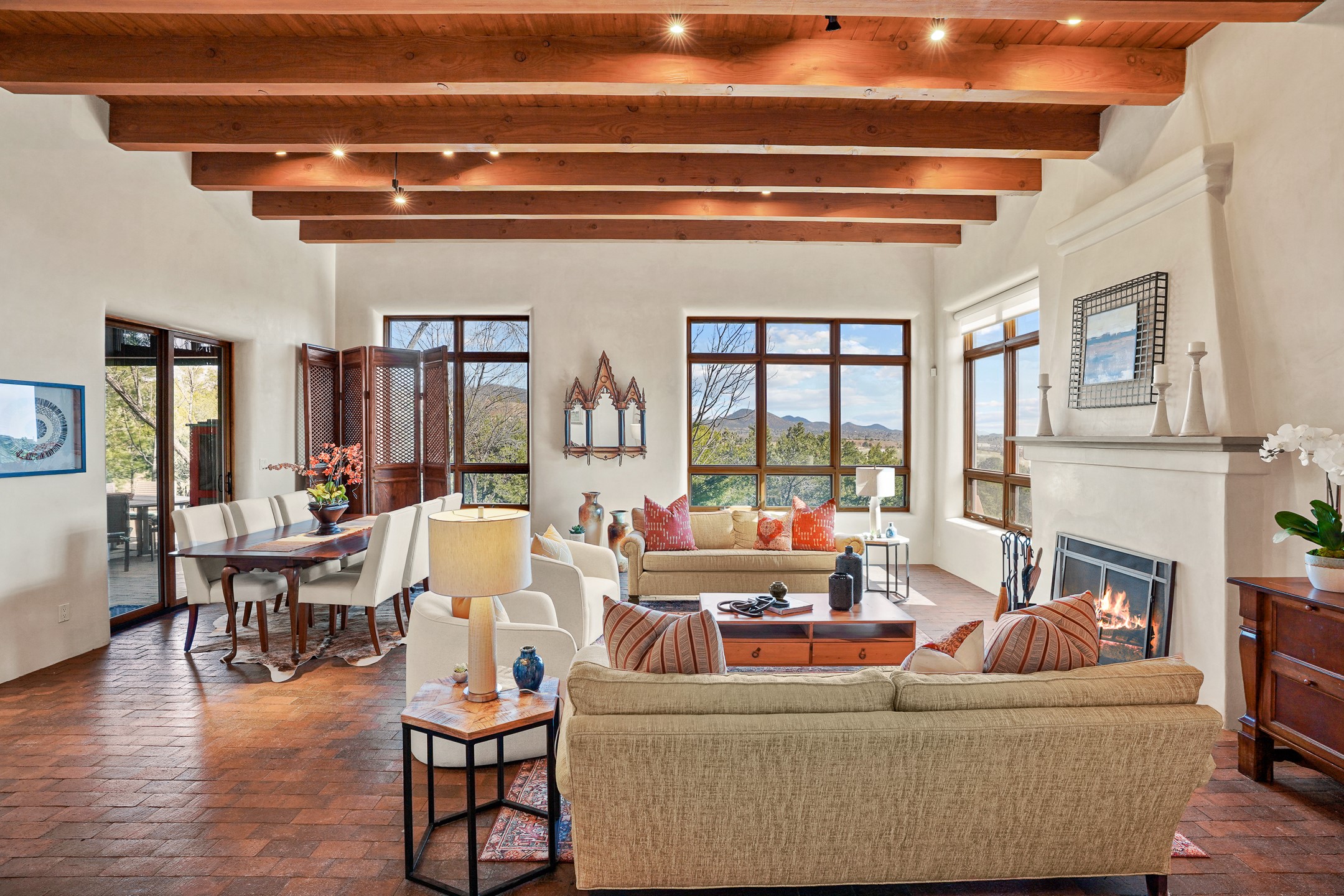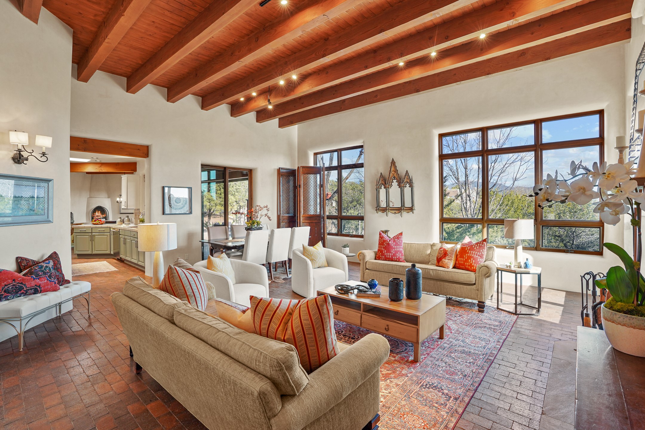 Tucked away in the peaceful and sought-after Santa Fe Estates neighborhood, 855 Camino Francisca is a delightful, expansive single-family home built in 2001. This 3-bedroom, 2-bathroom residence spans 2,508 sq. ft. of beautifully designed living space on a 1.64-acre lot.Exuding classic Santa Fe charm, the home features high ceilings with exposed beams, stunning brick floors, in-floor radiant heating, and hand-troweled plaster walls. The inviting living area showcases a Rumford fireplace and large windows framing picturesque views of the foothills, trees, and ever-changing Santa Fe skies. The chef's kitchen boasts stylish tile countertops, custom cabinetry, and stainless steel appliances. A cozy breakfast nook with a charming Kiva fireplace adds warmth and character.Step outside from the living room or breakfast nook onto a spacious patio, perfect for enjoying the tranquil surroundings and abundant birdlife. This peaceful outdoor space is ideal for entertaining or savoring a quiet morning coffee. The current owners have thoughtfully added bird feeders to attract local wildlife, enhancing the serene atmosphere.The oversized primary suite serves as a private sanctuary, with a sliding glass door leading to a secluded patio. The en-suite bathroom features a large soaking tub, roomy snail shower, dual sinks, and an expansive walk-in closet. Two additional guest bedrooms share a full bathroom.Additional highlights include a welcoming entryway, skylights, a large laundry room, and a two-car garage. The neighborhood is known for its quiet atmosphere, low traffic, and well-maintained homes, all just minutes from Santa Fe Plaza, Devargas Mall, and local shopping centers.855 Camino Francisca blends style, comfort, and tranquility, making it an ideal choice for those seeking a spacious home with easy access to the best of Santa Fe.