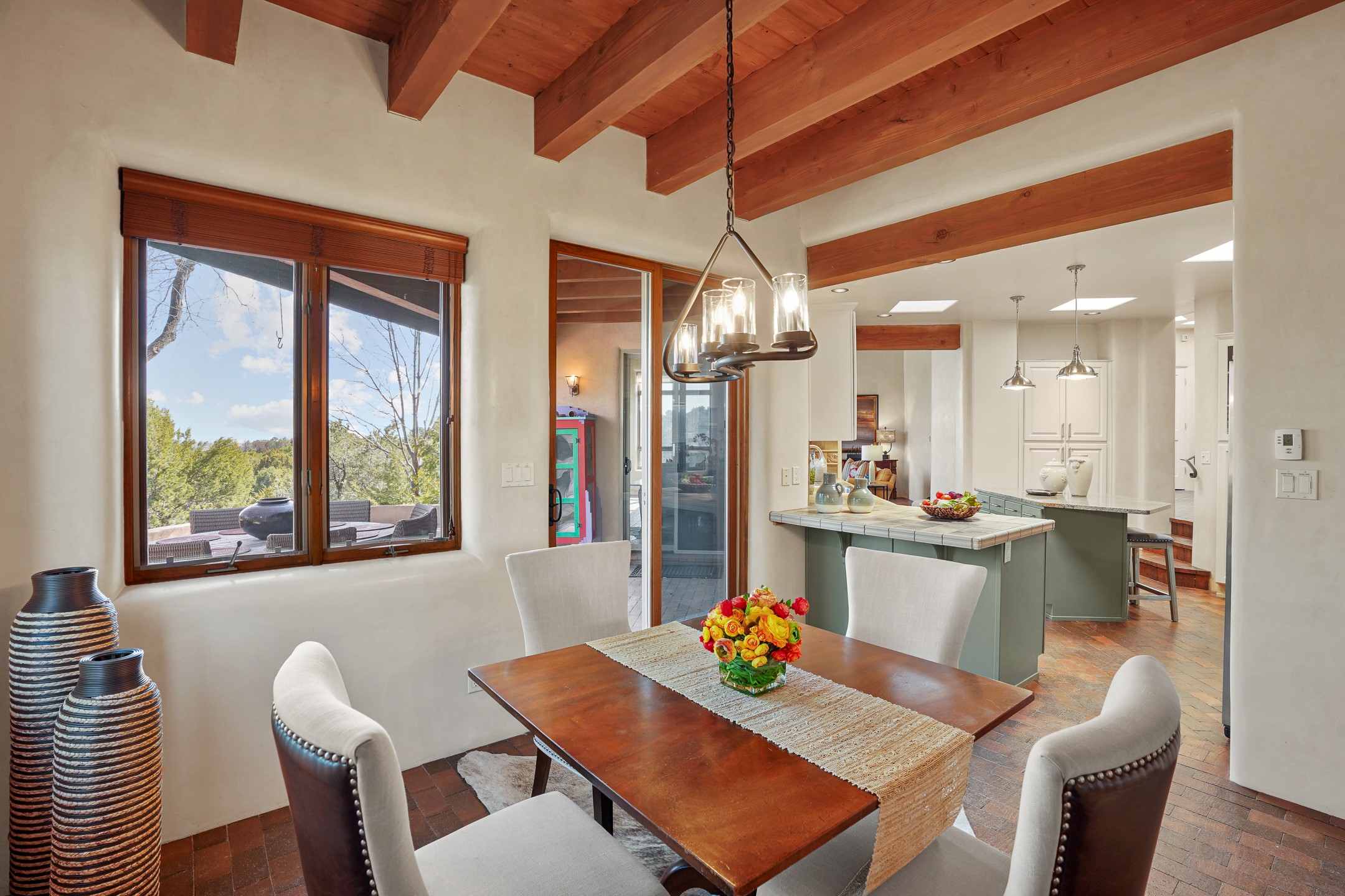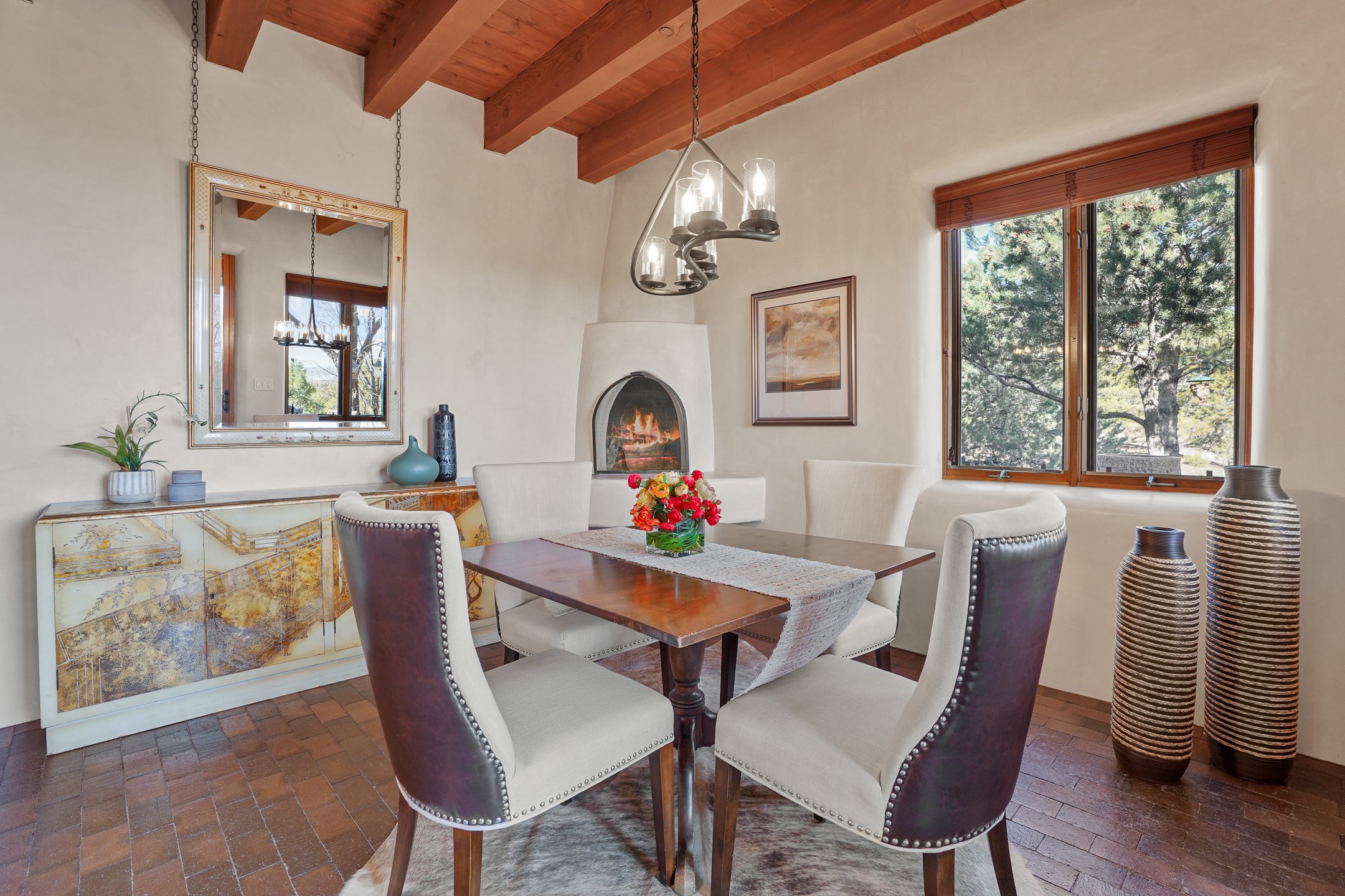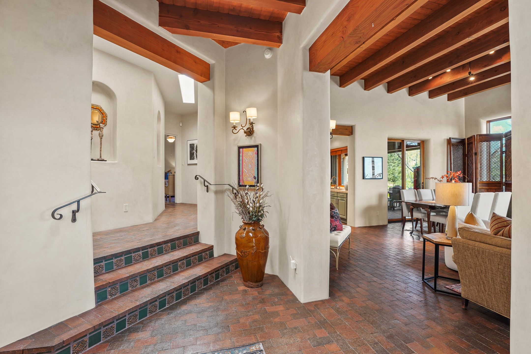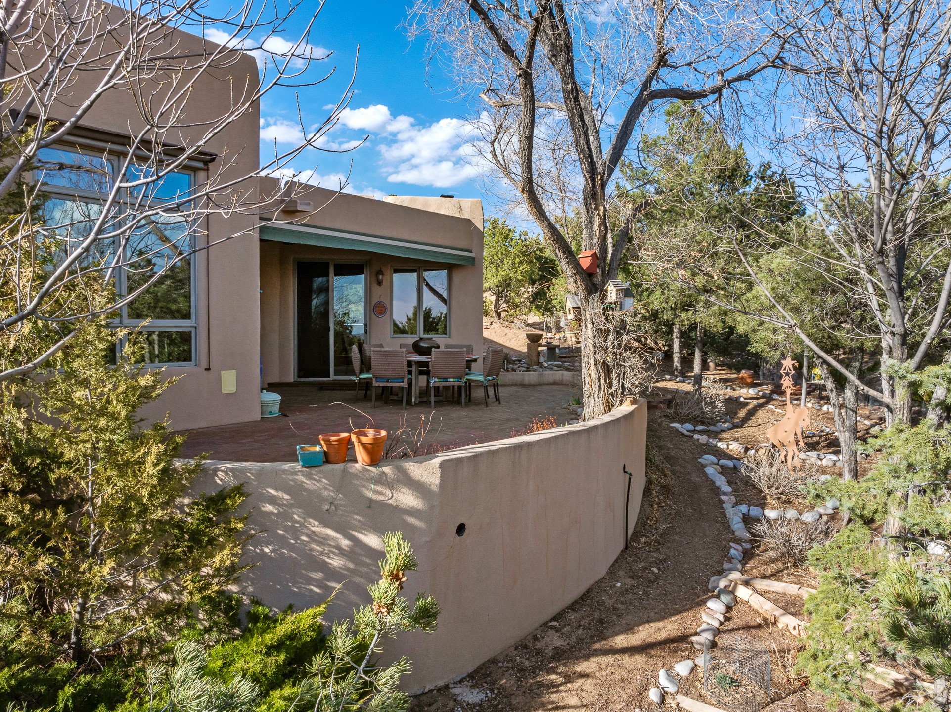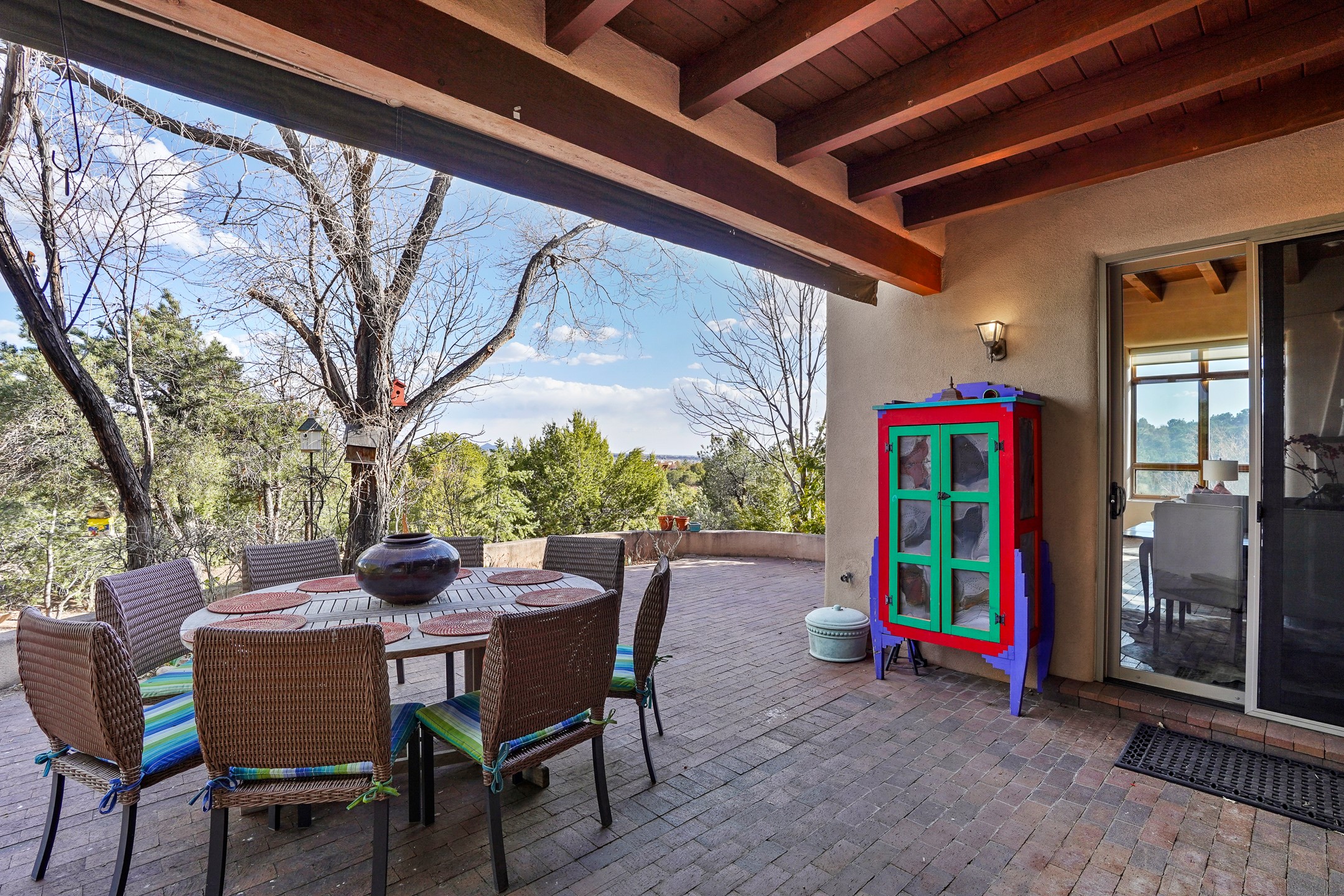 Tucked away in the peaceful and sought-after Santa Fe Estates neighborhood, 855 Camino Francisca is a delightful, expansive single-family home built in 2001. This 3-bedroom, 2-bathroom residence spans 2,508 sq. ft. of beautifully designed living space on a 1.64-acre lot.Exuding classic Santa Fe charm, the home features high ceilings with exposed beams, stunning brick floors, in-floor radiant heating, and hand-troweled plaster walls. The inviting living area showcases a Rumford fireplace and large windows framing picturesque views of the foothills, trees, and ever-changing Santa Fe skies. The chef's kitchen boasts stylish tile countertops, custom cabinetry, and stainless steel appliances. A cozy breakfast nook with a charming Kiva fireplace adds warmth and character.Step outside from the living room or breakfast nook onto a spacious patio, perfect for enjoying the tranquil surroundings and abundant birdlife. This peaceful outdoor space is ideal for entertaining or savoring a quiet morning coffee. The current owners have thoughtfully added bird feeders to attract local wildlife, enhancing the serene atmosphere.The oversized primary suite serves as a private sanctuary, with a sliding glass door leading to a secluded patio. The en-suite bathroom features a large soaking tub, roomy snail shower, dual sinks, and an expansive walk-in closet. Two additional guest bedrooms share a full bathroom.Additional highlights include a welcoming entryway, skylights, a large laundry room, and a two-car garage. The neighborhood is known for its quiet atmosphere, low traffic, and well-maintained homes, all just minutes from Santa Fe Plaza, Devargas Mall, and local shopping centers.855 Camino Francisca blends style, comfort, and tranquility, making it an ideal choice for those seeking a spacious home with easy access to the best of Santa Fe.