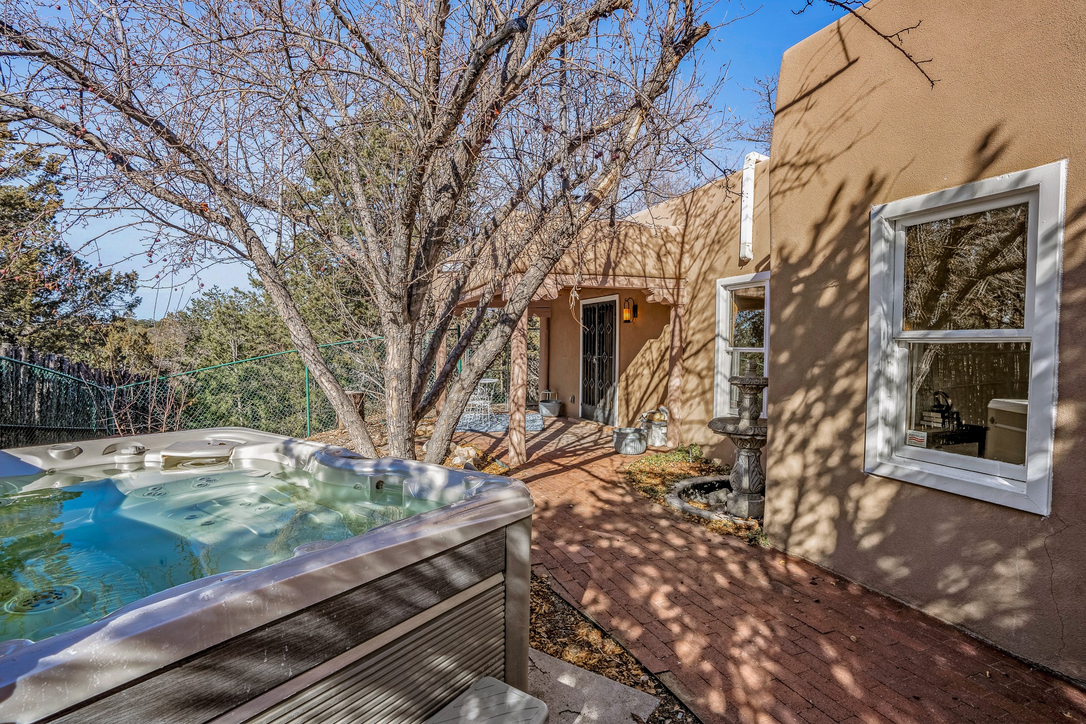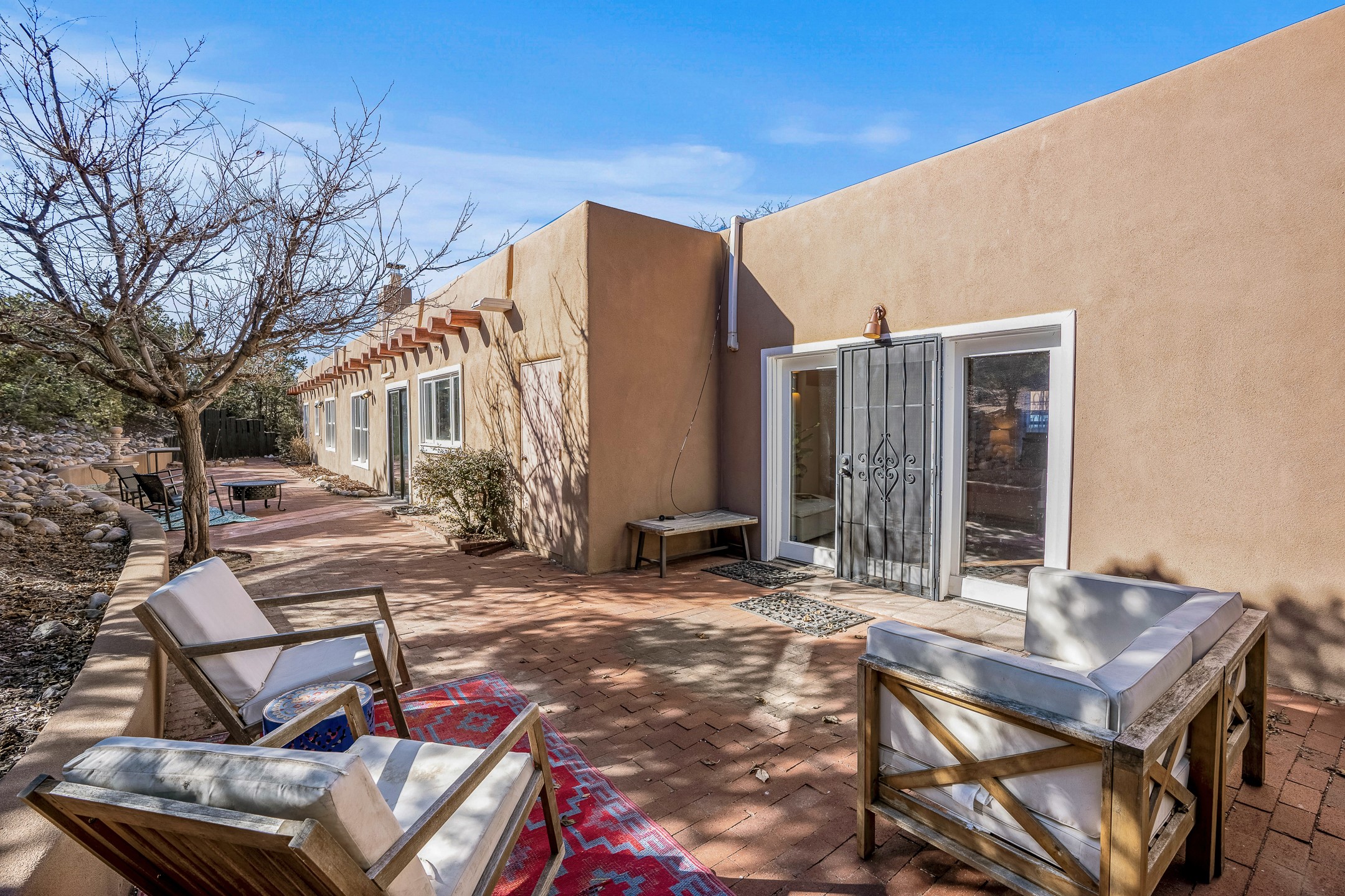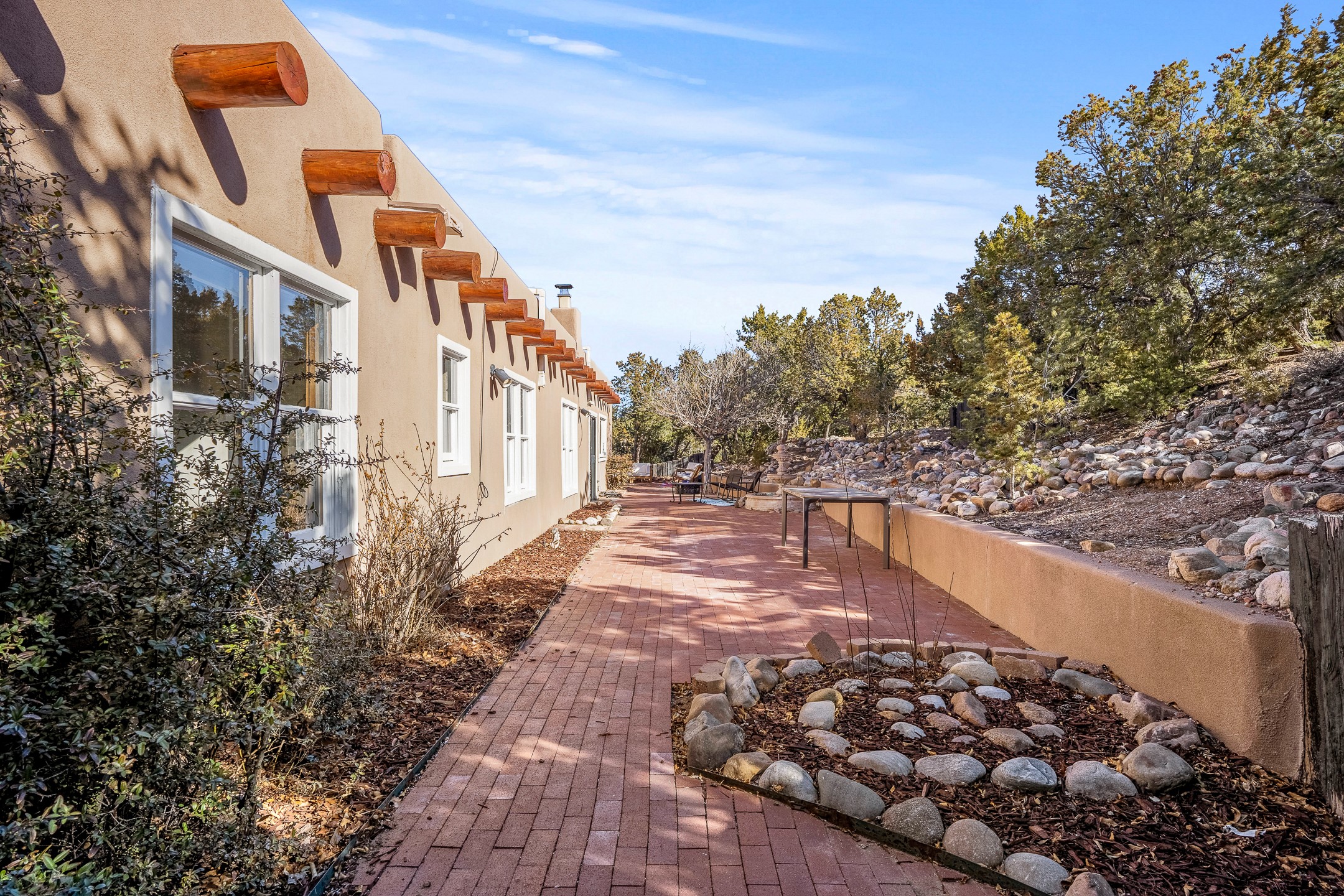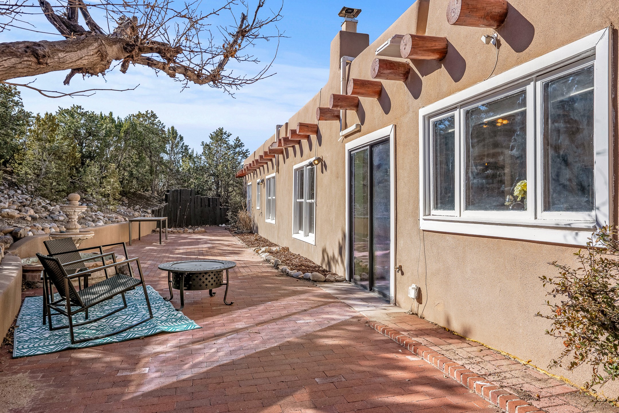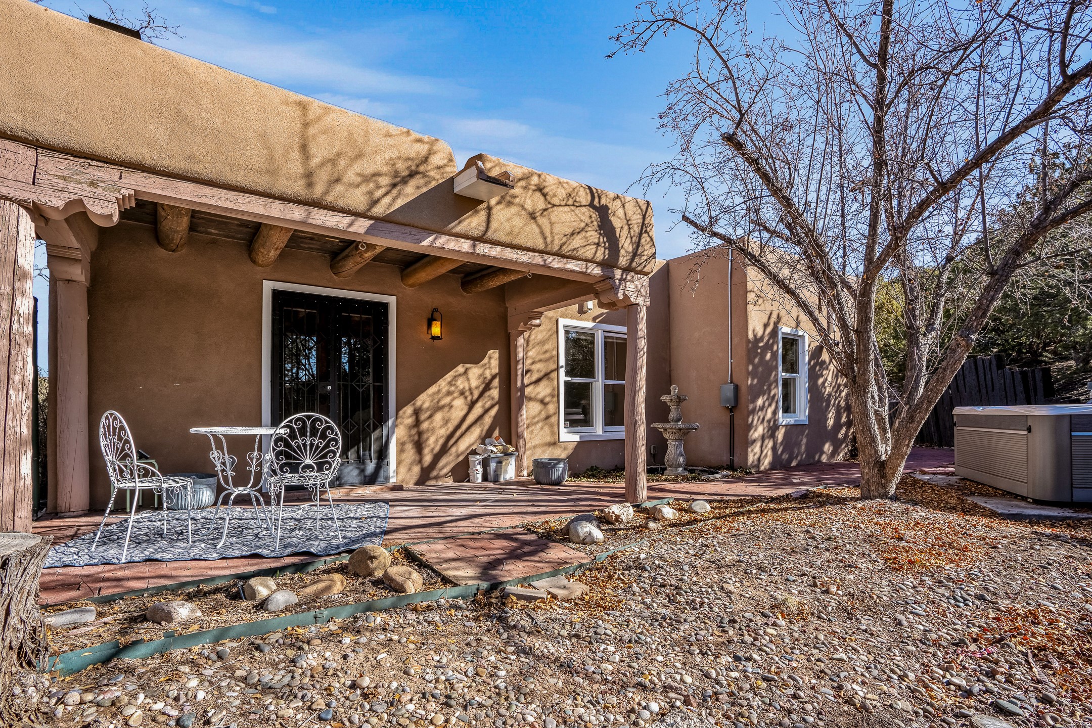 Nestled in the highly desirable Barranca Road area, located just 5 minutes from downtown Santa Fe and a short drive to Bishop's Lodge and Tesuque, this stunning 3-bedroom, 3-bathroom Santa Fe-style home offers 3,100 sq. ft. of beautifully designed living space on a private 1.75-acre lot. With a single-level open floor plan and multiple living areas, this meticulously maintained home blends timeless elegance with modern upgrades. Included is a bonus room that is currently used as a fourth bedroom with courtyard access and privacy. This home boasts classic Southwestern details, including vigas, corbels, and tongue-and-groove ceilings throughout. The primary suite is a true retreat, with double walk-in closets, featuring a private courtyard with a Caldera salt water hot tub, and direct outdoor access, perfect for stargazing. Additional upgrades include refinished and newly added tile flooring in the bonus room, zoned heating and A/C splits in every living space, upgraded lighting and hardware, new appliances, and hand-troweled plaster walls. The remodeled TV room features a see-through display wall, adding a contemporary touch to this charming home. Step outside to enjoy breathtaking sunset views from the hilltop backyard. The expansive lot has been thoughtfully maintained, with newly trimmed trees and fencing enclosing most of the property--while still offering space for personal touches. Experience peace, tranquility, and the best of Santa Fe living in this exceptional, competitively priced home. Don't miss this incredible opportunity. Imagine the possibilities and schedule your private tour today!
