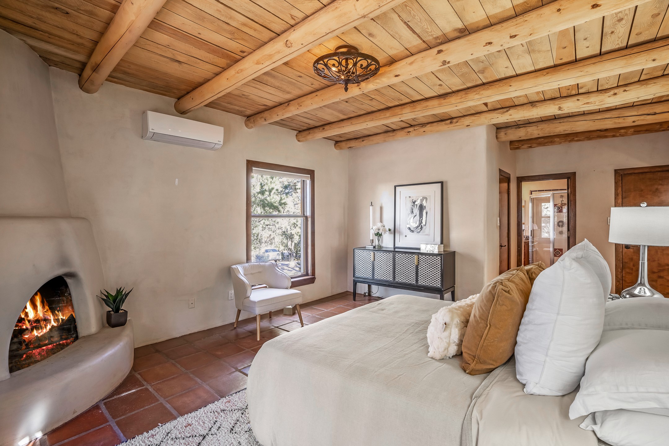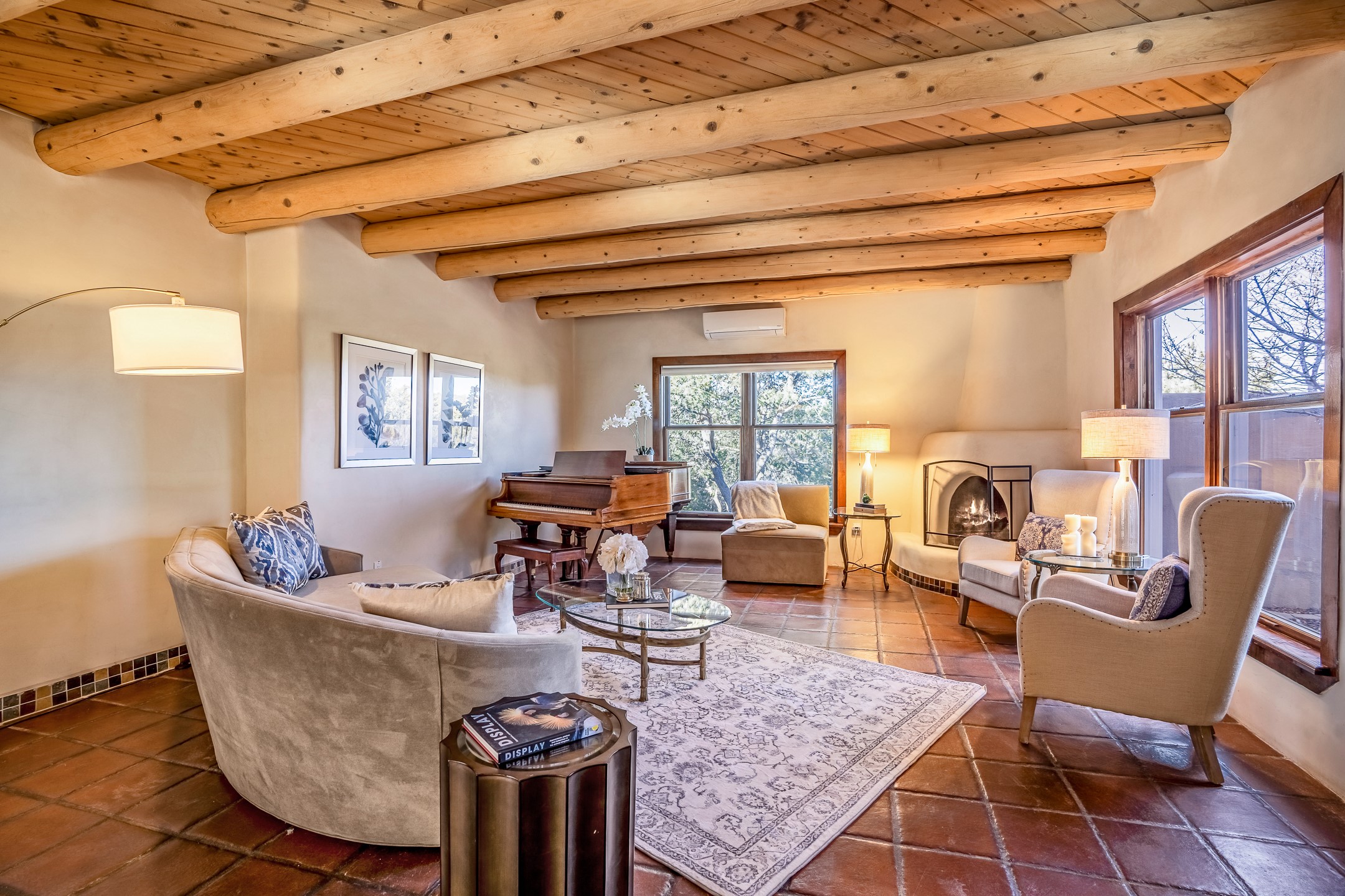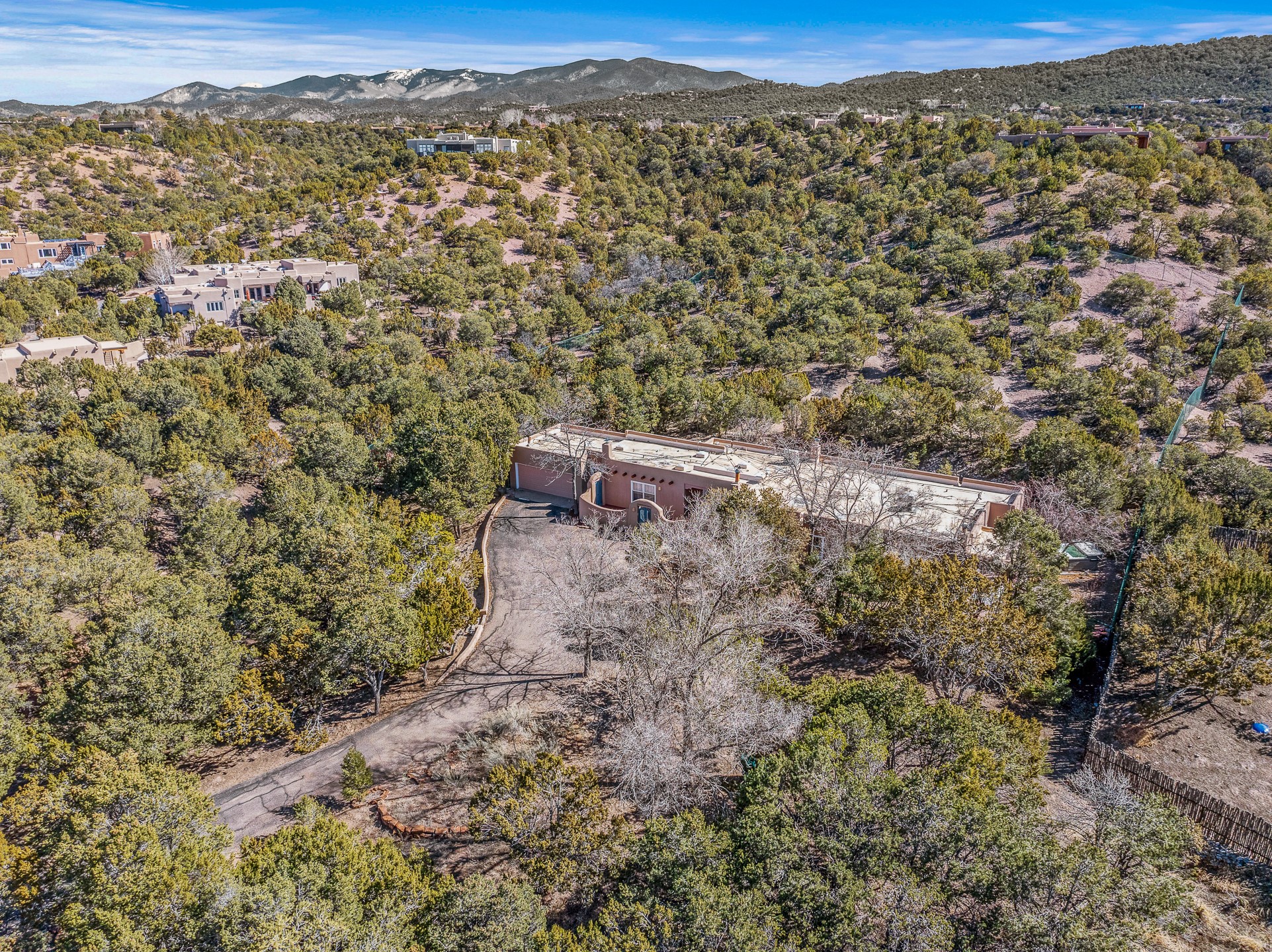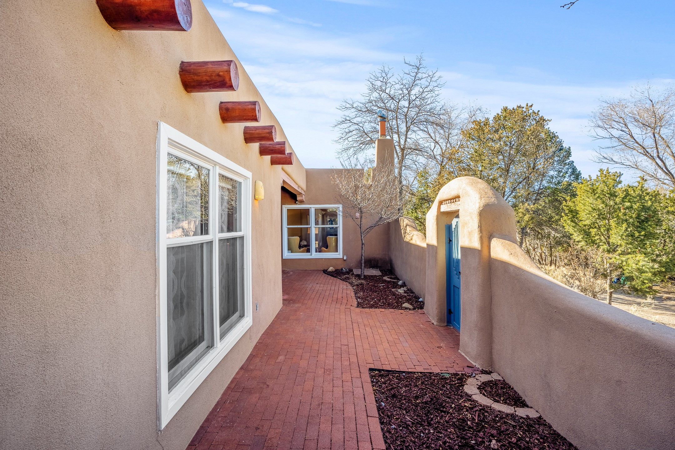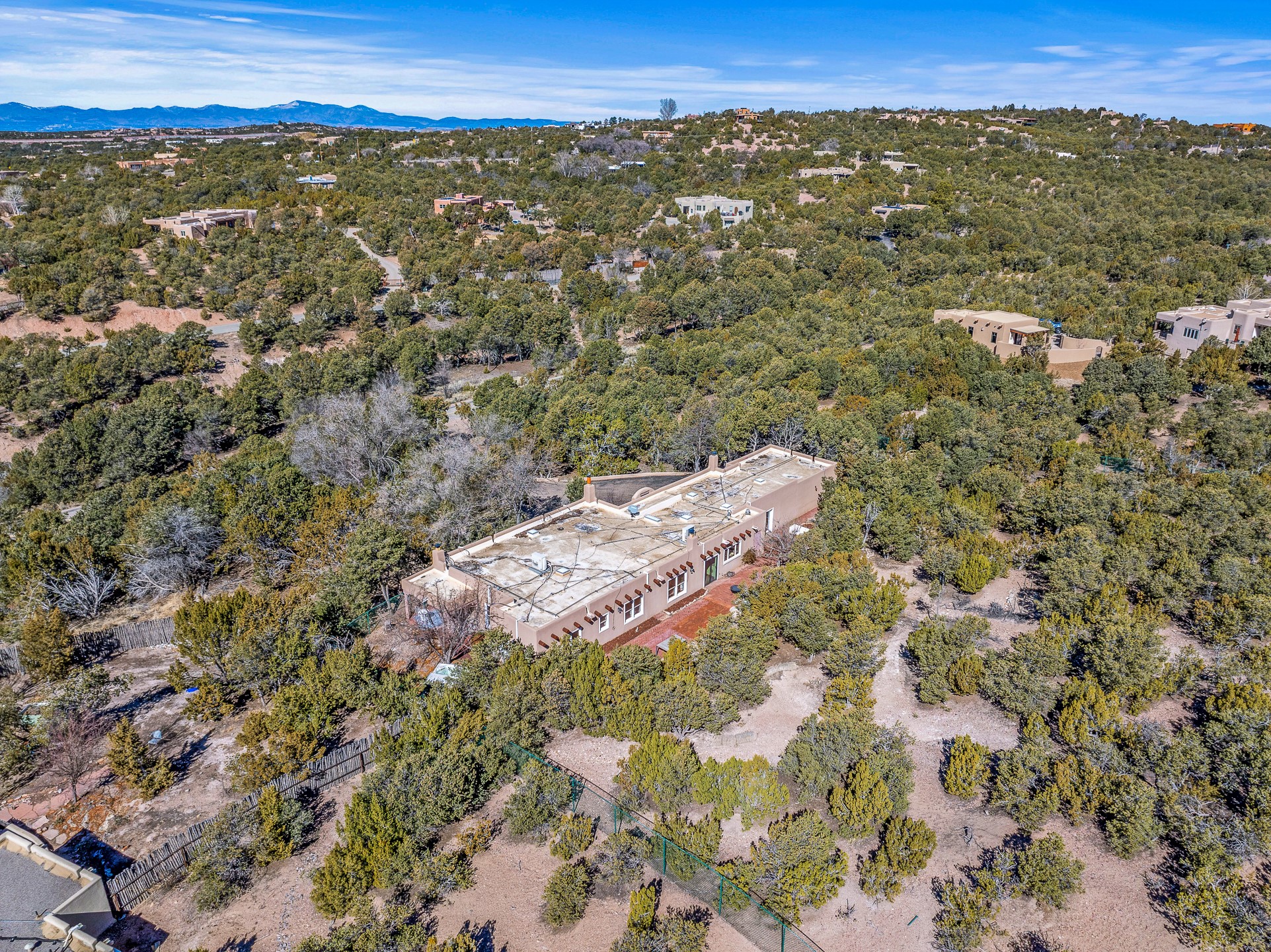 Nestled in the highly desirable Barranca Road area, located just 5 minutes from downtown Santa Fe and a short drive to Bishop's Lodge and Tesuque, this stunning 3-bedroom, 3-bathroom Santa Fe-style home offers 3,100 sq. ft. of beautifully designed living space on a private 1.75-acre lot. With a single-level open floor plan and multiple living areas, this meticulously maintained home blends timeless elegance with modern upgrades. Included is a bonus room that is currently used as a fourth bedroom with courtyard access and privacy. This home boasts classic Southwestern details, including vigas, corbels, and tongue-and-groove ceilings throughout. The primary suite is a true retreat, with double walk-in closets, featuring a private courtyard with a Caldera salt water hot tub, and direct outdoor access, perfect for stargazing. Additional upgrades include refinished and newly added tile flooring in the bonus room, zoned heating and A/C splits in every living space, upgraded lighting and hardware, new appliances, and hand-troweled plaster walls. The remodeled TV room features a see-through display wall, adding a contemporary touch to this charming home. Step outside to enjoy breathtaking sunset views from the hilltop backyard. The expansive lot has been thoughtfully maintained, with newly trimmed trees and fencing enclosing most of the property--while still offering space for personal touches. Experience peace, tranquility, and the best of Santa Fe living in this exceptional, competitively priced home. Don't miss this incredible opportunity. Imagine the possibilities and schedule your private tour today!