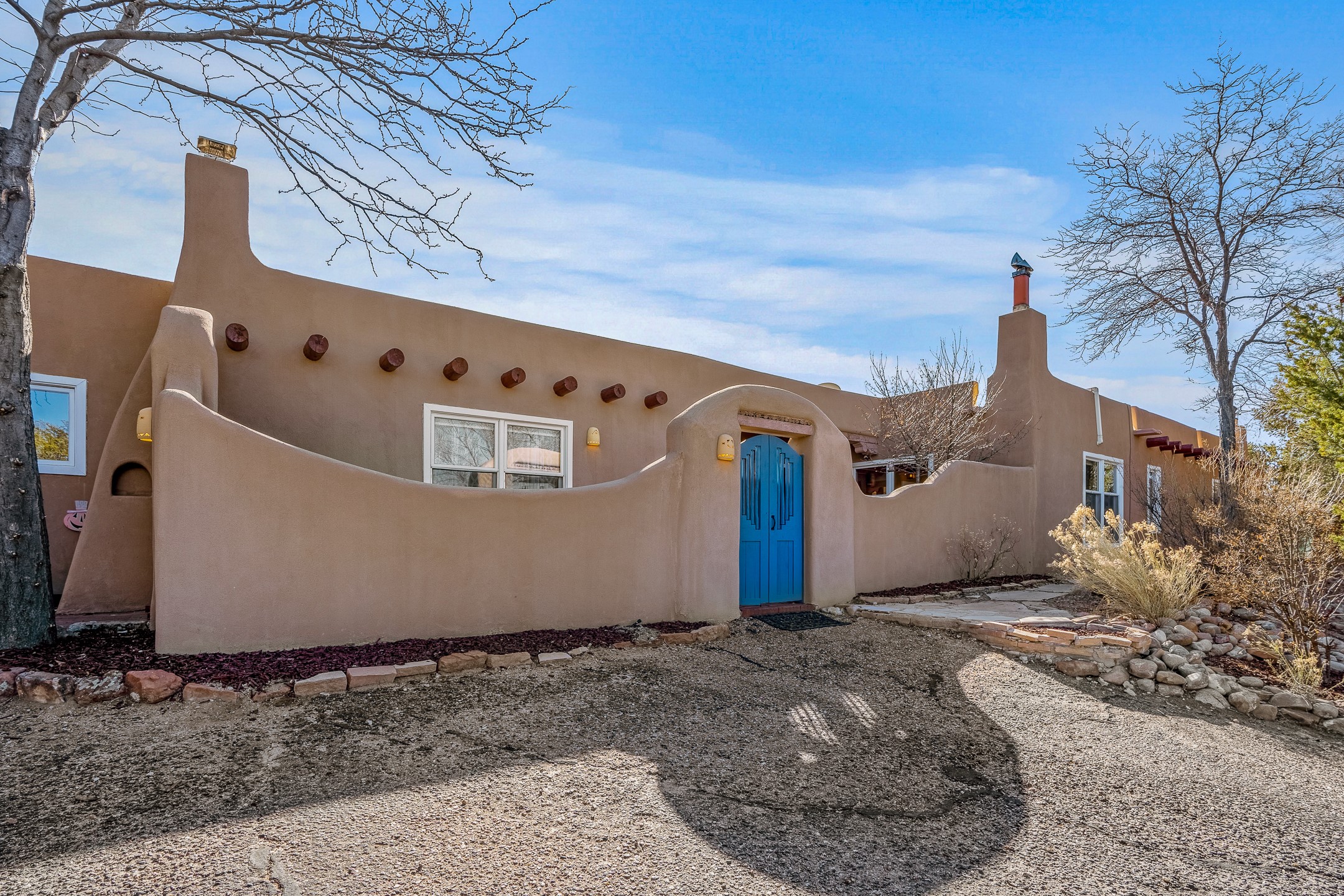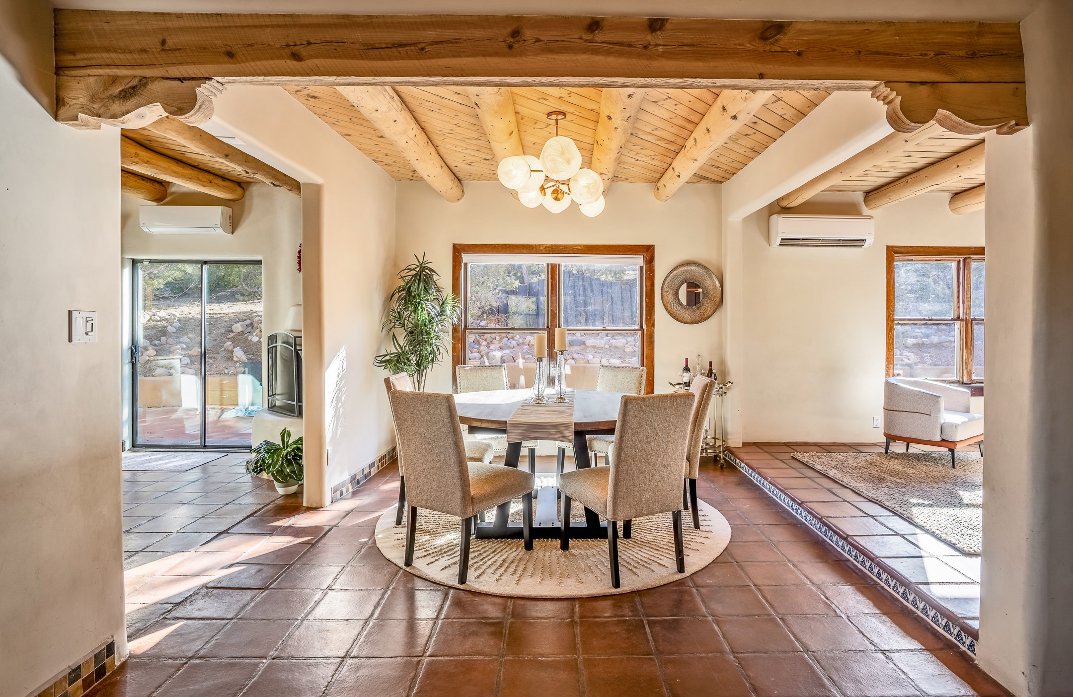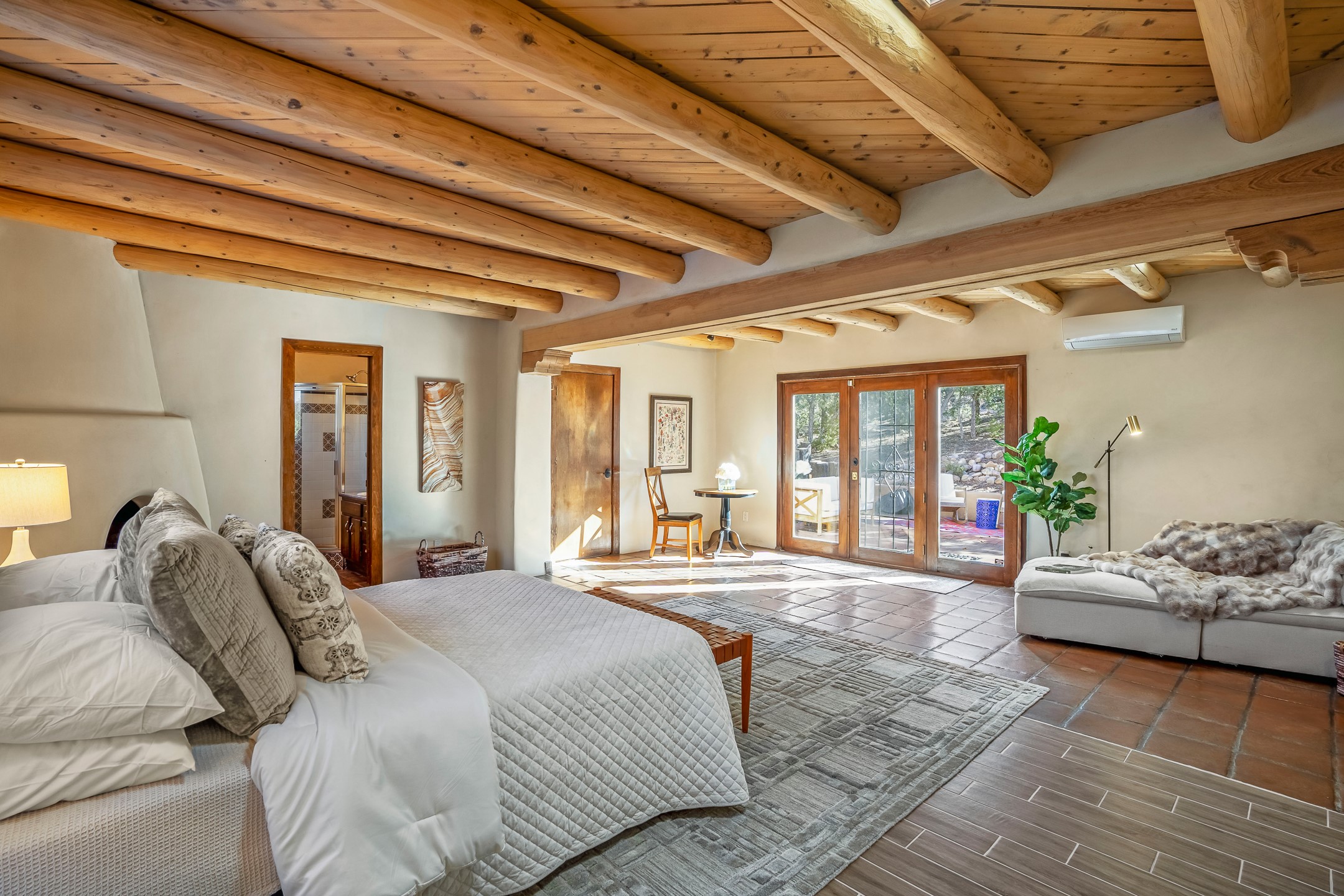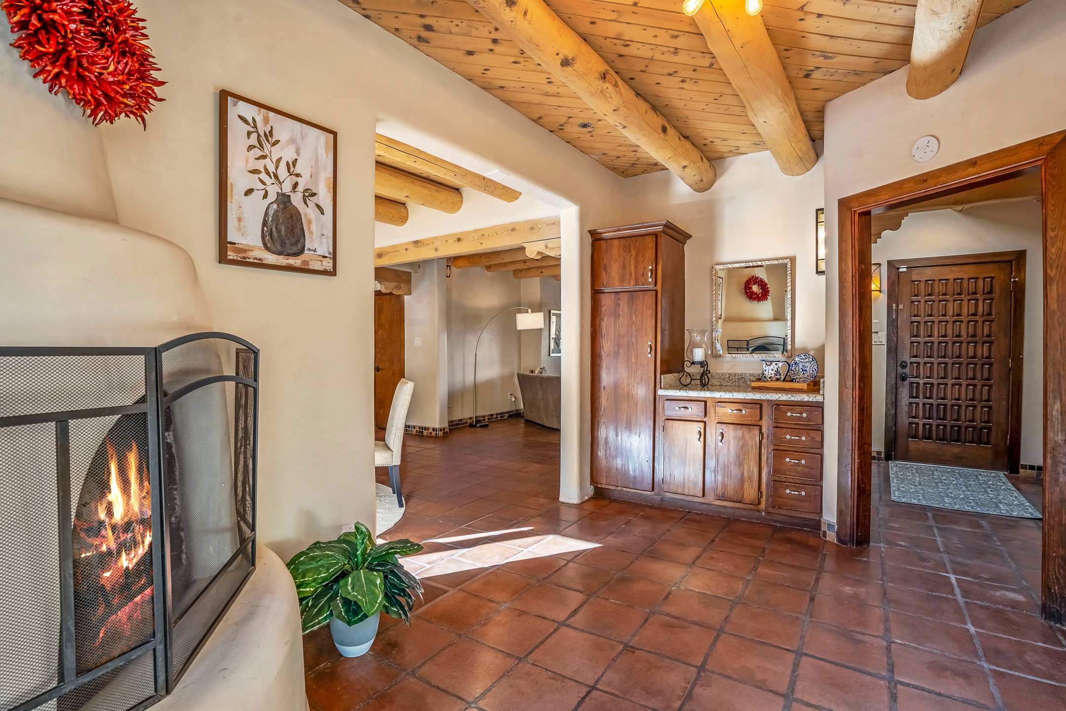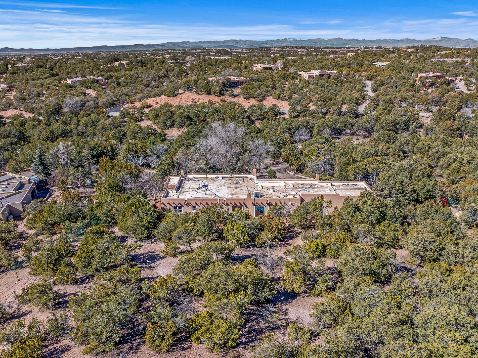 Nestled in the highly desirable Barranca Road area, located just 5 minutes from downtown Santa Fe and a short drive to Bishop's Lodge and Tesuque, this stunning 3-bedroom, 3-bathroom Santa Fe-style home offers 3,100 sq. ft. of beautifully designed living space on a private 1.75-acre lot. With a single-level open floor plan and multiple living areas, this meticulously maintained home blends timeless elegance with modern upgrades. Included is a bonus room that is currently used as a fourth bedroom with courtyard access and privacy. This home boasts classic Southwestern details, including vigas, corbels, and tongue-and-groove ceilings throughout. The primary suite is a true retreat, with double walk-in closets, featuring a private courtyard with a Caldera salt water hot tub, and direct outdoor access, perfect for stargazing. Additional upgrades include refinished and newly added tile flooring in the bonus room, zoned heating and A/C splits in every living space, upgraded lighting and hardware, new appliances, and hand-troweled plaster walls. The remodeled TV room features a see-through display wall, adding a contemporary touch to this charming home. Step outside to enjoy breathtaking sunset views from the hilltop backyard. The expansive lot has been thoughtfully maintained, with newly trimmed trees and fencing enclosing most of the property--while still offering space for personal touches. Experience peace, tranquility, and the best of Santa Fe living in this exceptional, competitively priced home. Don't miss this incredible opportunity. Imagine the possibilities and schedule your private tour today!