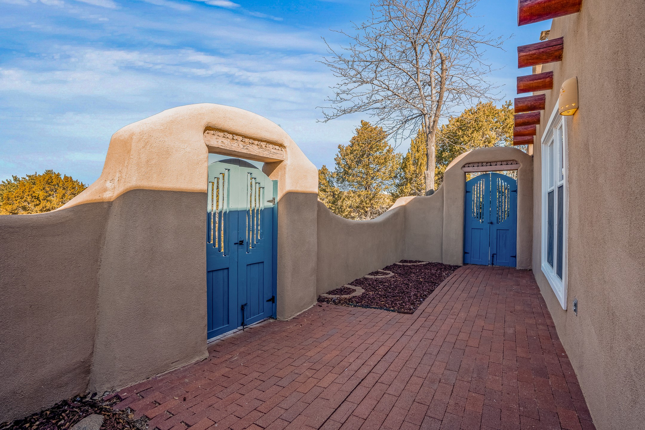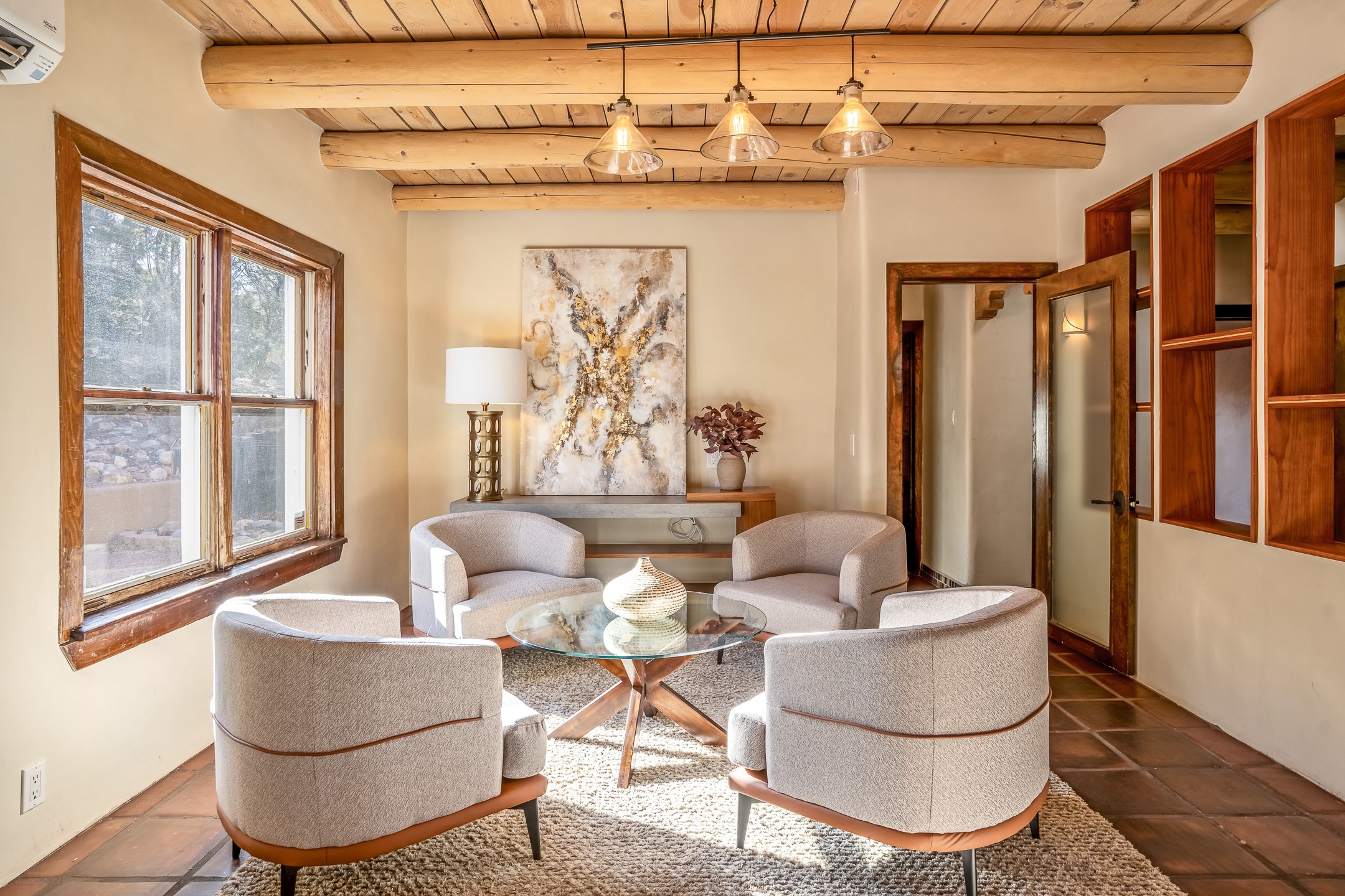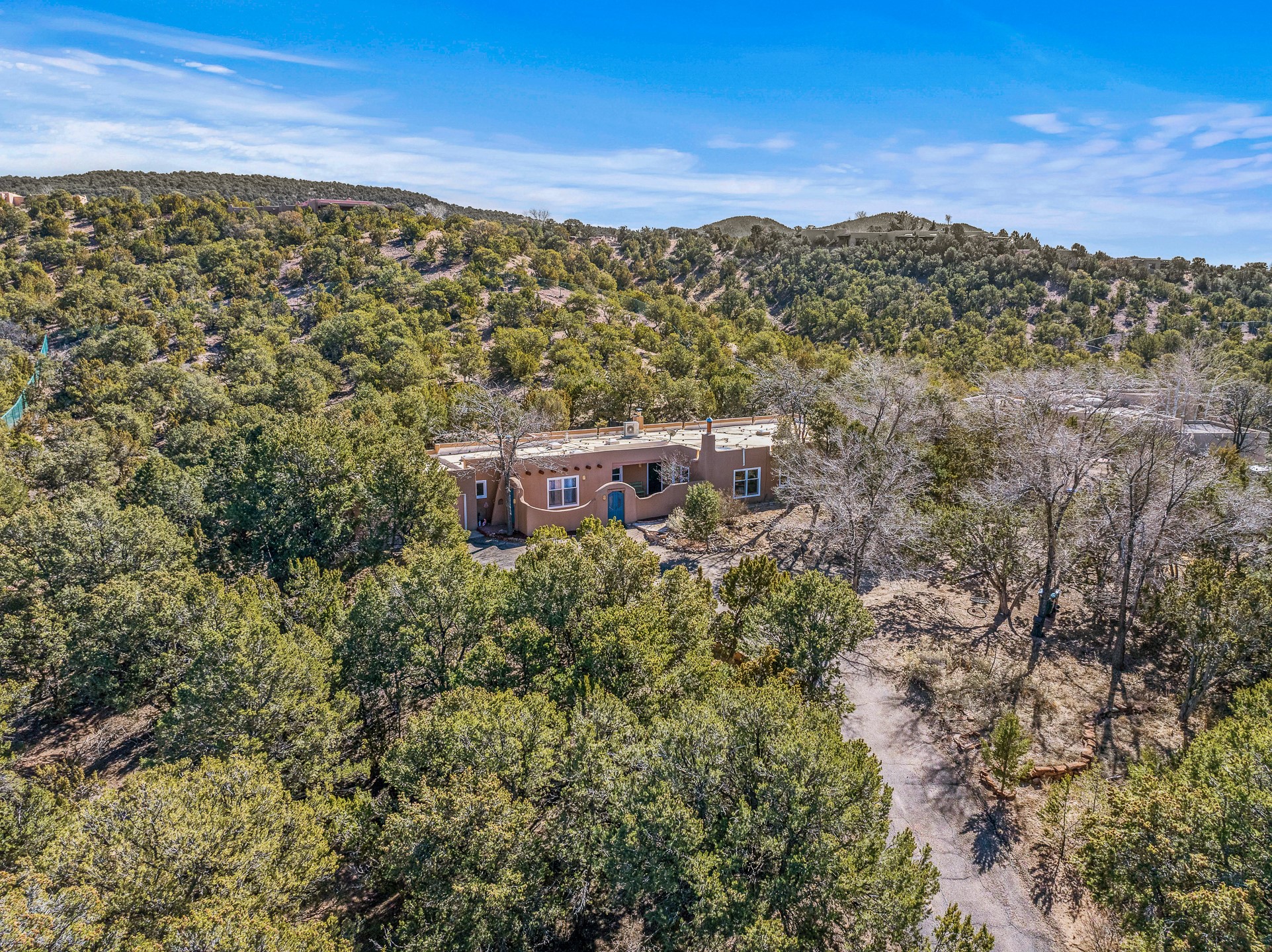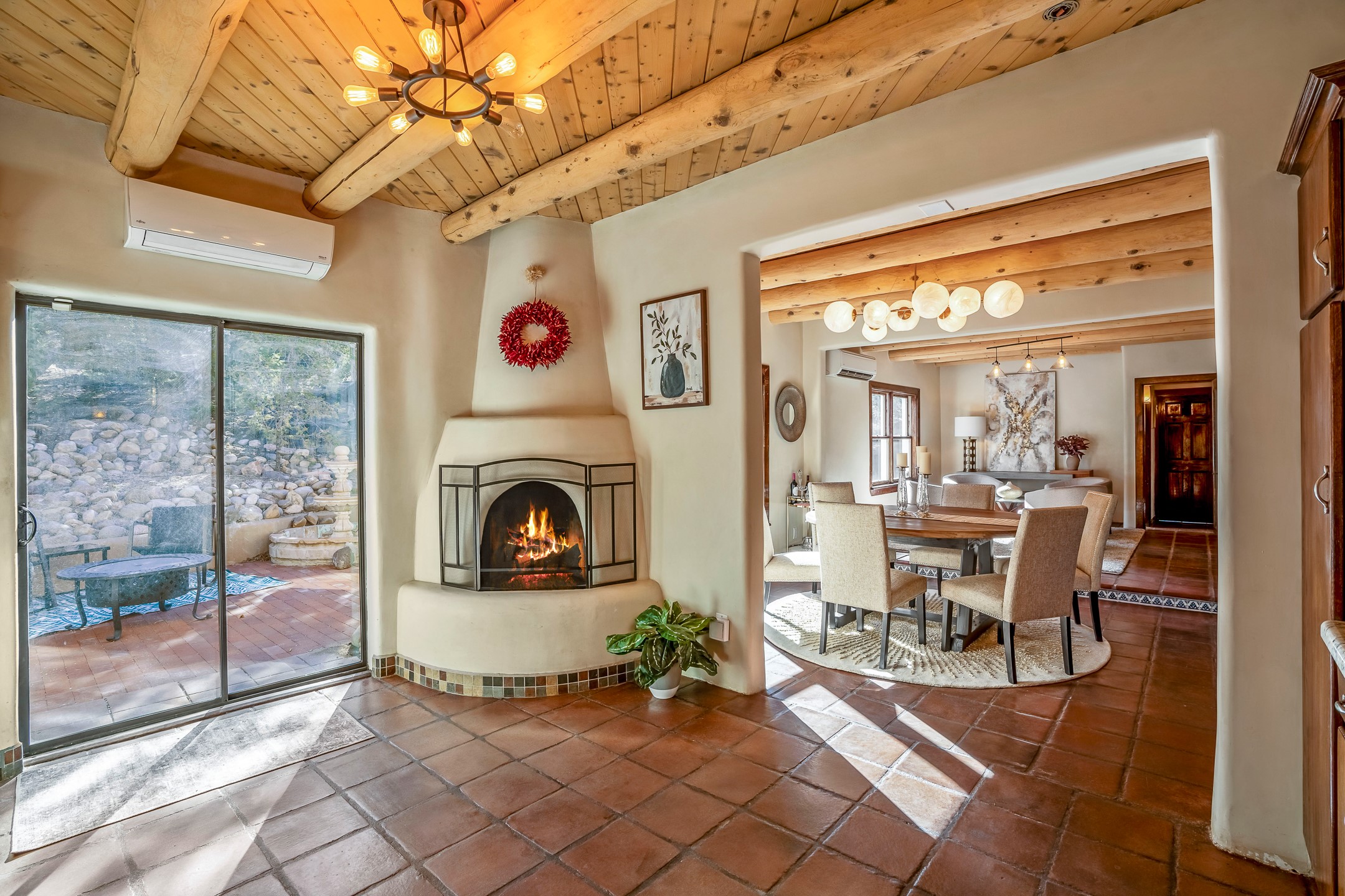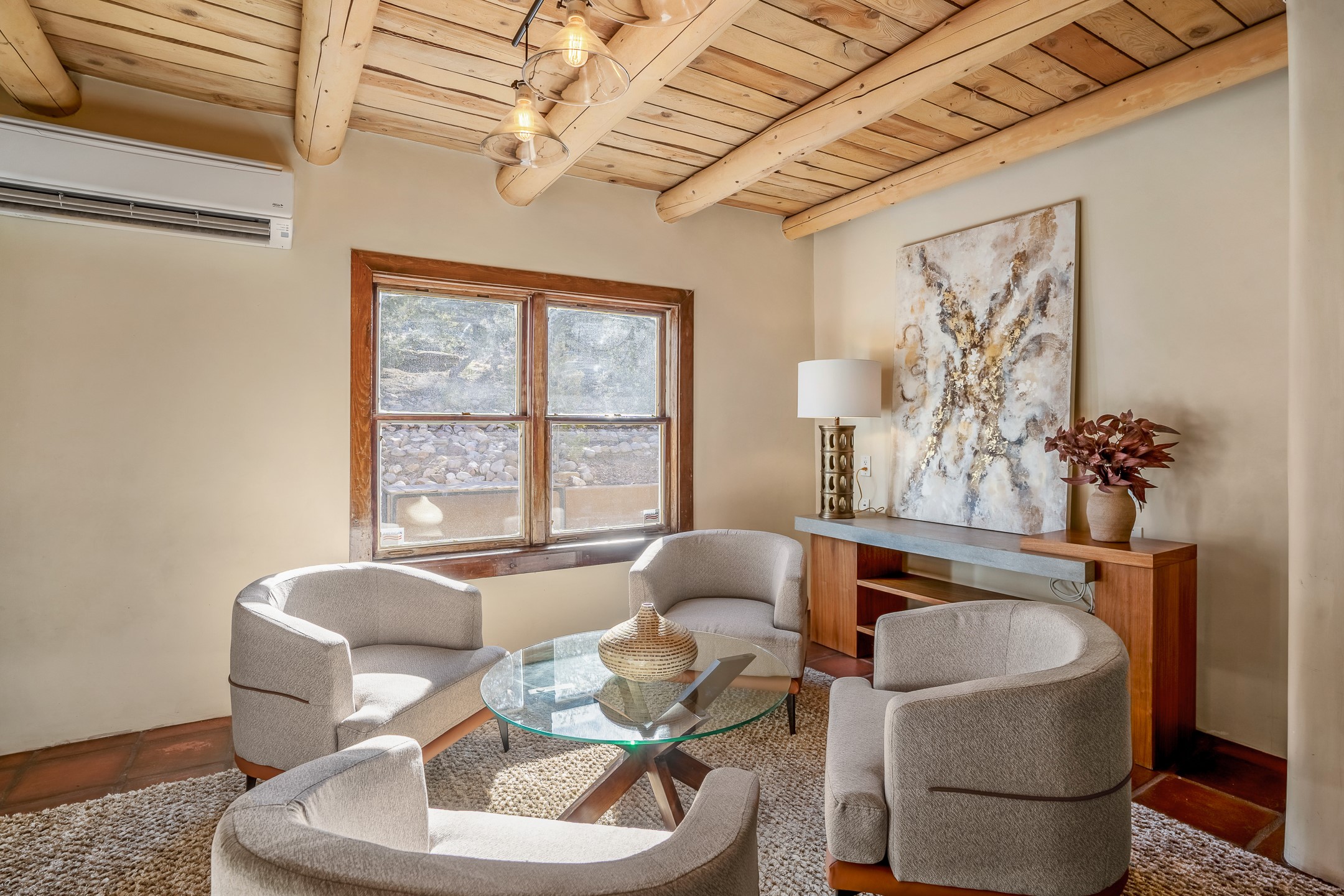 Nestled in the highly desirable Barranca Road area, located just 5 minutes from downtown Santa Fe and a short drive to Bishop's Lodge and Tesuque, this stunning 3-bedroom, 3-bathroom Santa Fe-style home offers 3,100 sq. ft. of beautifully designed living space on a private 1.75-acre lot. With a single-level open floor plan and multiple living areas, this meticulously maintained home blends timeless elegance with modern upgrades. Included is a bonus room that is currently used as a fourth bedroom with courtyard access and privacy. This home boasts classic Southwestern details, including vigas, corbels, and tongue-and-groove ceilings throughout. The primary suite is a true retreat, with double walk-in closets, featuring a private courtyard with a Caldera salt water hot tub, and direct outdoor access, perfect for stargazing. Additional upgrades include refinished and newly added tile flooring in the bonus room, zoned heating and A/C splits in every living space, upgraded lighting and hardware, new appliances, and hand-troweled plaster walls. The remodeled TV room features a see-through display wall, adding a contemporary touch to this charming home. Step outside to enjoy breathtaking sunset views from the hilltop backyard. The expansive lot has been thoughtfully maintained, with newly trimmed trees and fencing enclosing most of the property--while still offering space for personal touches. Experience peace, tranquility, and the best of Santa Fe living in this exceptional, competitively priced home. Don't miss this incredible opportunity. Imagine the possibilities and schedule your private tour today!