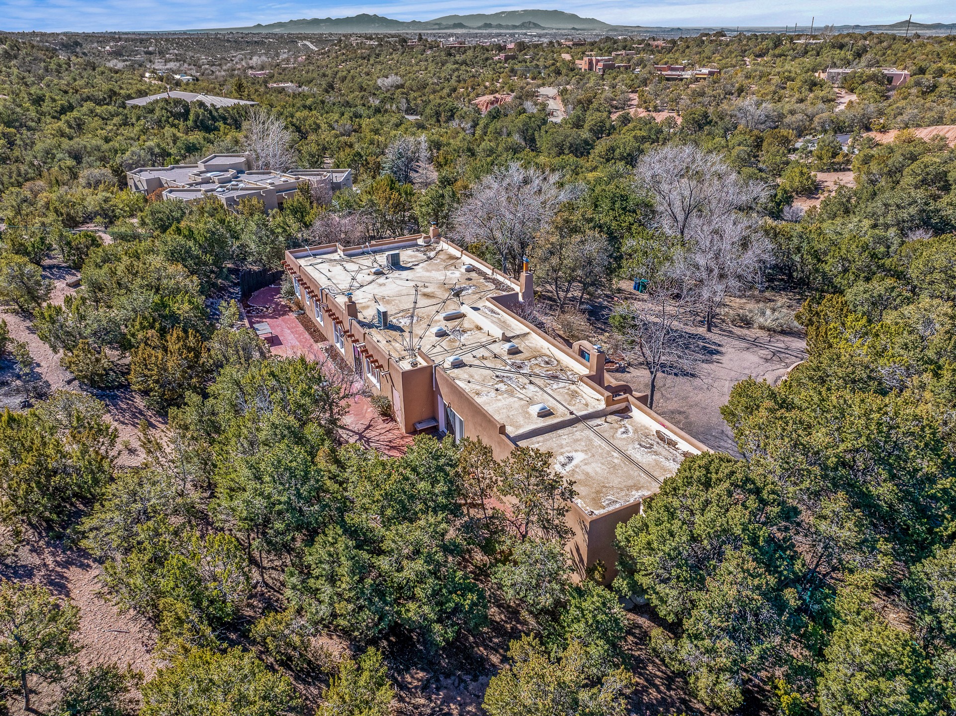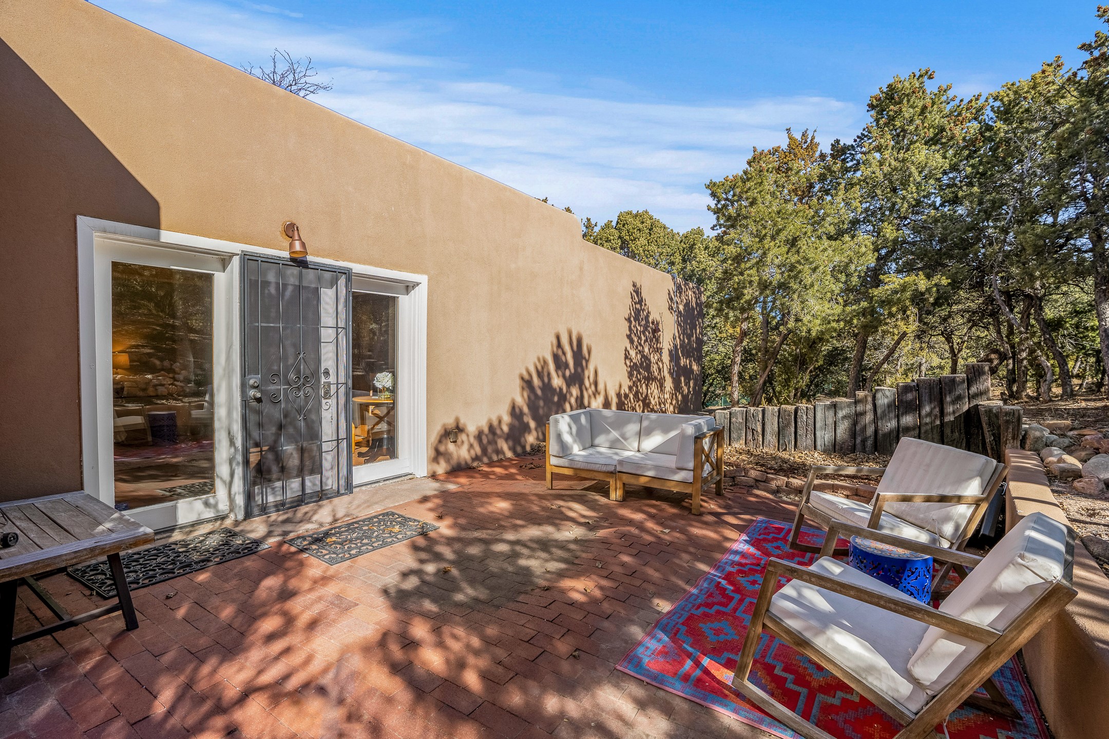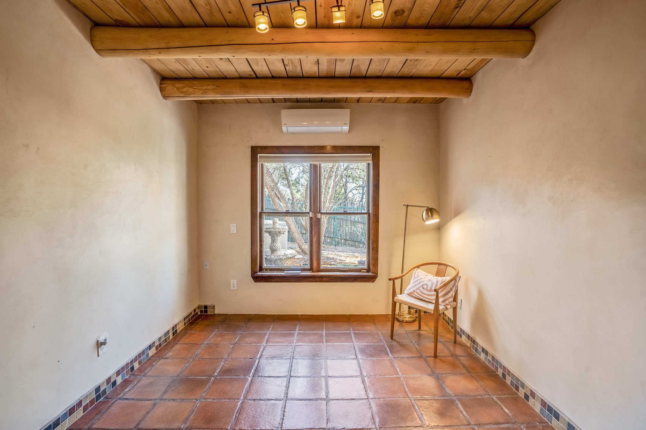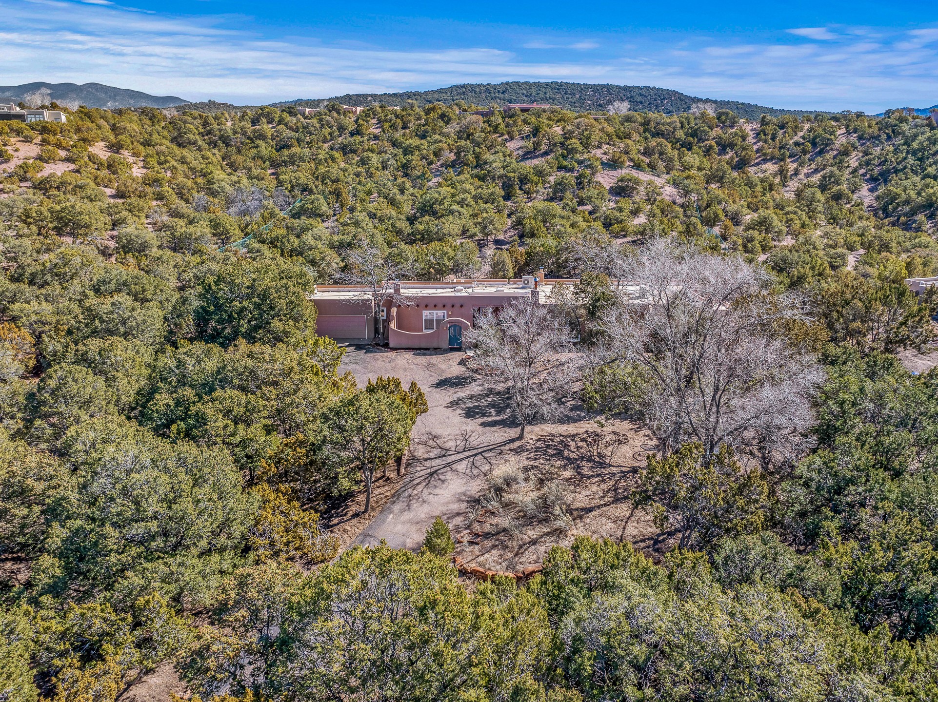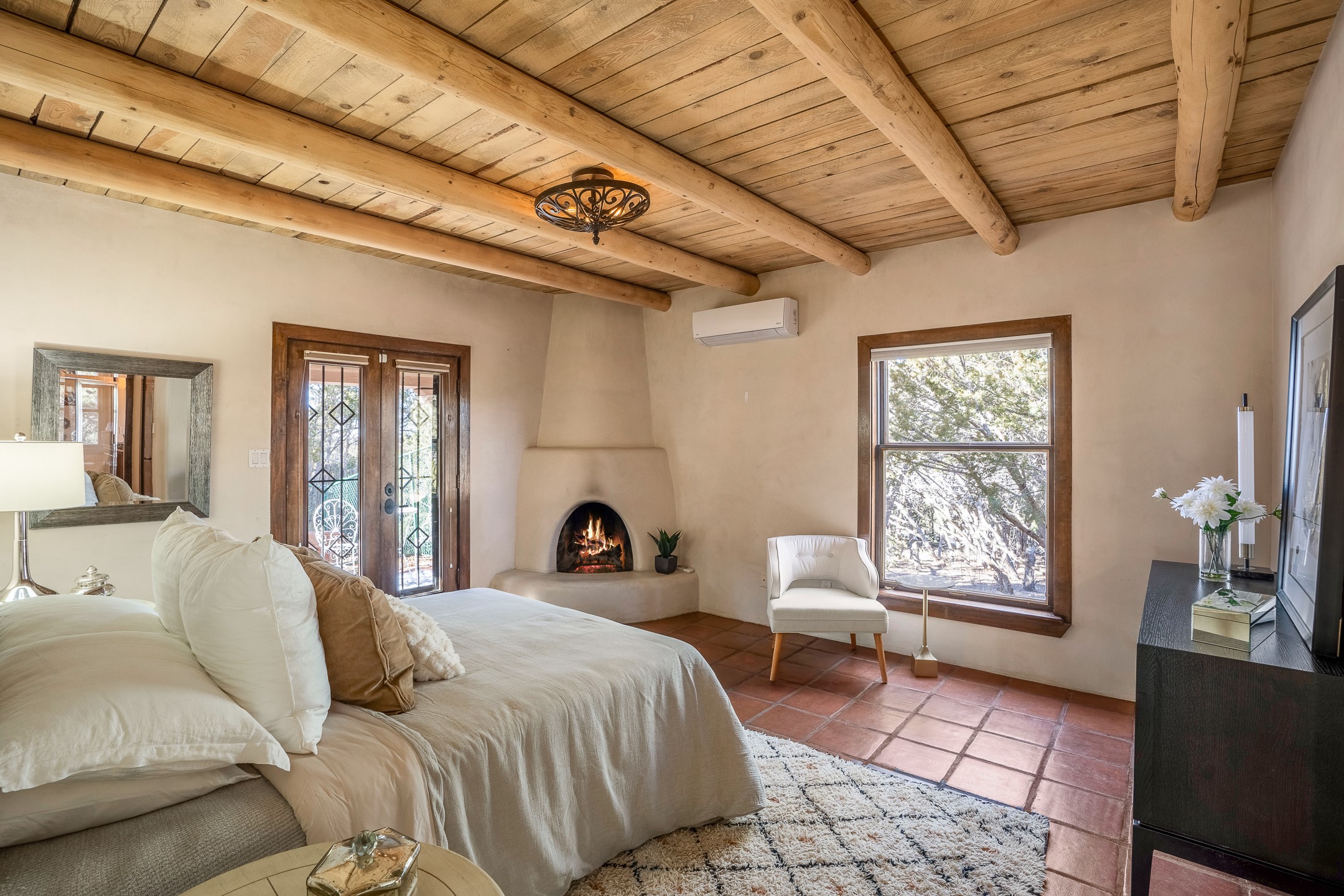 Nestled in the highly desirable Barranca Road area, located just 5 minutes from downtown Santa Fe and a short drive to Bishop's Lodge and Tesuque, this stunning 3-bedroom, 3-bathroom Santa Fe-style home offers 3,100 sq. ft. of beautifully designed living space on a private 1.75-acre lot. With a single-level open floor plan and multiple living areas, this meticulously maintained home blends timeless elegance with modern upgrades. Included is a bonus room that is currently used as a fourth bedroom with courtyard access and privacy. This home boasts classic Southwestern details, including vigas, corbels, and tongue-and-groove ceilings throughout. The primary suite is a true retreat, with double walk-in closets, featuring a private courtyard with a Caldera salt water hot tub, and direct outdoor access, perfect for stargazing. Additional upgrades include refinished and newly added tile flooring in the bonus room, zoned heating and A/C splits in every living space, upgraded lighting and hardware, new appliances, and hand-troweled plaster walls. The remodeled TV room features a see-through display wall, adding a contemporary touch to this charming home. Step outside to enjoy breathtaking sunset views from the hilltop backyard. The expansive lot has been thoughtfully maintained, with newly trimmed trees and fencing enclosing most of the property--while still offering space for personal touches. Experience peace, tranquility, and the best of Santa Fe living in this exceptional, competitively priced home. Don't miss this incredible opportunity. Imagine the possibilities and schedule your private tour today!