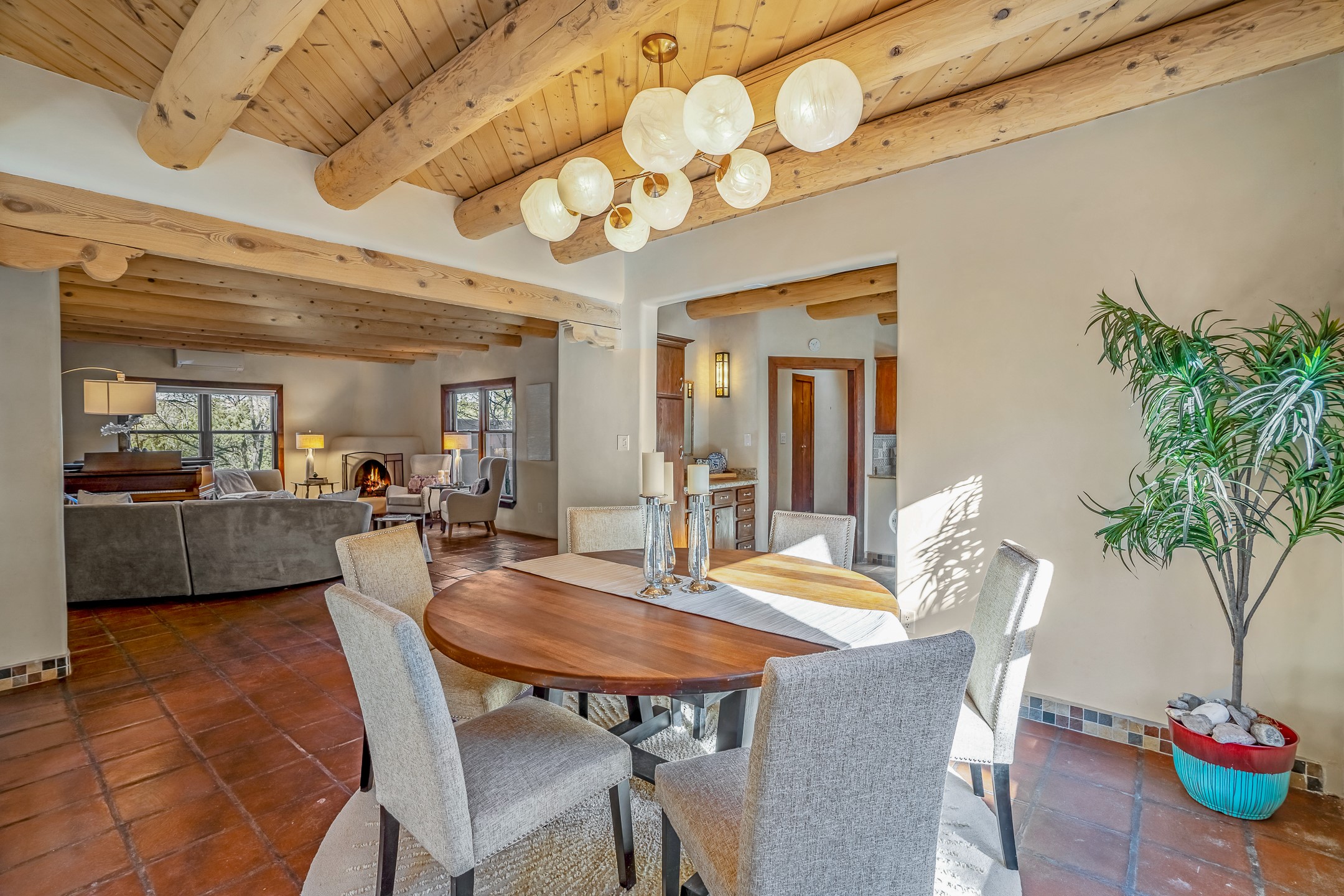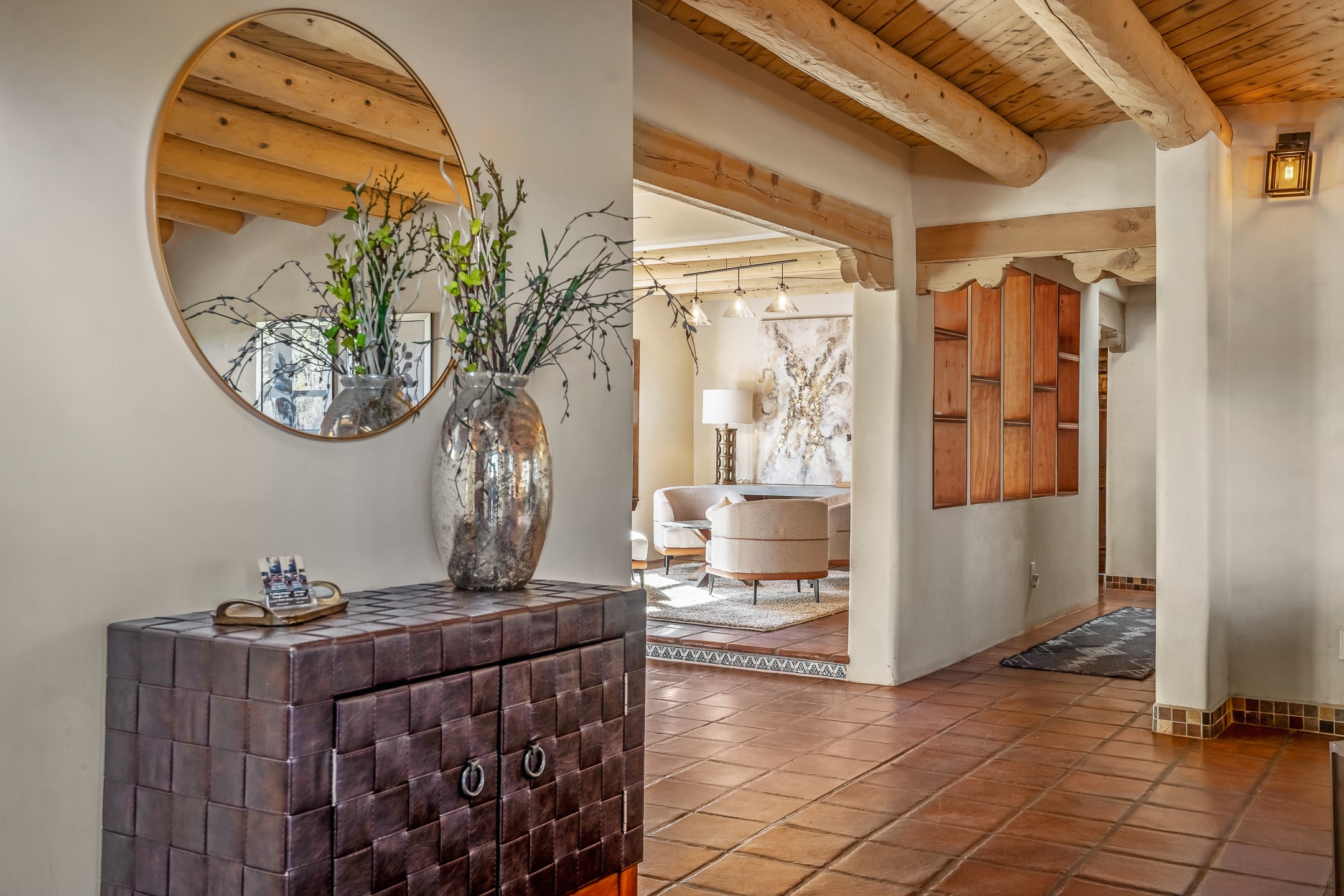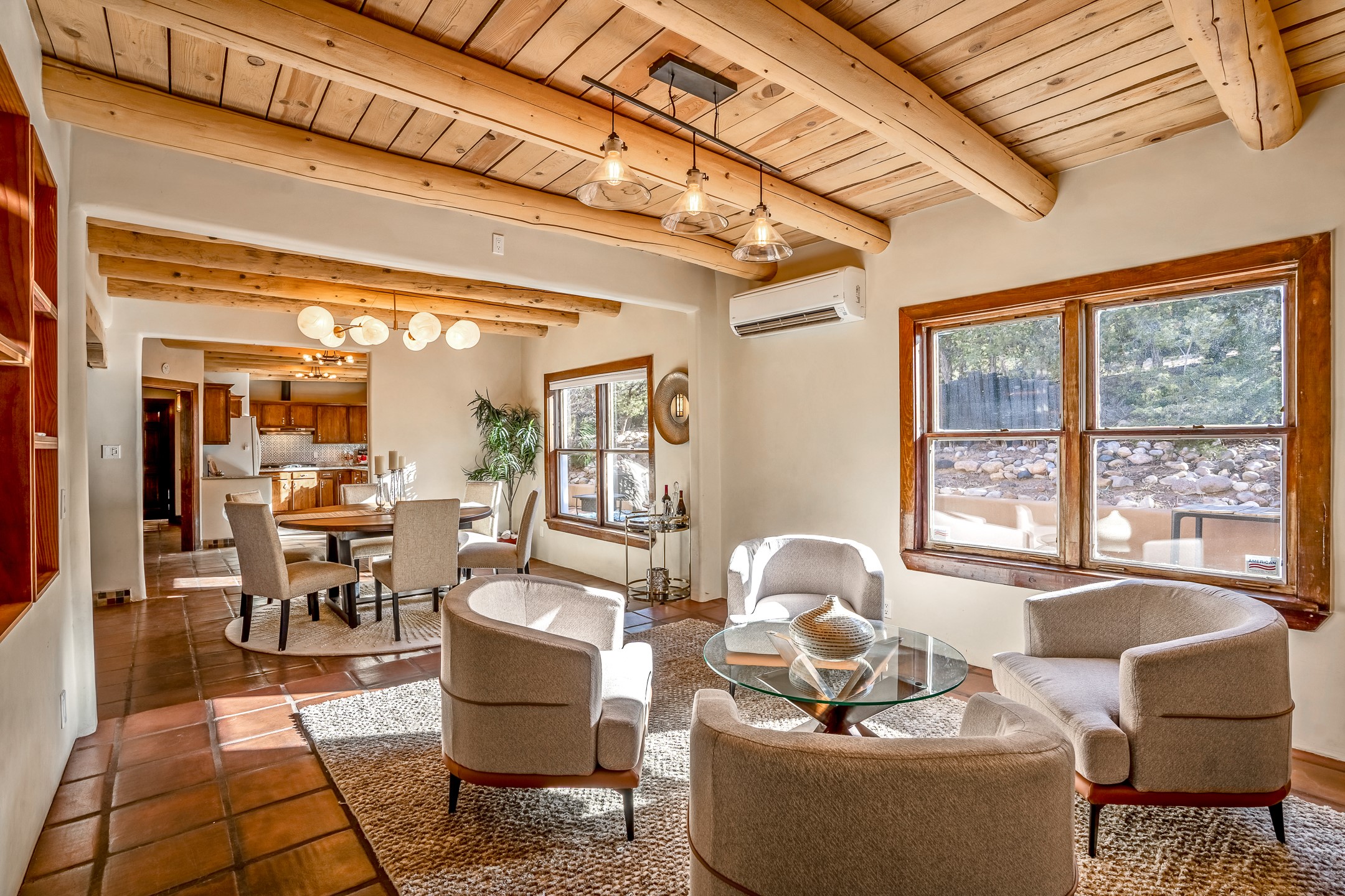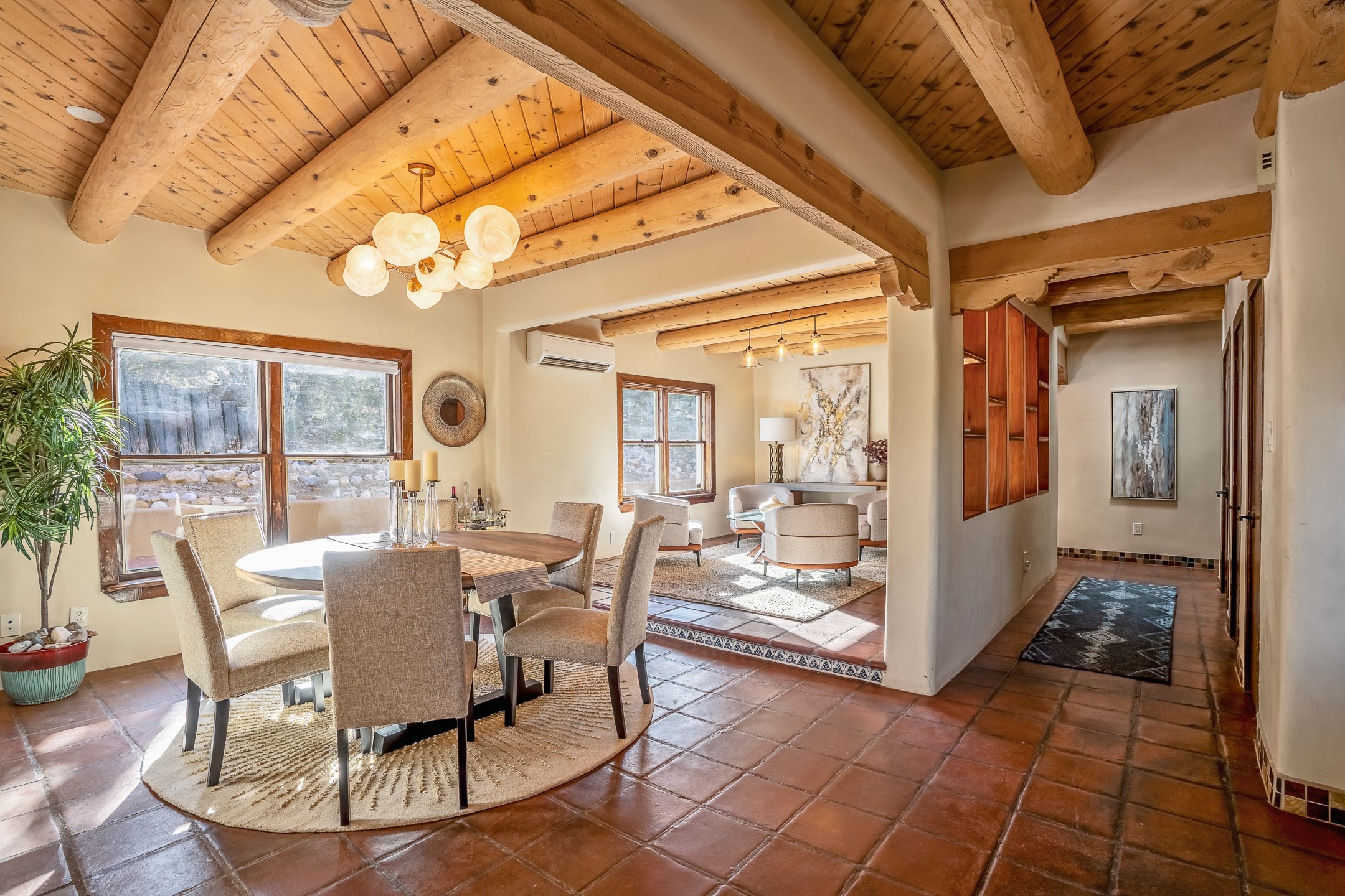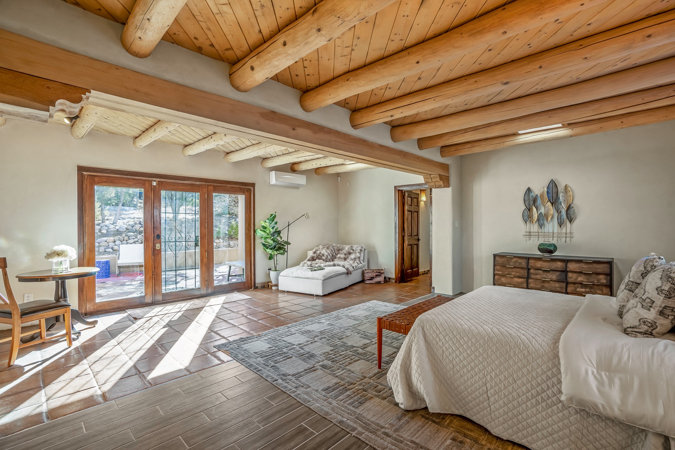 Nestled in the highly desirable Barranca Road area, located just 5 minutes from downtown Santa Fe and a short drive to Bishop's Lodge and Tesuque, this stunning 3-bedroom, 3-bathroom Santa Fe-style home offers 3,100 sq. ft. of beautifully designed living space on a private 1.75-acre lot. With a single-level open floor plan and multiple living areas, this meticulously maintained home blends timeless elegance with modern upgrades. Included is a bonus room that is currently used as a fourth bedroom with courtyard access and privacy. This home boasts classic Southwestern details, including vigas, corbels, and tongue-and-groove ceilings throughout. The primary suite is a true retreat, with double walk-in closets, featuring a private courtyard with a Caldera salt water hot tub, and direct outdoor access, perfect for stargazing. Additional upgrades include refinished and newly added tile flooring in the bonus room, zoned heating and A/C splits in every living space, upgraded lighting and hardware, new appliances, and hand-troweled plaster walls. The remodeled TV room features a see-through display wall, adding a contemporary touch to this charming home. Step outside to enjoy breathtaking sunset views from the hilltop backyard. The expansive lot has been thoughtfully maintained, with newly trimmed trees and fencing enclosing most of the property--while still offering space for personal touches. Experience peace, tranquility, and the best of Santa Fe living in this exceptional, competitively priced home. Don't miss this incredible opportunity. Imagine the possibilities and schedule your private tour today!