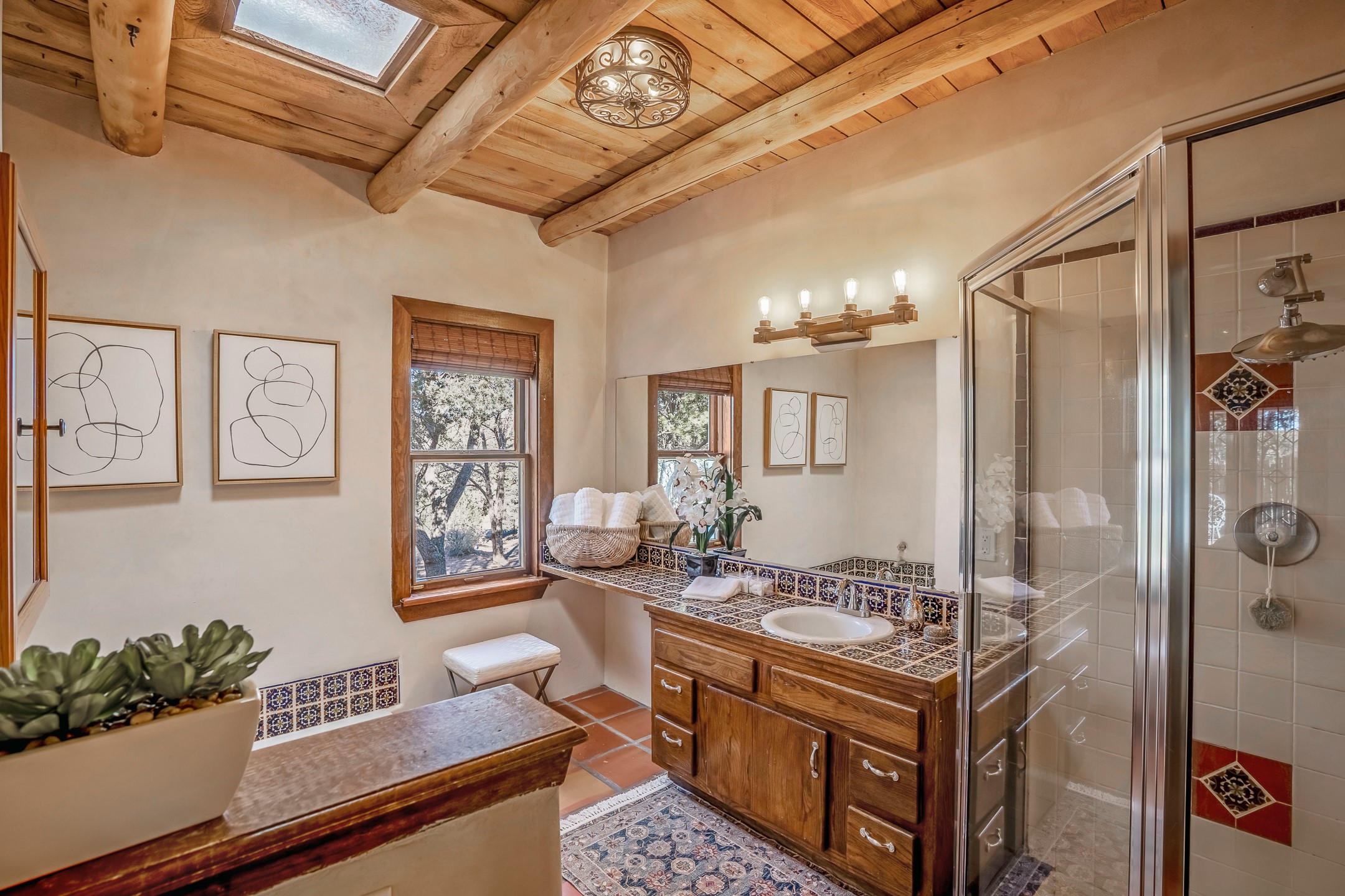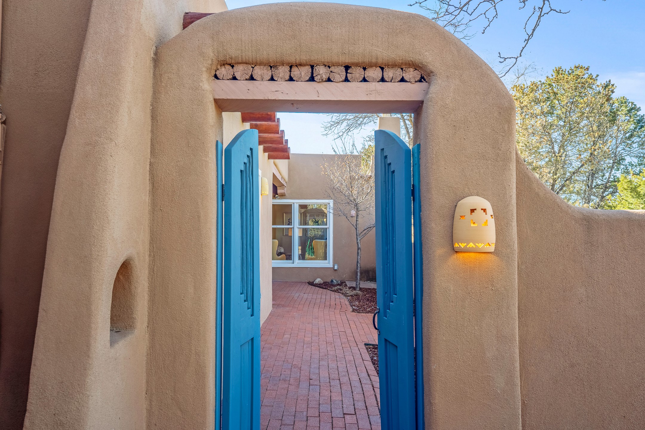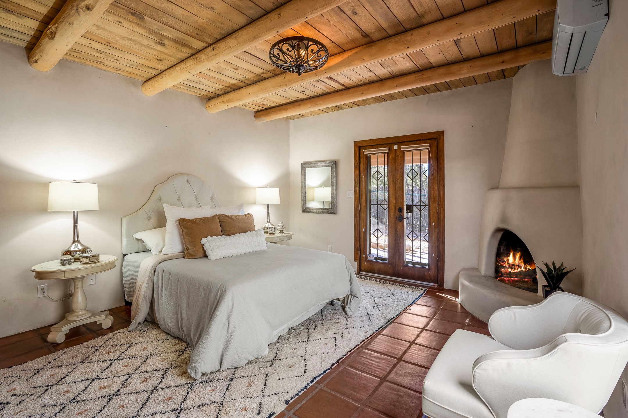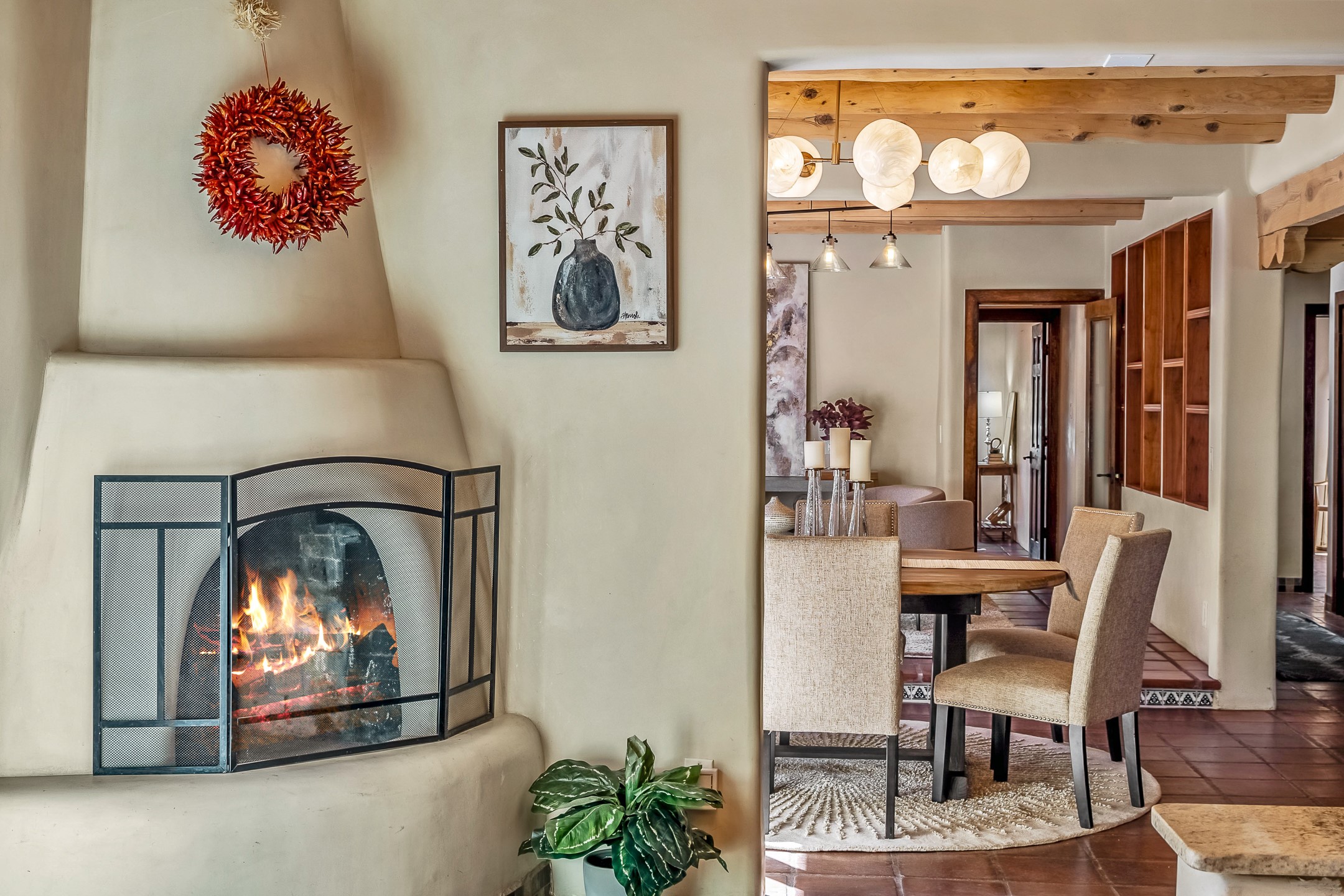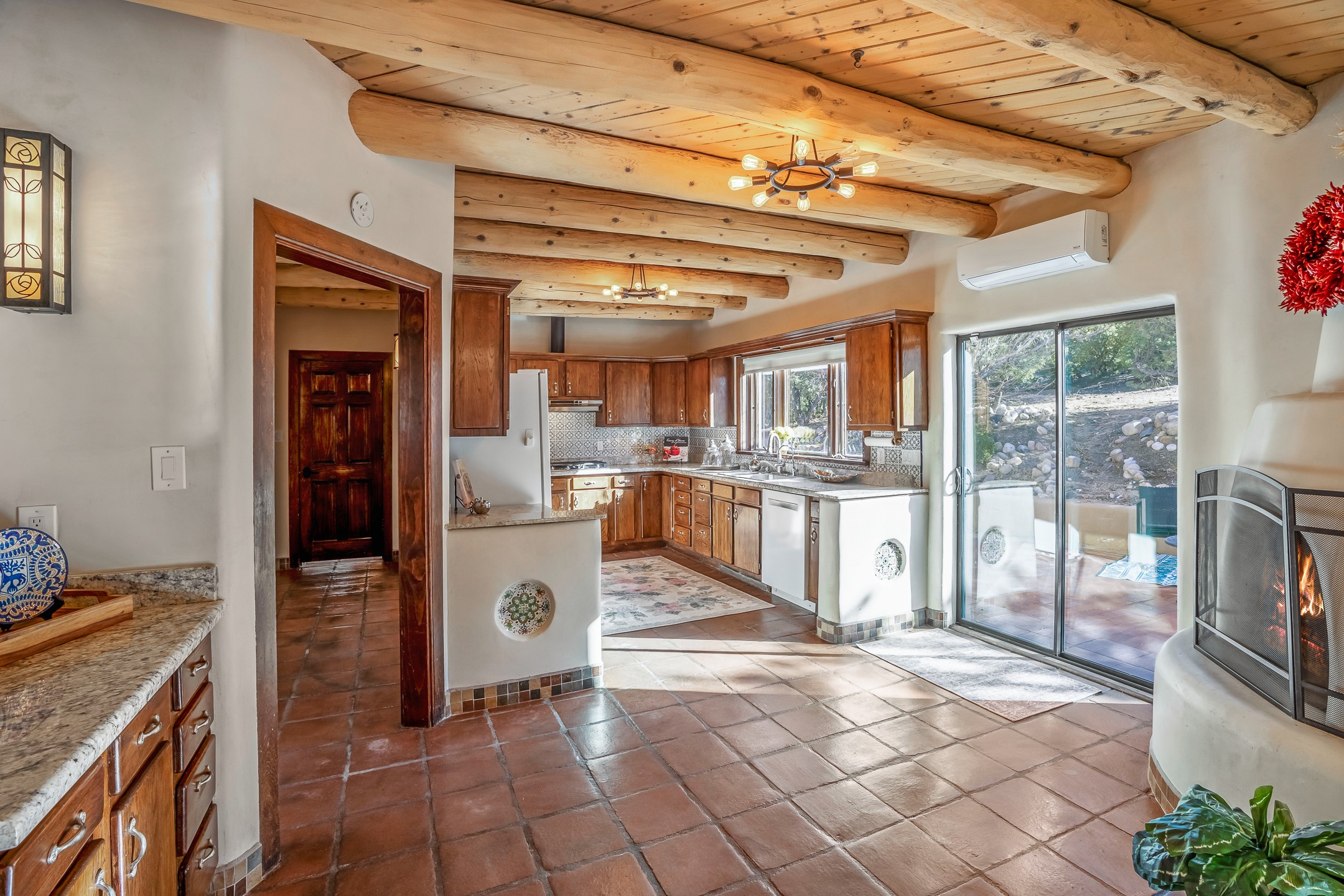Nestled in the highly desirable Barranca Road area, located just 5 minutes from downtown Santa Fe and a short drive to Bishop's Lodge and Tesuque, this stunning 3-bedroom, 3-bathroom Santa Fe-style home offers 3,100 sq. ft. of beautifully designed living space on a private 1.75-acre lot. With a single-level open floor plan and multiple living areas, this meticulously maintained home blends timeless elegance with modern upgrades. Included is a bonus room that is currently used as a fourth bedroom with courtyard access and privacy. This home boasts classic Southwestern details, including vigas, corbels, and tongue-and-groove ceilings throughout. The primary suite is a true retreat, with double walk-in closets, featuring a private courtyard with a Caldera salt water hot tub, and direct outdoor access, perfect for stargazing. Additional upgrades include refinished and newly added tile flooring in the bonus room, zoned heating and A/C splits in every living space, upgraded lighting and hardware, new appliances, and hand-troweled plaster walls. The remodeled TV room features a see-through display wall, adding a contemporary touch to this charming home. Step outside to enjoy breathtaking sunset views from the hilltop backyard. The expansive lot has been thoughtfully maintained, with newly trimmed trees and fencing enclosing most of the property--while still offering space for personal touches. Experience peace, tranquility, and the best of Santa Fe living in this exceptional, competitively priced home. Don't miss this incredible opportunity. Imagine the possibilities and schedule your private tour today!
