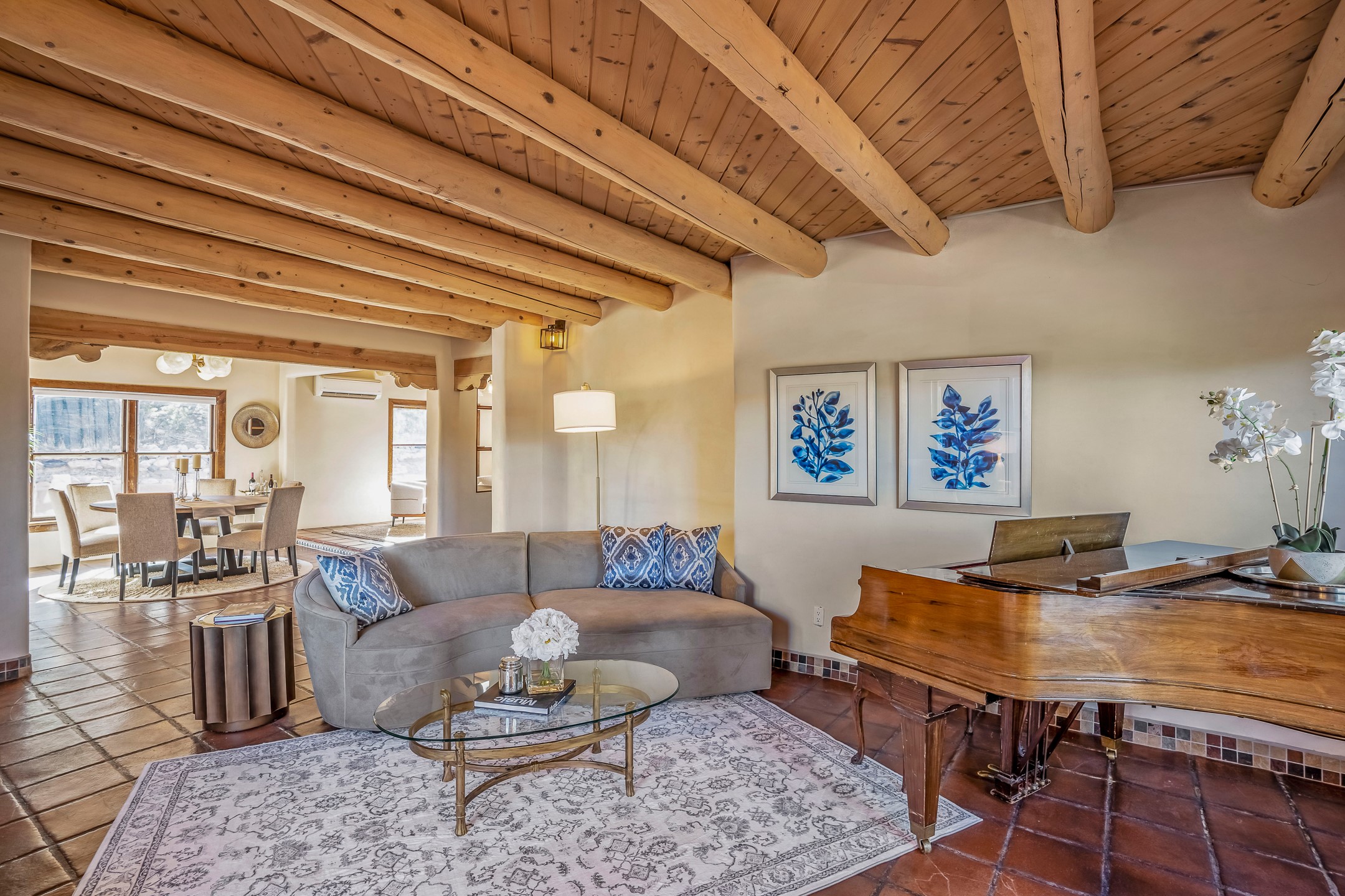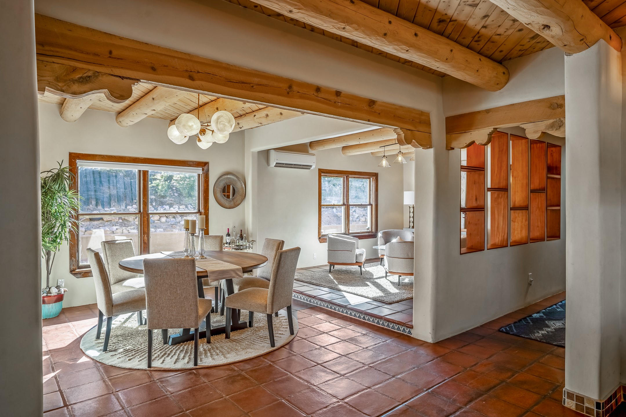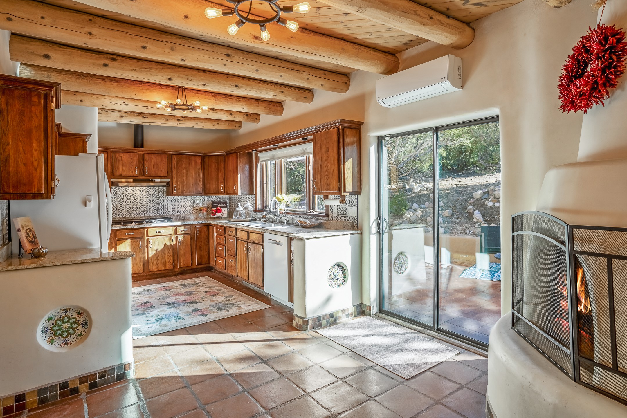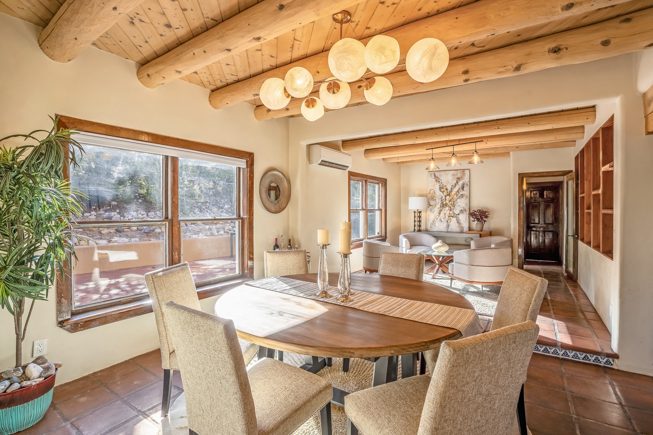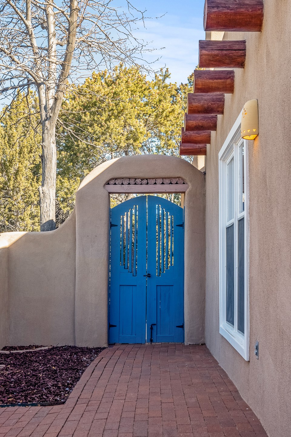 Nestled in the highly desirable Barranca Road area, located just 5 minutes from downtown Santa Fe and a short drive to Bishop's Lodge and Tesuque, this stunning 3-bedroom, 3-bathroom Santa Fe-style home offers 3,100 sq. ft. of beautifully designed living space on a private 1.75-acre lot. With a single-level open floor plan and multiple living areas, this meticulously maintained home blends timeless elegance with modern upgrades. Included is a bonus room that is currently used as a fourth bedroom with courtyard access and privacy. This home boasts classic Southwestern details, including vigas, corbels, and tongue-and-groove ceilings throughout. The primary suite is a true retreat, with double walk-in closets, featuring a private courtyard with a Caldera salt water hot tub, and direct outdoor access, perfect for stargazing. Additional upgrades include refinished and newly added tile flooring in the bonus room, zoned heating and A/C splits in every living space, upgraded lighting and hardware, new appliances, and hand-troweled plaster walls. The remodeled TV room features a see-through display wall, adding a contemporary touch to this charming home. Step outside to enjoy breathtaking sunset views from the hilltop backyard. The expansive lot has been thoughtfully maintained, with newly trimmed trees and fencing enclosing most of the property--while still offering space for personal touches. Experience peace, tranquility, and the best of Santa Fe living in this exceptional, competitively priced home. Don't miss this incredible opportunity. Imagine the possibilities and schedule your private tour today!