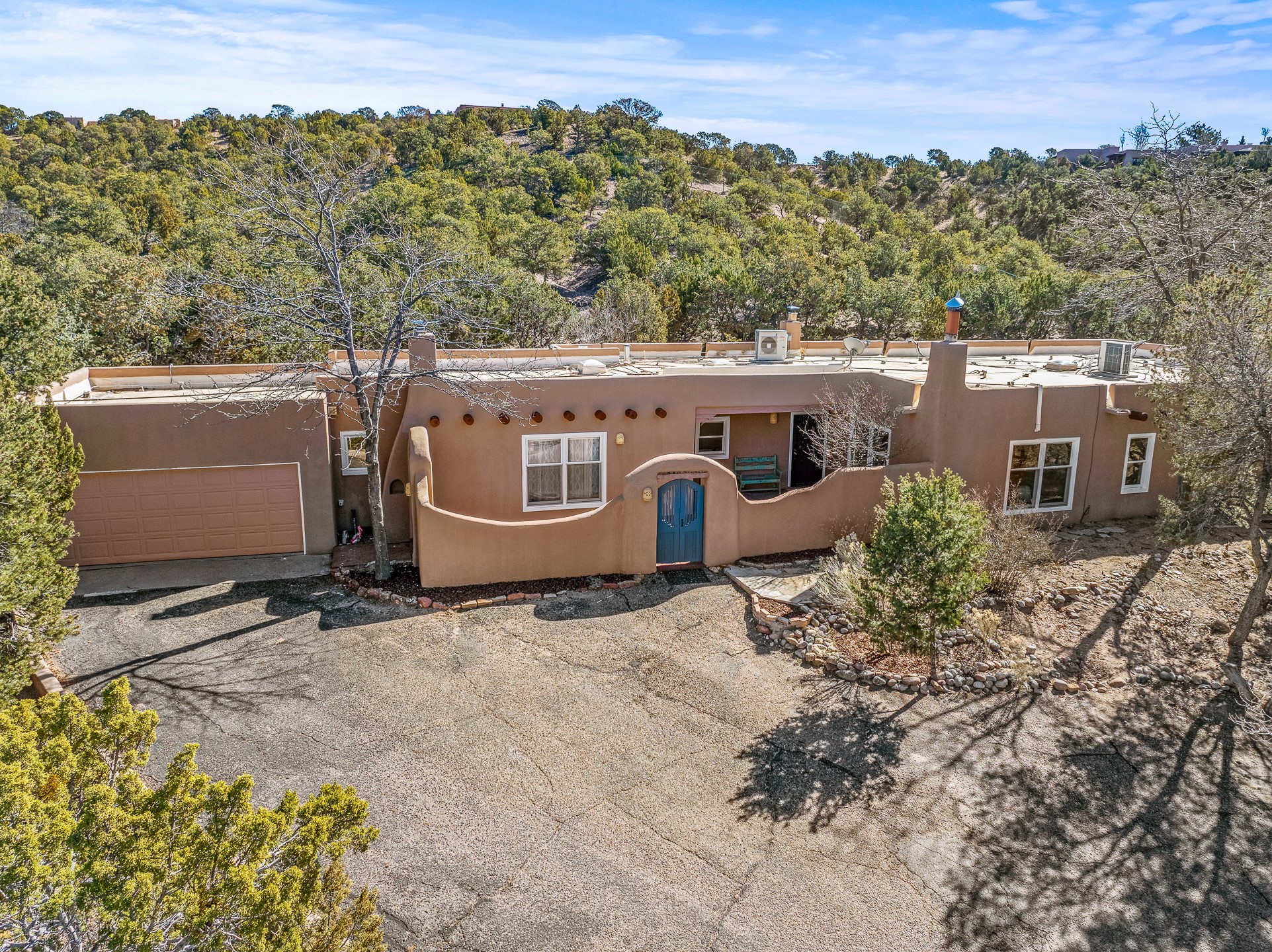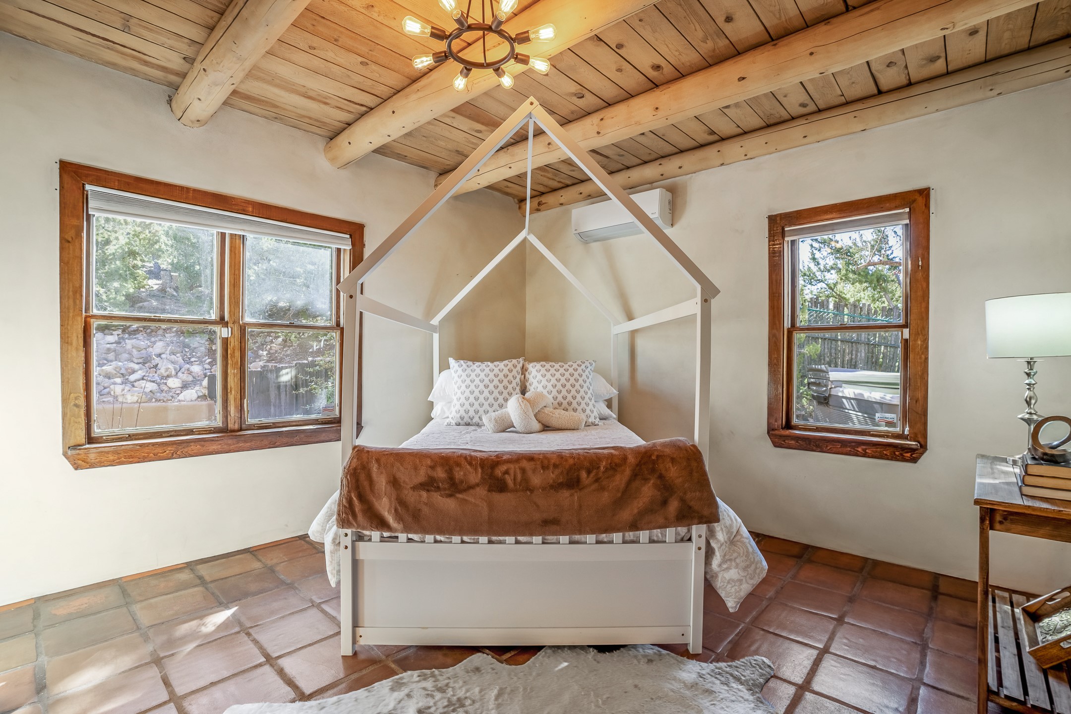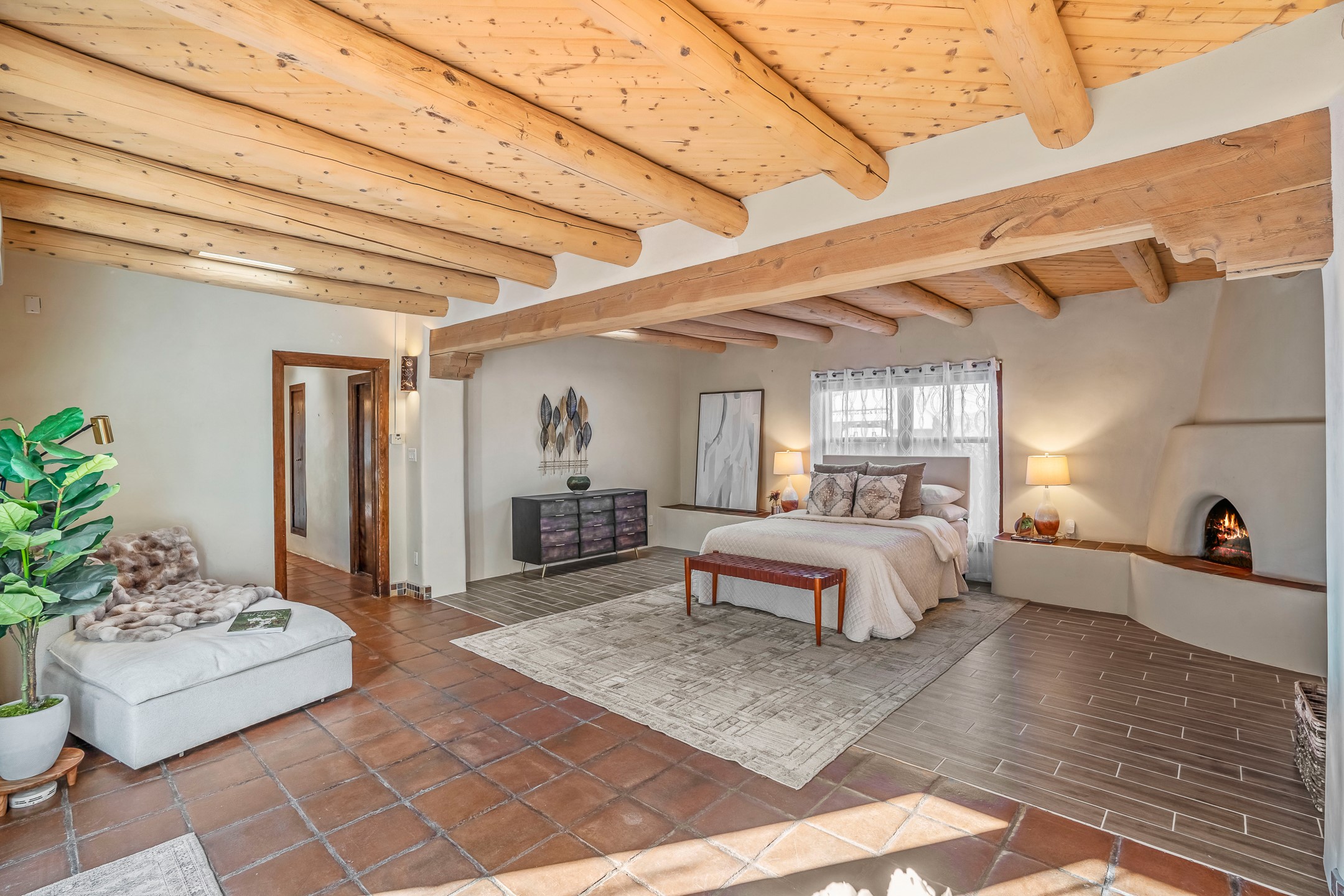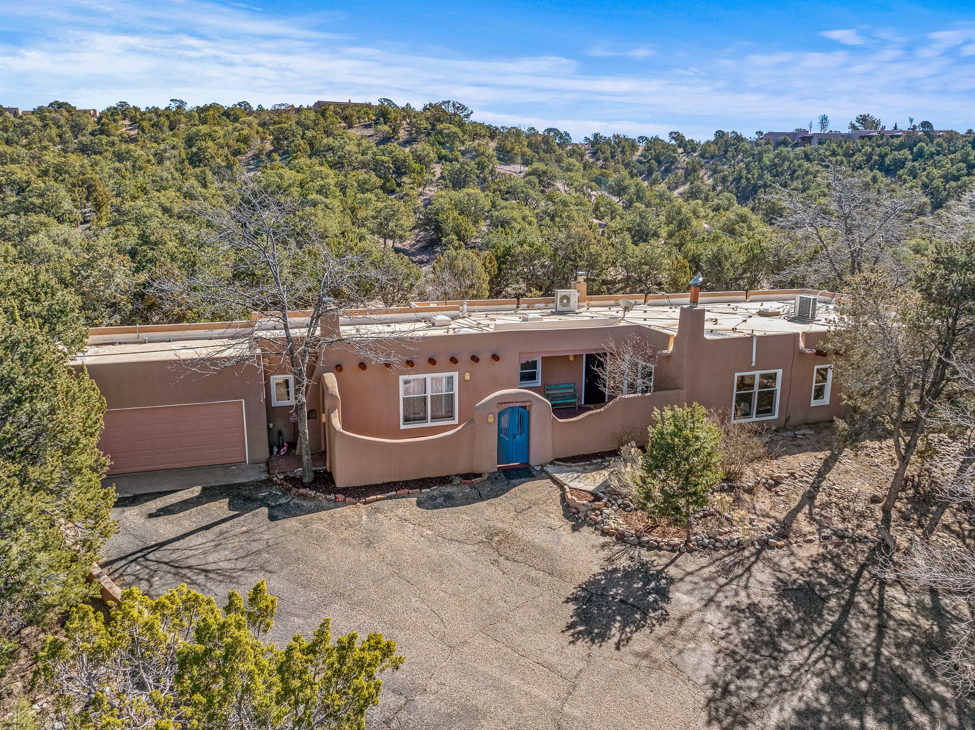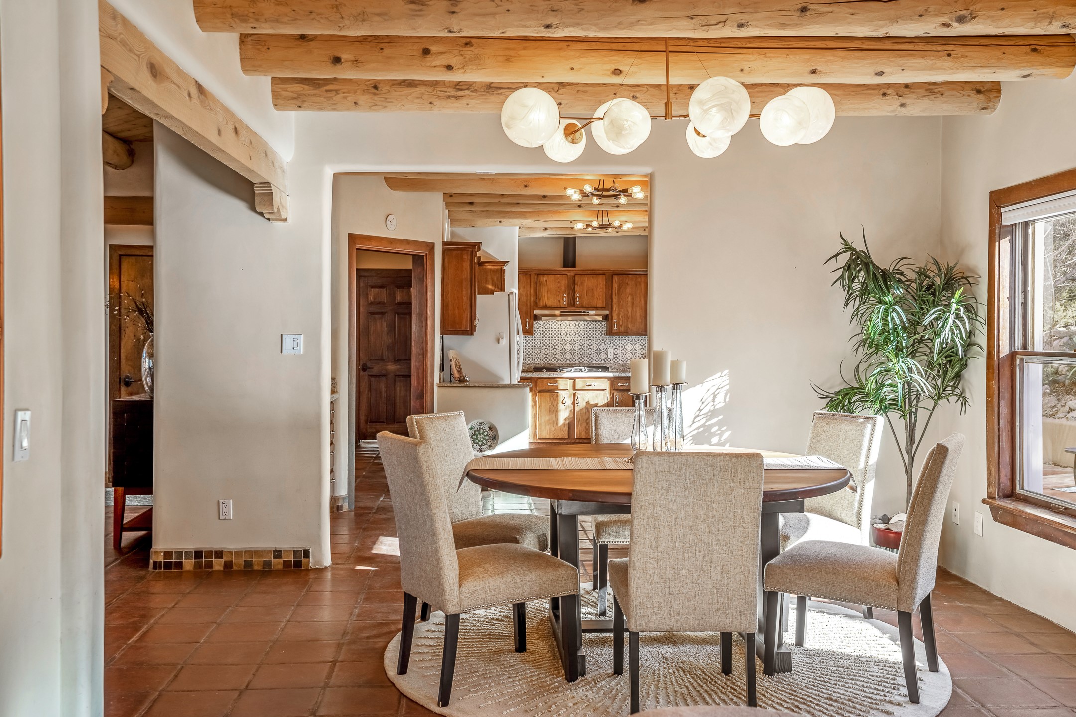 Nestled in the highly desirable Barranca Road area, located just 5 minutes from downtown Santa Fe and a short drive to Bishop's Lodge and Tesuque, this stunning 3-bedroom, 3-bathroom Santa Fe-style home offers 3,100 sq. ft. of beautifully designed living space on a private 1.75-acre lot. With a single-level open floor plan and multiple living areas, this meticulously maintained home blends timeless elegance with modern upgrades. Included is a bonus room that is currently used as a fourth bedroom with courtyard access and privacy. This home boasts classic Southwestern details, including vigas, corbels, and tongue-and-groove ceilings throughout. The primary suite is a true retreat, with double walk-in closets, featuring a private courtyard with a Caldera salt water hot tub, and direct outdoor access, perfect for stargazing. Additional upgrades include refinished and newly added tile flooring in the bonus room, zoned heating and A/C splits in every living space, upgraded lighting and hardware, new appliances, and hand-troweled plaster walls. The remodeled TV room features a see-through display wall, adding a contemporary touch to this charming home. Step outside to enjoy breathtaking sunset views from the hilltop backyard. The expansive lot has been thoughtfully maintained, with newly trimmed trees and fencing enclosing most of the property--while still offering space for personal touches. Experience peace, tranquility, and the best of Santa Fe living in this exceptional, competitively priced home. Don't miss this incredible opportunity. Imagine the possibilities and schedule your private tour today!