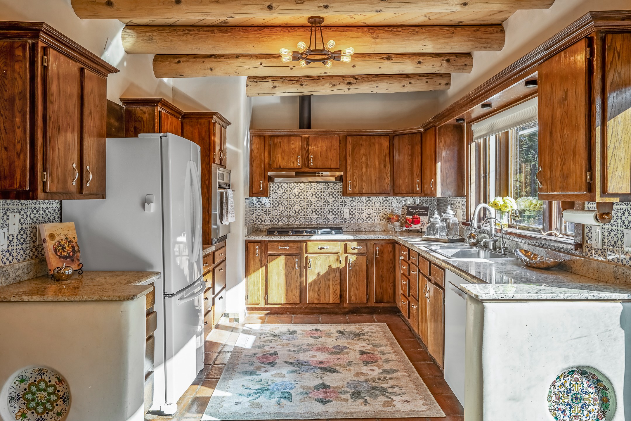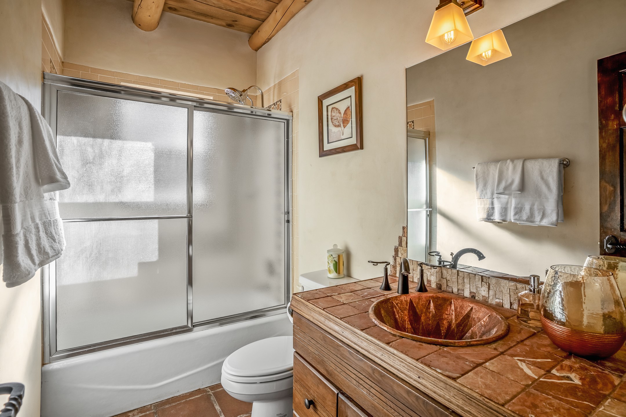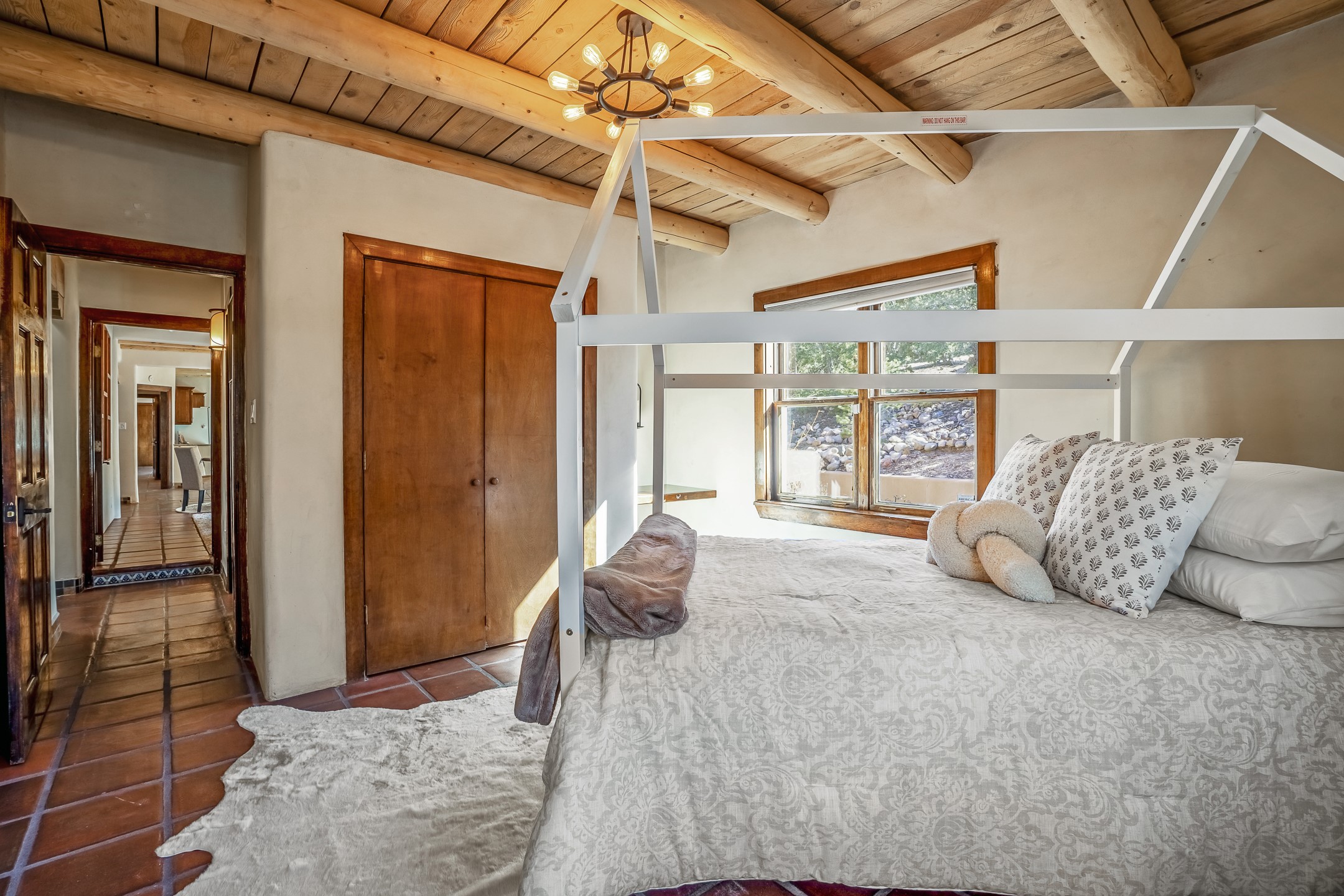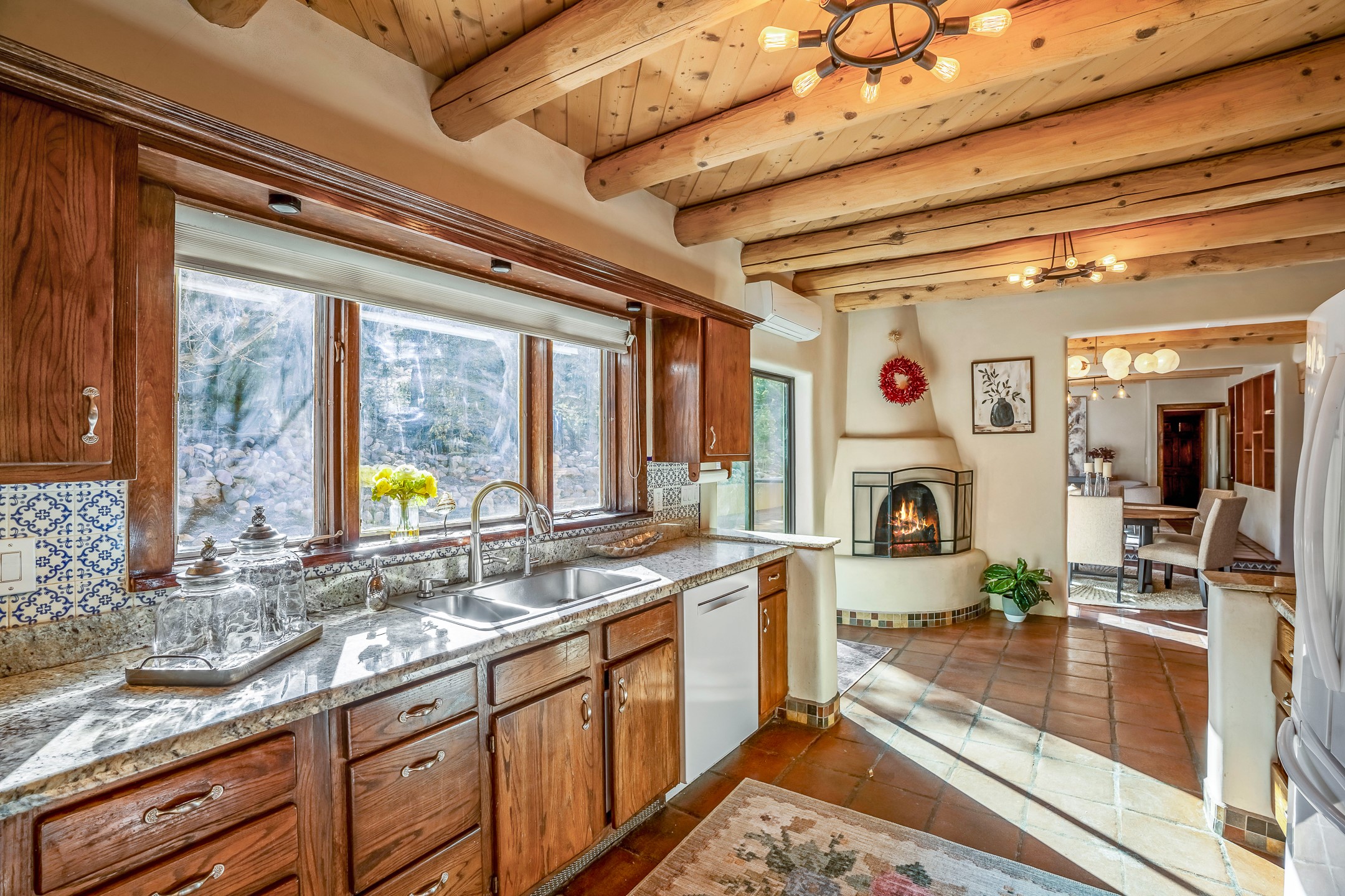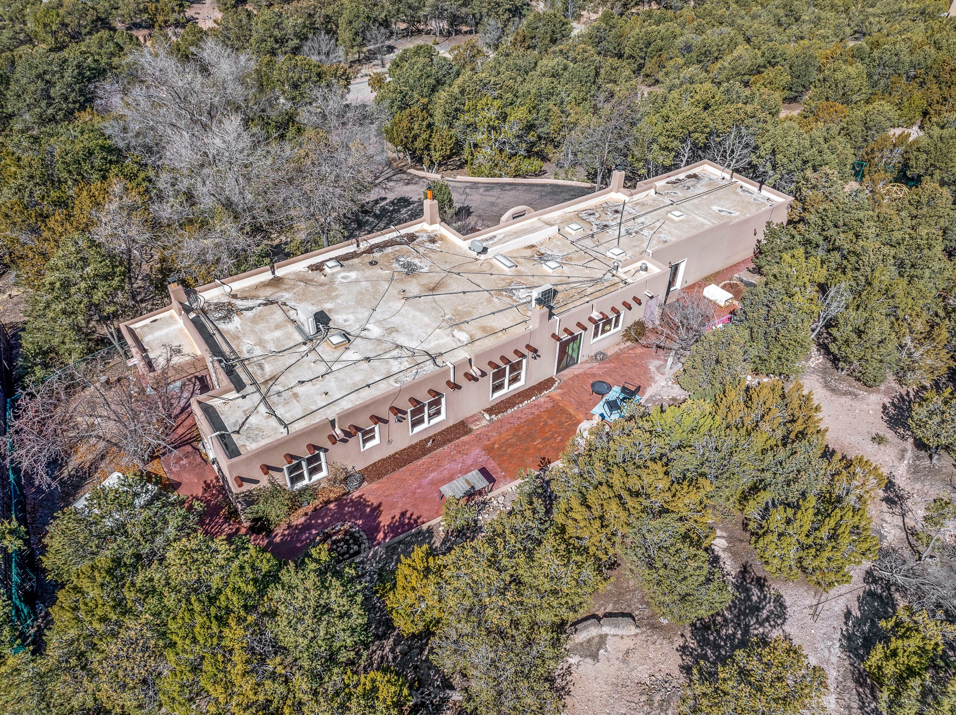 Nestled in the highly desirable Barranca Road area, located just 5 minutes from downtown Santa Fe and a short drive to Bishop's Lodge and Tesuque, this stunning 3-bedroom, 3-bathroom Santa Fe-style home offers 3,100 sq. ft. of beautifully designed living space on a private 1.75-acre lot. With a single-level open floor plan and multiple living areas, this meticulously maintained home blends timeless elegance with modern upgrades. Included is a bonus room that is currently used as a fourth bedroom with courtyard access and privacy. This home boasts classic Southwestern details, including vigas, corbels, and tongue-and-groove ceilings throughout. The primary suite is a true retreat, with double walk-in closets, featuring a private courtyard with a Caldera salt water hot tub, and direct outdoor access, perfect for stargazing. Additional upgrades include refinished and newly added tile flooring in the bonus room, zoned heating and A/C splits in every living space, upgraded lighting and hardware, new appliances, and hand-troweled plaster walls. The remodeled TV room features a see-through display wall, adding a contemporary touch to this charming home. Step outside to enjoy breathtaking sunset views from the hilltop backyard. The expansive lot has been thoughtfully maintained, with newly trimmed trees and fencing enclosing most of the property--while still offering space for personal touches. Experience peace, tranquility, and the best of Santa Fe living in this exceptional, competitively priced home. Don't miss this incredible opportunity. Imagine the possibilities and schedule your private tour today!