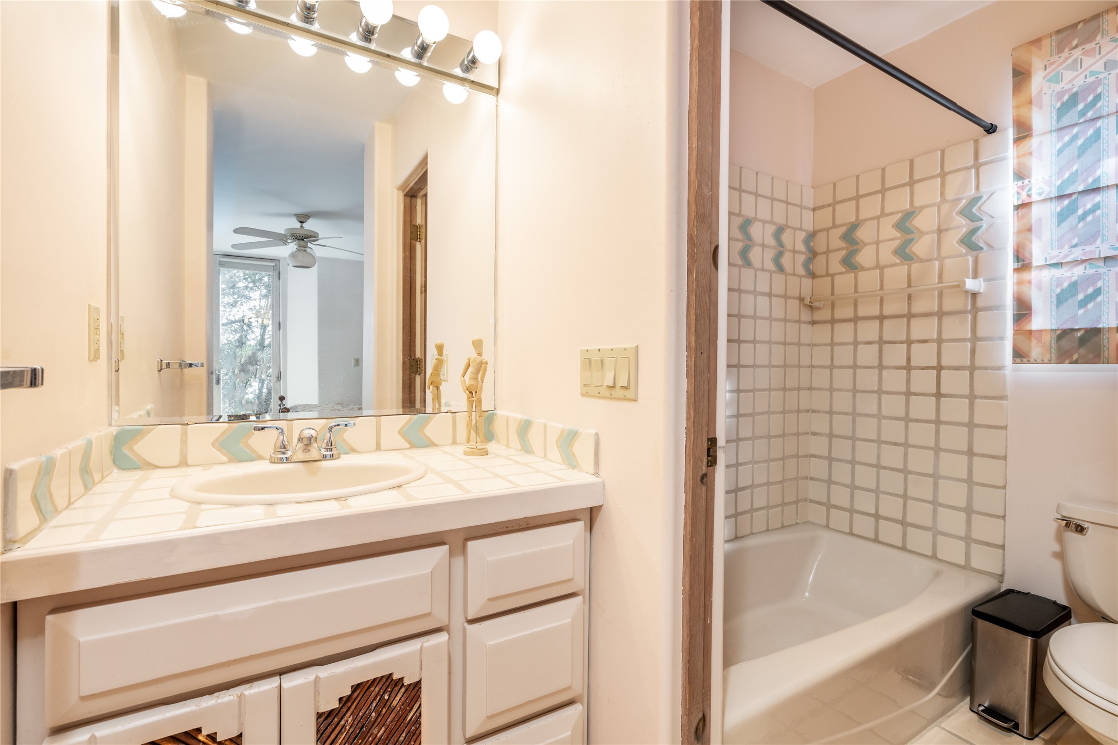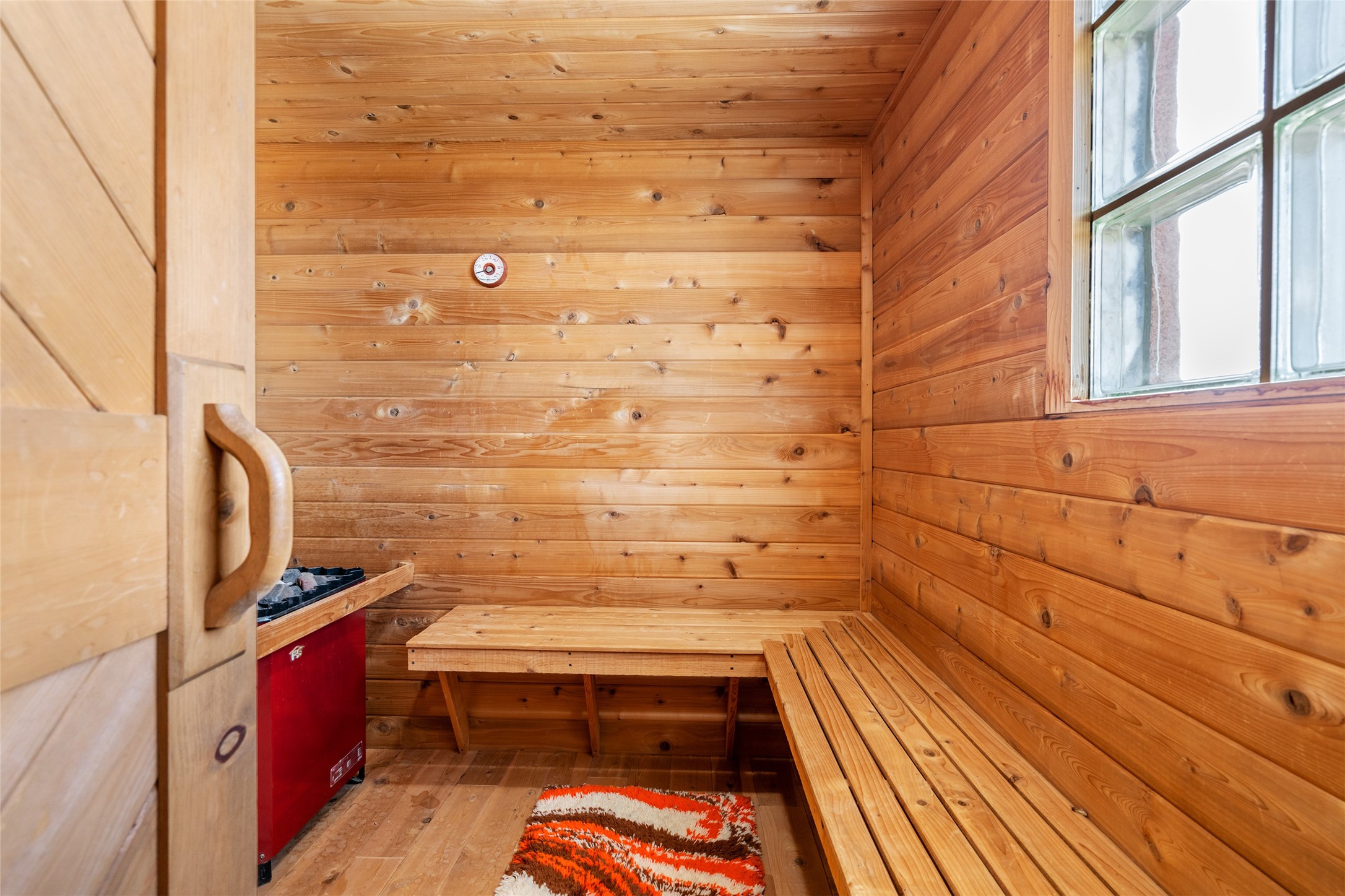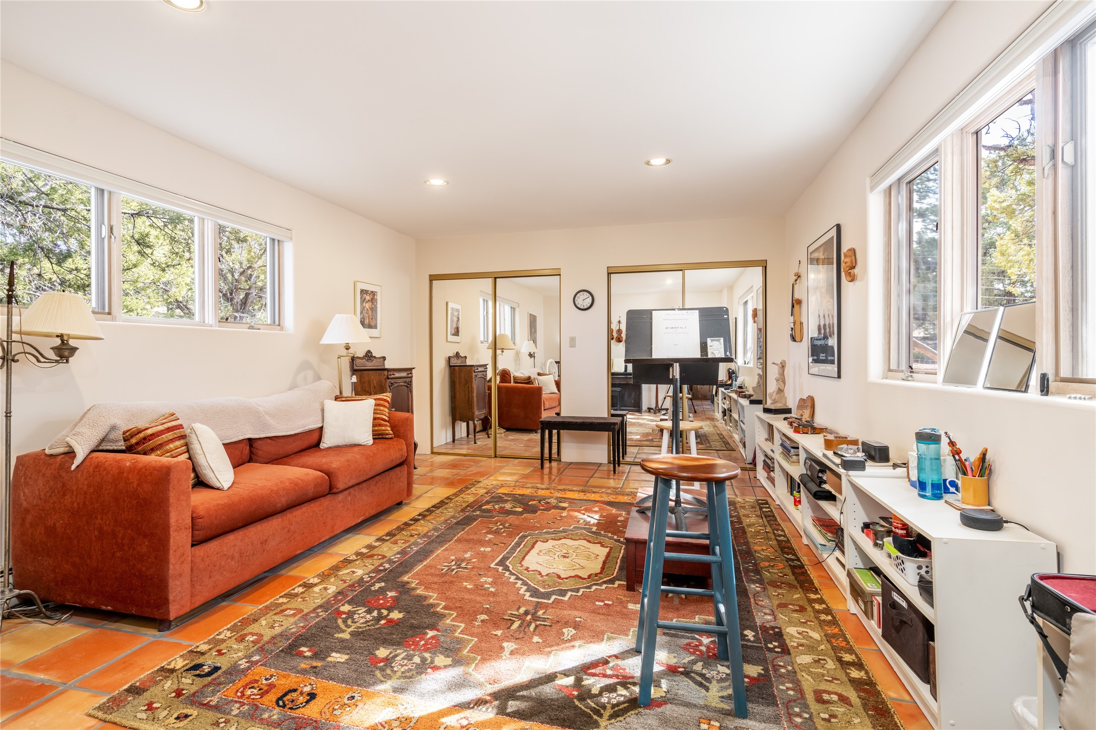 Nestled in a serene and picturesque setting on 2 acres, this enchanting Pueblo-style home perfectly blends classic Southwestern charm with modern comfort. This property is bathed in the magical light that Santa Fe is renowned for! The grand living room features a magnificent 20-foot fireplace and an abundance of windows, allowing the ethereal light and stunning views to permeate throughout this wonderful space. The open-plan design showcases sweeping mountain views, fostering a peaceful connection to the surrounding landscape. Homes today rarely offer such handcrafted details, from the vigas and hand-hewn cedar latillas in the ceiling to the vibrant red willow branches in the cabinetry. The residence includes two generously sized bedrooms on the main floor, each with its own full bath. A bonus music room is serene and makes a great flex room. The upstairs is dedicated to the owner's suite, complete with a Juliette balcony that provides breathtaking vistas of both the Sangre de Cristo and Jemez mountains. The expansive bathroom features a soaking tub, dual sinks with ample counter space, a large walk-in shower, and a sauna for unwinding at the end of the day, along with a spacious walk-in closet. Artists will be inspired by the fantastic attached studio, flooded with natural light, perfect for creative endeavors. Recent improvements include a two-year-old TPO roof and a brand-new boiler. Located off paved streets with city water, this property is just 10 minutes from the vibrant downtown of Santa Fe.