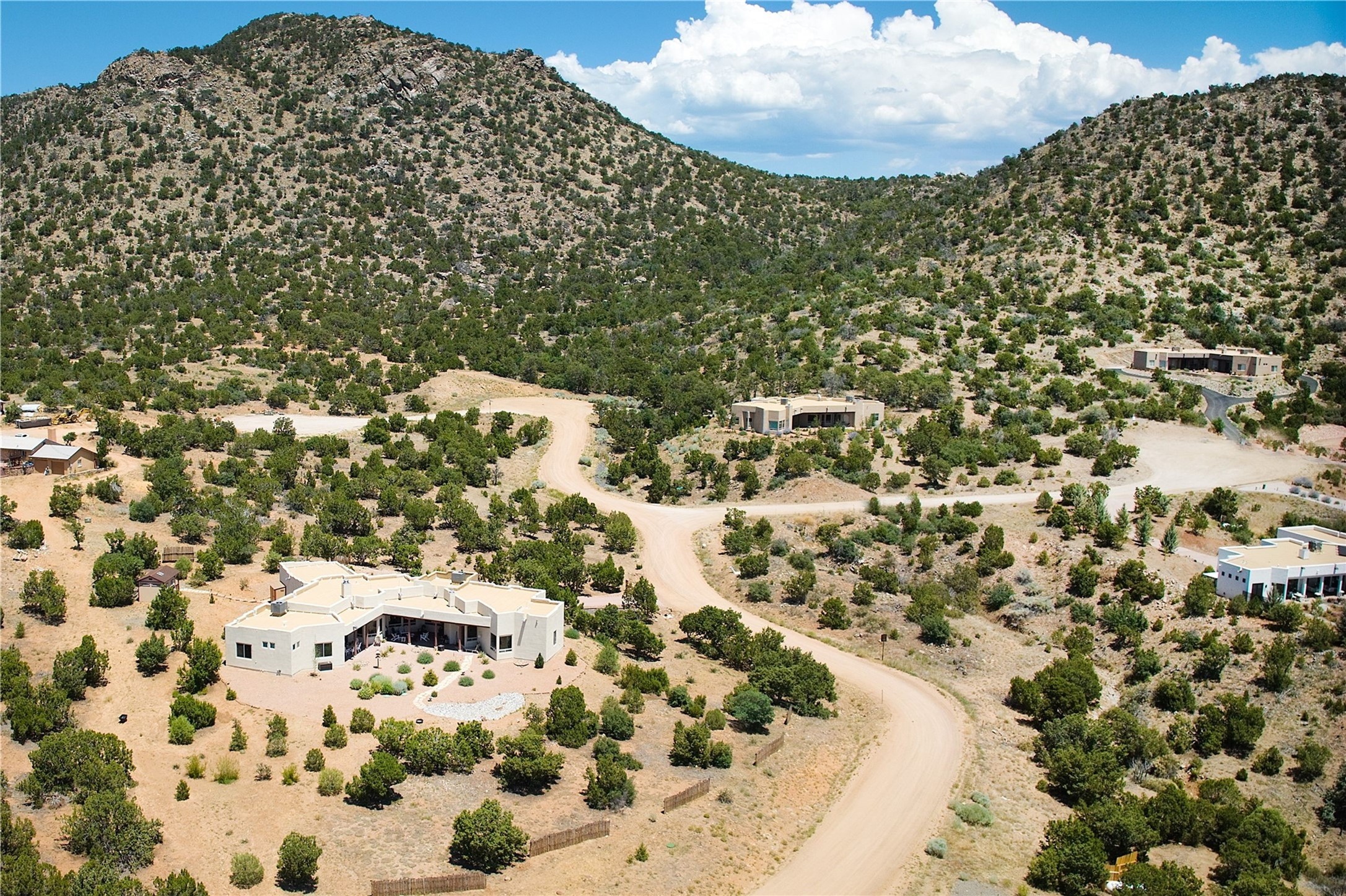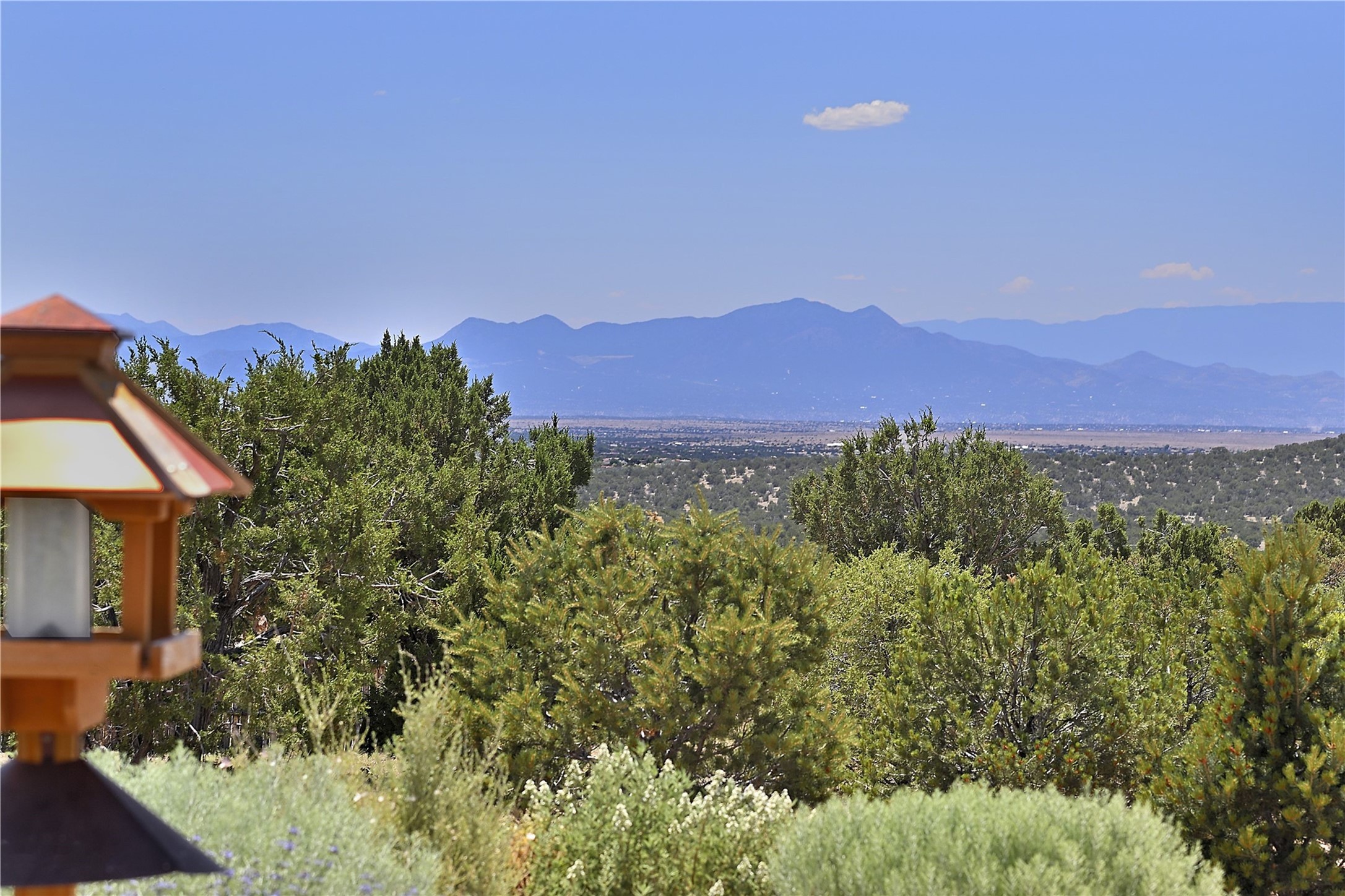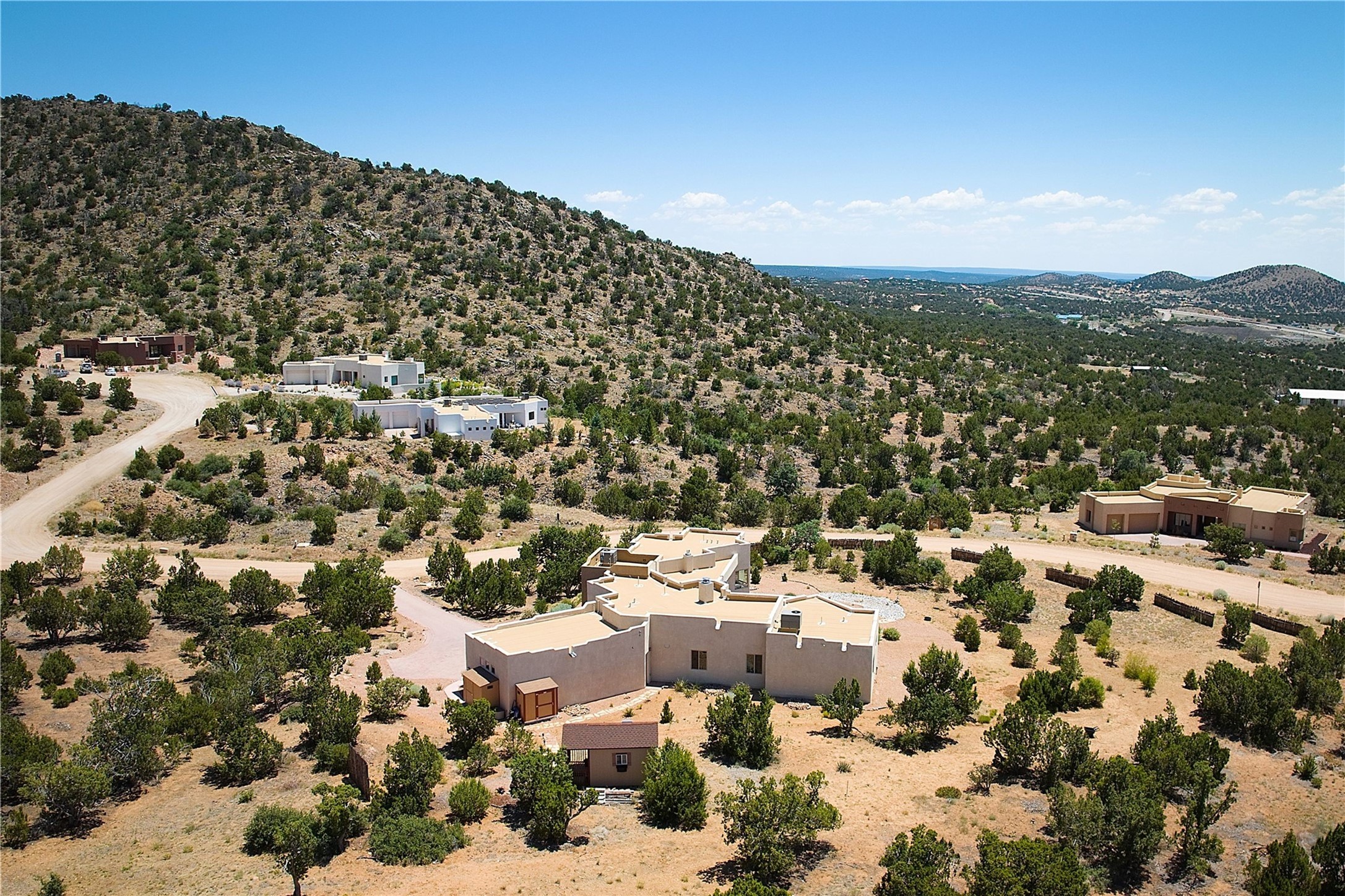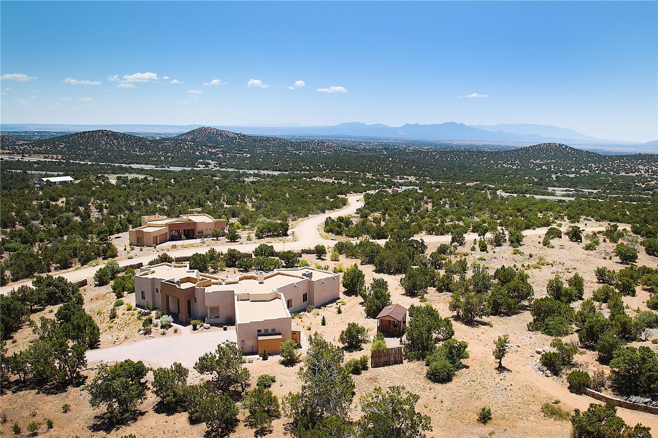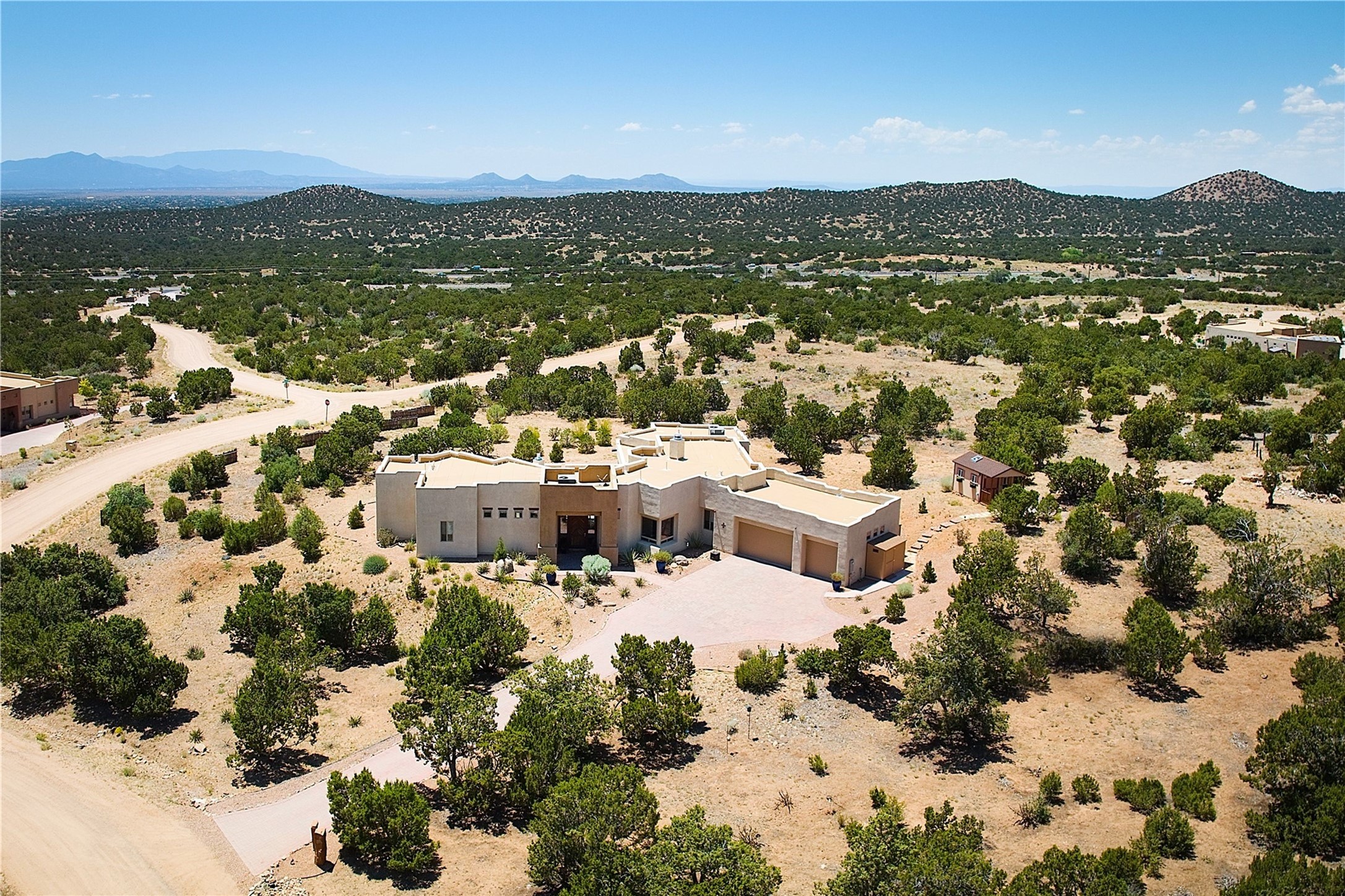 Immaculate newer home nestled on a hilltop with nature and mountain views from every window and only minutes from town. Tall archways, custom wood doors, attractive tile plank floors and superb separation of bedrooms greet you in this light and airy home. Spacious eat in kitchen with large stone counters, high end appliances and a fabulous pantry combine with the living area and tall ceilings to offer a magnificent open space. Rear portal with views of the Galisteo Basin invite you outside to take in the breathtaking expanse. Savor the primary bedroom with charming fireplace and bathroom suite made for royalty with separate vanities, wardrobes and water closets. Oversized three car garage, California closet systems in garage and all three bedroom closets as well as a sizeable walk in linen closet. Come home to plenty of storage, magnificent views, acreage and serenity all just minutes from the city of Santa Fe. Truly the perfect, pristinely maintained home that offers a peaceful country feel without being too far out. Gated community, two storage sheds and a heated meditation studio. Come and see!