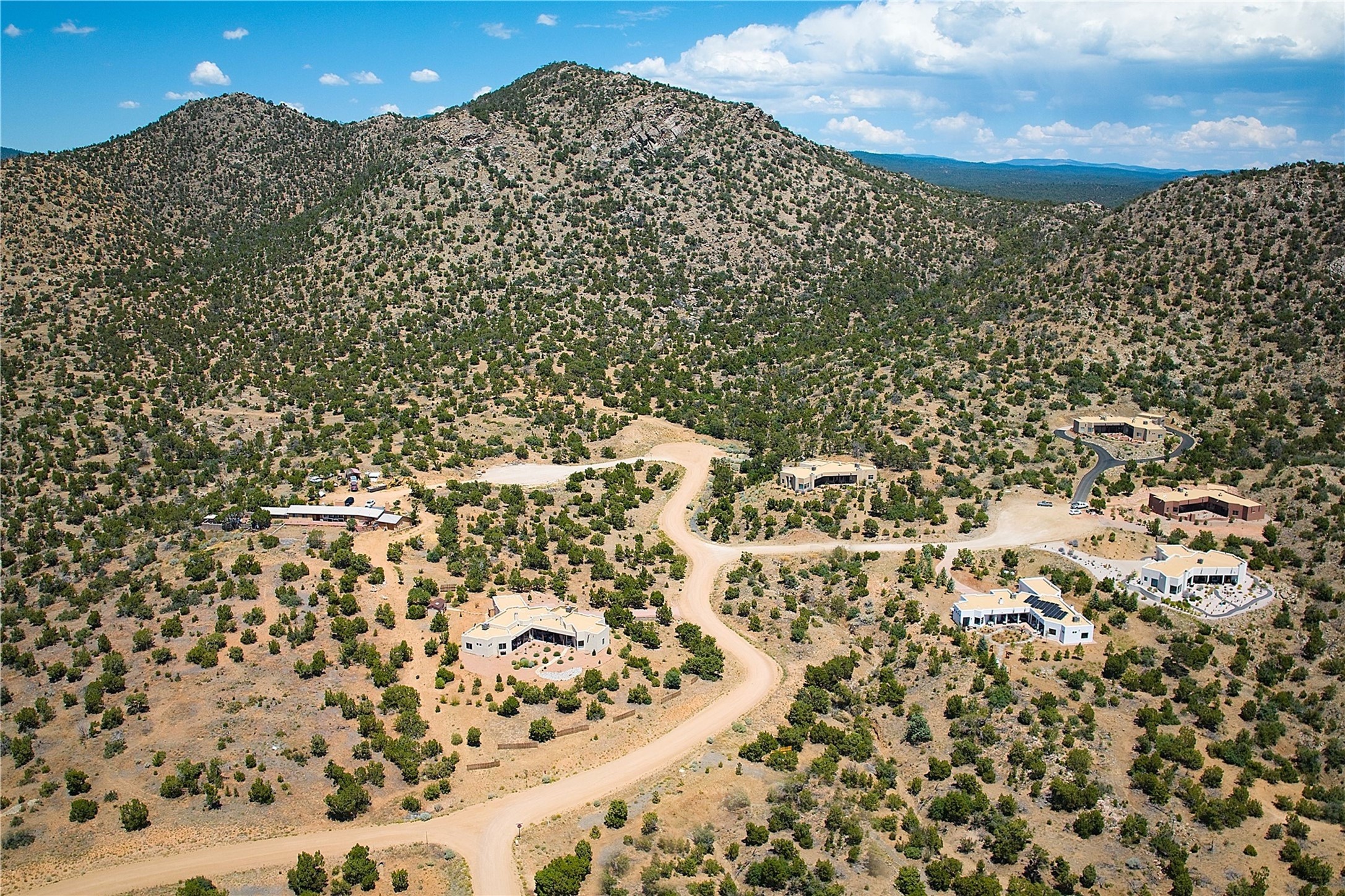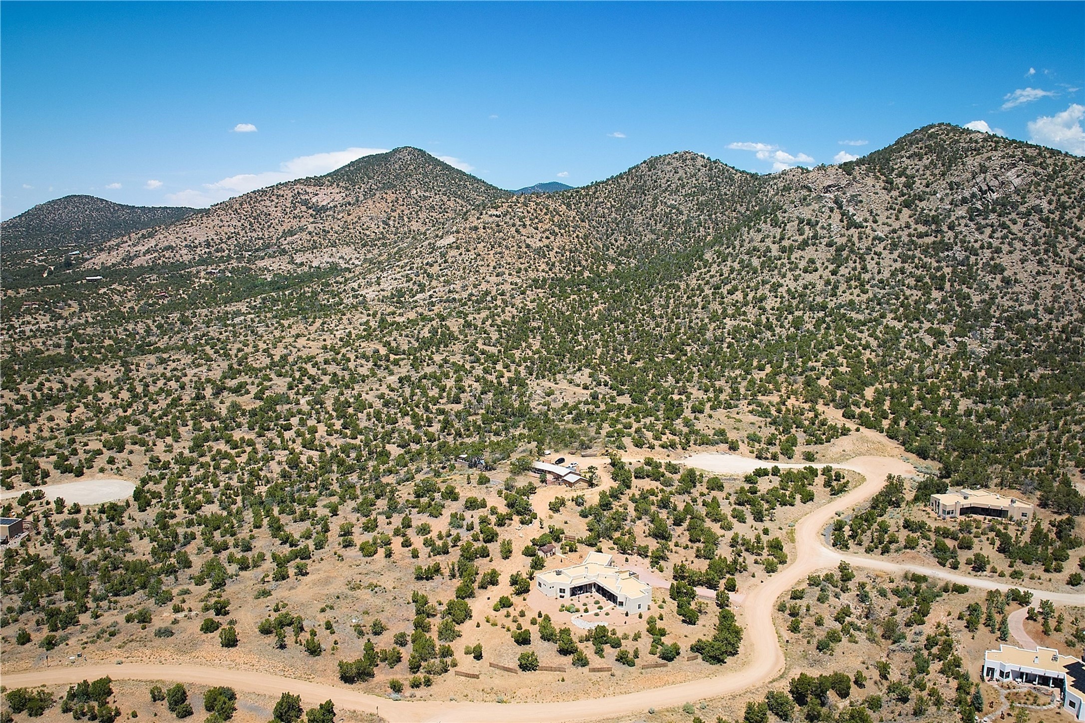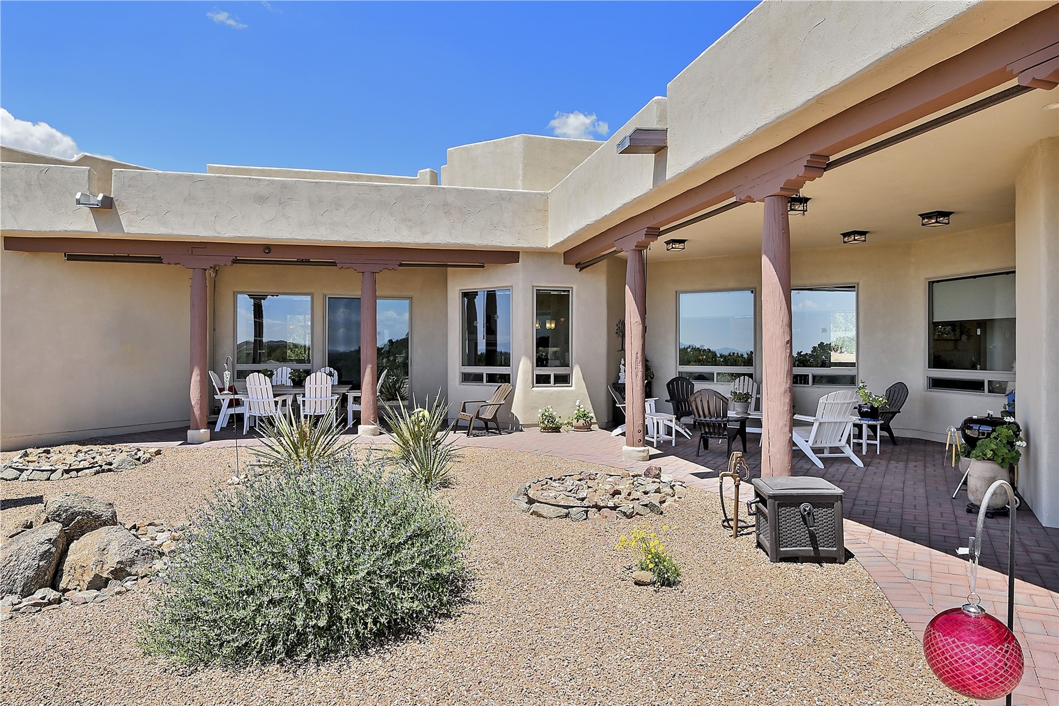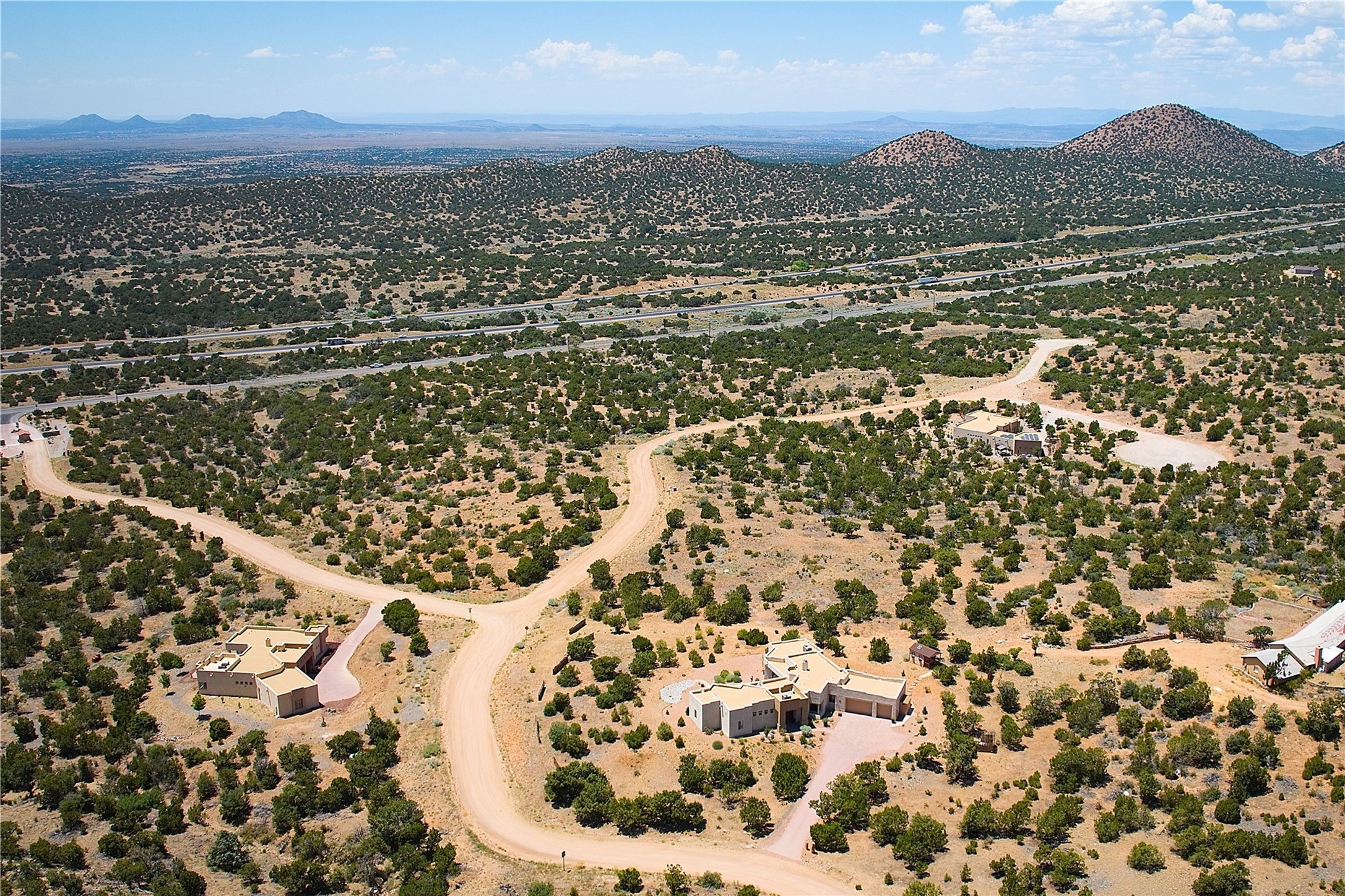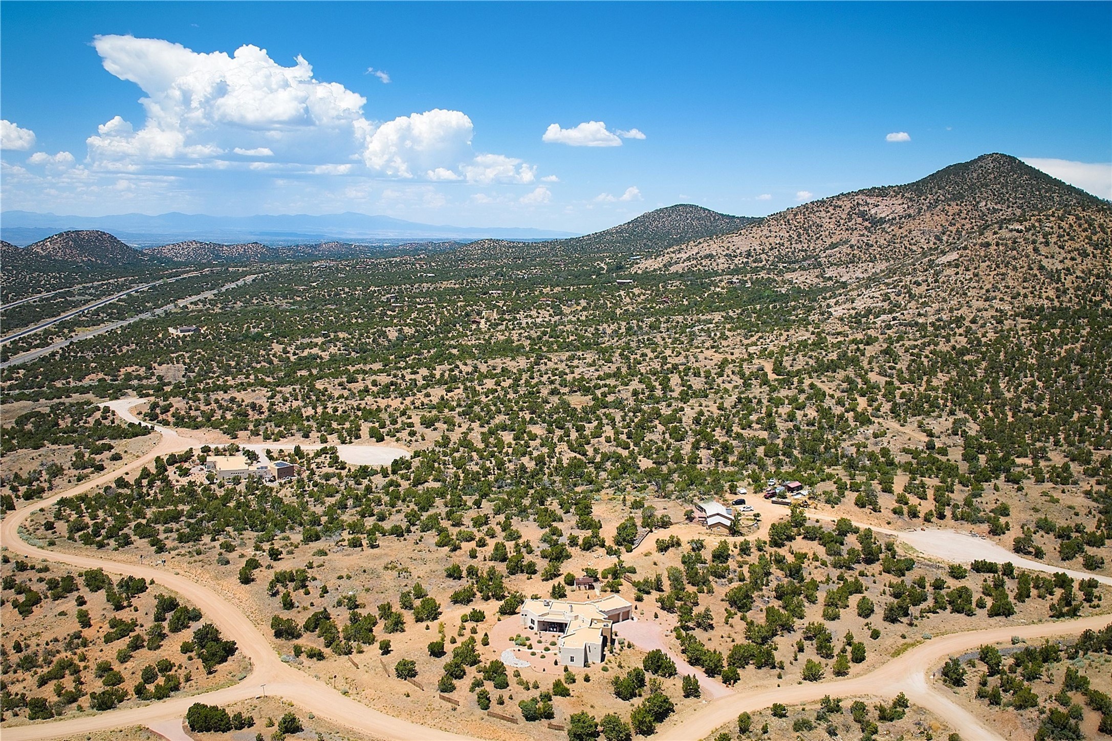 Immaculate newer home nestled on a hilltop with nature and mountain views from every window and only minutes from town. Tall archways, custom wood doors, attractive tile plank floors and superb separation of bedrooms greet you in this light and airy home. Spacious eat in kitchen with large stone counters, high end appliances and a fabulous pantry combine with the living area and tall ceilings to offer a magnificent open space. Rear portal with views of the Galisteo Basin invite you outside to take in the breathtaking expanse. Savor the primary bedroom with charming fireplace and bathroom suite made for royalty with separate vanities, wardrobes and water closets. Oversized three car garage, California closet systems in garage and all three bedroom closets as well as a sizeable walk in linen closet. Come home to plenty of storage, magnificent views, acreage and serenity all just minutes from the city of Santa Fe. Truly the perfect, pristinely maintained home that offers a peaceful country feel without being too far out. Gated community, two storage sheds and a heated meditation studio. Come and see!