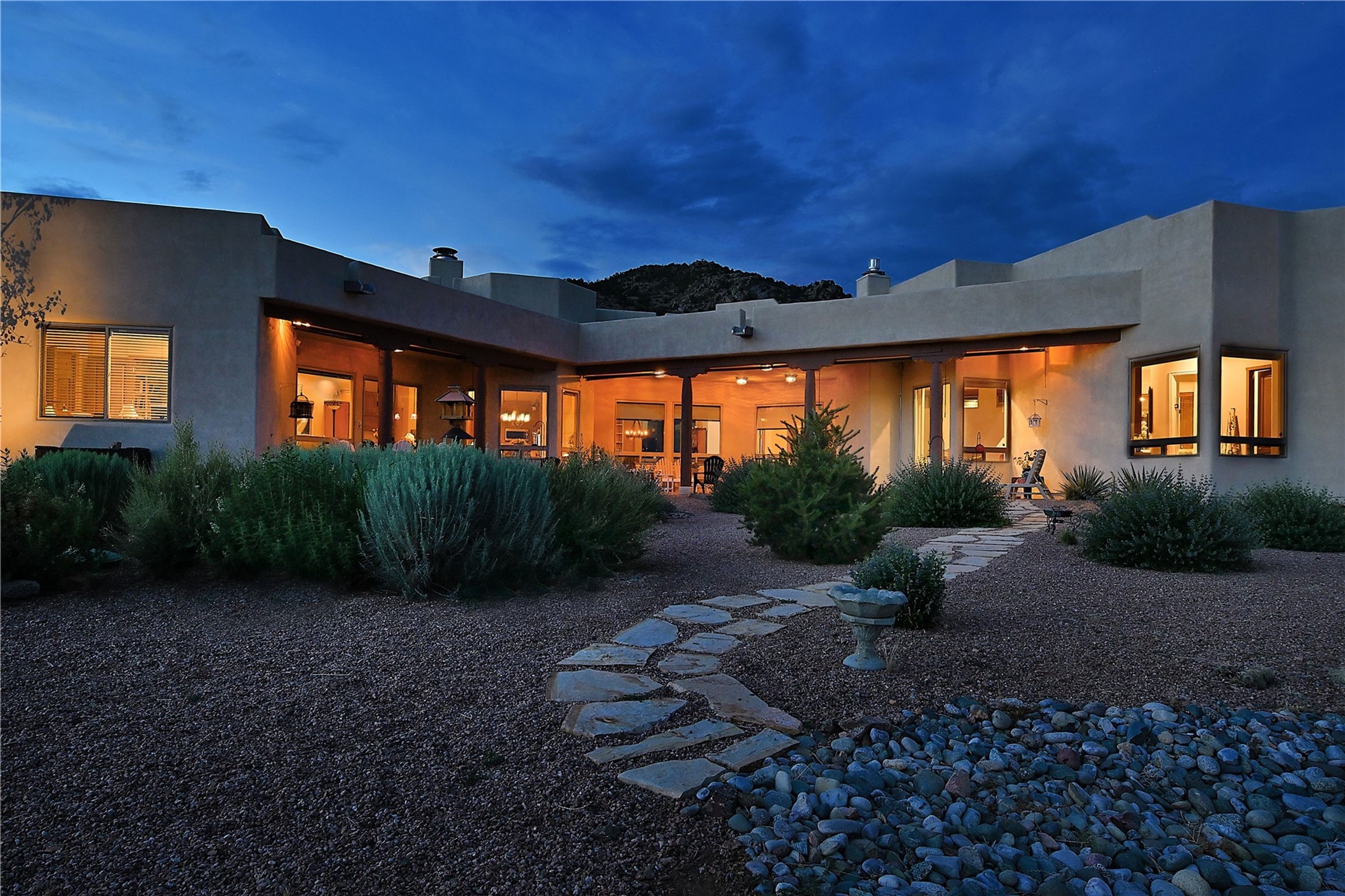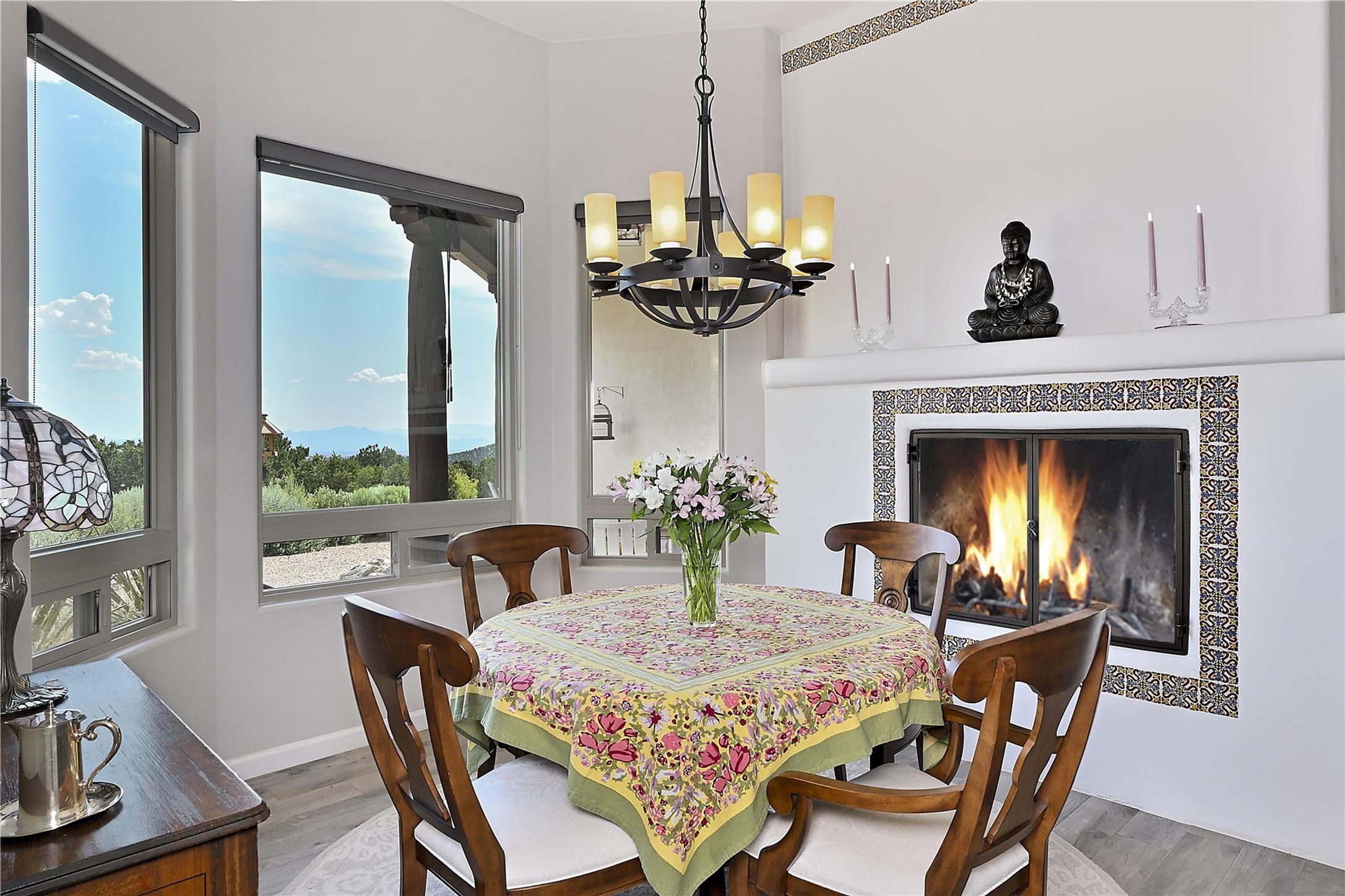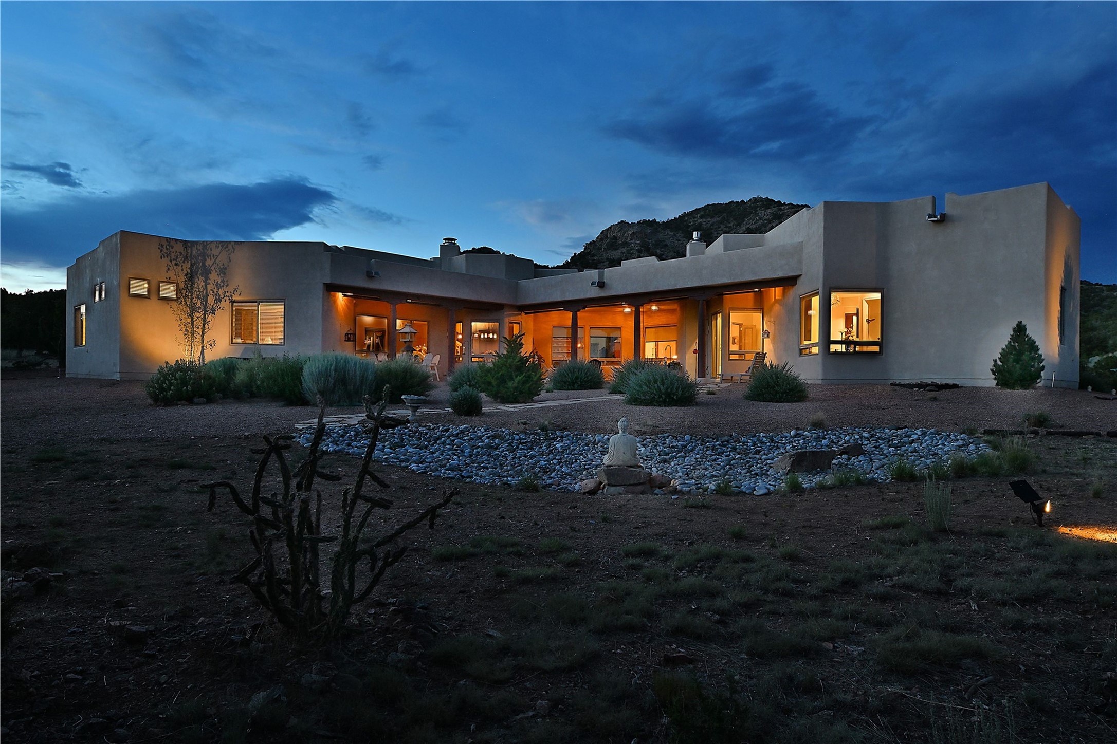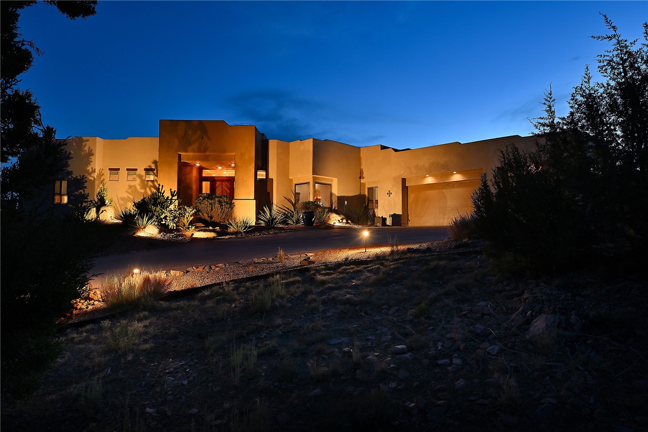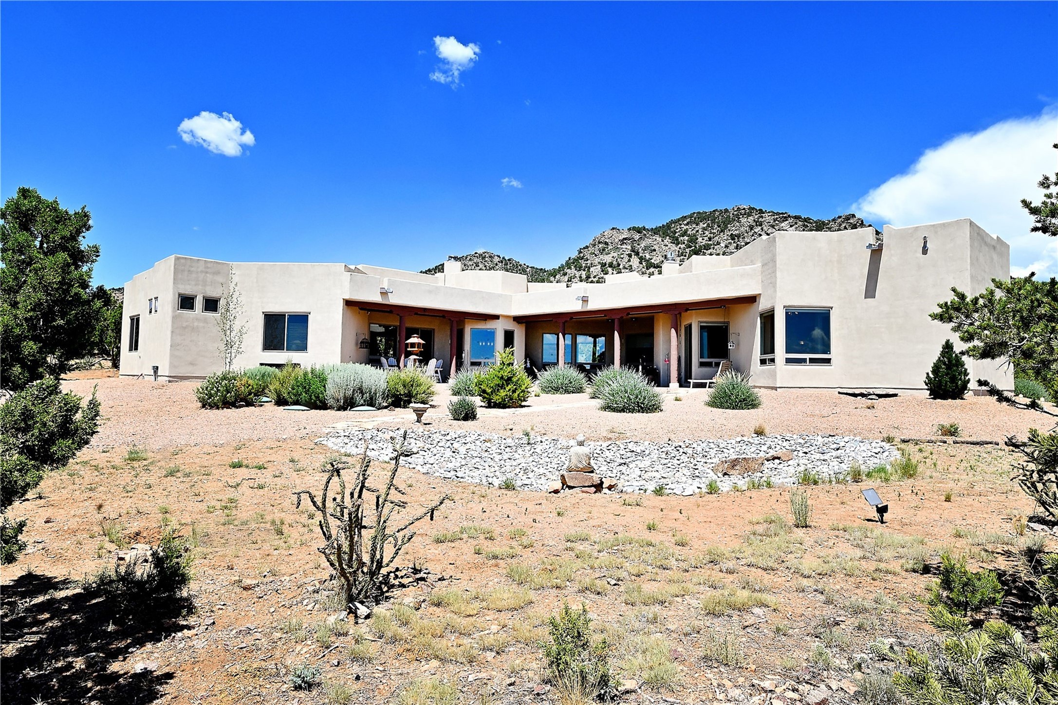Immaculate newer home nestled on a hilltop with nature and mountain views from every window and only minutes from town. Tall archways, custom wood doors, attractive tile plank floors and superb separation of bedrooms greet you in this light and airy home. Spacious eat in kitchen with large stone counters, high end appliances and a fabulous pantry combine with the living area and tall ceilings to offer a magnificent open space. Rear portal with views of the Galisteo Basin invite you outside to take in the breathtaking expanse. Savor the primary bedroom with charming fireplace and bathroom suite made for royalty with separate vanities, wardrobes and water closets. Oversized three car garage, California closet systems in garage and all three bedroom closets as well as a sizeable walk in linen closet. Come home to plenty of storage, magnificent views, acreage and serenity all just minutes from the city of Santa Fe. Truly the perfect, pristinely maintained home that offers a peaceful country feel without being too far out. Gated community, two storage sheds and a heated meditation studio. Come and see!
