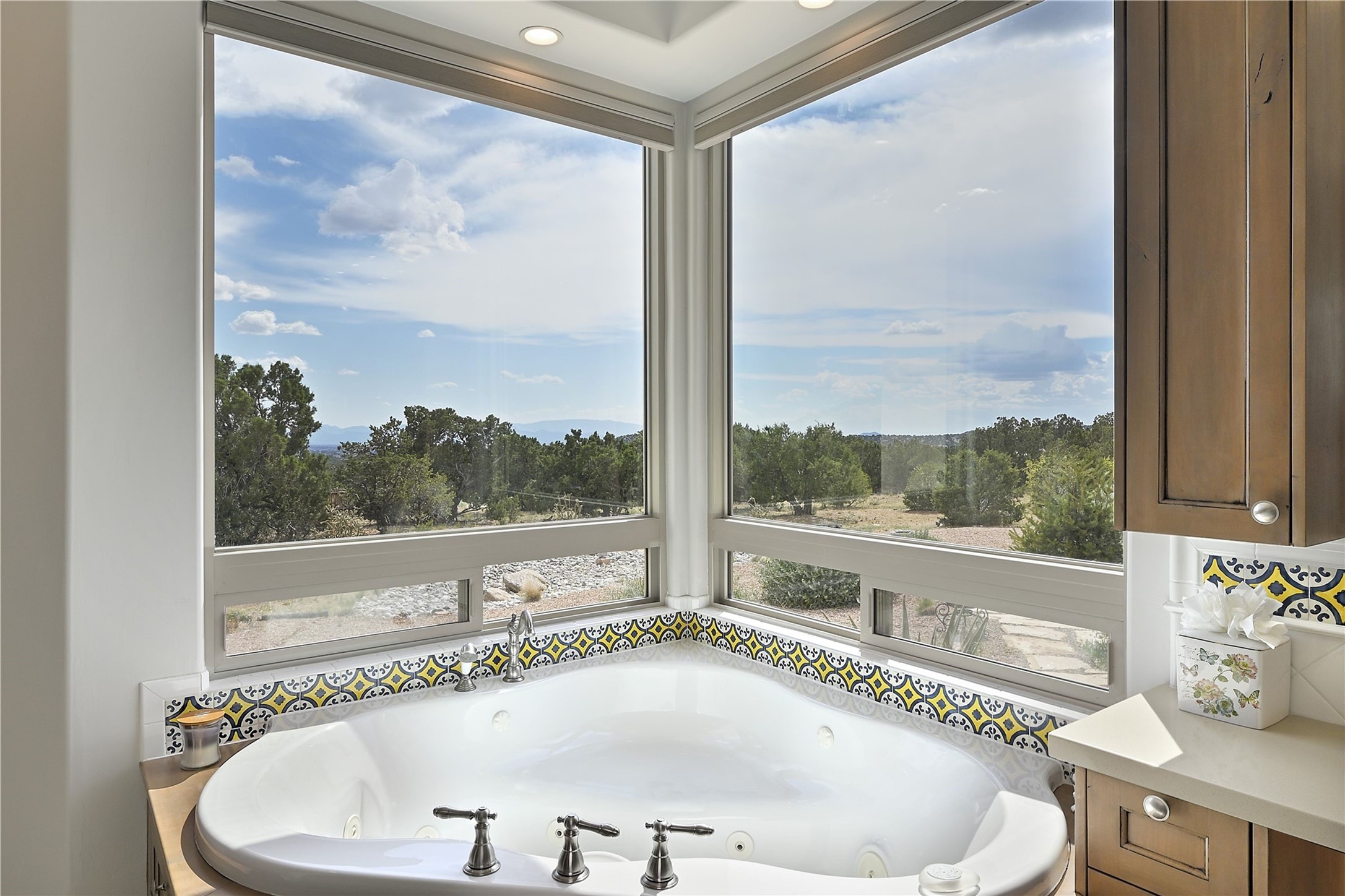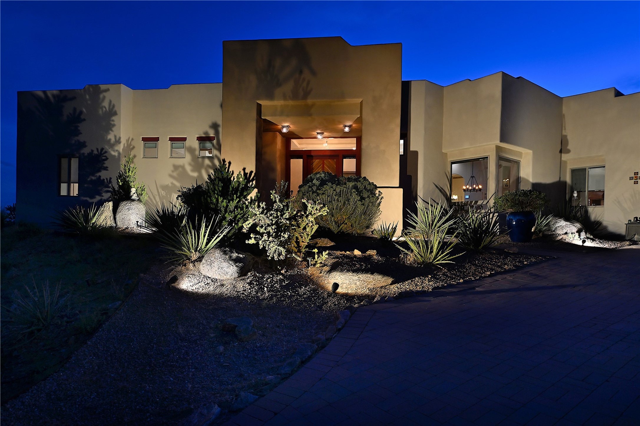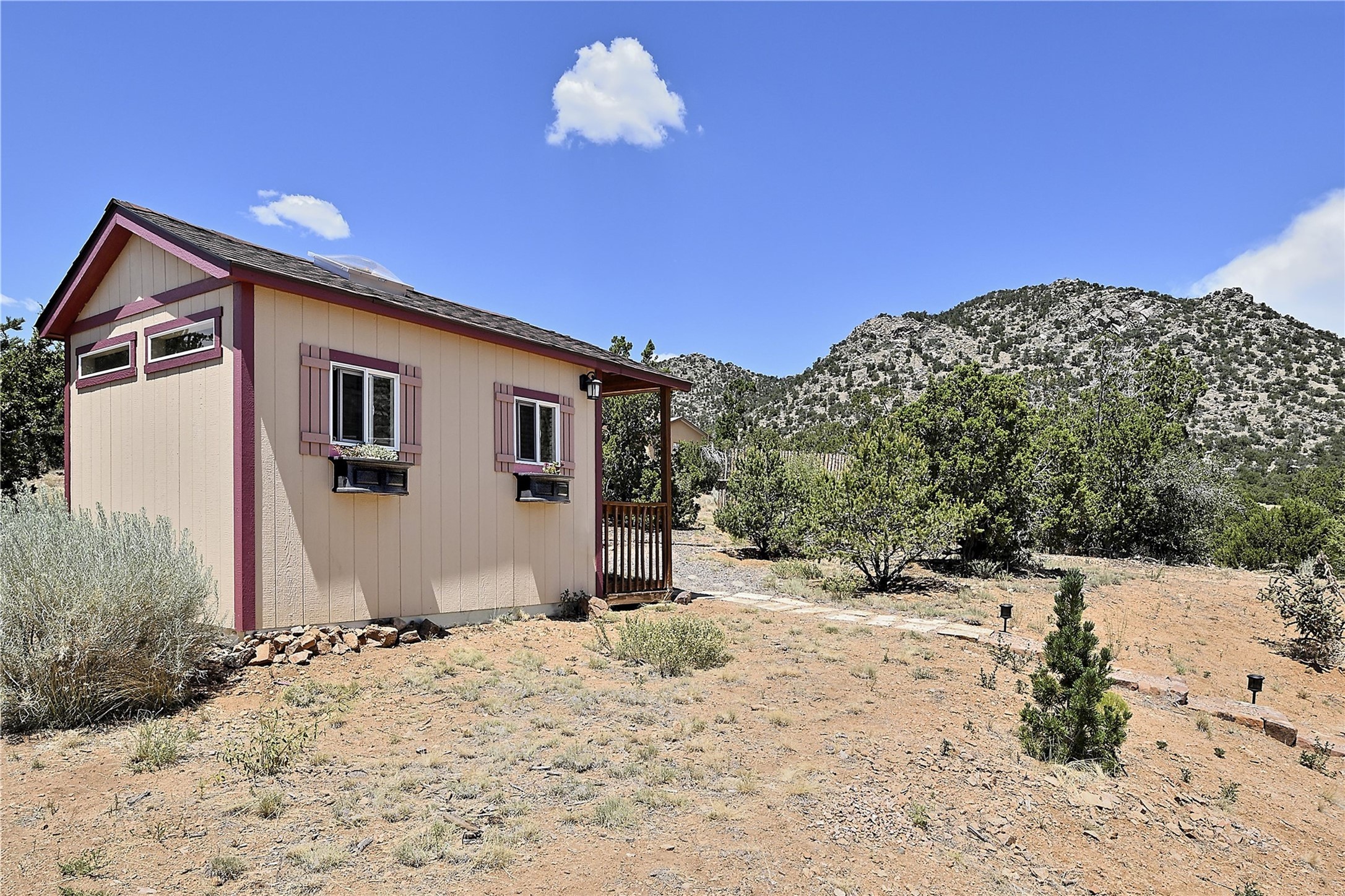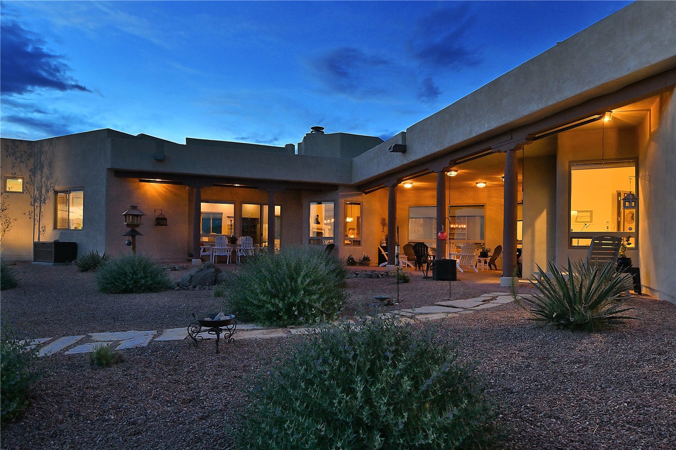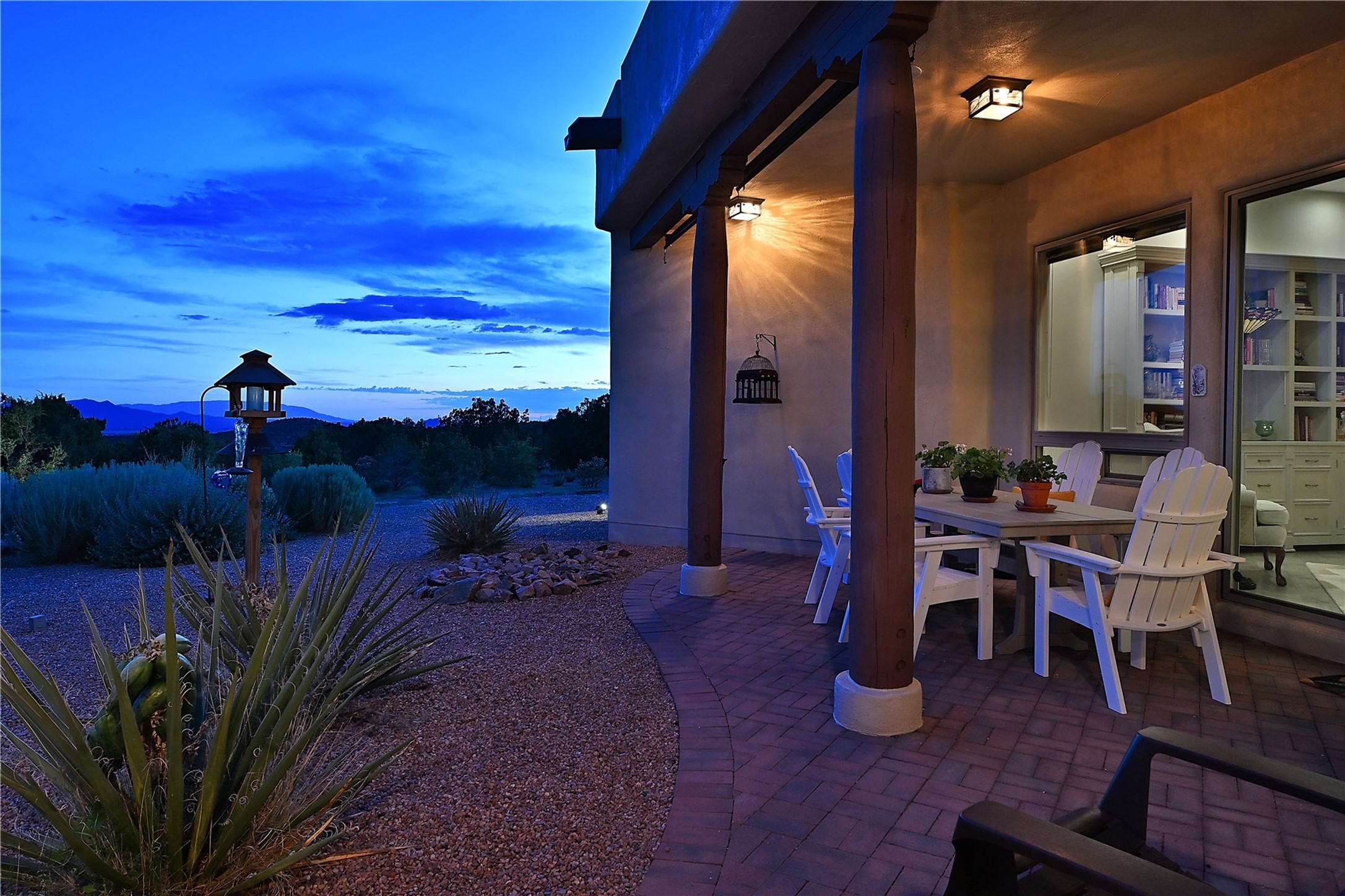 Immaculate newer home nestled on a hilltop with nature and mountain views from every window and only minutes from town. Tall archways, custom wood doors, attractive tile plank floors and superb separation of bedrooms greet you in this light and airy home. Spacious eat in kitchen with large stone counters, high end appliances and a fabulous pantry combine with the living area and tall ceilings to offer a magnificent open space. Rear portal with views of the Galisteo Basin invite you outside to take in the breathtaking expanse. Savor the primary bedroom with charming fireplace and bathroom suite made for royalty with separate vanities, wardrobes and water closets. Oversized three car garage, California closet systems in garage and all three bedroom closets as well as a sizeable walk in linen closet. Come home to plenty of storage, magnificent views, acreage and serenity all just minutes from the city of Santa Fe. Truly the perfect, pristinely maintained home that offers a peaceful country feel without being too far out. Gated community, two storage sheds and a heated meditation studio. Come and see!