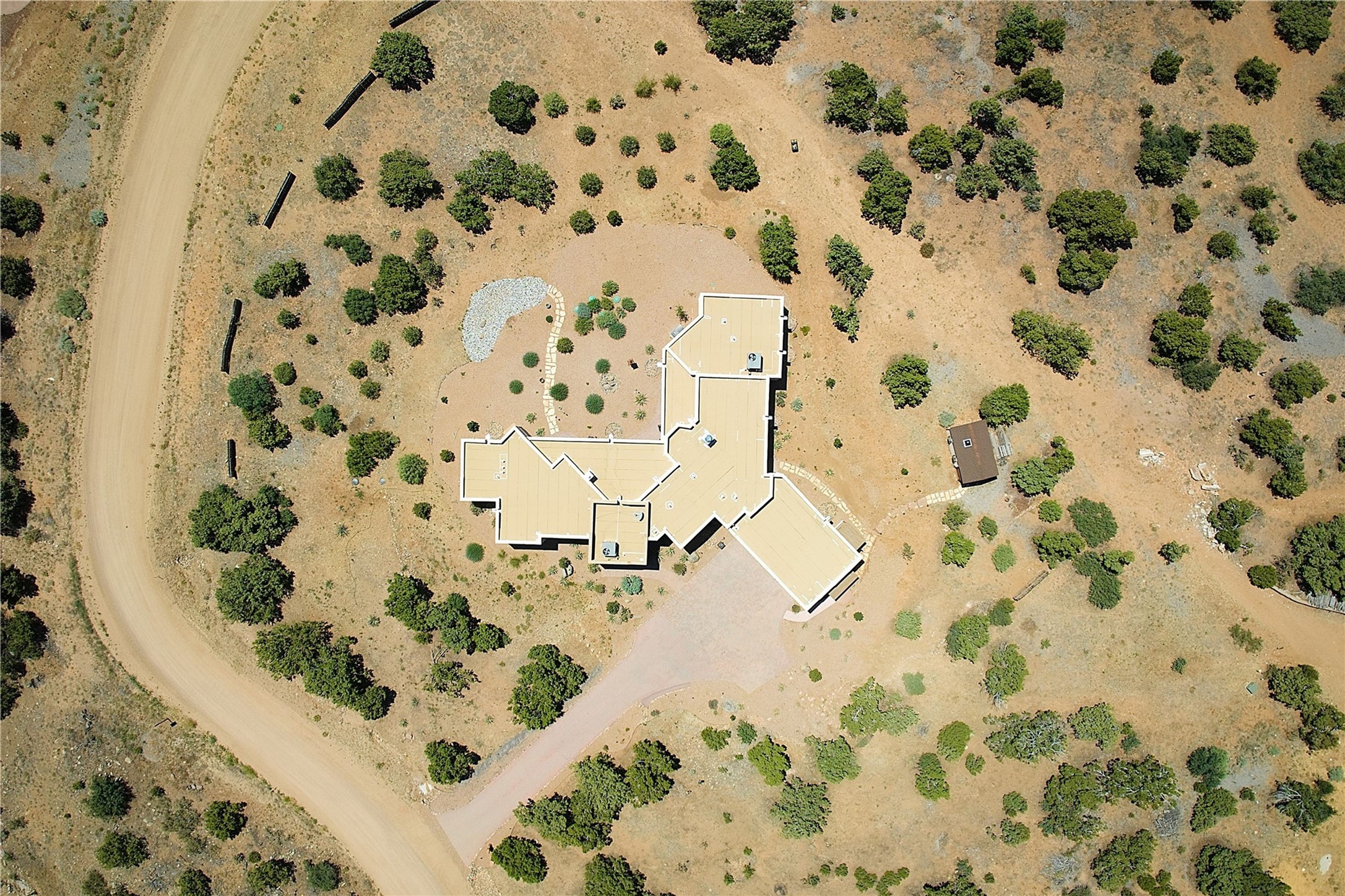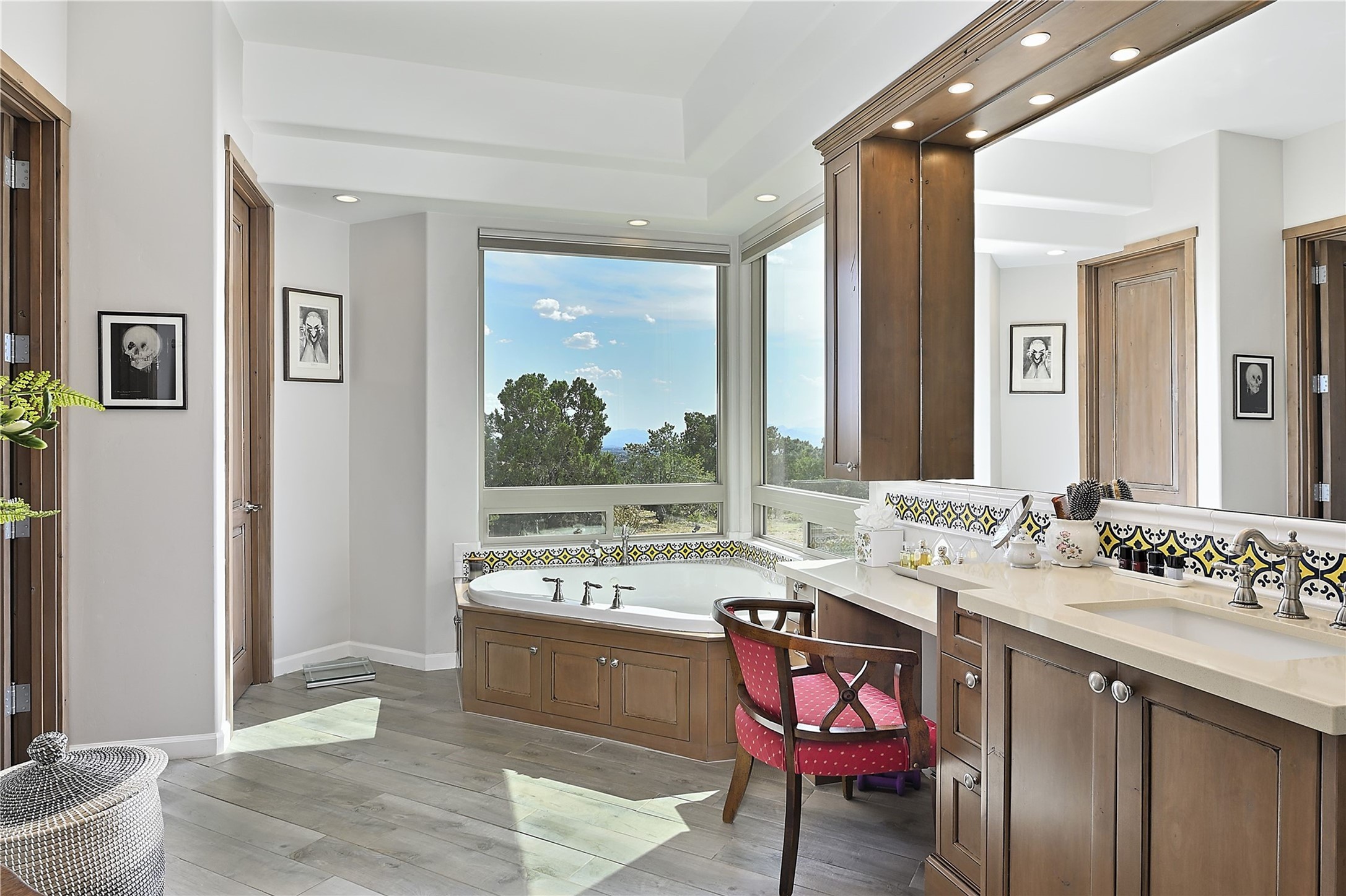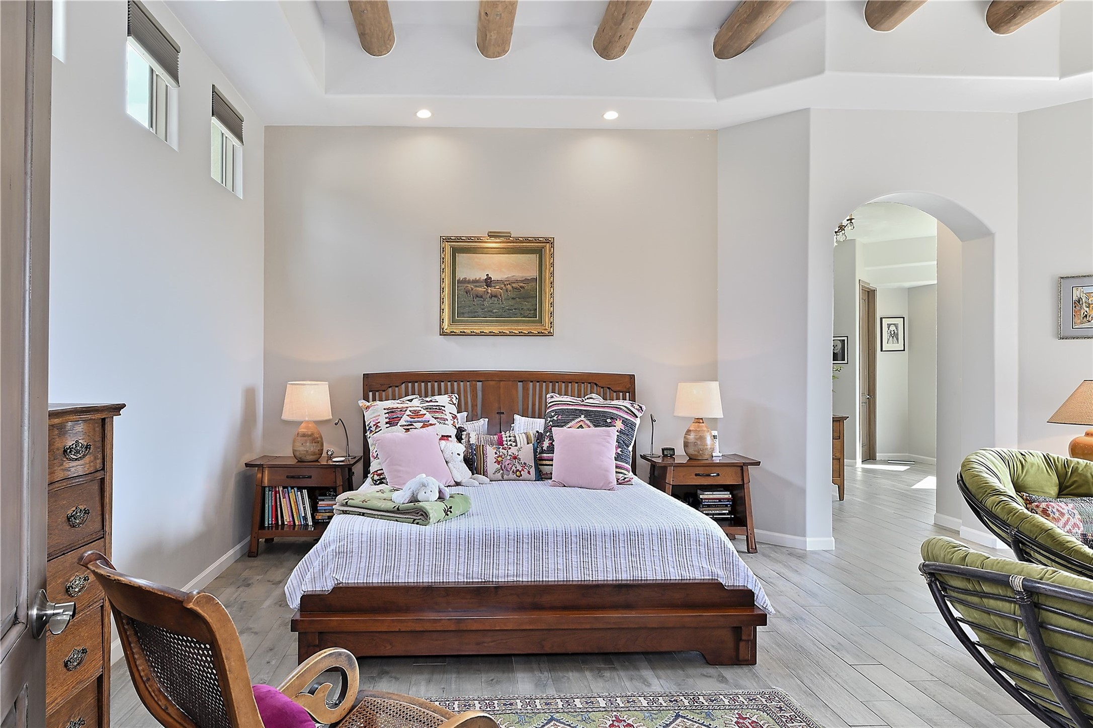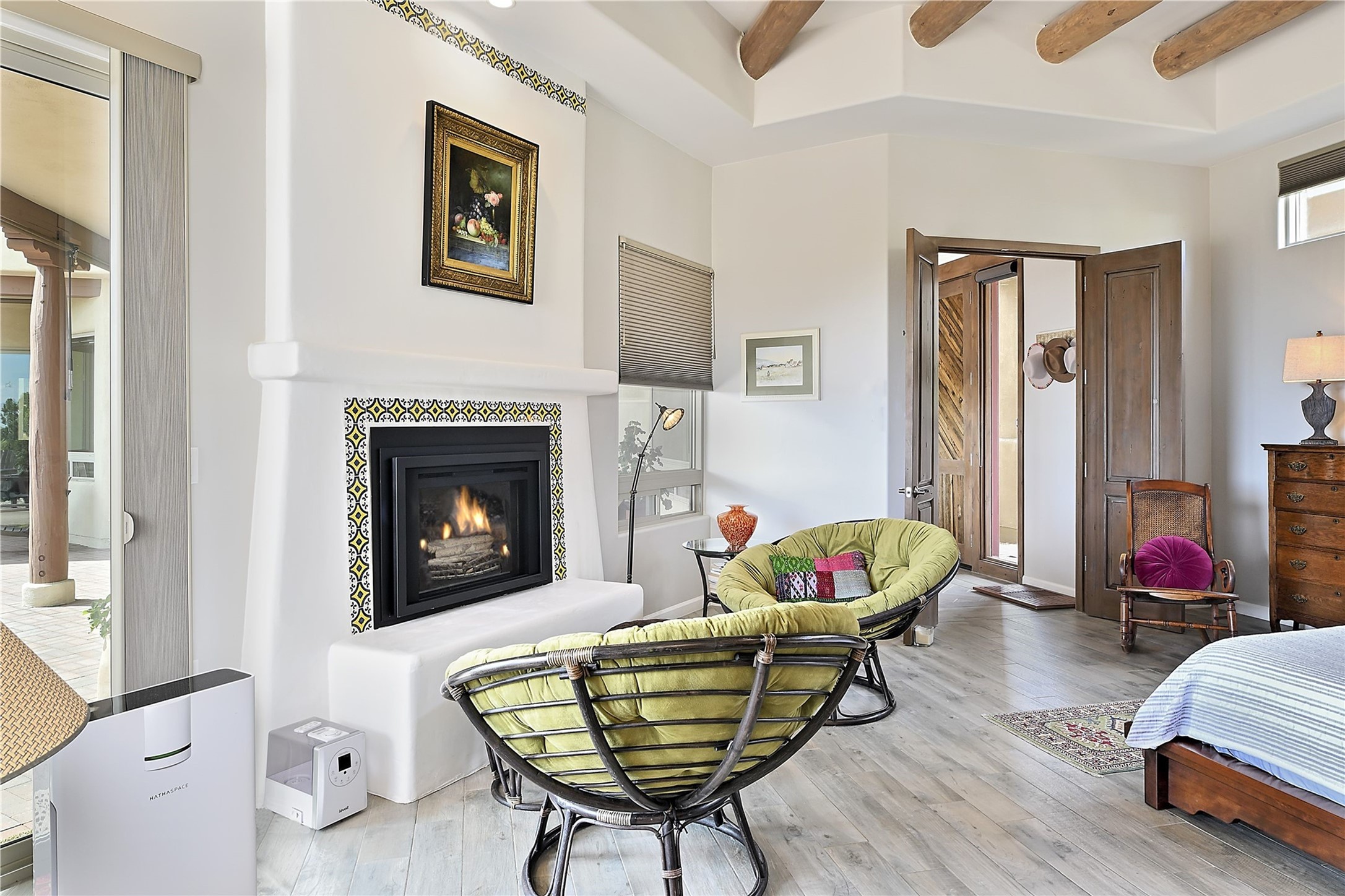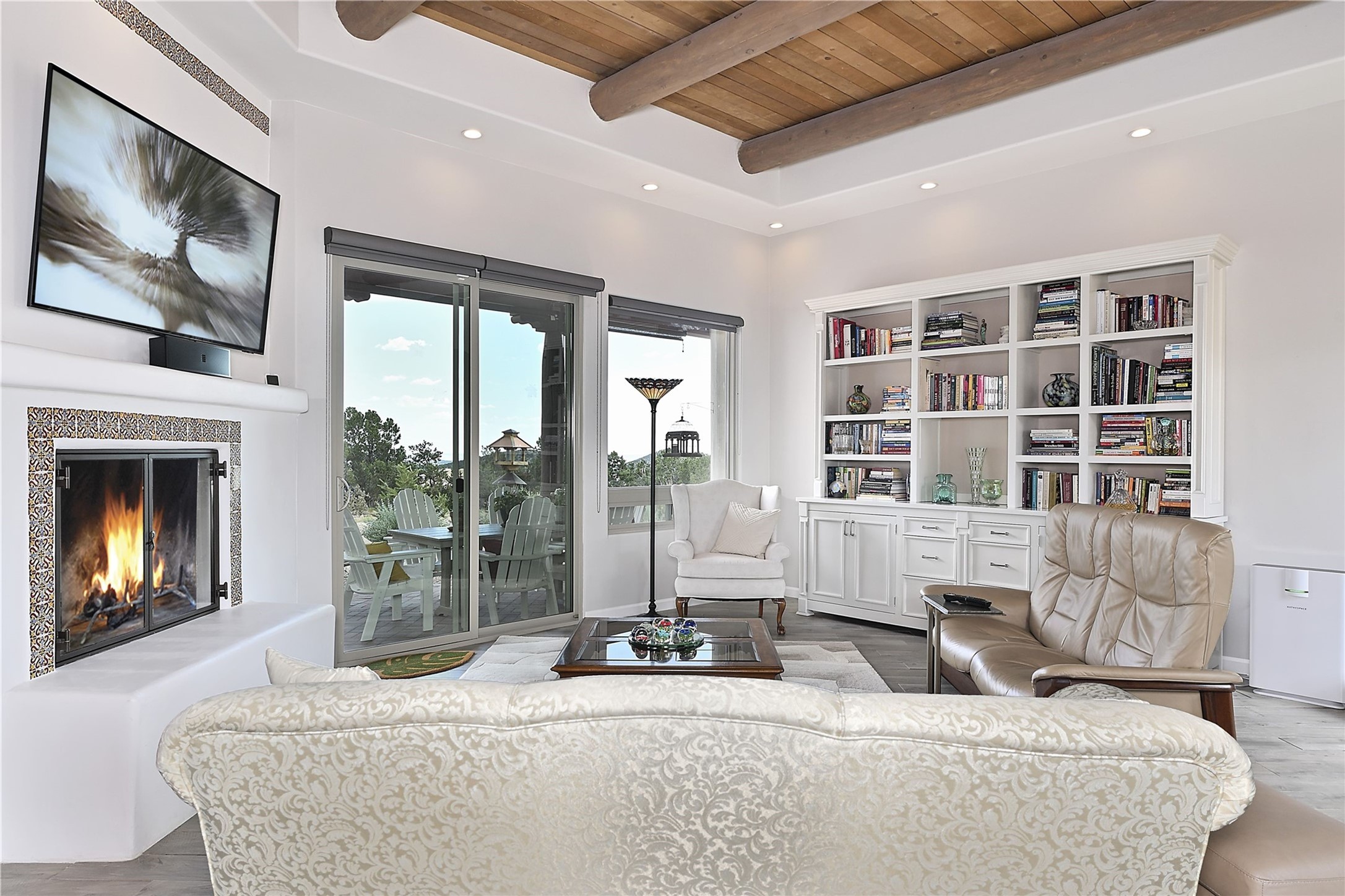 Immaculate newer home nestled on a hilltop with nature and mountain views from every window and only minutes from town. Tall archways, custom wood doors, attractive tile plank floors and superb separation of bedrooms greet you in this light and airy home. Spacious eat in kitchen with large stone counters, high end appliances and a fabulous pantry combine with the living area and tall ceilings to offer a magnificent open space. Rear portal with views of the Galisteo Basin invite you outside to take in the breathtaking expanse. Savor the primary bedroom with charming fireplace and bathroom suite made for royalty with separate vanities, wardrobes and water closets. Oversized three car garage, California closet systems in garage and all three bedroom closets as well as a sizeable walk in linen closet. Come home to plenty of storage, magnificent views, acreage and serenity all just minutes from the city of Santa Fe. Truly the perfect, pristinely maintained home that offers a peaceful country feel without being too far out. Gated community, two storage sheds and a heated meditation studio. Come and see!