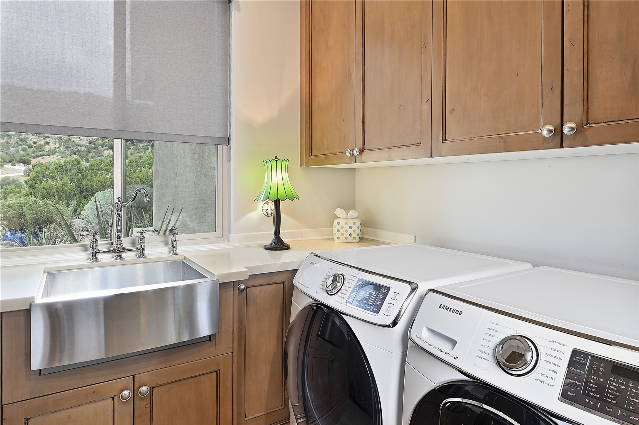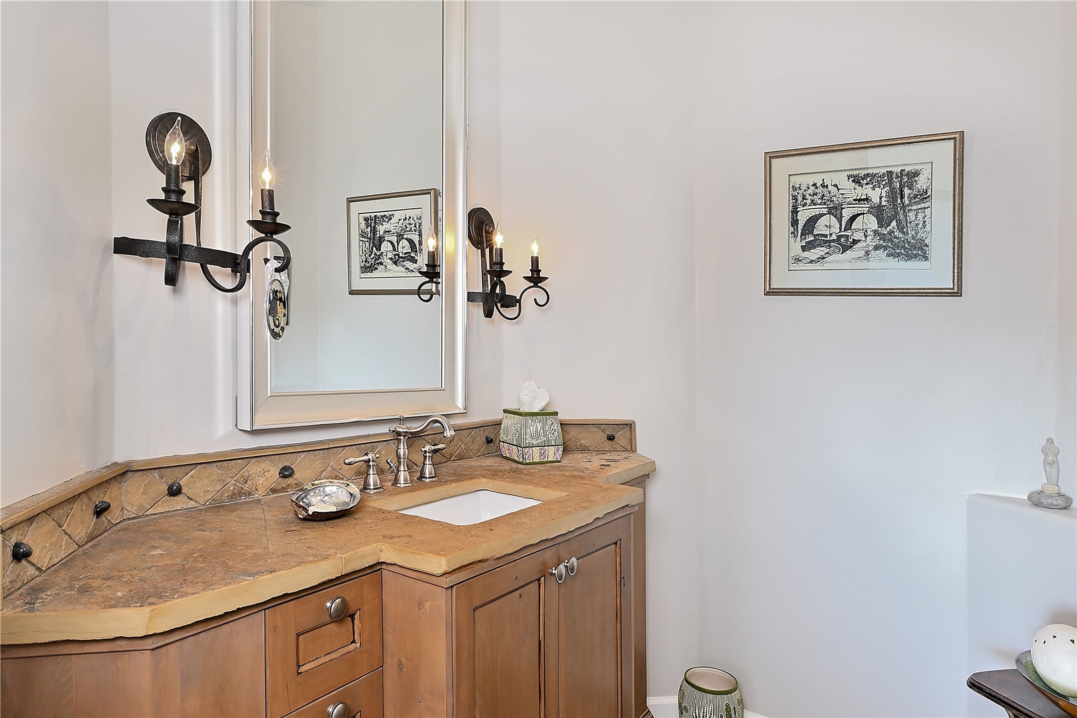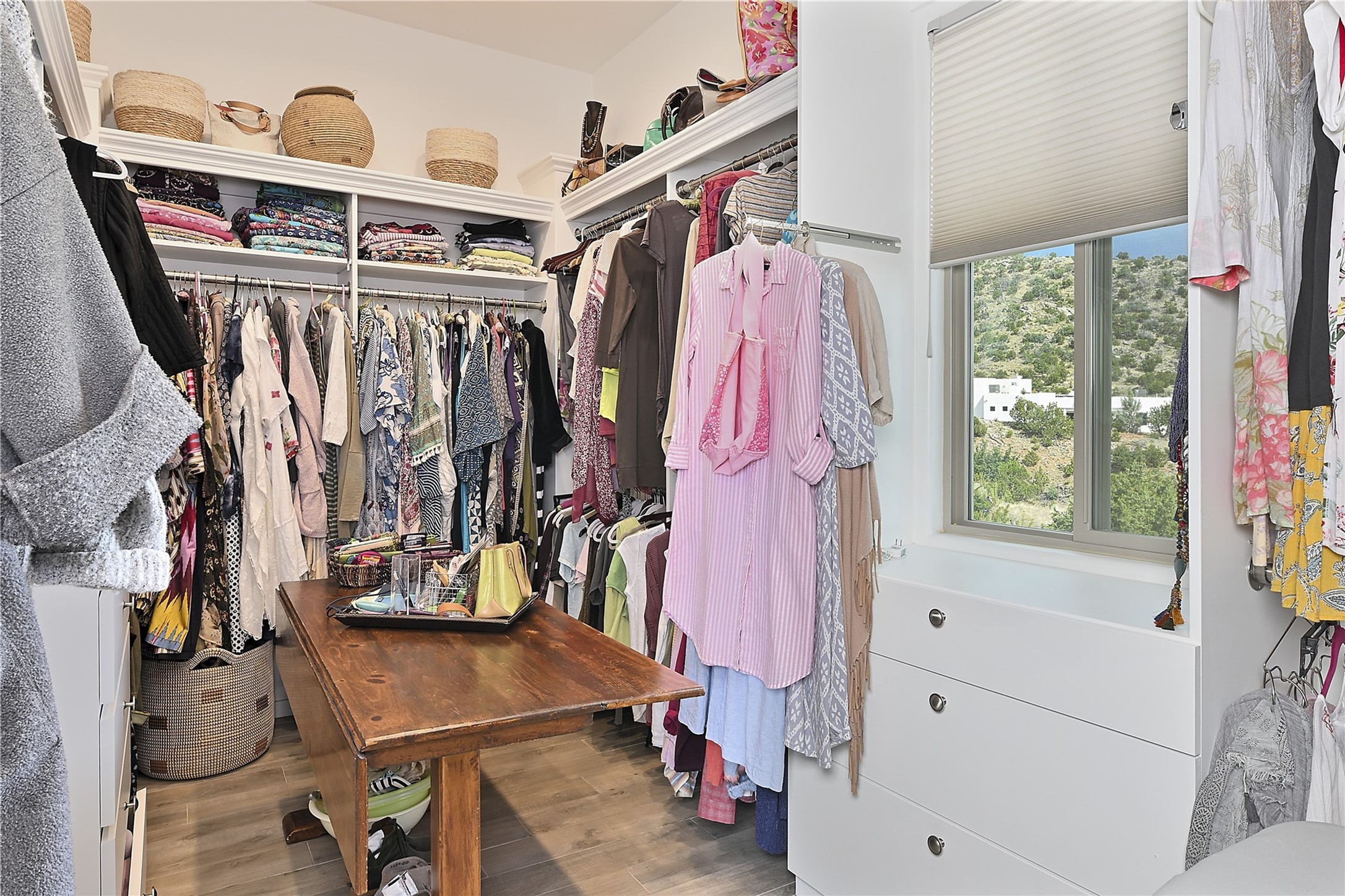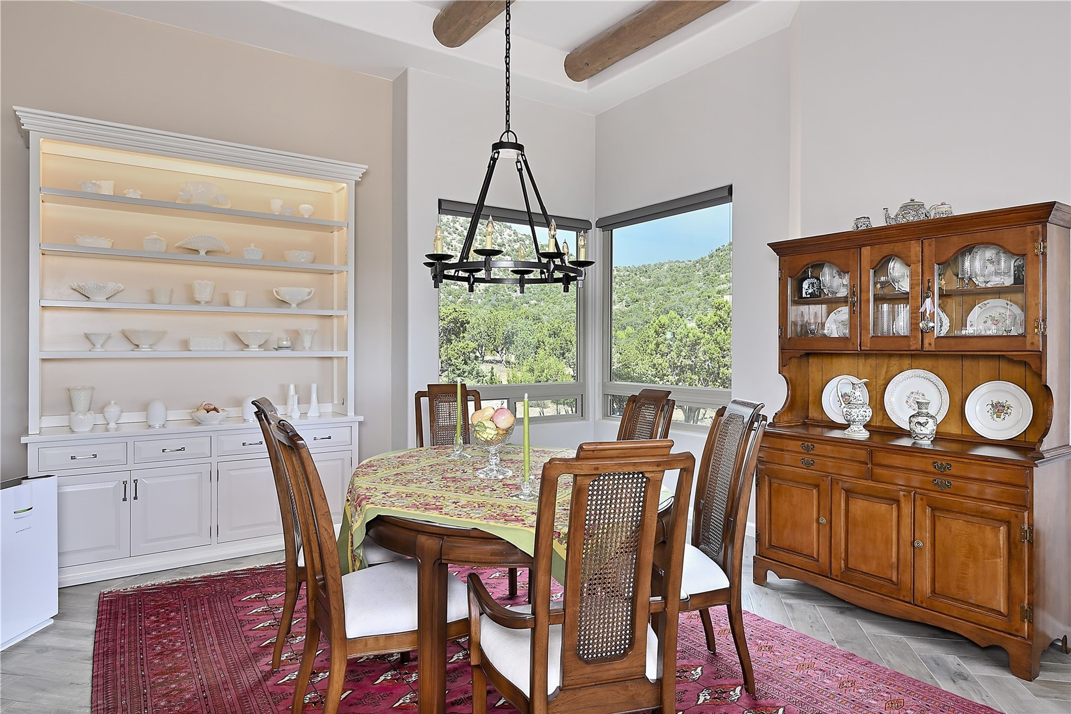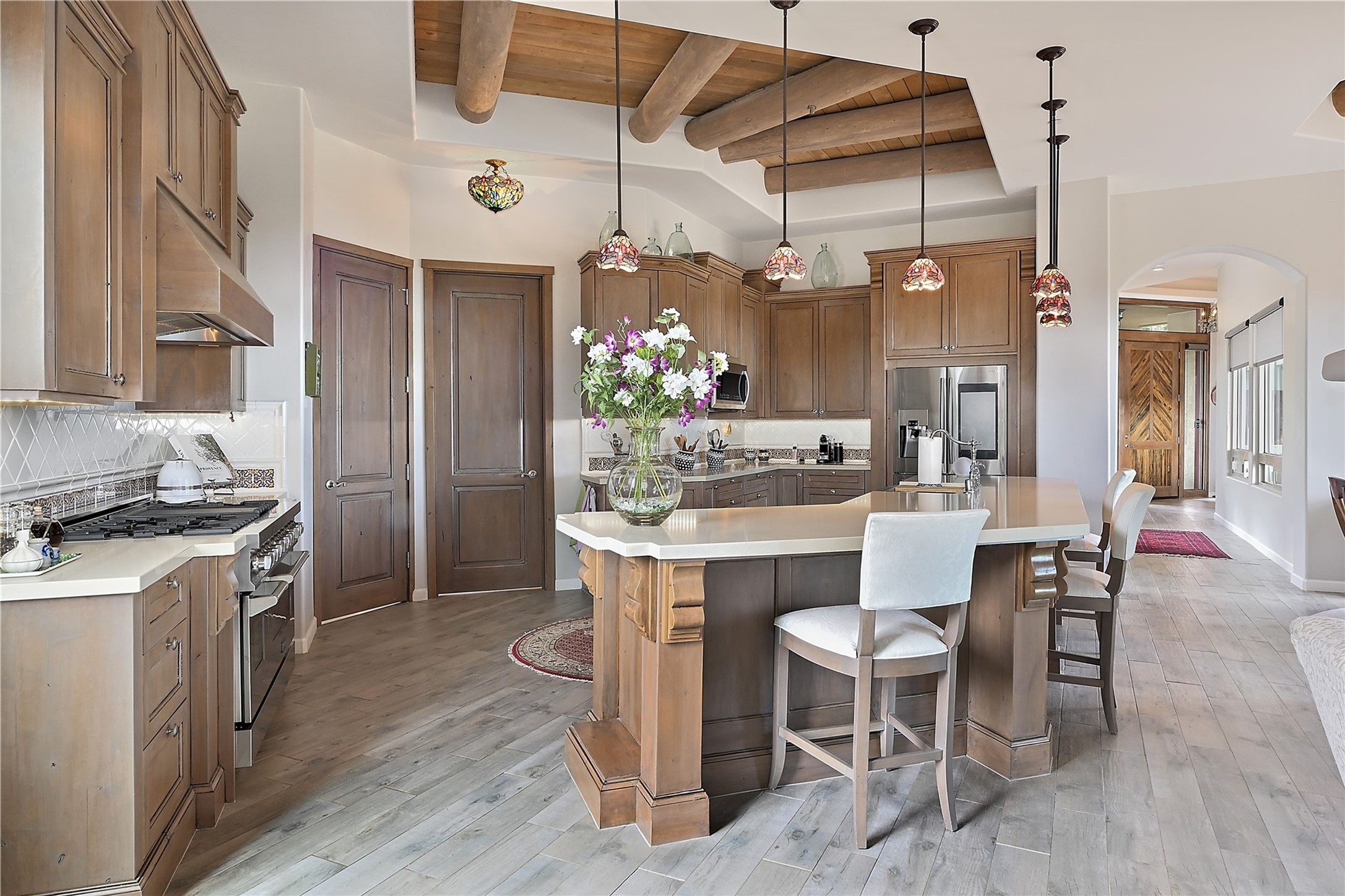 Immaculate newer home nestled on a hilltop with nature and mountain views from every window and only minutes from town. Tall archways, custom wood doors, attractive tile plank floors and superb separation of bedrooms greet you in this light and airy home. Spacious eat in kitchen with large stone counters, high end appliances and a fabulous pantry combine with the living area and tall ceilings to offer a magnificent open space. Rear portal with views of the Galisteo Basin invite you outside to take in the breathtaking expanse. Savor the primary bedroom with charming fireplace and bathroom suite made for royalty with separate vanities, wardrobes and water closets. Oversized three car garage, California closet systems in garage and all three bedroom closets as well as a sizeable walk in linen closet. Come home to plenty of storage, magnificent views, acreage and serenity all just minutes from the city of Santa Fe. Truly the perfect, pristinely maintained home that offers a peaceful country feel without being too far out. Gated community, two storage sheds and a heated meditation studio. Come and see!