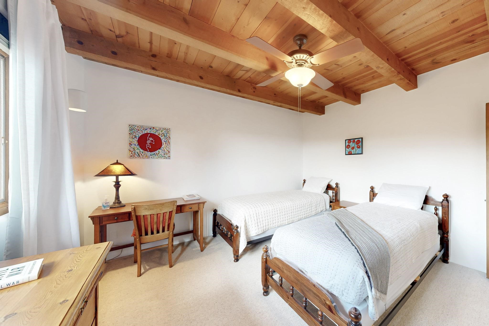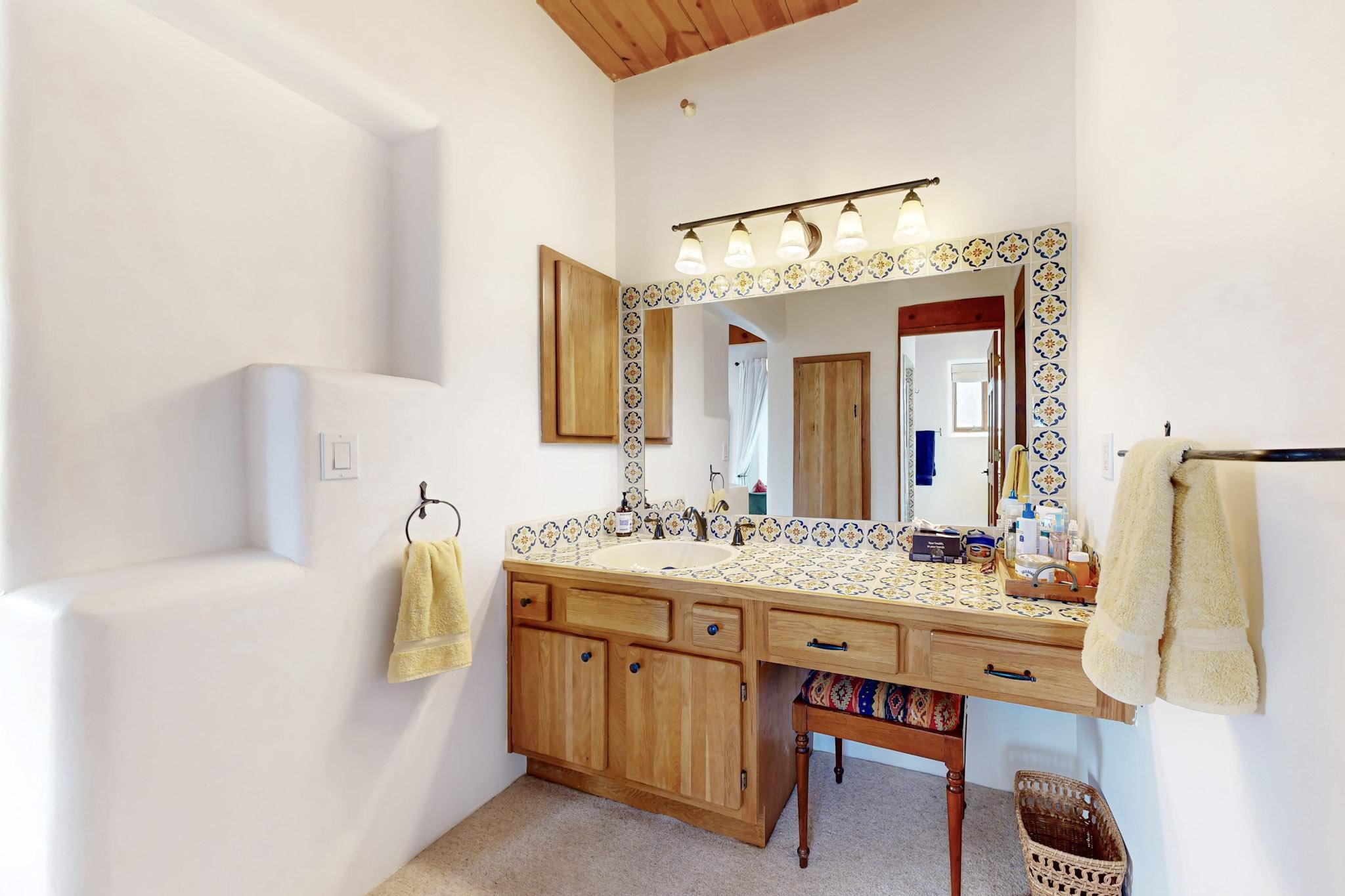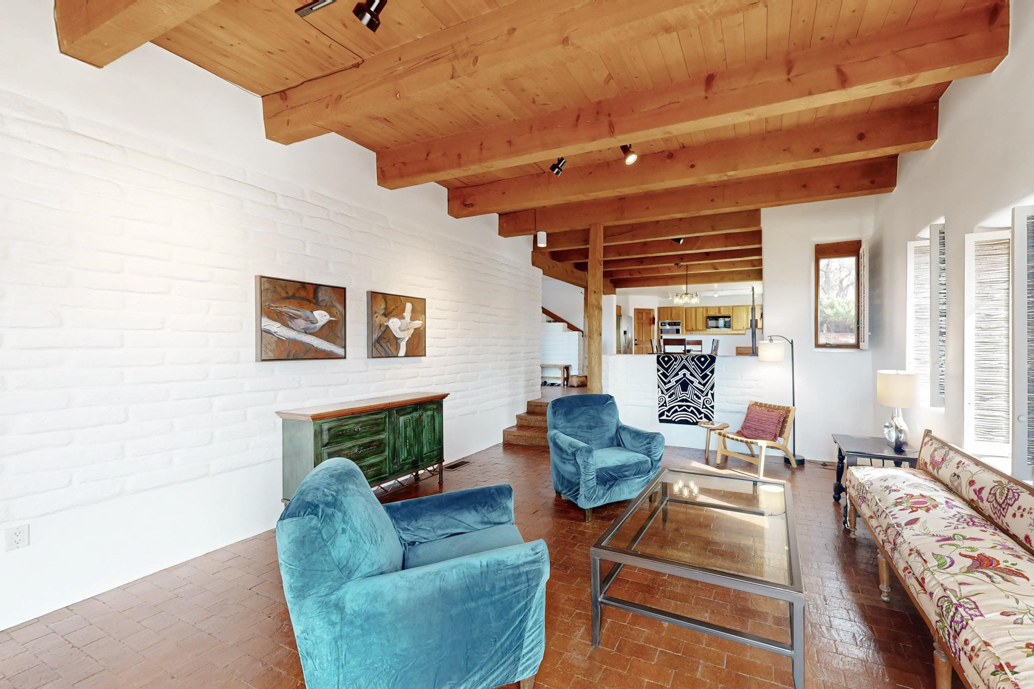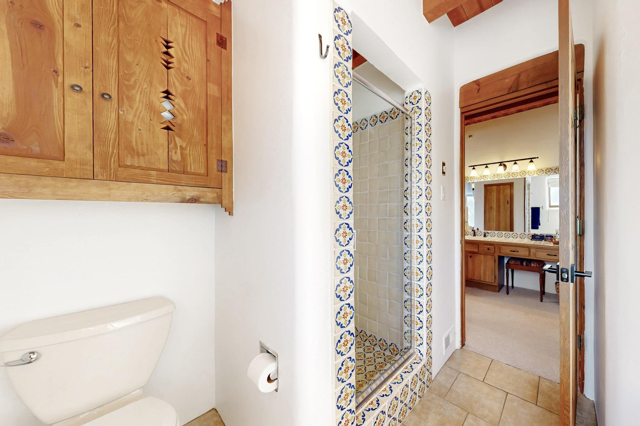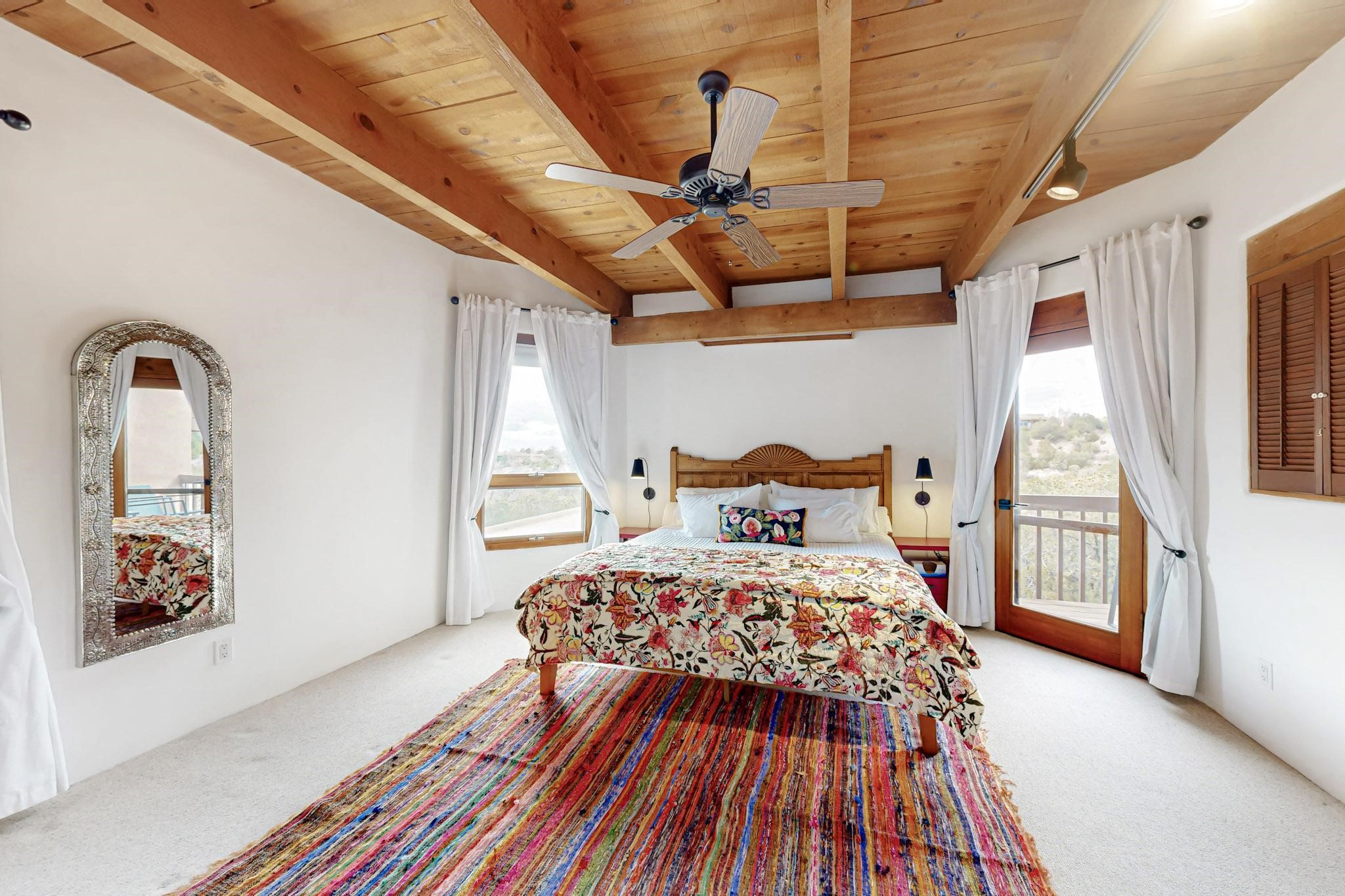 Spacious and private, with sweeping views of the Santa Fe foothills and ultimate convenience, this split level, 4 bedroom, 3 bath home cozies up to the base of the Sangre de Cristo's but is a short hop to downtown and the Plaza via hiking trails. The plan feels like a sloped spiral with wide comfortable stairs and great separation between rooms. Located in the Altamira neighborhood of Estancia Primera, a couple of hundred feet from the clubhouse, pool and tennis courts, and a short drive up the hill to the Santa Fe Ski Basin, this house features multiple outdoor spaces and a two car garage with generous storage for easy, luxury living. Recent roof and stucco mean major maintenance has been taken care of. Furnishings available upon request.