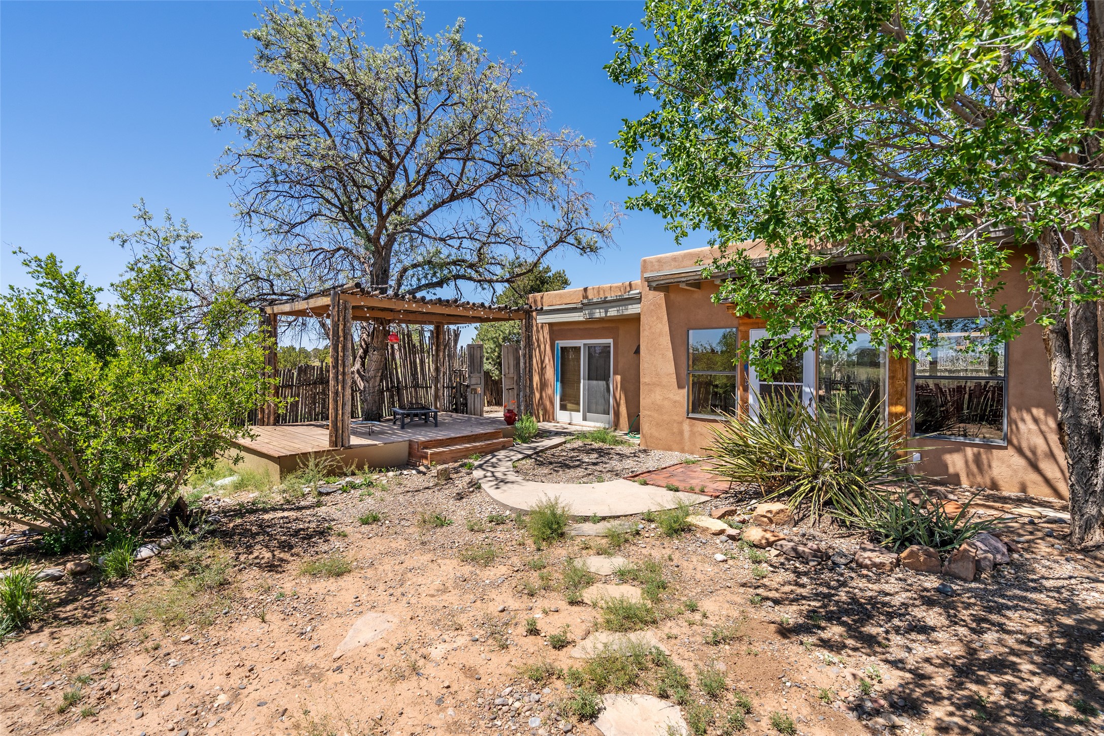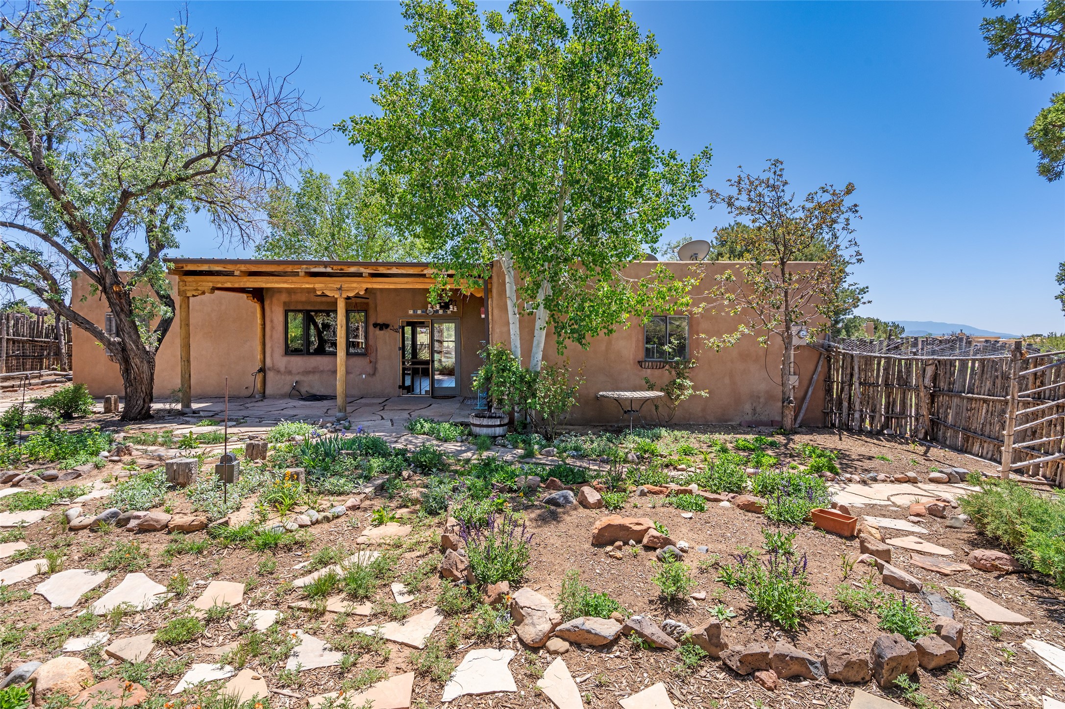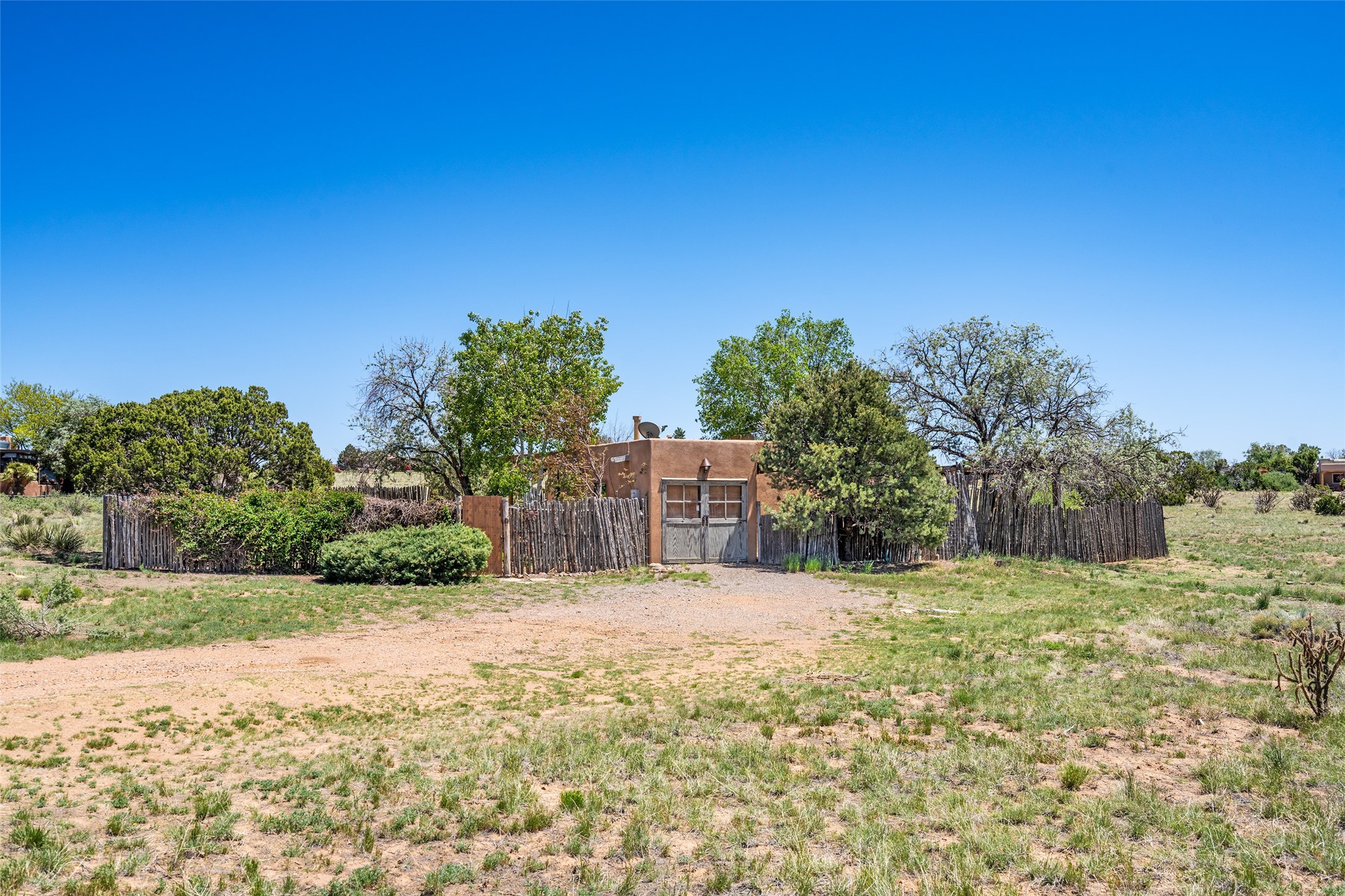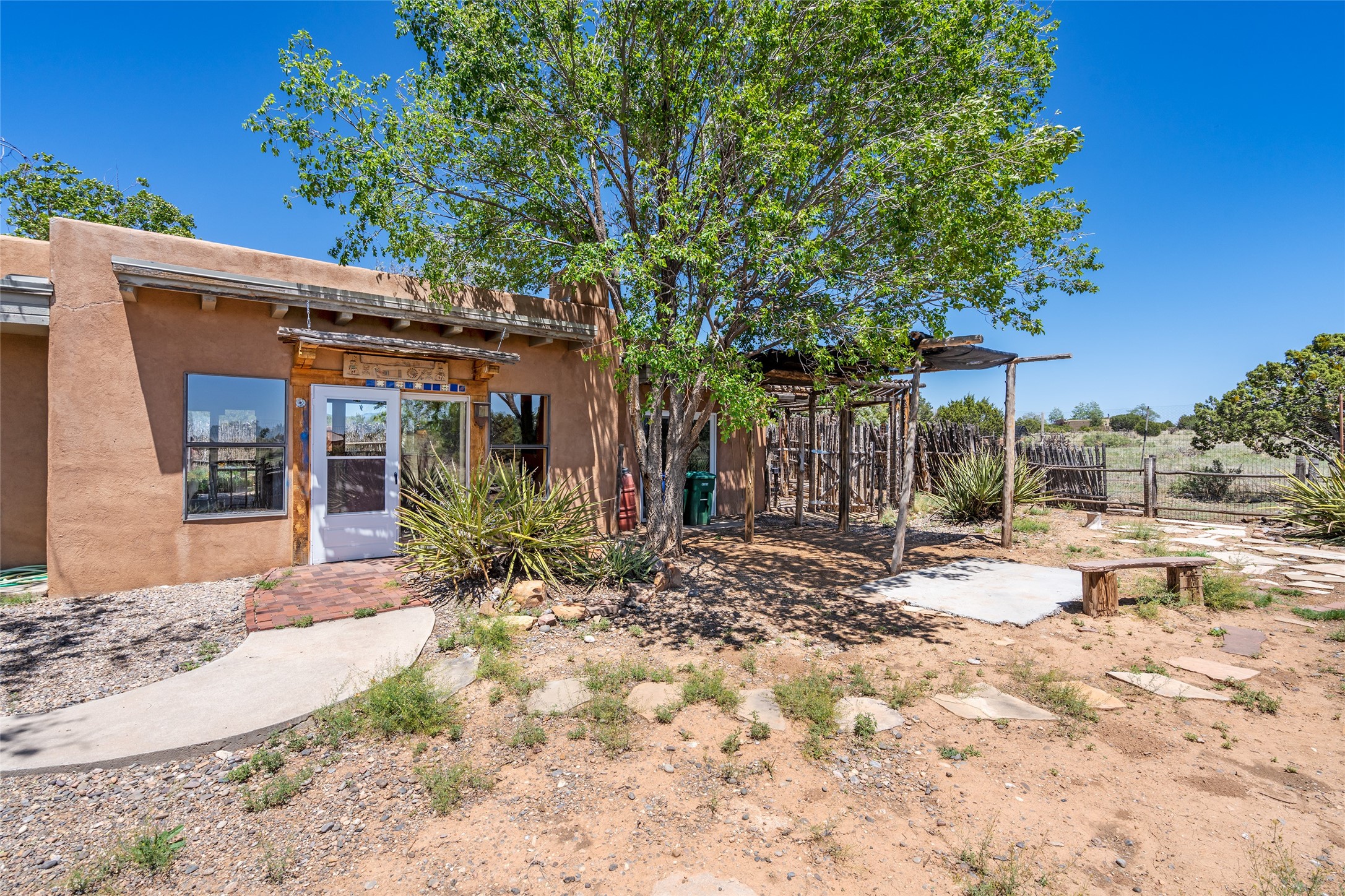 Excellent renovation opportunity in the desirable Eldorado community. Set on a 1.28-acre lot, this home is a hidden gem brimming with potential, ready to be transformed into a stylish Southwestern retreat. Enter the fenced-in yard with a large portal entering into an open concept kitchen, living and dining area, fantastic for entertaining and for those that love indoor-outdoor living.The split floor plan offers privacy for residents and guests, with the primary bedroom separate from the guest room and flex space. Each bedroom has french doors that open into the back yard. There is a garage turned flex space off of the laundry room that could be used as an artist studio or workshop, and the generous yard is a gardener's dream. Those seeking an active lifestyle will love the many amenities Eldorado has to offer: clubhouse, swimming pool, gym, tennis, horse stables and dog parks. Eldorado open space and the Galisteo Basin Preserve are nearby with trails and wildlife to be enjoyed. This property is a canvas for the imagination. Come see it today.