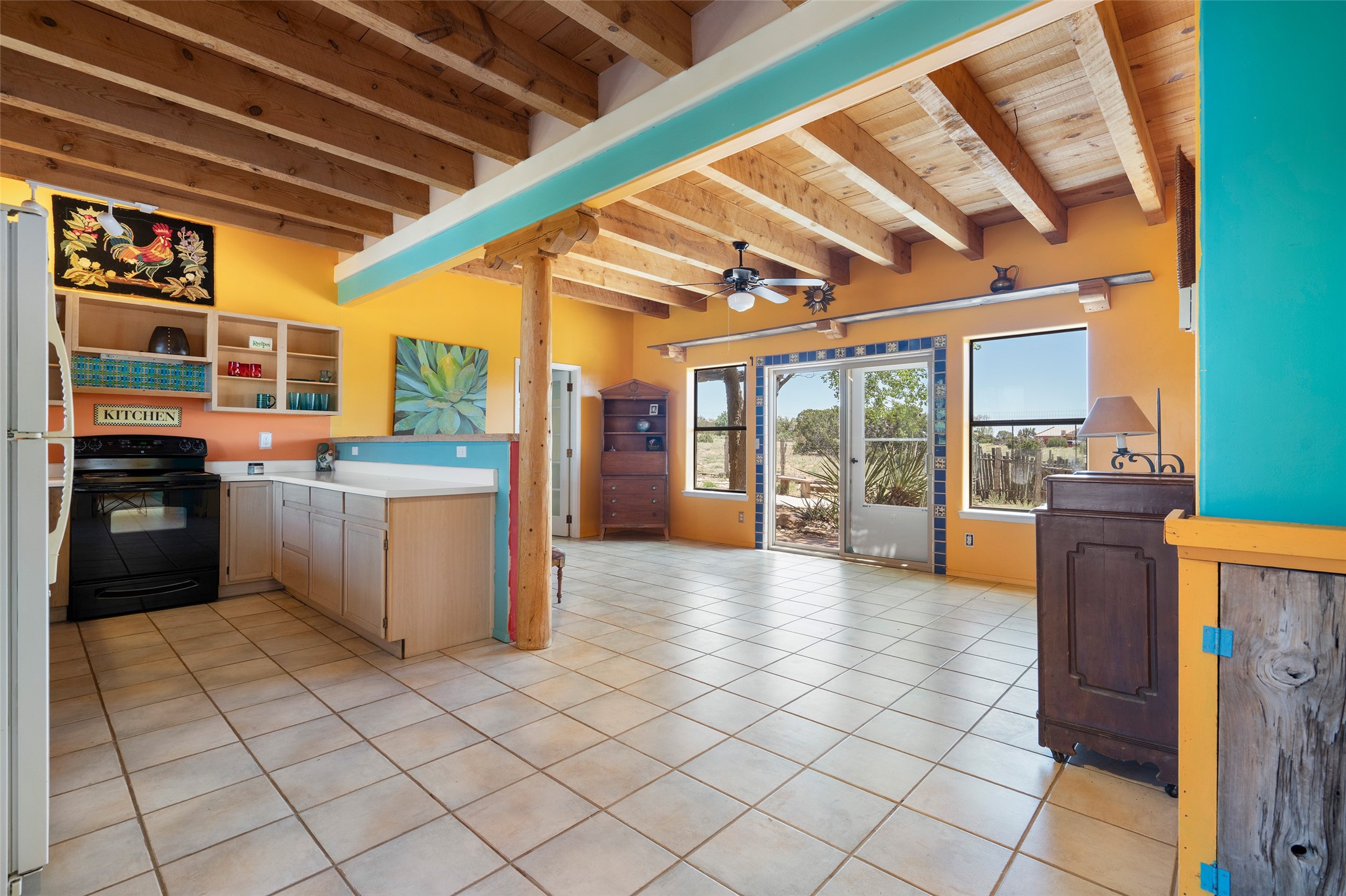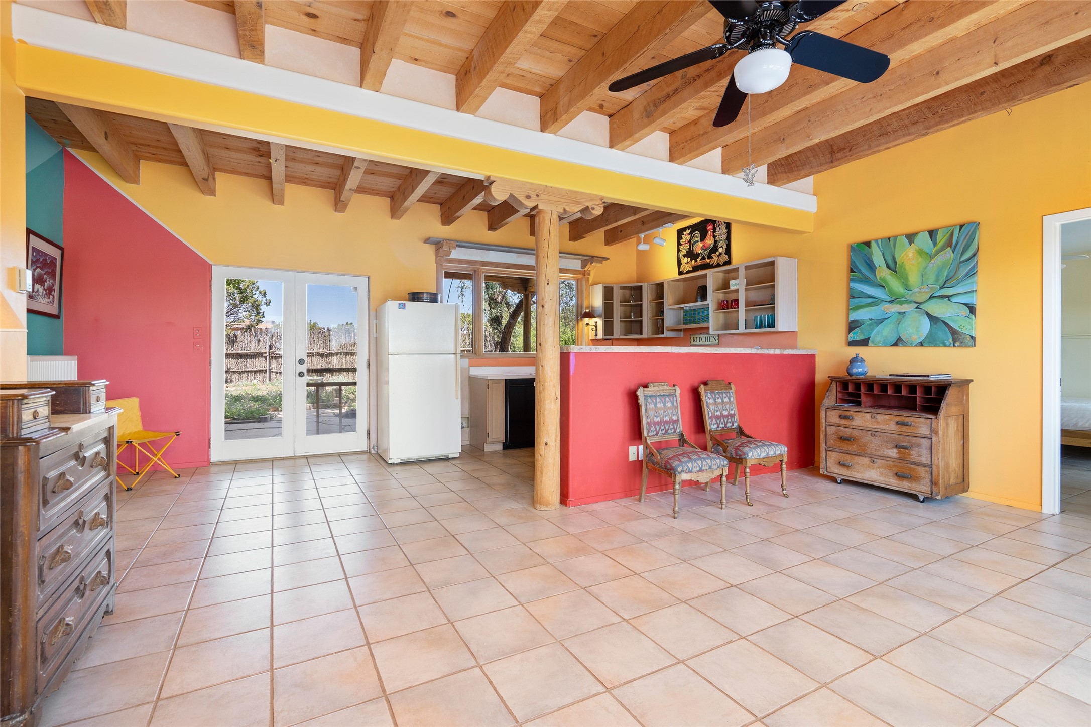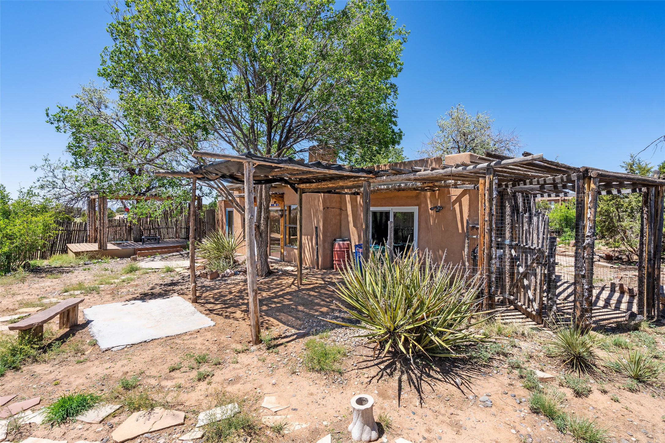 Excellent renovation opportunity in the desirable Eldorado community. Set on a 1.28-acre lot, this home is a hidden gem brimming with potential, ready to be transformed into a stylish Southwestern retreat. Enter the fenced-in yard with a large portal entering into an open concept kitchen, living and dining area, fantastic for entertaining and for those that love indoor-outdoor living.The split floor plan offers privacy for residents and guests, with the primary bedroom separate from the guest room and flex space. Each bedroom has french doors that open into the back yard. There is a garage turned flex space off of the laundry room that could be used as an artist studio or workshop, and the generous yard is a gardener's dream. Those seeking an active lifestyle will love the many amenities Eldorado has to offer: clubhouse, swimming pool, gym, tennis, horse stables and dog parks. Eldorado open space and the Galisteo Basin Preserve are nearby with trails and wildlife to be enjoyed. This property is a canvas for the imagination. Come see it today.