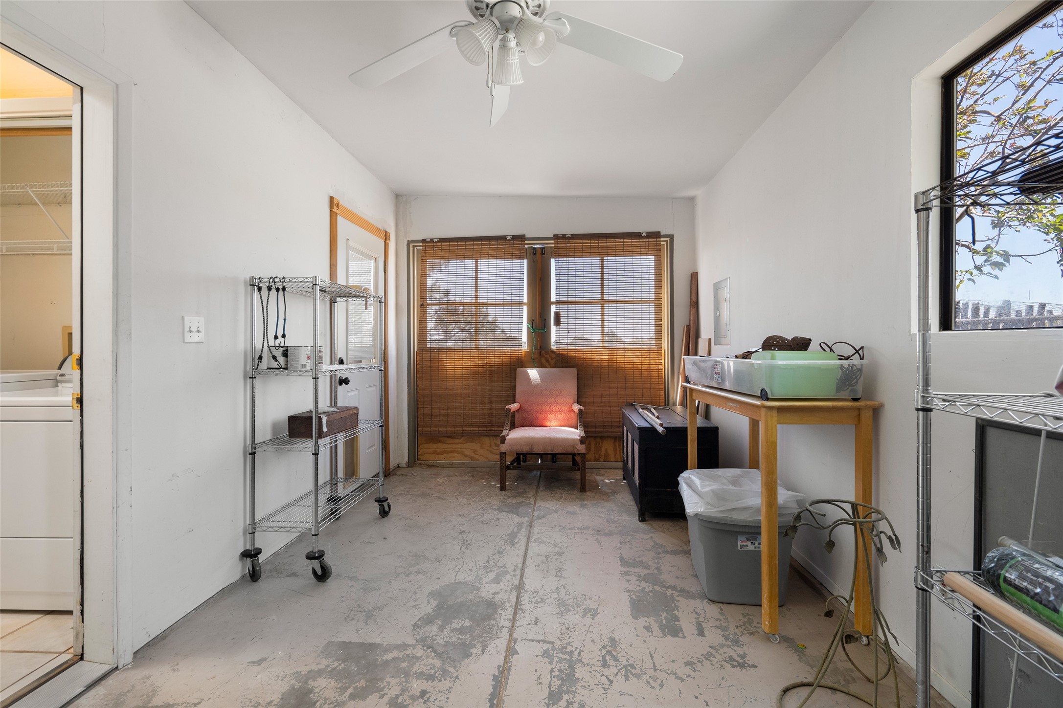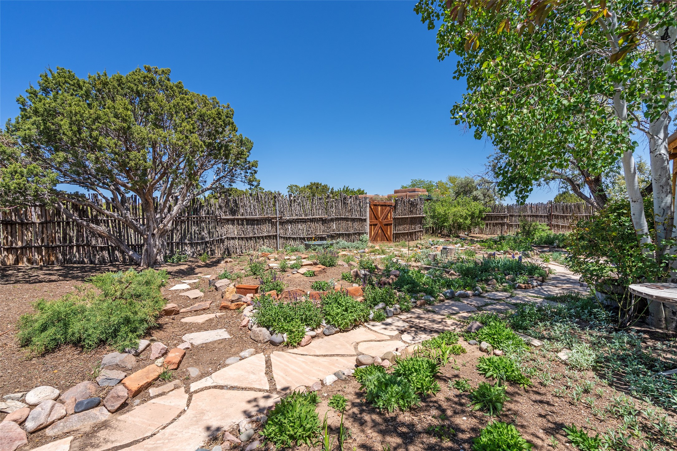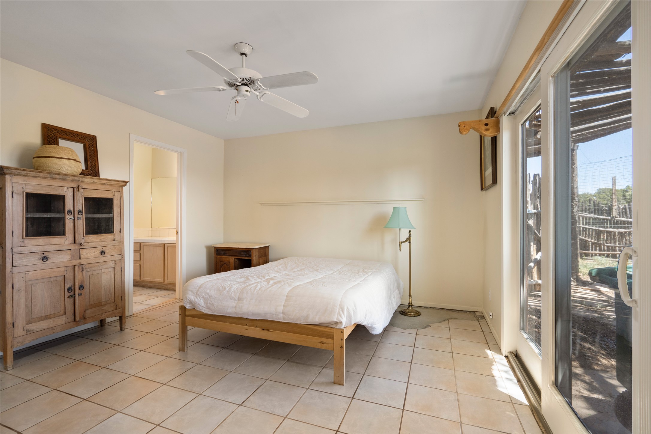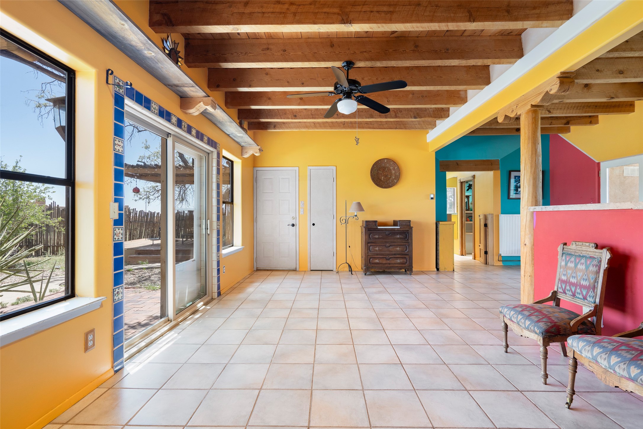 Excellent renovation opportunity in the desirable Eldorado community. Set on a 1.28-acre lot, this home is a hidden gem brimming with potential, ready to be transformed into a stylish Southwestern retreat. Enter the fenced-in yard with a large portal entering into an open concept kitchen, living and dining area, fantastic for entertaining and for those that love indoor-outdoor living.The split floor plan offers privacy for residents and guests, with the primary bedroom separate from the guest room and flex space. Each bedroom has french doors that open into the back yard. There is a garage turned flex space off of the laundry room that could be used as an artist studio or workshop, and the generous yard is a gardener's dream. Those seeking an active lifestyle will love the many amenities Eldorado has to offer: clubhouse, swimming pool, gym, tennis, horse stables and dog parks. Eldorado open space and the Galisteo Basin Preserve are nearby with trails and wildlife to be enjoyed. This property is a canvas for the imagination. Come see it today.