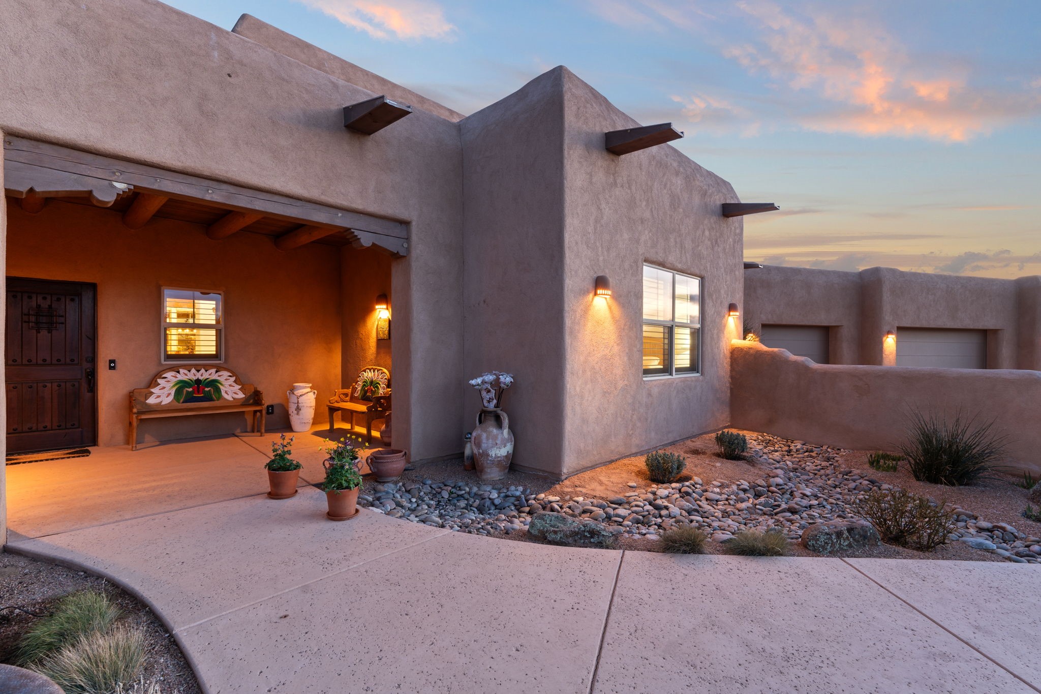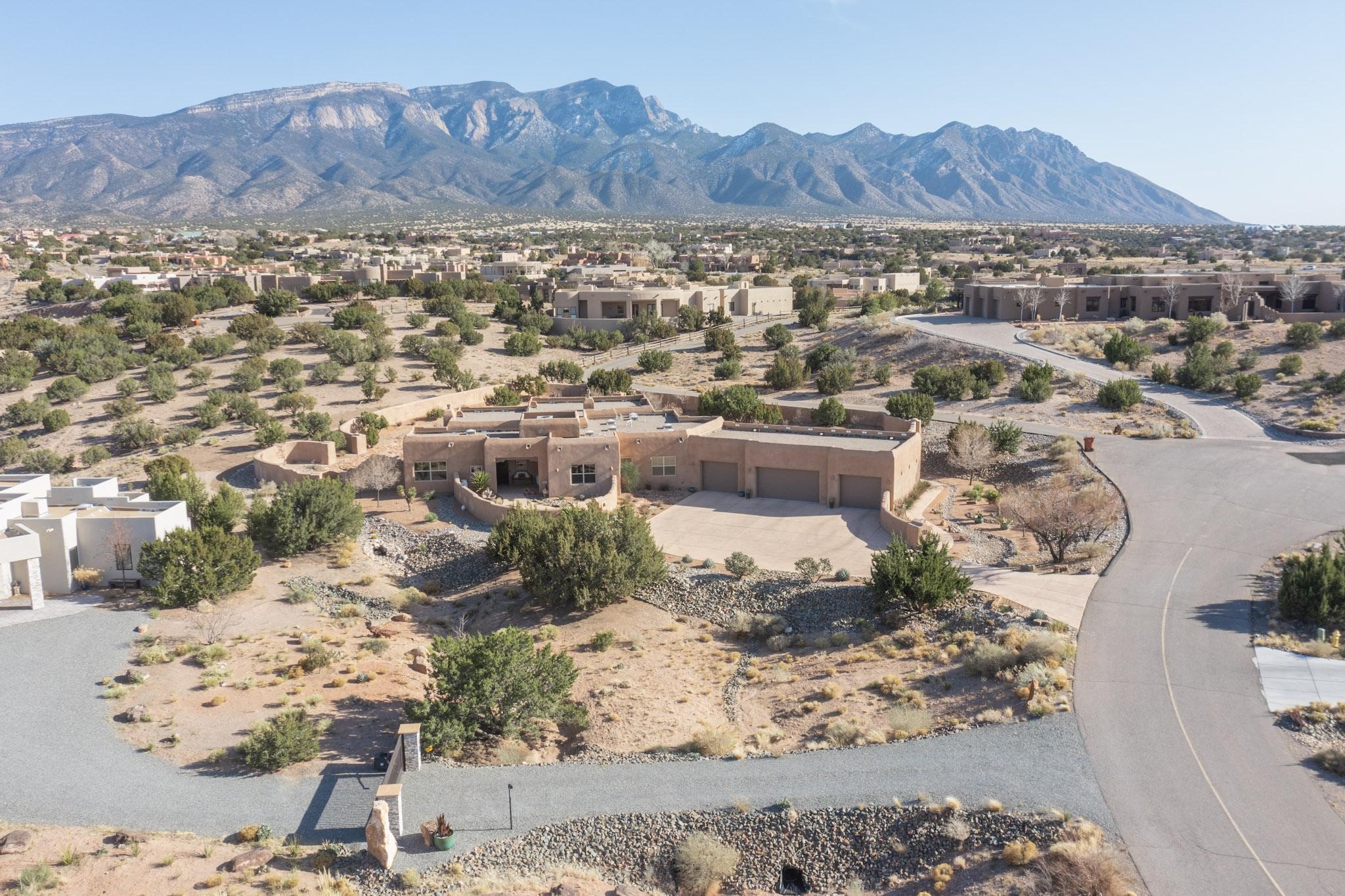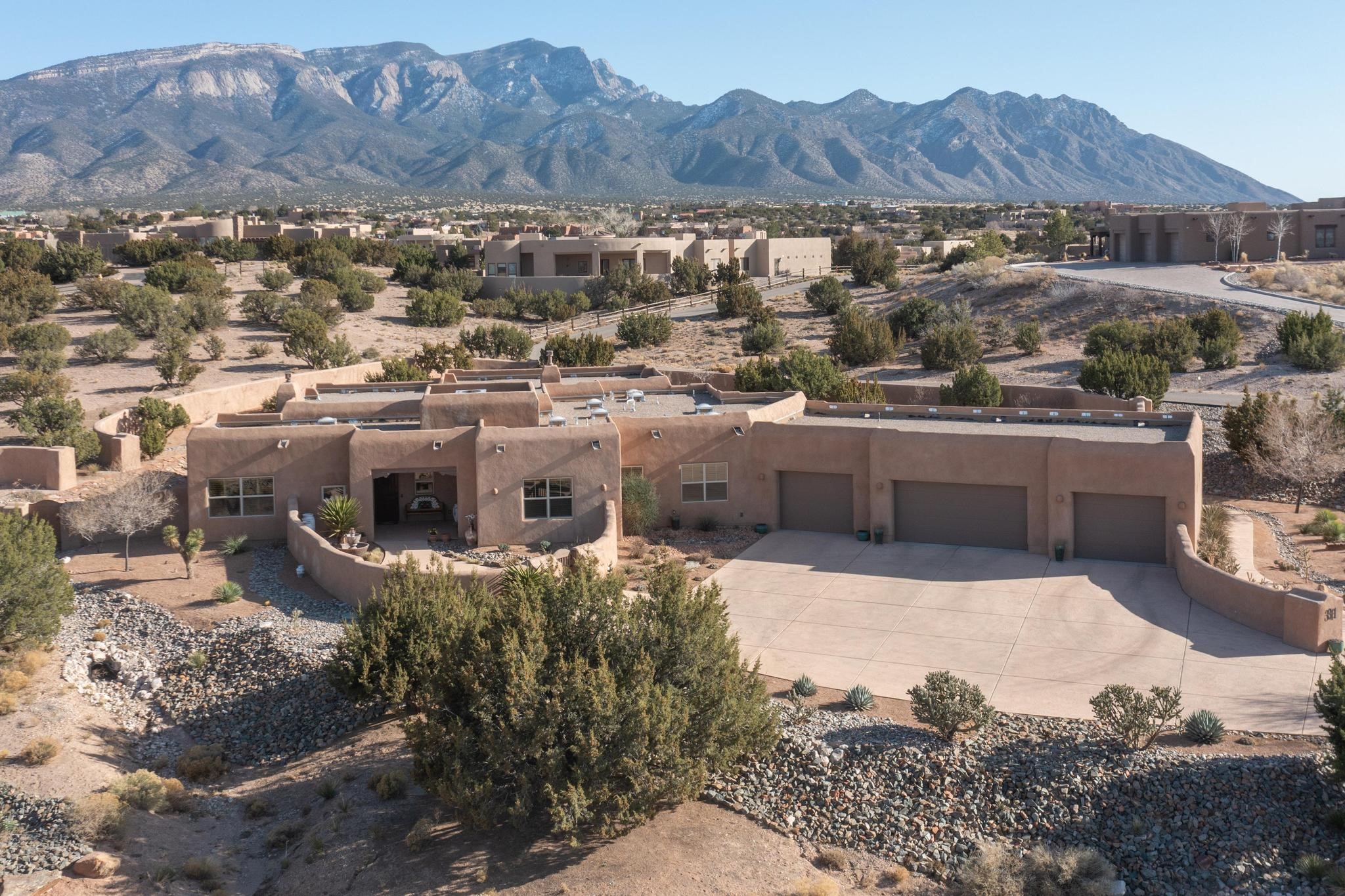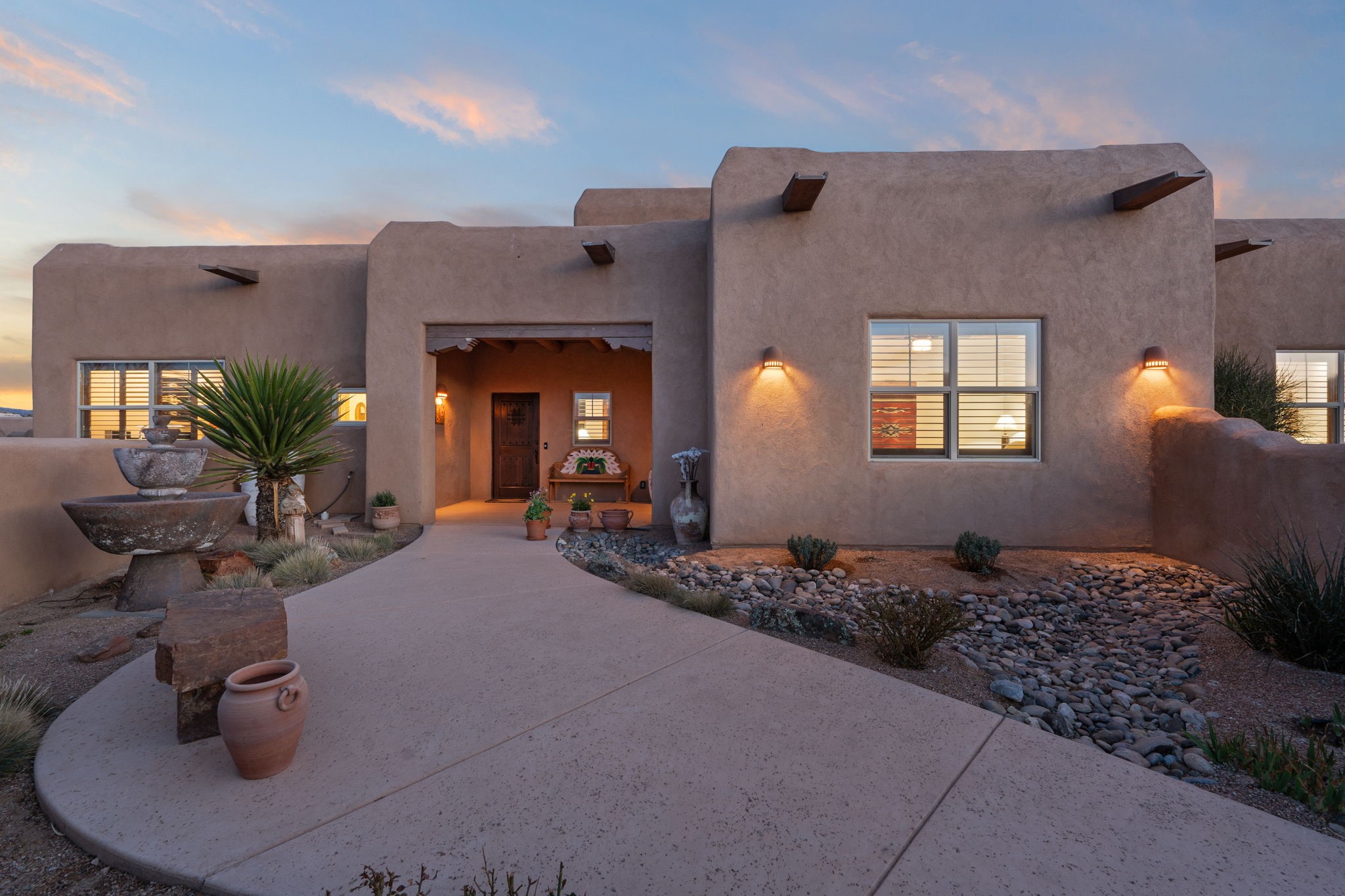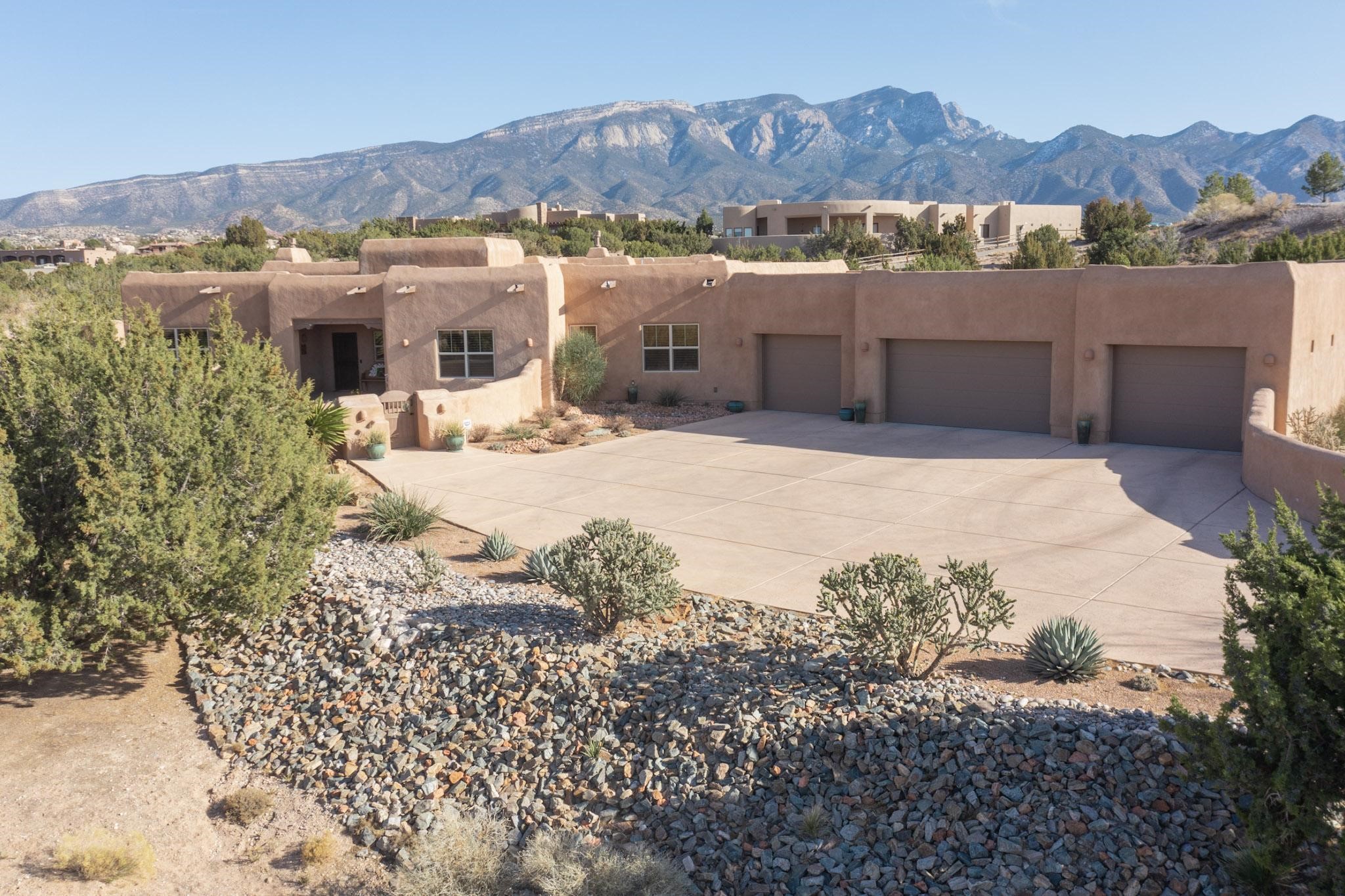 Discover this unique custom-built home in picturesque Placitas, offering stunning views of the Sandia Mountains from an elevated .95-acre cul-de-sac lot, just 1.4 miles from I-25. Enjoy the tranquility of this serene retreat without sacrificing convenience. This traditional New Mexico-style single-level home spans 2,964 square feet, featuring natural stone tiled floors, raised wood beamed and plank ceilings, and a blend of Southwest charm and contemporary elegance. The main living area includes natural gas fireplaces, while the chef's kitchen boasts granite counters, custom cabinetry, and premium appliances. A versatile 17 x 22 flex room offers space for various activities. Retreat to the primary suite with a spacious walk-in closet and spa-like bathroom boasting dual vanities and a fully tiled walk-in shower. Two additional bedrooms, a full bath, and a powder room provide comfort for family or guests. The oversized 1,351 square foot 4-car garage features a porcelain tile floor, mini-split heating and cooling, and ample storage--ideal for car enthusiasts or hobbyists. Outside, the fully landscaped lot features an extensive irrigation system, a charming front courtyard with a fountain, and a southeast-facing backyard with walkways and an outdoor kitchen complete with a premium grill. Gather around the masonry fireplace to enjoy beautiful sunsets and starry nights. This exceptional property combines premium features with thoughtful details that must be seen to be appreciated. Don't miss the chance to make this extraordinary home your own in Placitas!