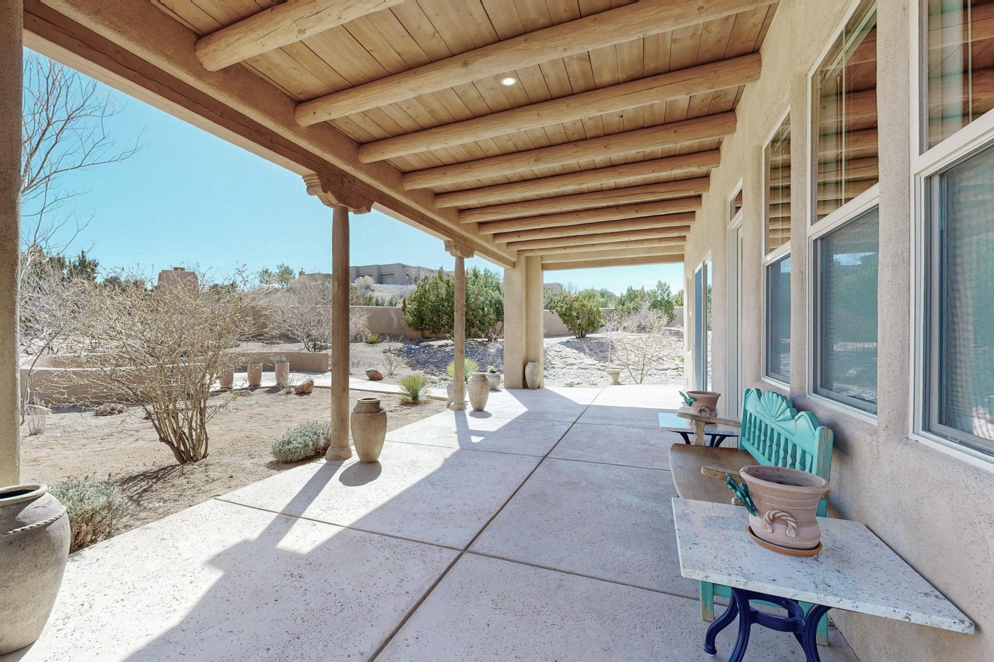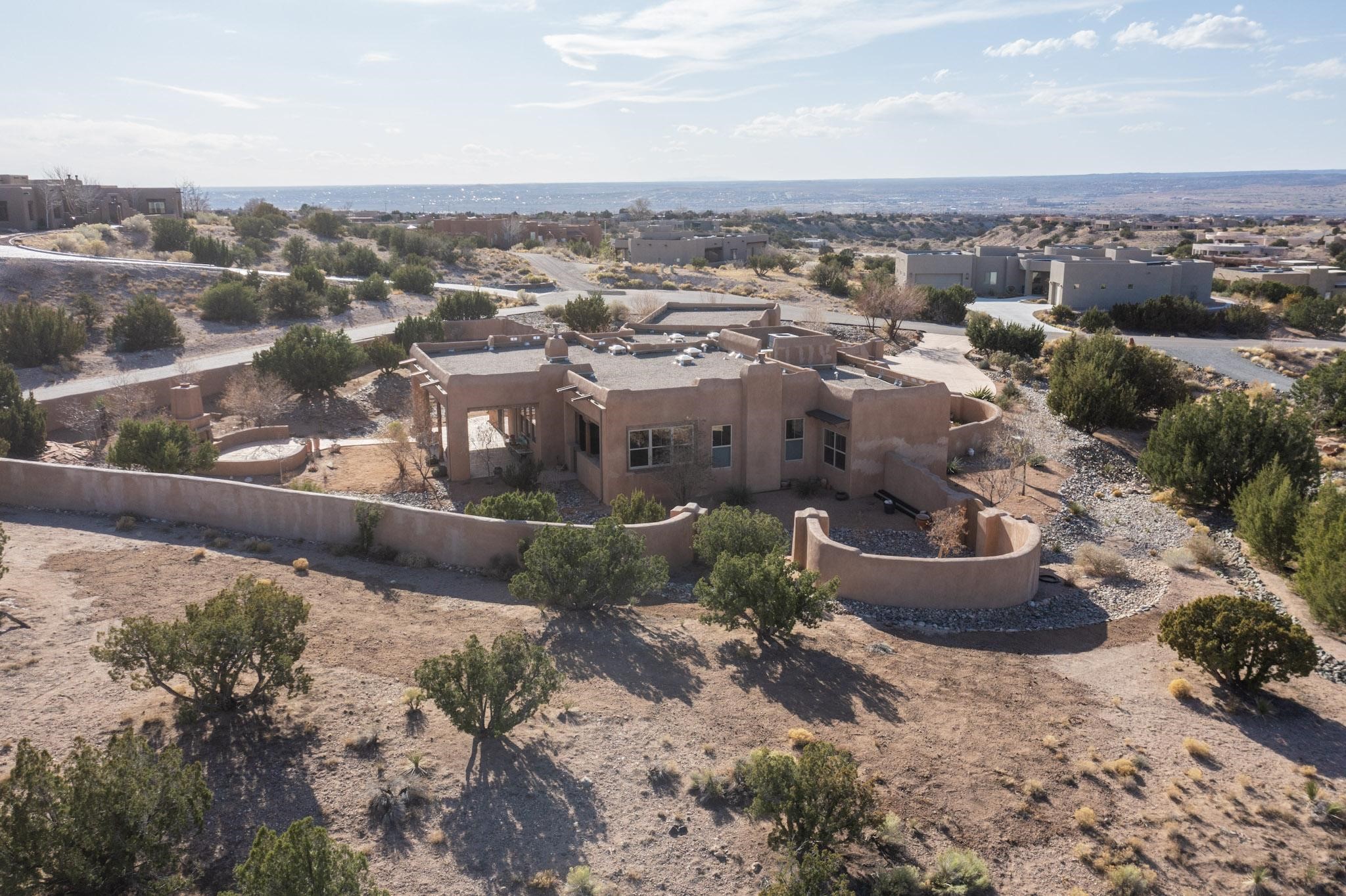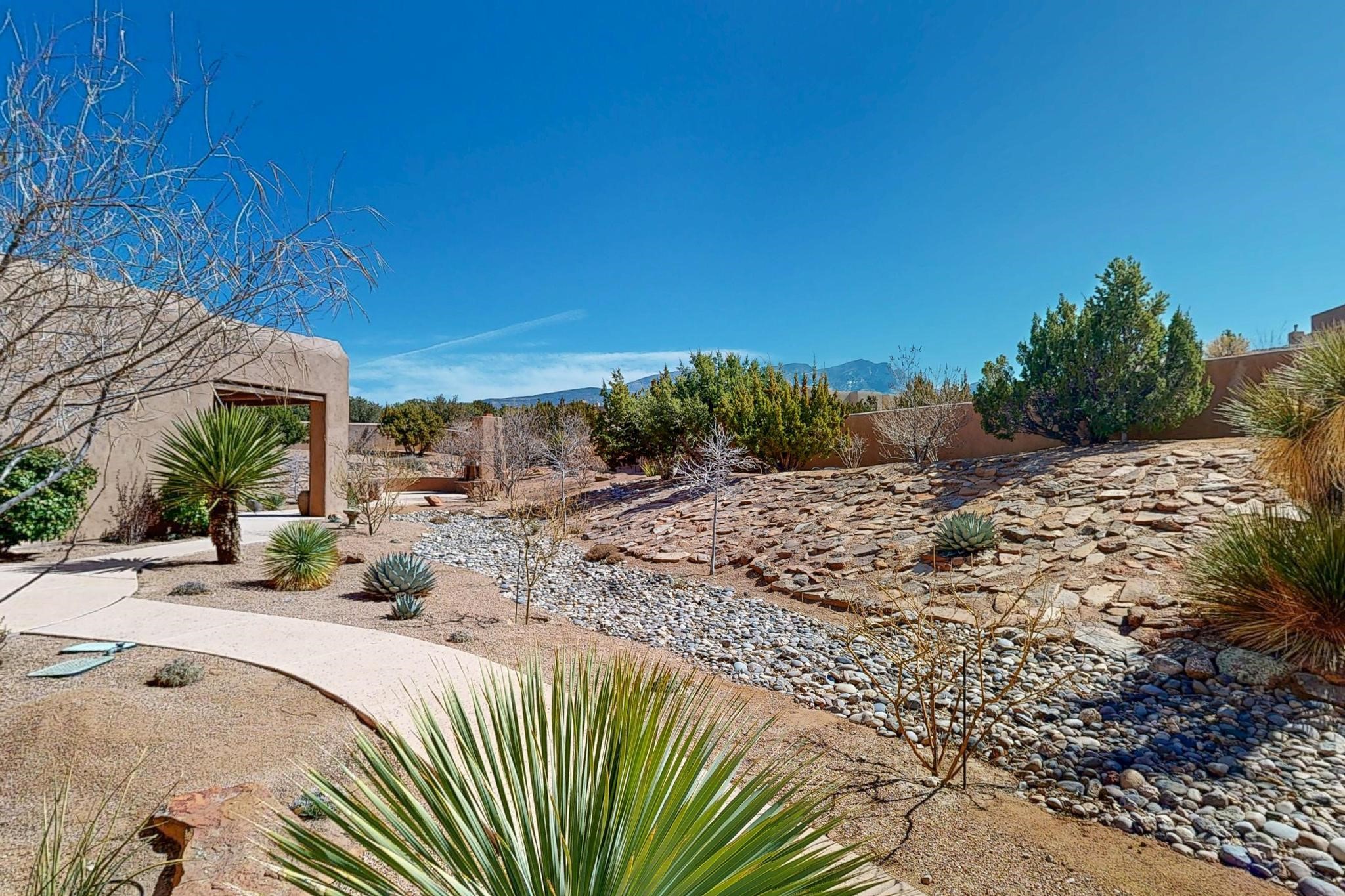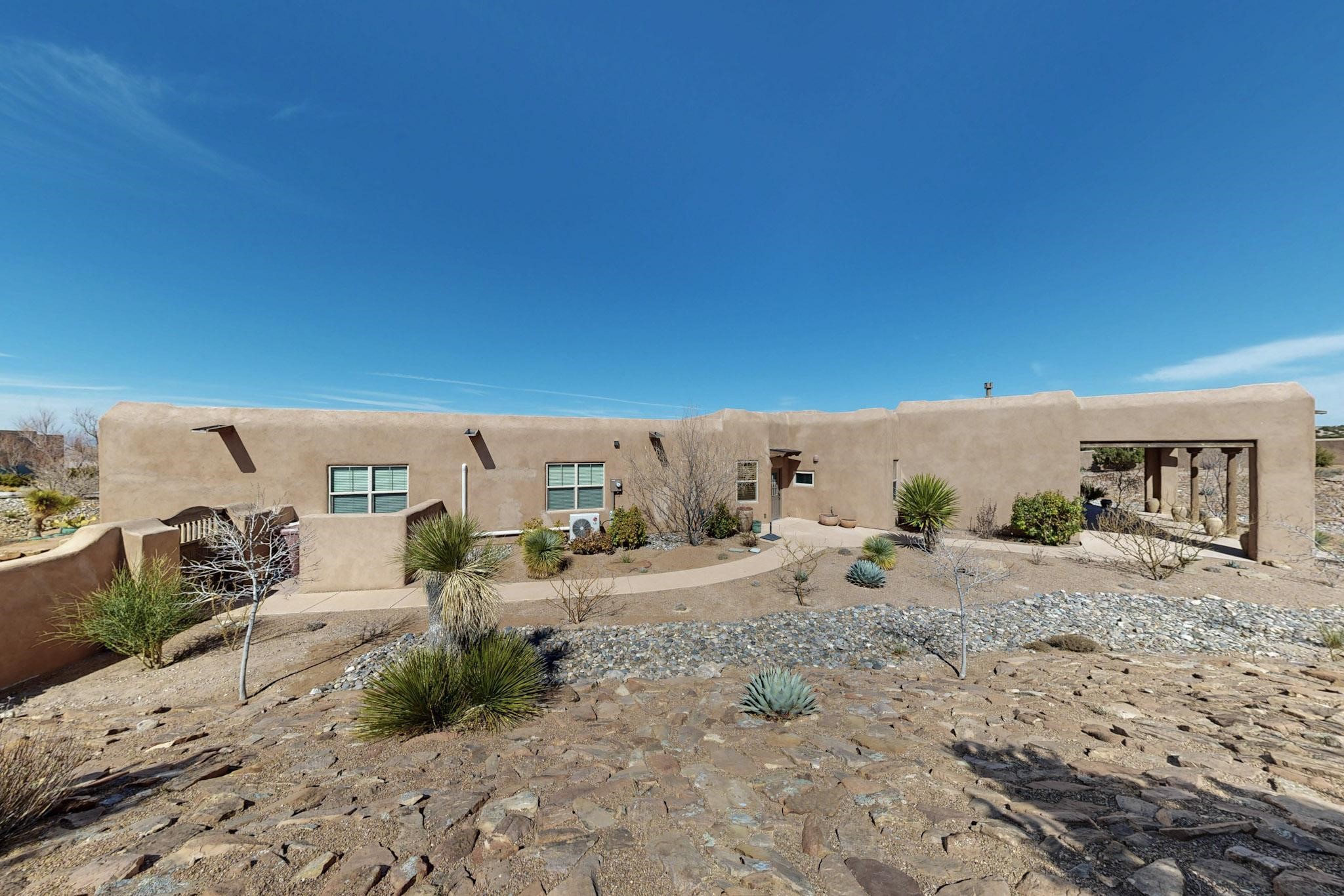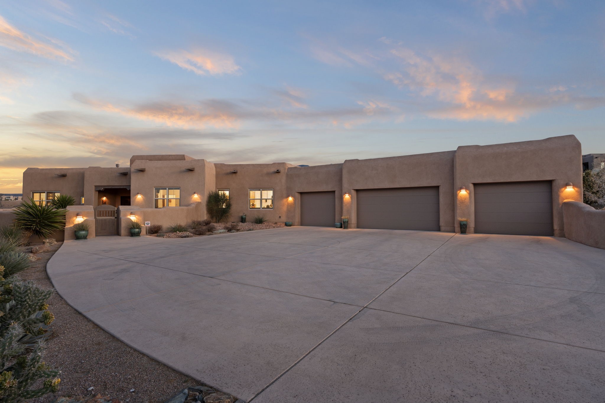 Discover this unique custom-built home in picturesque Placitas, offering stunning views of the Sandia Mountains from an elevated .95-acre cul-de-sac lot, just 1.4 miles from I-25. Enjoy the tranquility of this serene retreat without sacrificing convenience. This traditional New Mexico-style single-level home spans 2,964 square feet, featuring natural stone tiled floors, raised wood beamed and plank ceilings, and a blend of Southwest charm and contemporary elegance. The main living area includes natural gas fireplaces, while the chef's kitchen boasts granite counters, custom cabinetry, and premium appliances. A versatile 17 x 22 flex room offers space for various activities. Retreat to the primary suite with a spacious walk-in closet and spa-like bathroom boasting dual vanities and a fully tiled walk-in shower. Two additional bedrooms, a full bath, and a powder room provide comfort for family or guests. The oversized 1,351 square foot 4-car garage features a porcelain tile floor, mini-split heating and cooling, and ample storage--ideal for car enthusiasts or hobbyists. Outside, the fully landscaped lot features an extensive irrigation system, a charming front courtyard with a fountain, and a southeast-facing backyard with walkways and an outdoor kitchen complete with a premium grill. Gather around the masonry fireplace to enjoy beautiful sunsets and starry nights. This exceptional property combines premium features with thoughtful details that must be seen to be appreciated. Don't miss the chance to make this extraordinary home your own in Placitas!