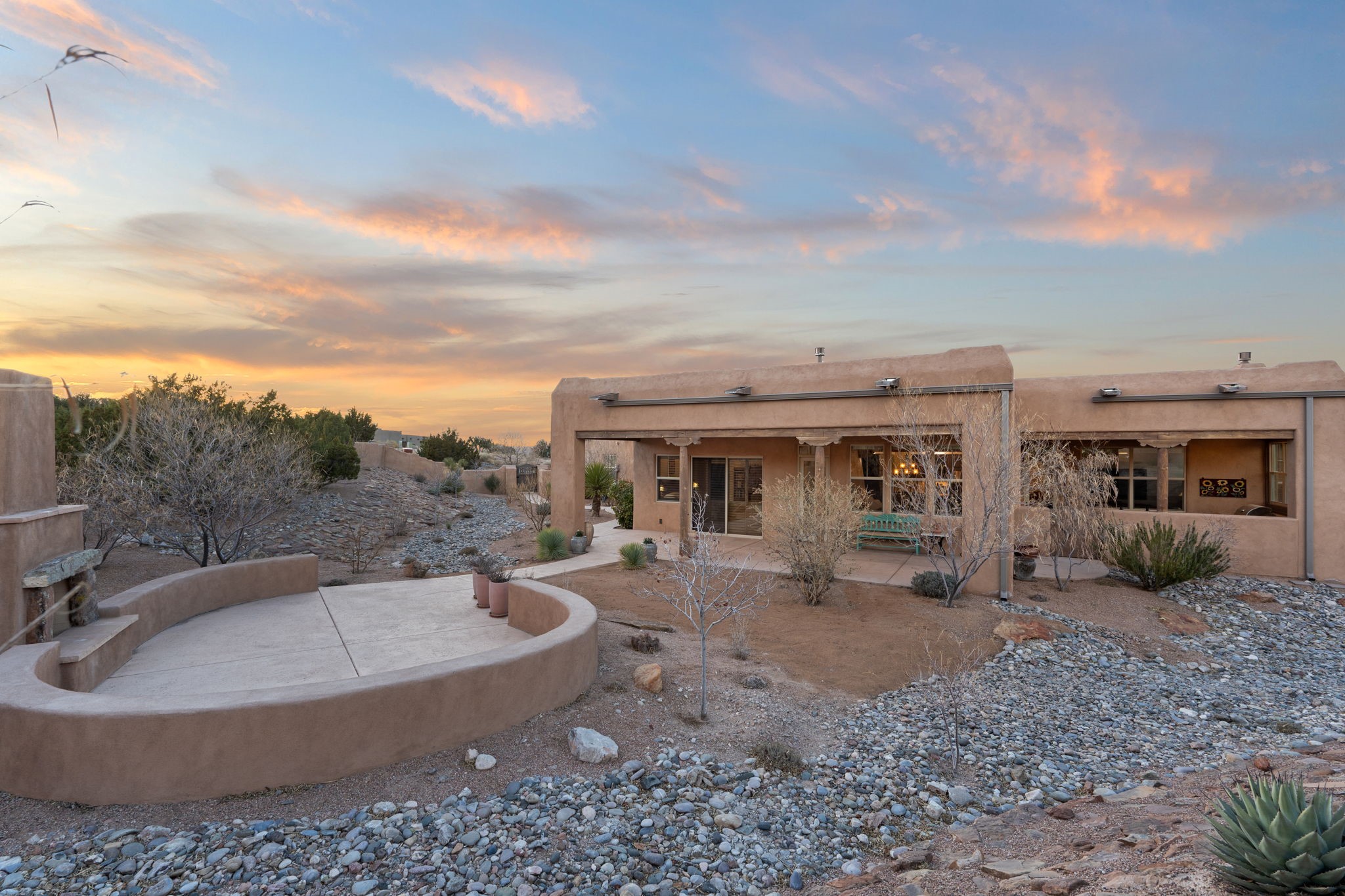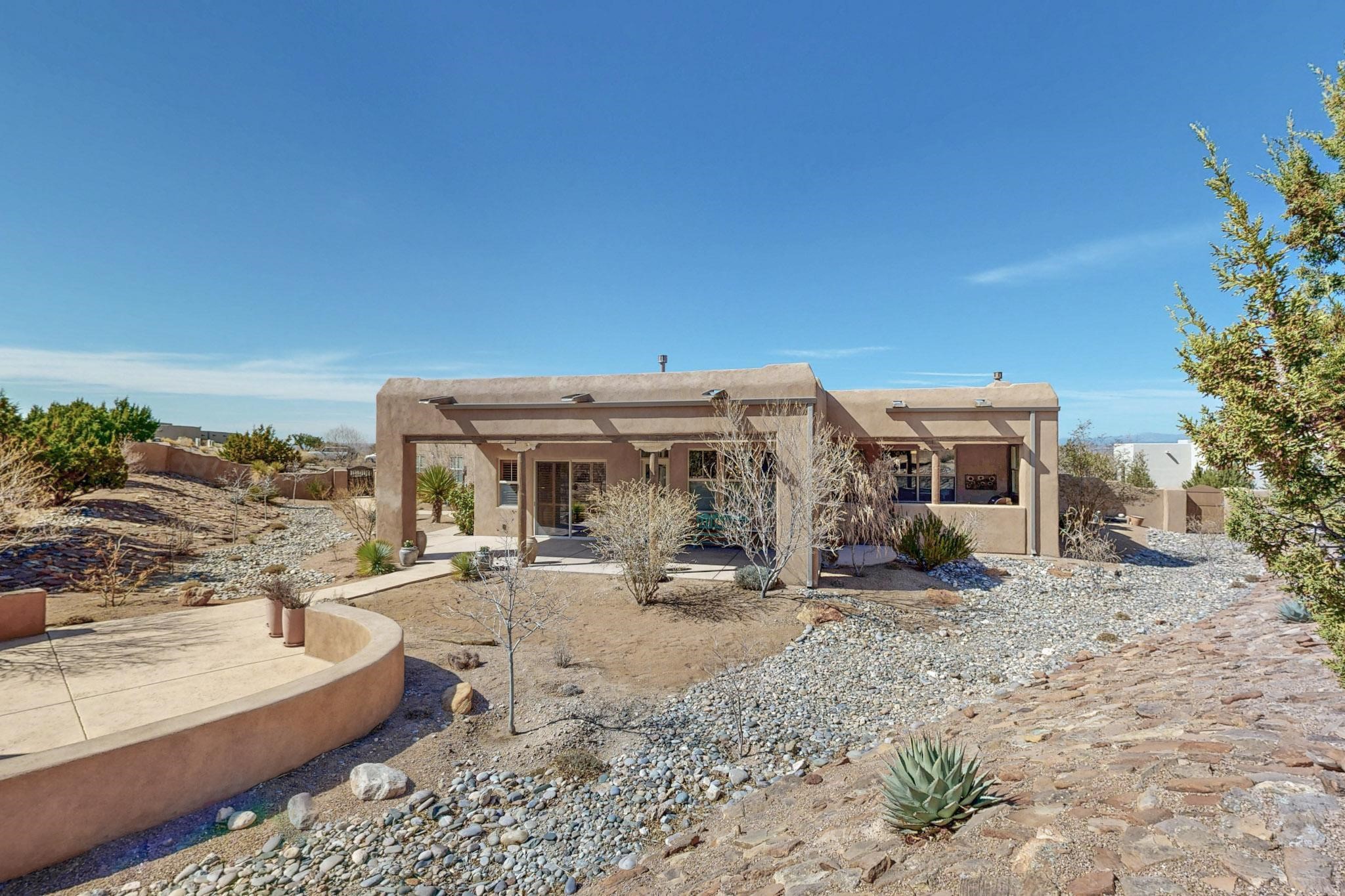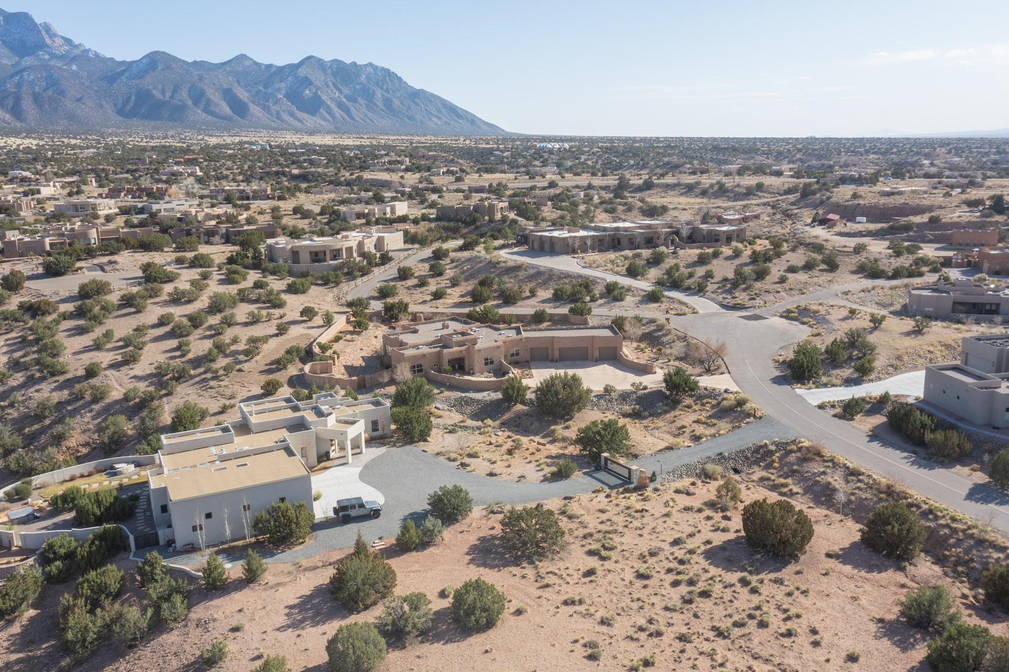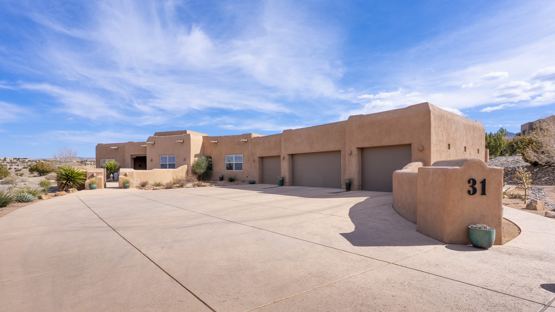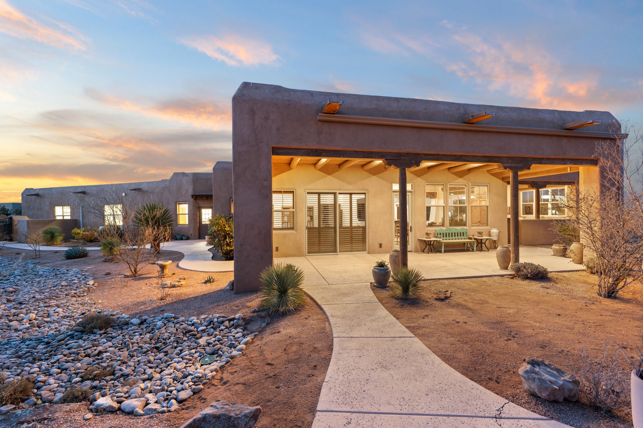 Discover this unique custom-built home in picturesque Placitas, offering stunning views of the Sandia Mountains from an elevated .95-acre cul-de-sac lot, just 1.4 miles from I-25. Enjoy the tranquility of this serene retreat without sacrificing convenience. This traditional New Mexico-style single-level home spans 2,964 square feet, featuring natural stone tiled floors, raised wood beamed and plank ceilings, and a blend of Southwest charm and contemporary elegance. The main living area includes natural gas fireplaces, while the chef's kitchen boasts granite counters, custom cabinetry, and premium appliances. A versatile 17 x 22 flex room offers space for various activities. Retreat to the primary suite with a spacious walk-in closet and spa-like bathroom boasting dual vanities and a fully tiled walk-in shower. Two additional bedrooms, a full bath, and a powder room provide comfort for family or guests. The oversized 1,351 square foot 4-car garage features a porcelain tile floor, mini-split heating and cooling, and ample storage--ideal for car enthusiasts or hobbyists. Outside, the fully landscaped lot features an extensive irrigation system, a charming front courtyard with a fountain, and a southeast-facing backyard with walkways and an outdoor kitchen complete with a premium grill. Gather around the masonry fireplace to enjoy beautiful sunsets and starry nights. This exceptional property combines premium features with thoughtful details that must be seen to be appreciated. Don't miss the chance to make this extraordinary home your own in Placitas!