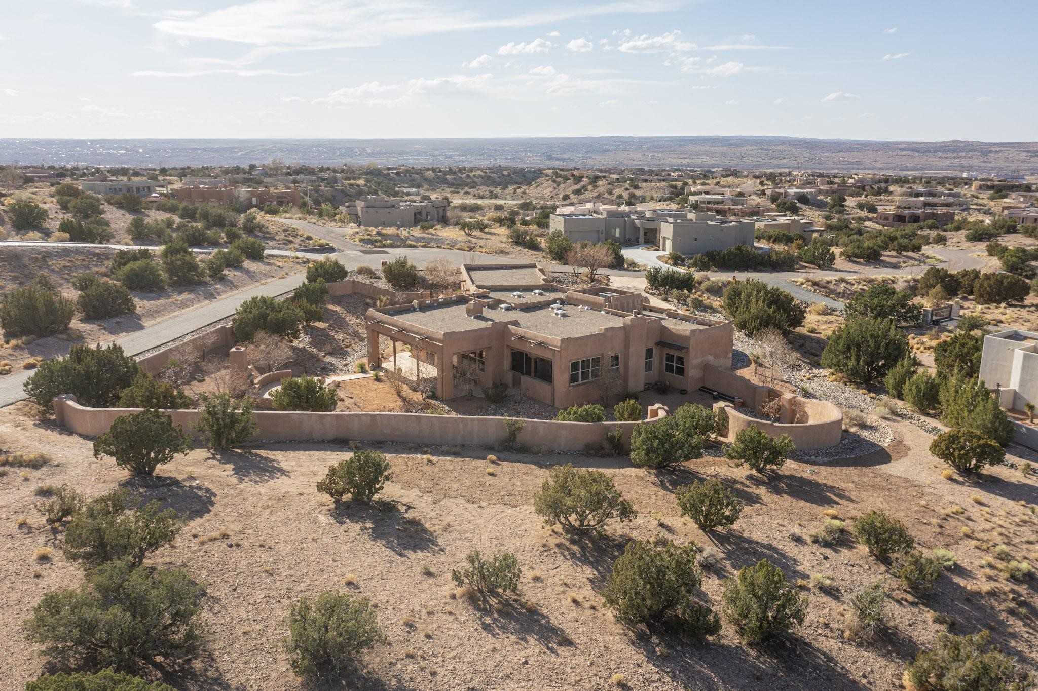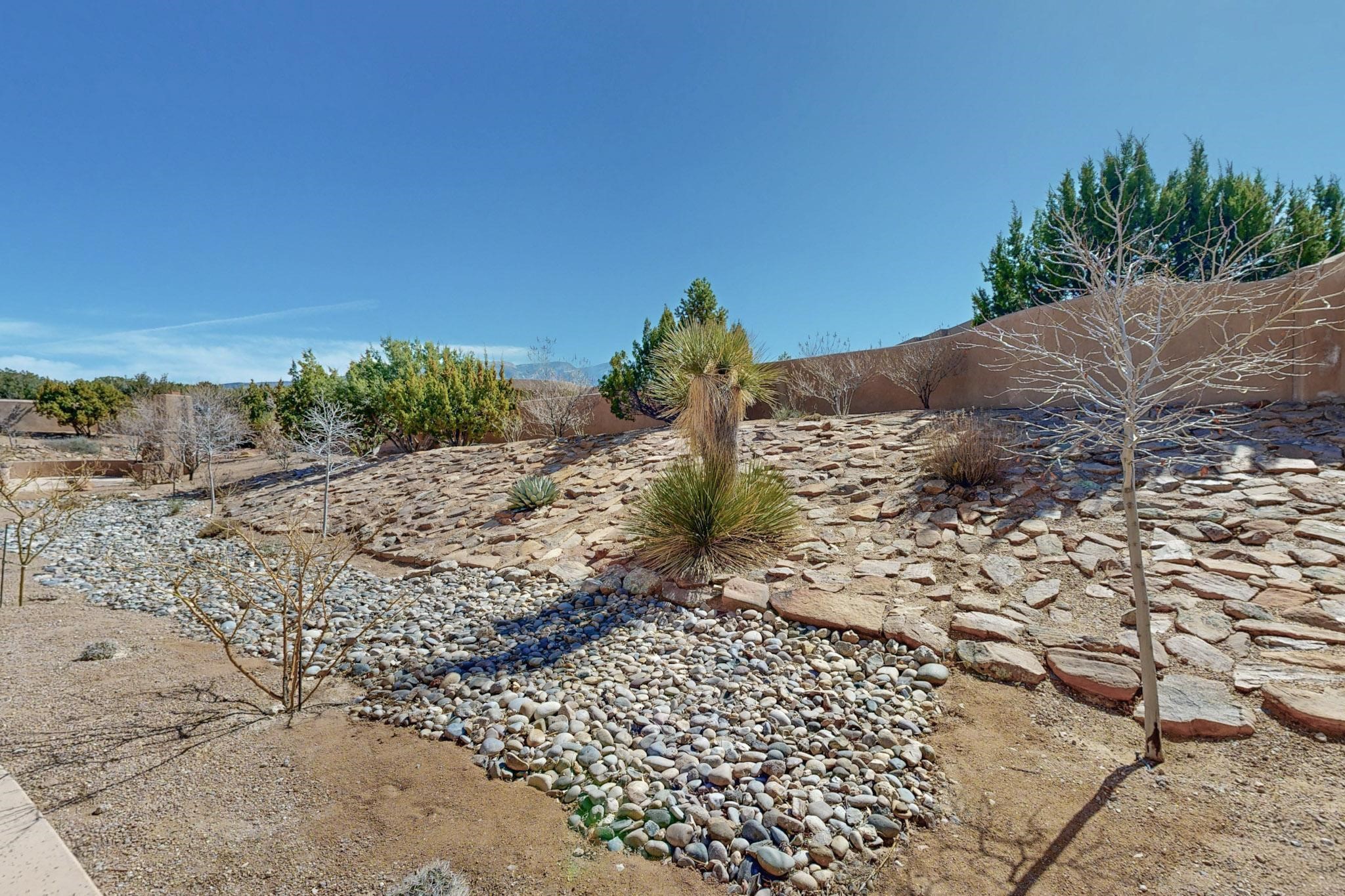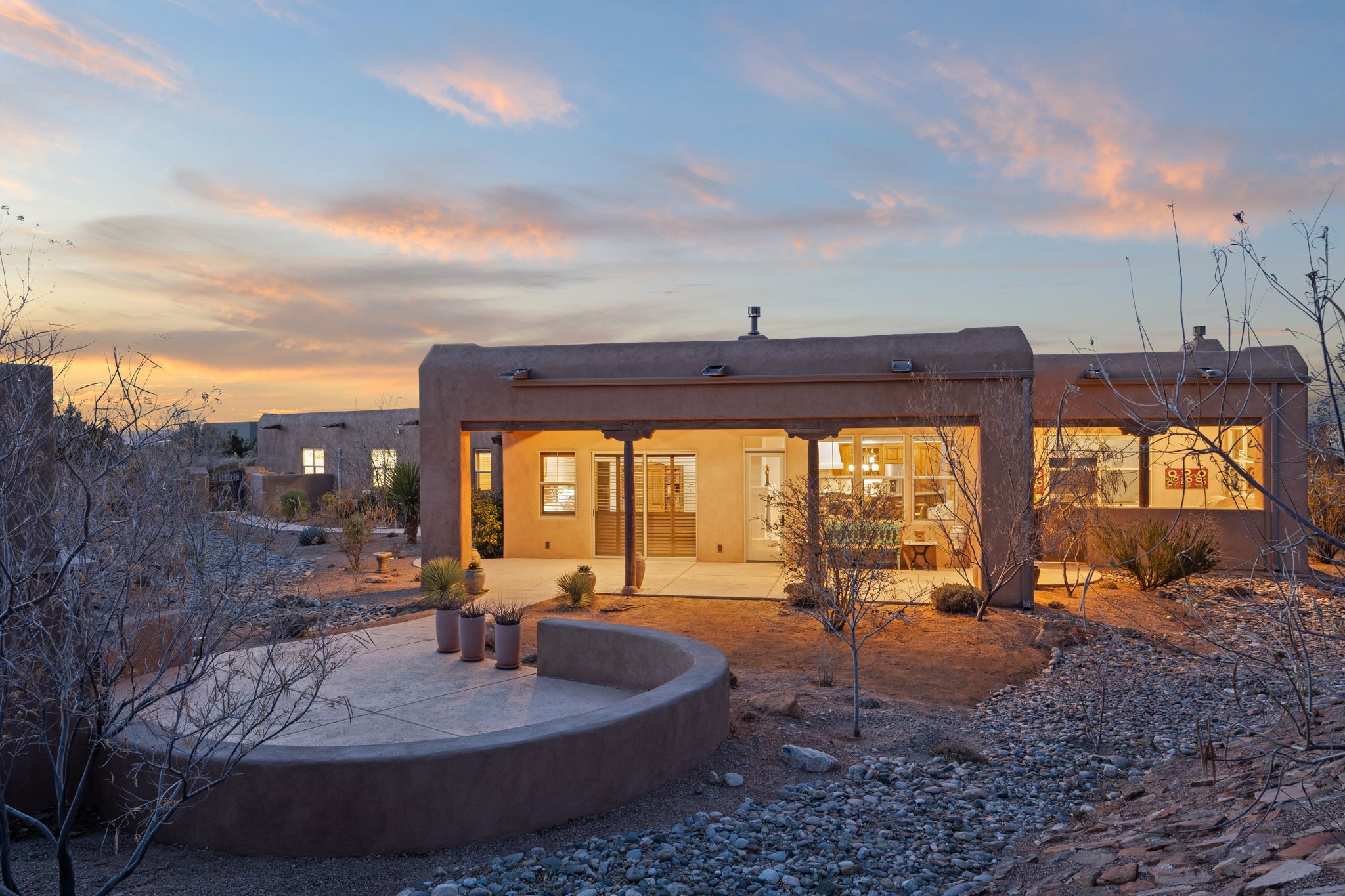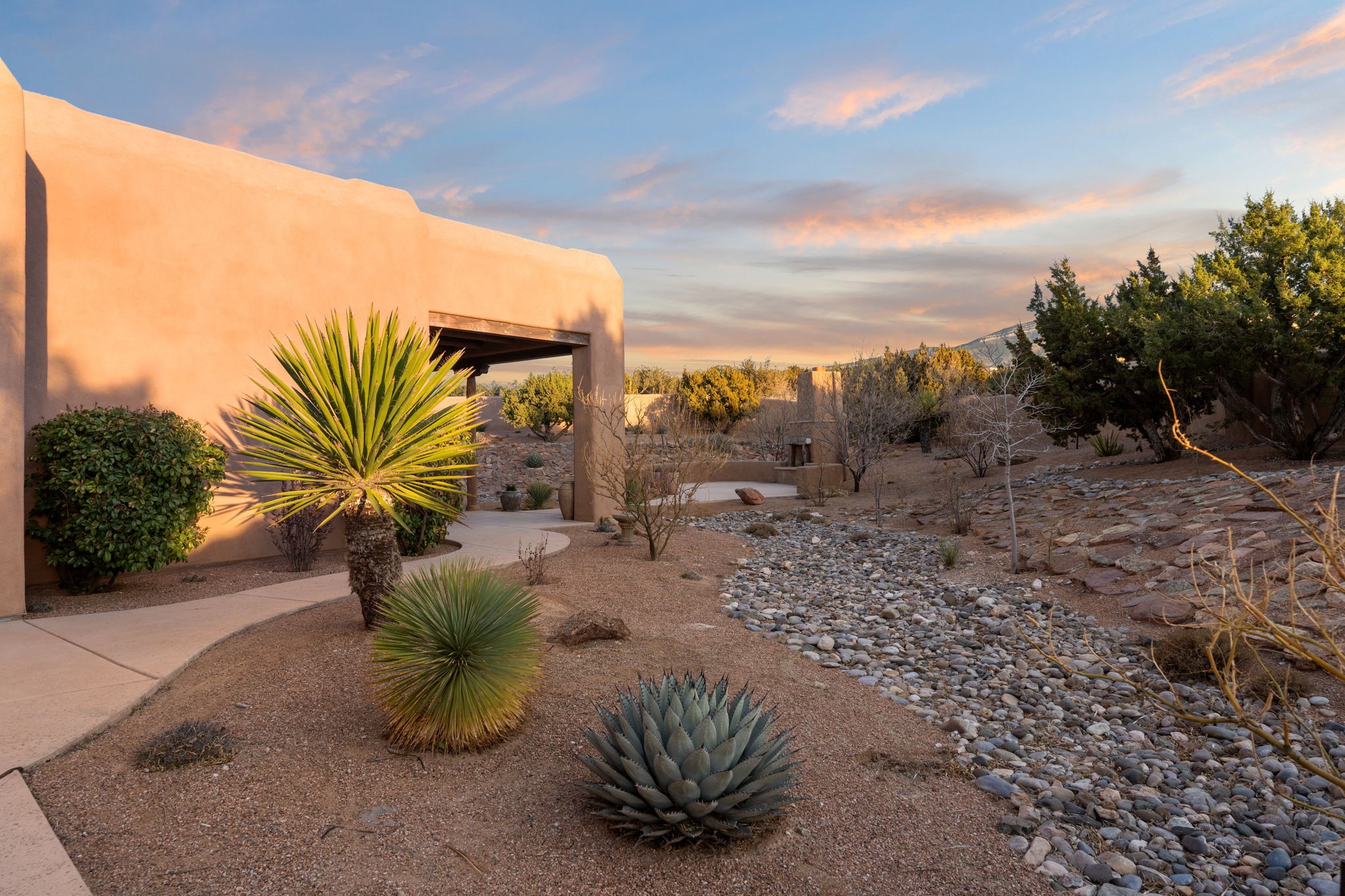 Discover this unique custom-built home in picturesque Placitas, offering stunning views of the Sandia Mountains from an elevated .95-acre cul-de-sac lot, just 1.4 miles from I-25. Enjoy the tranquility of this serene retreat without sacrificing convenience. This traditional New Mexico-style single-level home spans 2,964 square feet, featuring natural stone tiled floors, raised wood beamed and plank ceilings, and a blend of Southwest charm and contemporary elegance. The main living area includes natural gas fireplaces, while the chef's kitchen boasts granite counters, custom cabinetry, and premium appliances. A versatile 17 x 22 flex room offers space for various activities. Retreat to the primary suite with a spacious walk-in closet and spa-like bathroom boasting dual vanities and a fully tiled walk-in shower. Two additional bedrooms, a full bath, and a powder room provide comfort for family or guests. The oversized 1,351 square foot 4-car garage features a porcelain tile floor, mini-split heating and cooling, and ample storage--ideal for car enthusiasts or hobbyists. Outside, the fully landscaped lot features an extensive irrigation system, a charming front courtyard with a fountain, and a southeast-facing backyard with walkways and an outdoor kitchen complete with a premium grill. Gather around the masonry fireplace to enjoy beautiful sunsets and starry nights. This exceptional property combines premium features with thoughtful details that must be seen to be appreciated. Don't miss the chance to make this extraordinary home your own in Placitas!