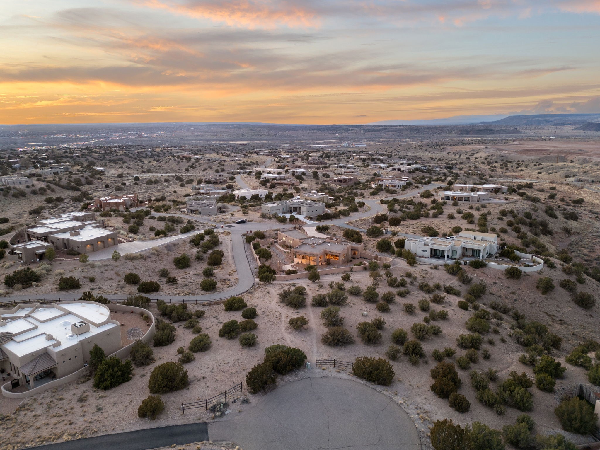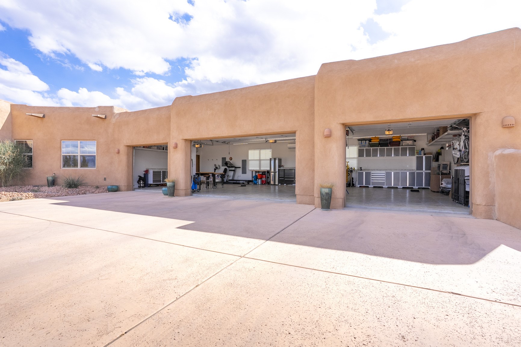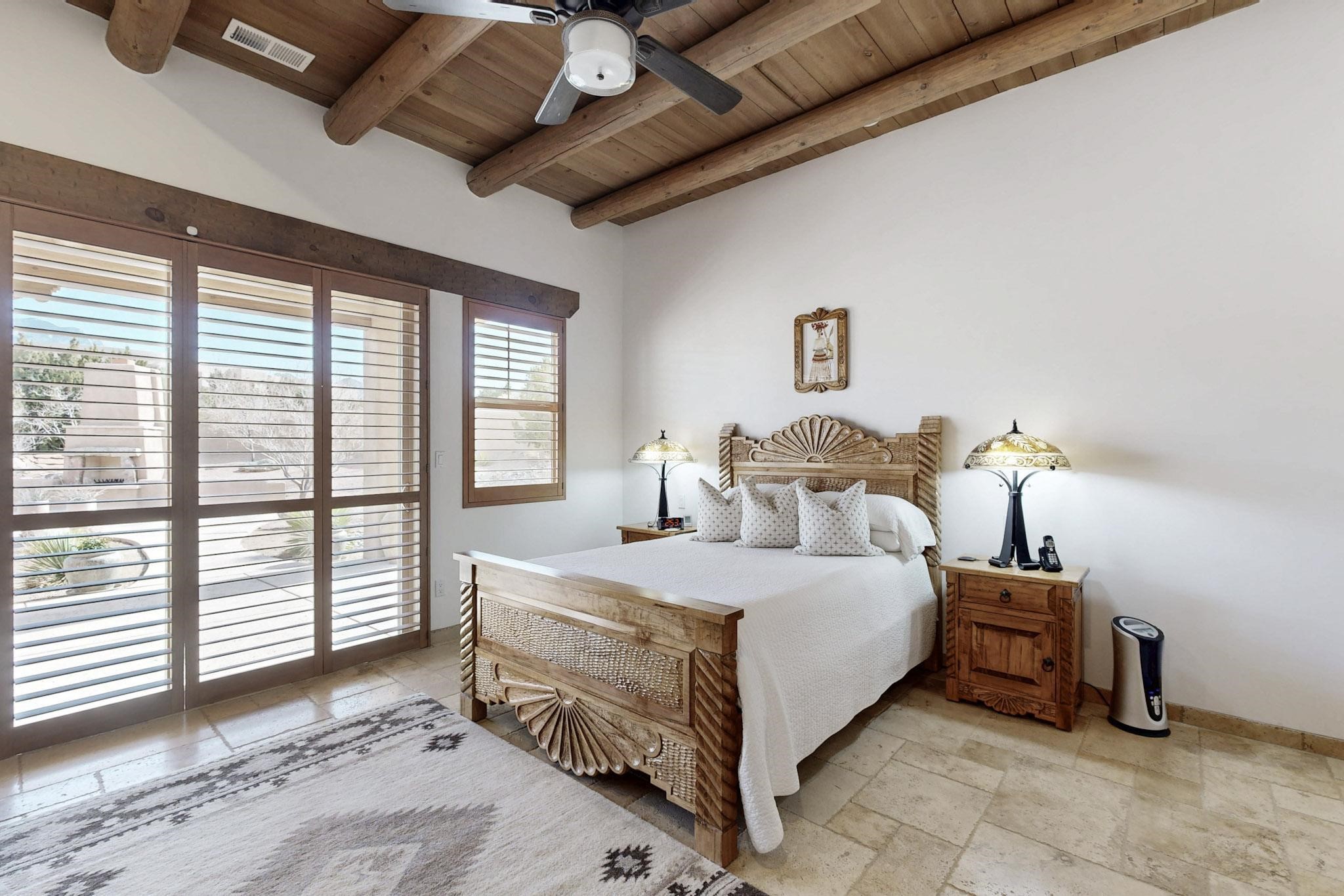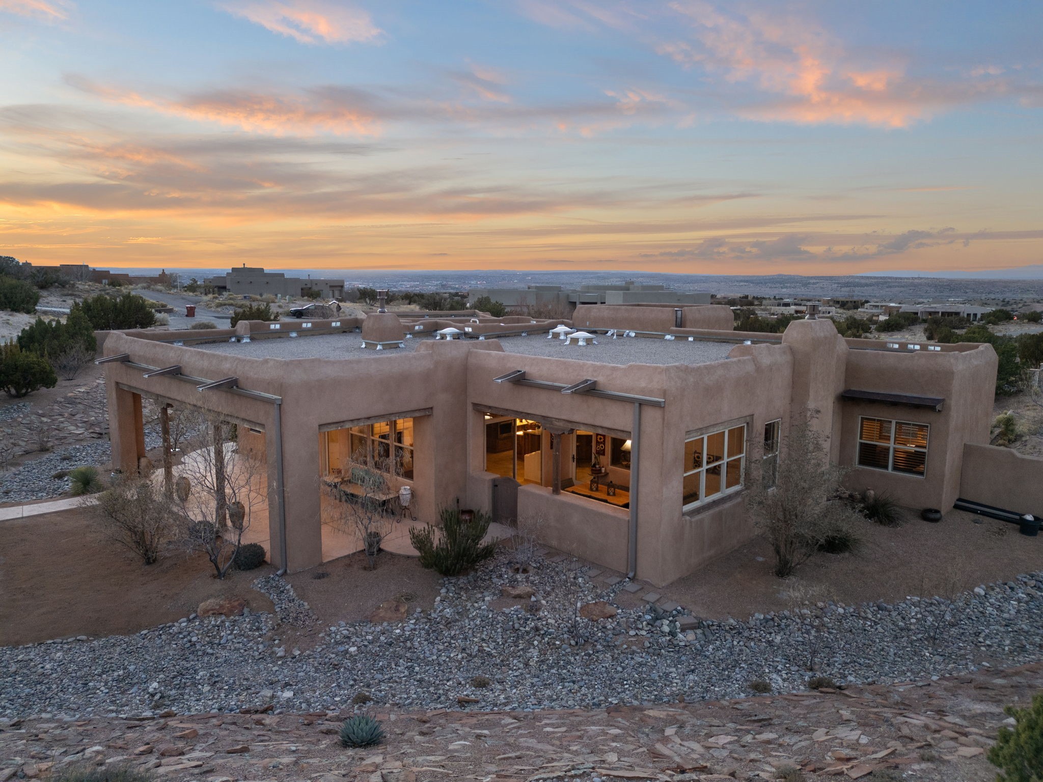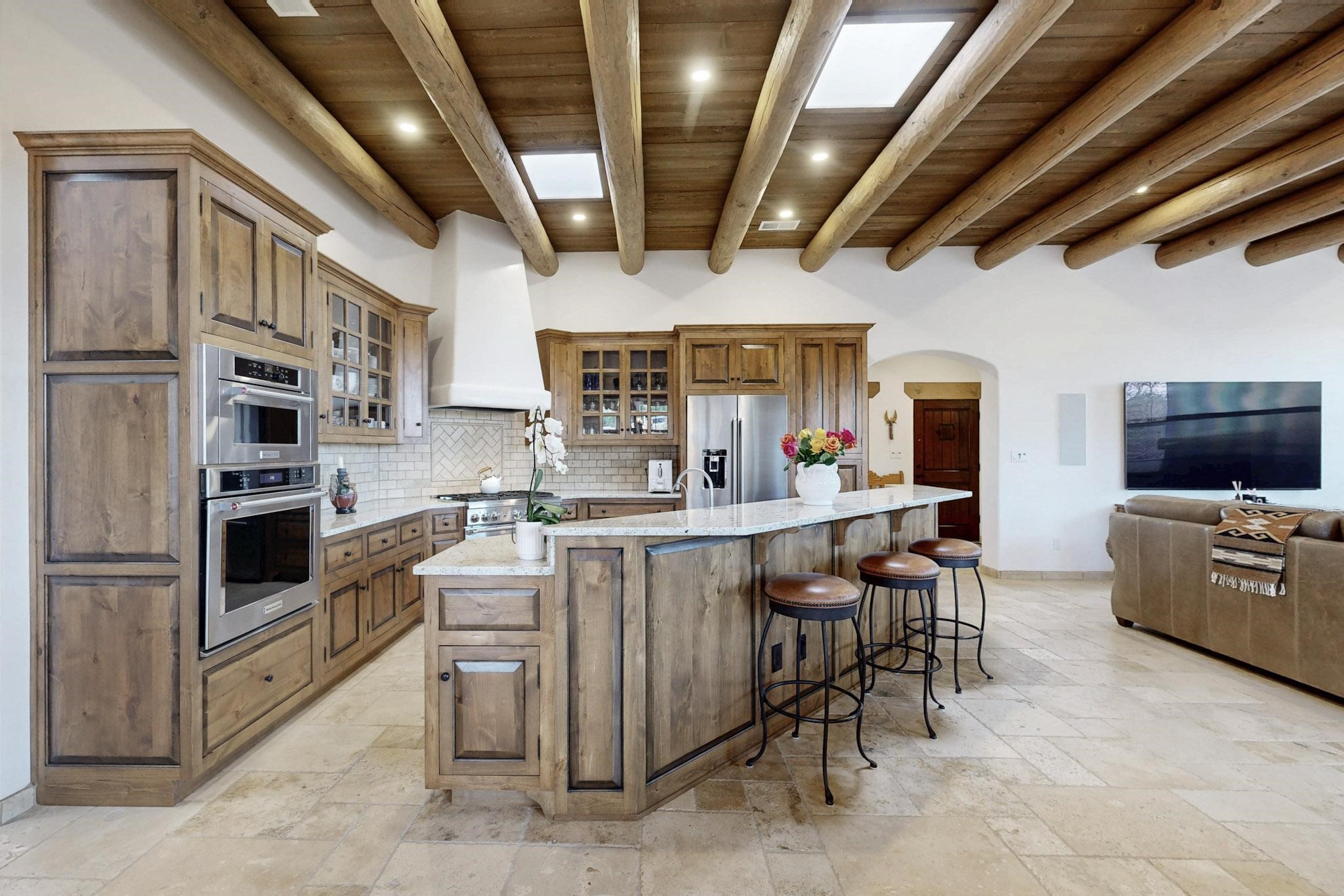 Discover this unique custom-built home in picturesque Placitas, offering stunning views of the Sandia Mountains from an elevated .95-acre cul-de-sac lot, just 1.4 miles from I-25. Enjoy the tranquility of this serene retreat without sacrificing convenience. This traditional New Mexico-style single-level home spans 2,964 square feet, featuring natural stone tiled floors, raised wood beamed and plank ceilings, and a blend of Southwest charm and contemporary elegance. The main living area includes natural gas fireplaces, while the chef's kitchen boasts granite counters, custom cabinetry, and premium appliances. A versatile 17 x 22 flex room offers space for various activities. Retreat to the primary suite with a spacious walk-in closet and spa-like bathroom boasting dual vanities and a fully tiled walk-in shower. Two additional bedrooms, a full bath, and a powder room provide comfort for family or guests. The oversized 1,351 square foot 4-car garage features a porcelain tile floor, mini-split heating and cooling, and ample storage--ideal for car enthusiasts or hobbyists. Outside, the fully landscaped lot features an extensive irrigation system, a charming front courtyard with a fountain, and a southeast-facing backyard with walkways and an outdoor kitchen complete with a premium grill. Gather around the masonry fireplace to enjoy beautiful sunsets and starry nights. This exceptional property combines premium features with thoughtful details that must be seen to be appreciated. Don't miss the chance to make this extraordinary home your own in Placitas!
