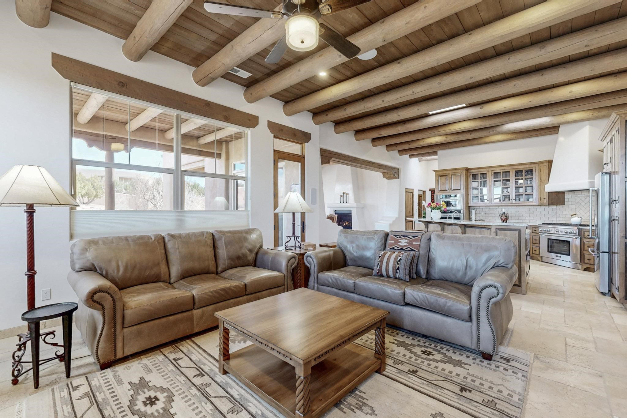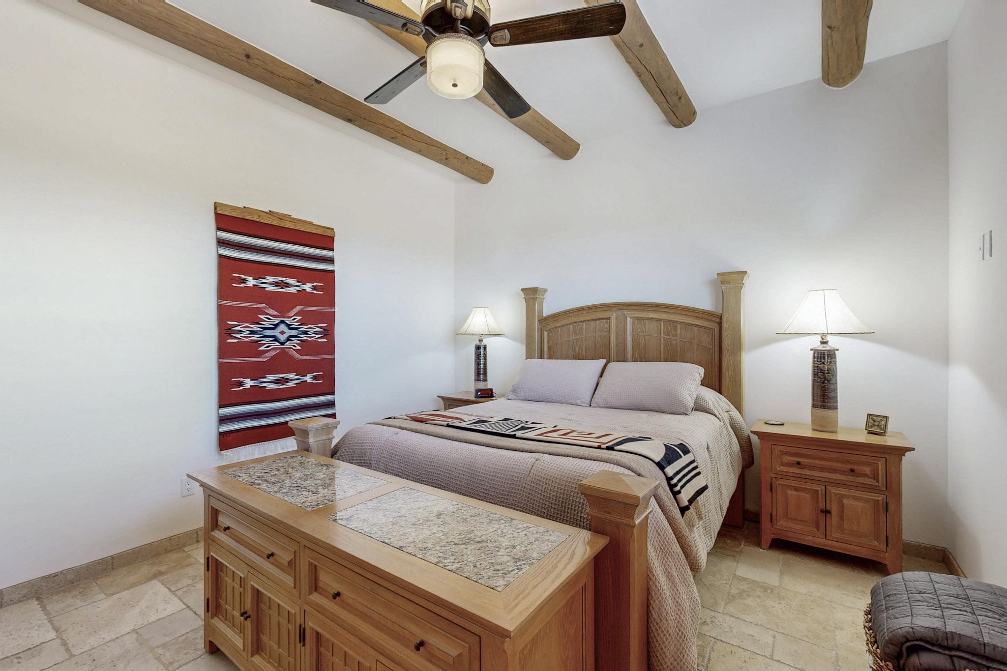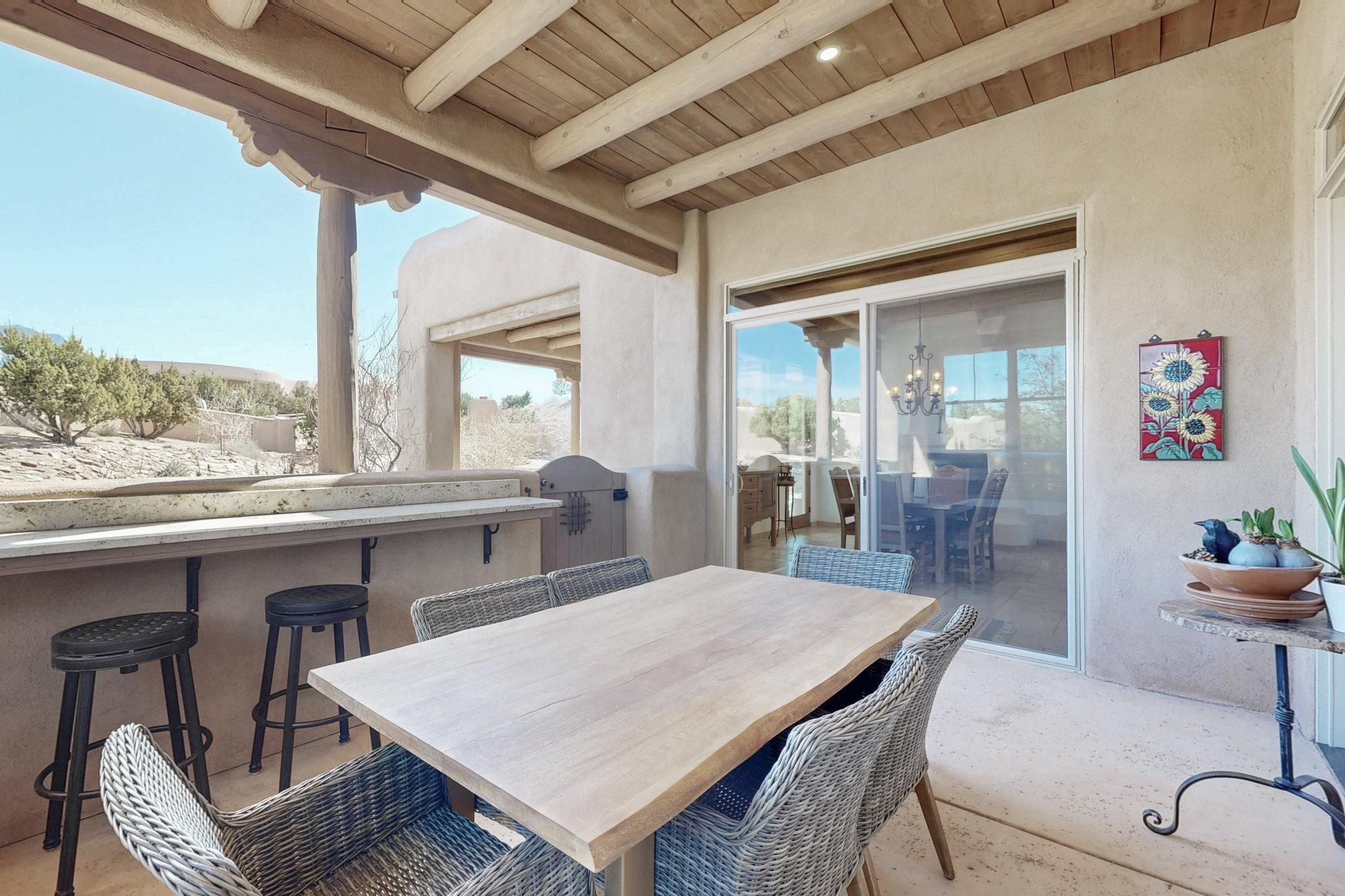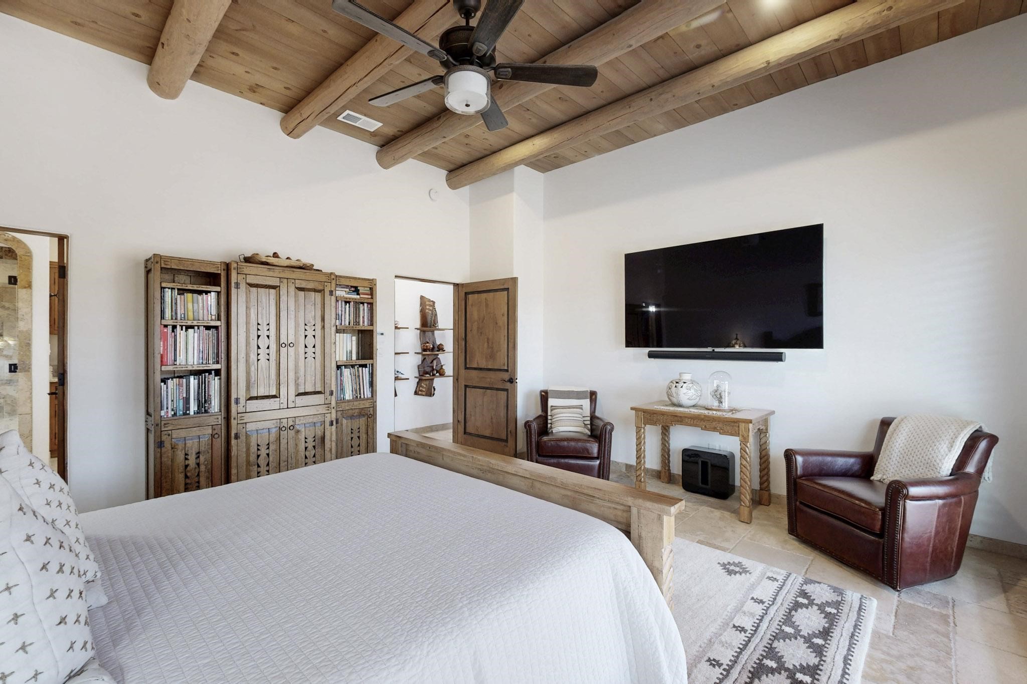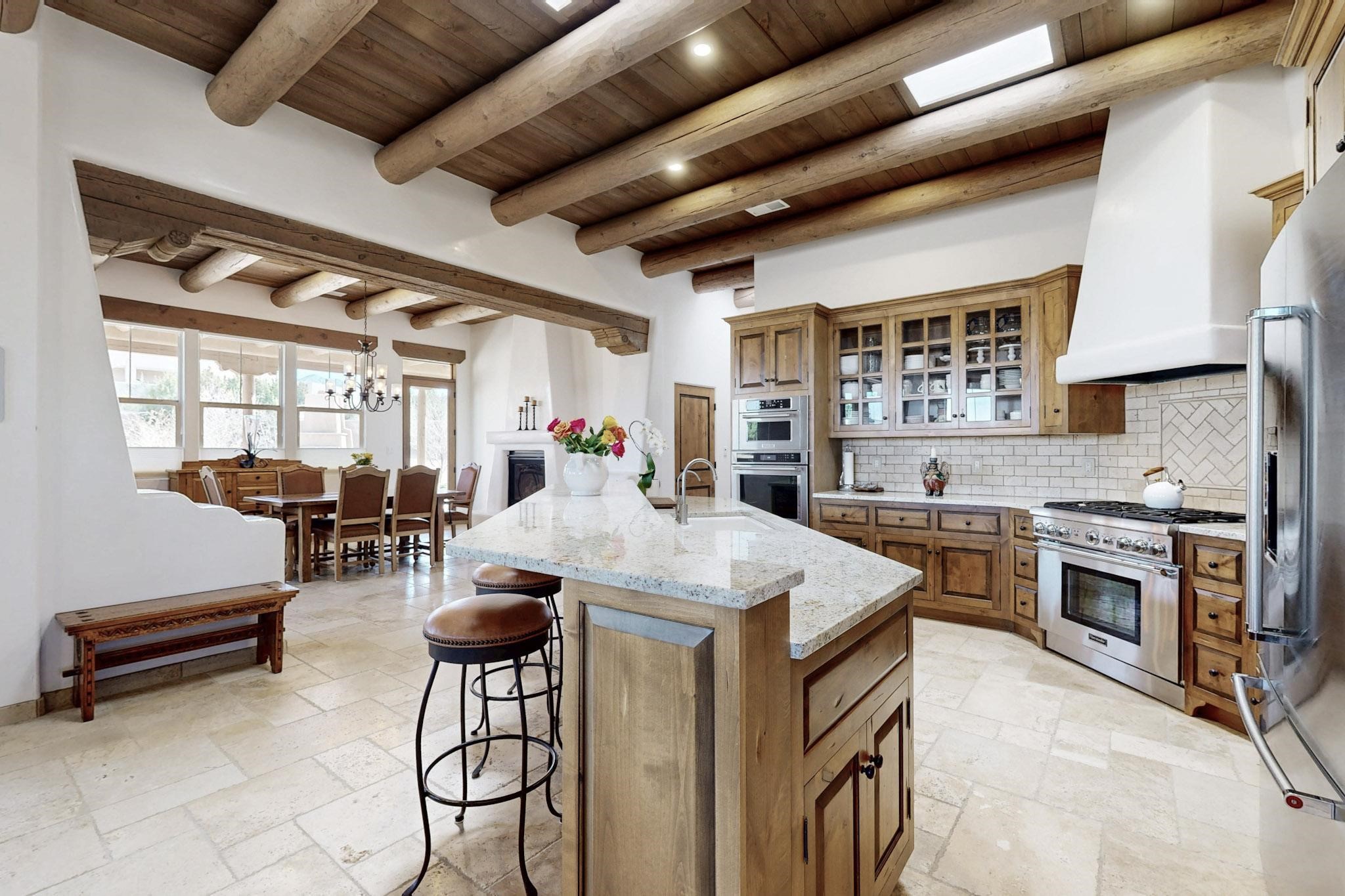 Discover this unique custom-built home in picturesque Placitas, offering stunning views of the Sandia Mountains from an elevated .95-acre cul-de-sac lot, just 1.4 miles from I-25. Enjoy the tranquility of this serene retreat without sacrificing convenience. This traditional New Mexico-style single-level home spans 2,964 square feet, featuring natural stone tiled floors, raised wood beamed and plank ceilings, and a blend of Southwest charm and contemporary elegance. The main living area includes natural gas fireplaces, while the chef's kitchen boasts granite counters, custom cabinetry, and premium appliances. A versatile 17 x 22 flex room offers space for various activities. Retreat to the primary suite with a spacious walk-in closet and spa-like bathroom boasting dual vanities and a fully tiled walk-in shower. Two additional bedrooms, a full bath, and a powder room provide comfort for family or guests. The oversized 1,351 square foot 4-car garage features a porcelain tile floor, mini-split heating and cooling, and ample storage--ideal for car enthusiasts or hobbyists. Outside, the fully landscaped lot features an extensive irrigation system, a charming front courtyard with a fountain, and a southeast-facing backyard with walkways and an outdoor kitchen complete with a premium grill. Gather around the masonry fireplace to enjoy beautiful sunsets and starry nights. This exceptional property combines premium features with thoughtful details that must be seen to be appreciated. Don't miss the chance to make this extraordinary home your own in Placitas!