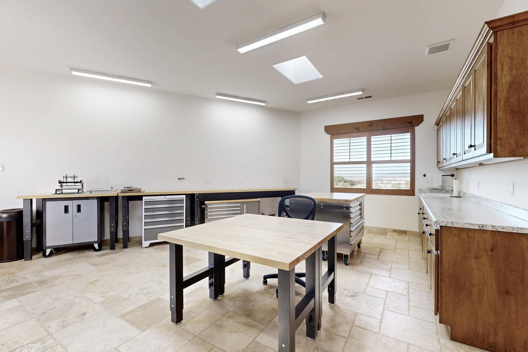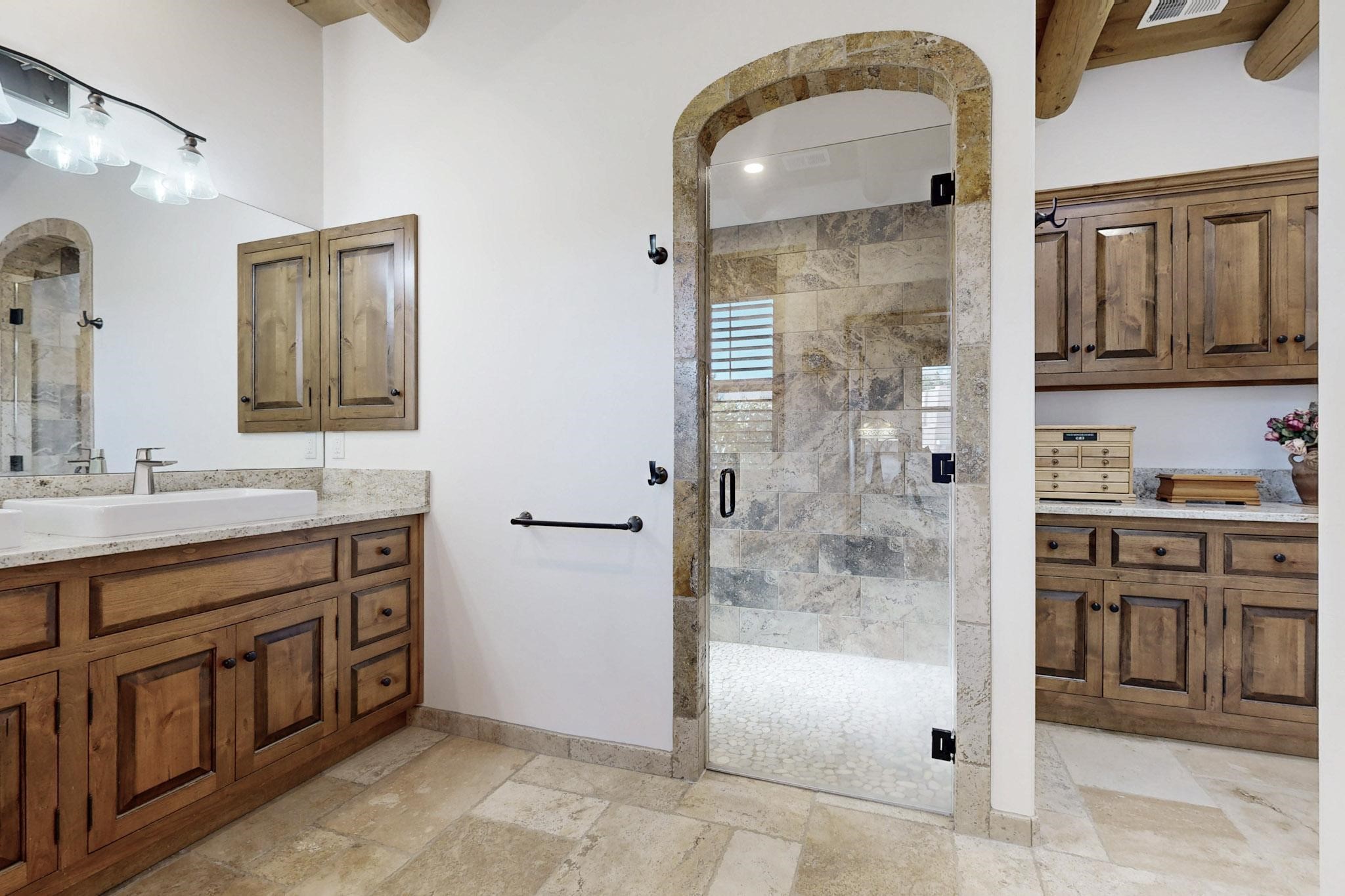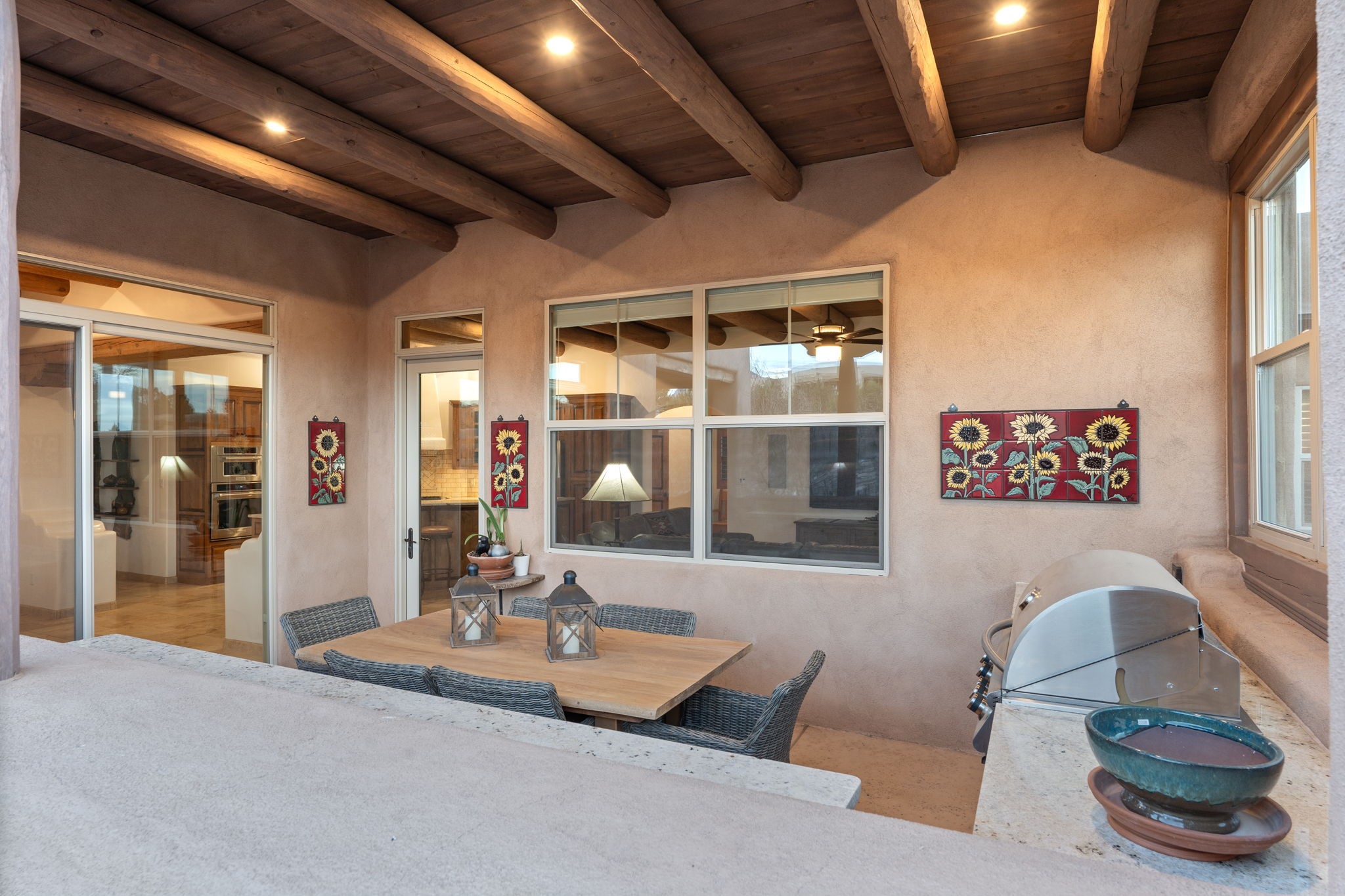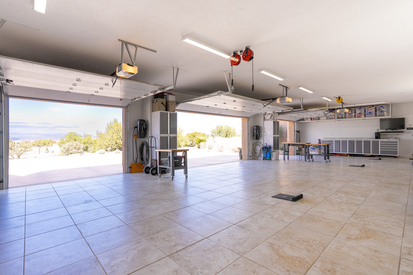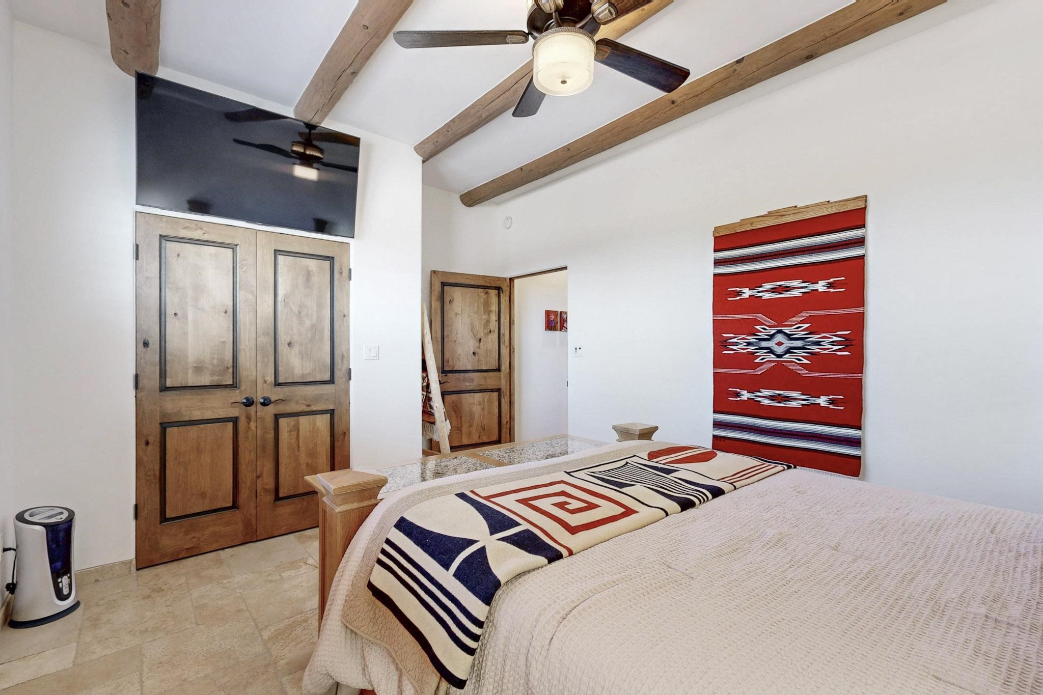 Discover this unique custom-built home in picturesque Placitas, offering stunning views of the Sandia Mountains from an elevated .95-acre cul-de-sac lot, just 1.4 miles from I-25. Enjoy the tranquility of this serene retreat without sacrificing convenience. This traditional New Mexico-style single-level home spans 2,964 square feet, featuring natural stone tiled floors, raised wood beamed and plank ceilings, and a blend of Southwest charm and contemporary elegance. The main living area includes natural gas fireplaces, while the chef's kitchen boasts granite counters, custom cabinetry, and premium appliances. A versatile 17 x 22 flex room offers space for various activities. Retreat to the primary suite with a spacious walk-in closet and spa-like bathroom boasting dual vanities and a fully tiled walk-in shower. Two additional bedrooms, a full bath, and a powder room provide comfort for family or guests. The oversized 1,351 square foot 4-car garage features a porcelain tile floor, mini-split heating and cooling, and ample storage--ideal for car enthusiasts or hobbyists. Outside, the fully landscaped lot features an extensive irrigation system, a charming front courtyard with a fountain, and a southeast-facing backyard with walkways and an outdoor kitchen complete with a premium grill. Gather around the masonry fireplace to enjoy beautiful sunsets and starry nights. This exceptional property combines premium features with thoughtful details that must be seen to be appreciated. Don't miss the chance to make this extraordinary home your own in Placitas!