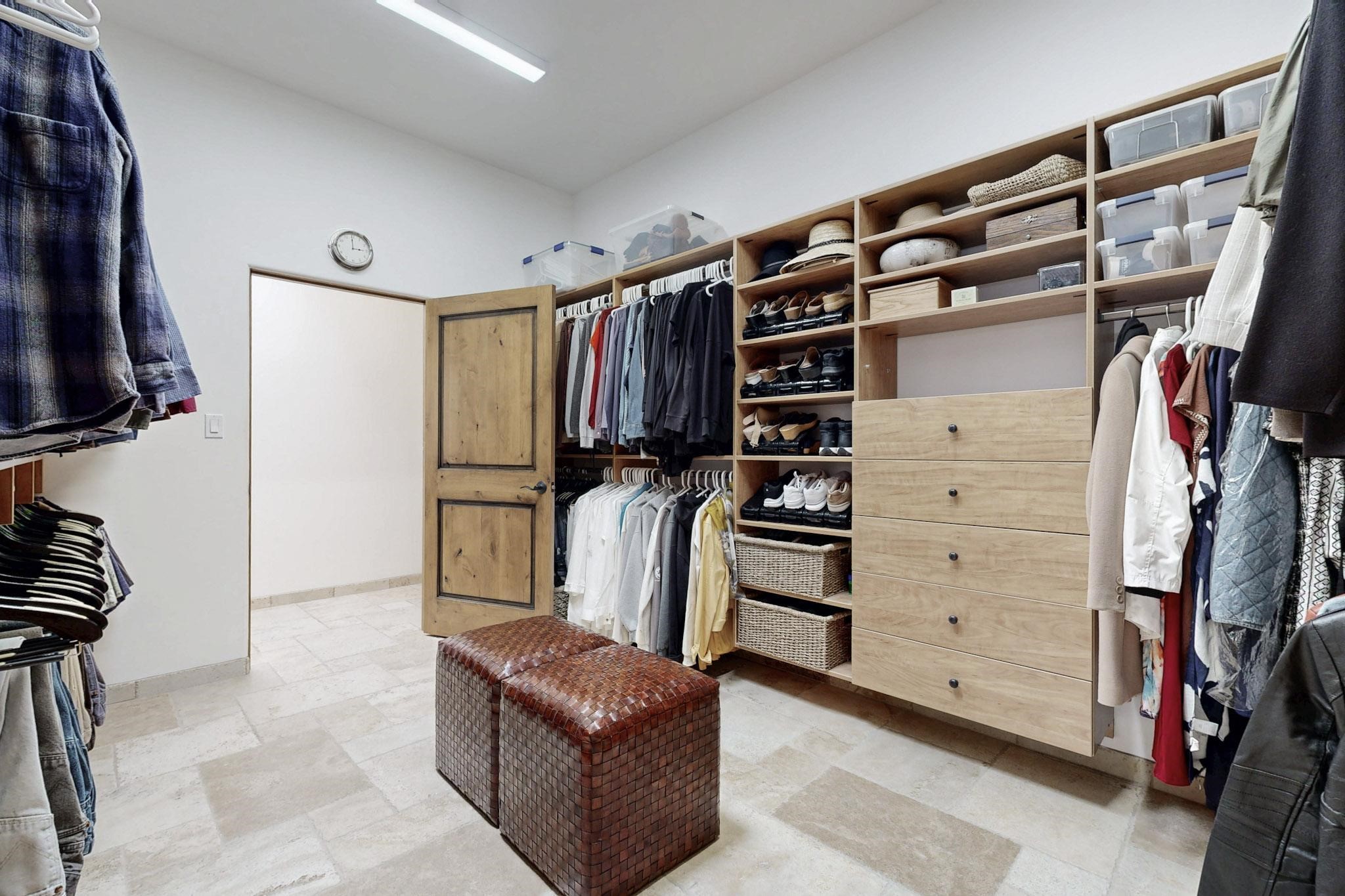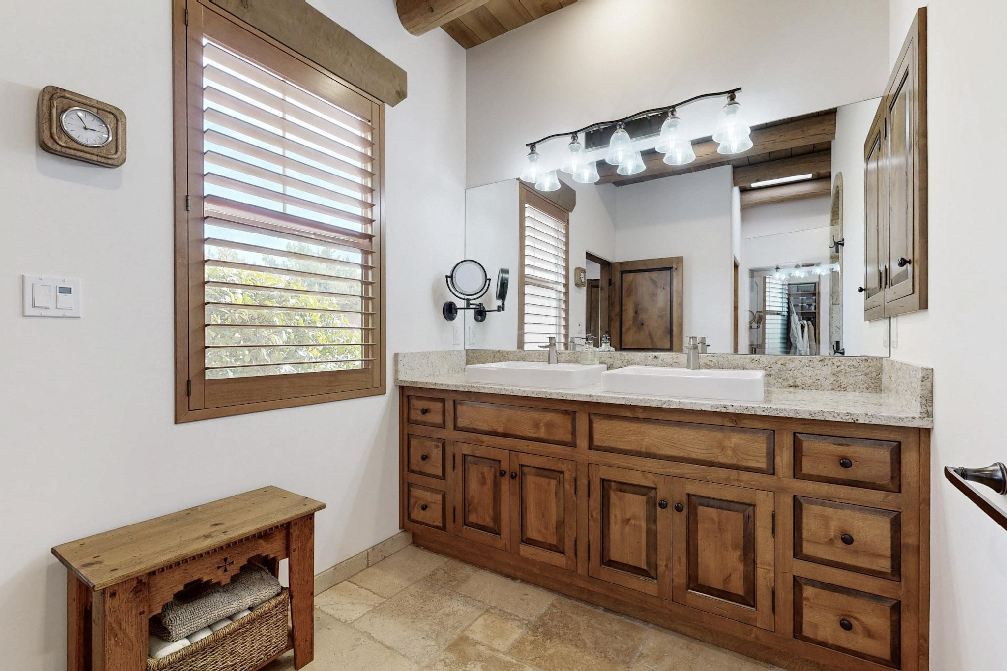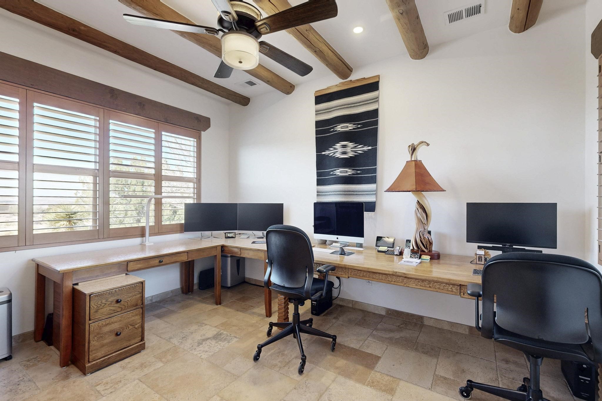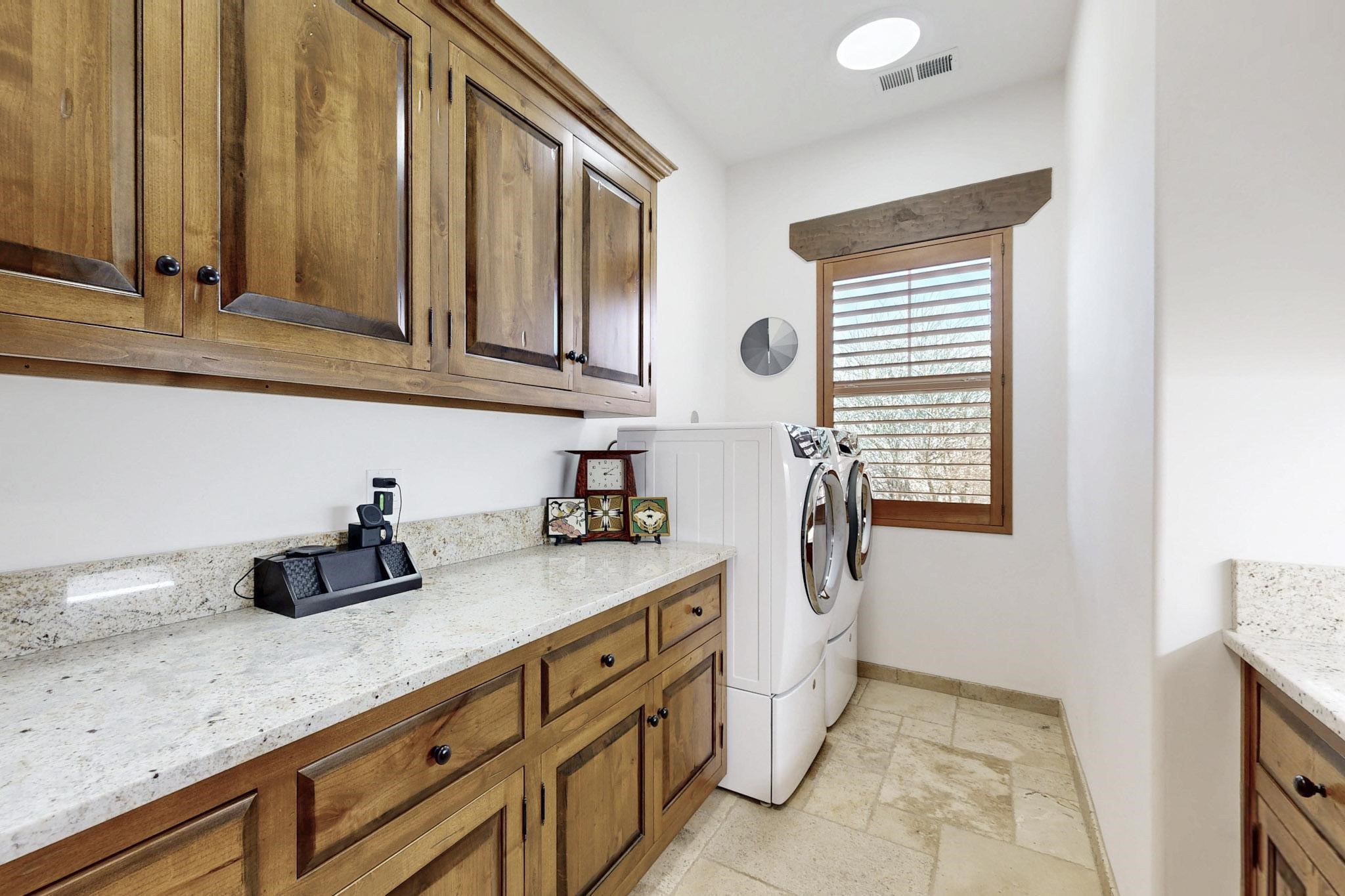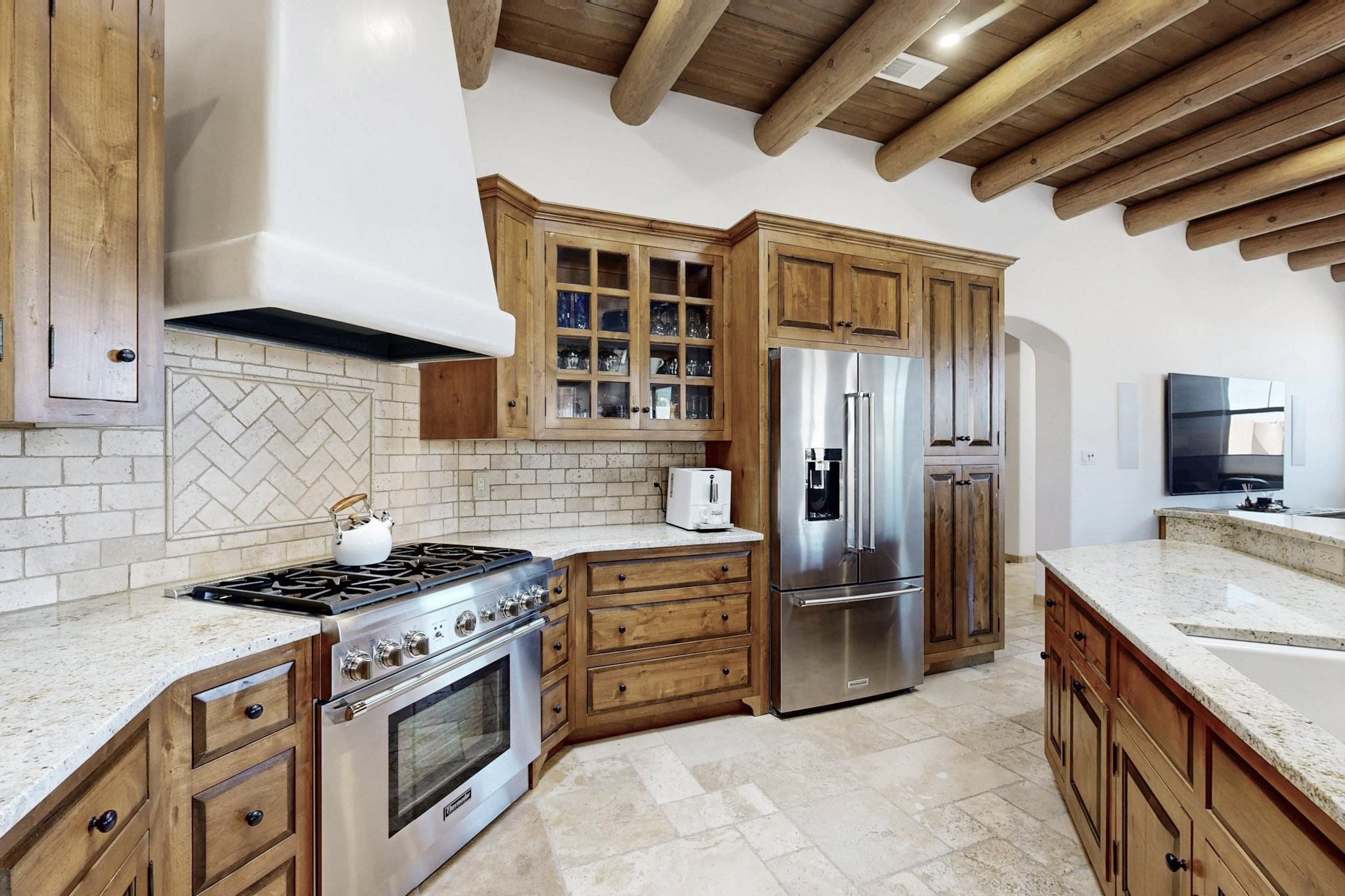 Discover this unique custom-built home in picturesque Placitas, offering stunning views of the Sandia Mountains from an elevated .95-acre cul-de-sac lot, just 1.4 miles from I-25. Enjoy the tranquility of this serene retreat without sacrificing convenience. This traditional New Mexico-style single-level home spans 2,964 square feet, featuring natural stone tiled floors, raised wood beamed and plank ceilings, and a blend of Southwest charm and contemporary elegance. The main living area includes natural gas fireplaces, while the chef's kitchen boasts granite counters, custom cabinetry, and premium appliances. A versatile 17 x 22 flex room offers space for various activities. Retreat to the primary suite with a spacious walk-in closet and spa-like bathroom boasting dual vanities and a fully tiled walk-in shower. Two additional bedrooms, a full bath, and a powder room provide comfort for family or guests. The oversized 1,351 square foot 4-car garage features a porcelain tile floor, mini-split heating and cooling, and ample storage--ideal for car enthusiasts or hobbyists. Outside, the fully landscaped lot features an extensive irrigation system, a charming front courtyard with a fountain, and a southeast-facing backyard with walkways and an outdoor kitchen complete with a premium grill. Gather around the masonry fireplace to enjoy beautiful sunsets and starry nights. This exceptional property combines premium features with thoughtful details that must be seen to be appreciated. Don't miss the chance to make this extraordinary home your own in Placitas!
