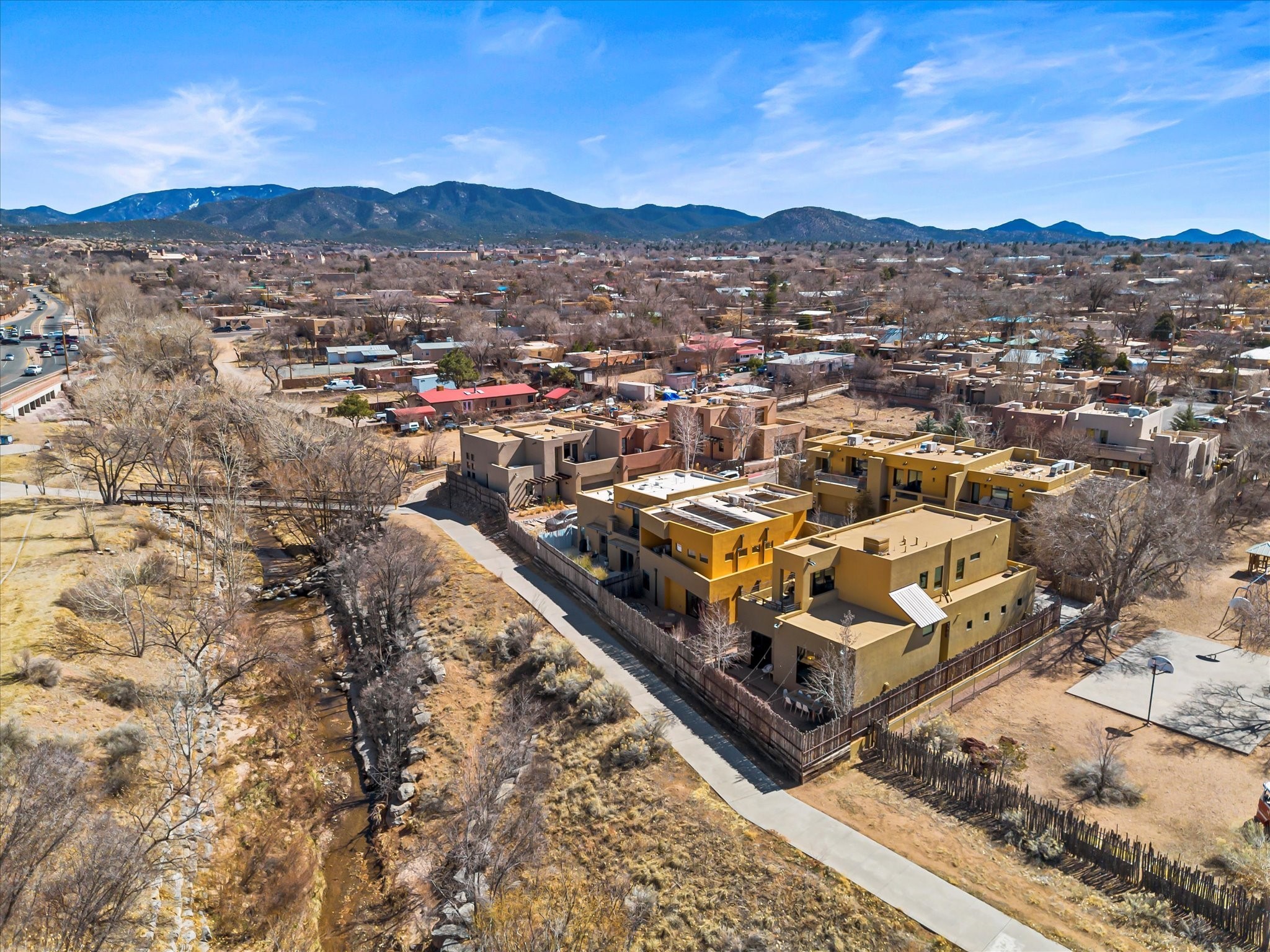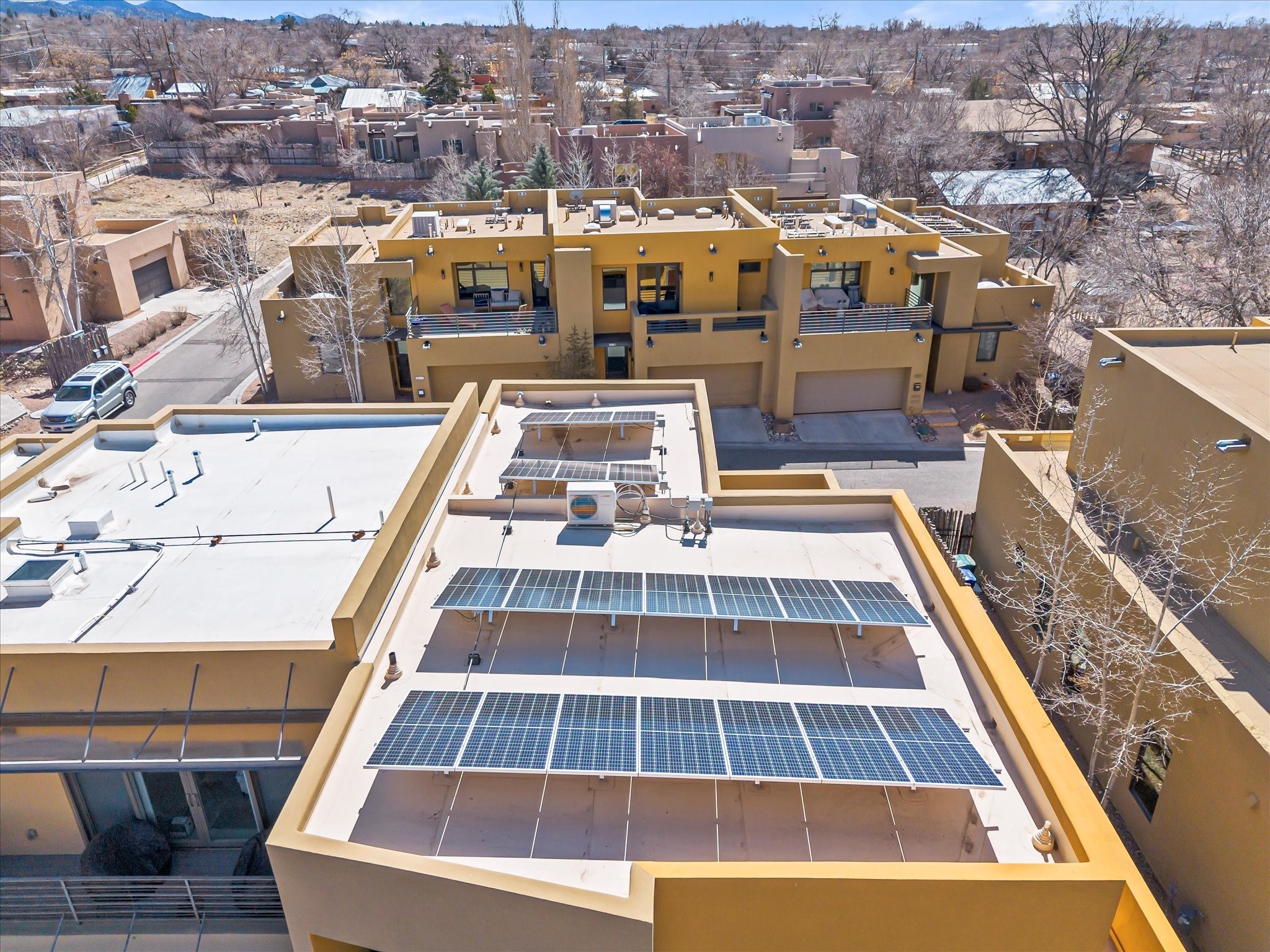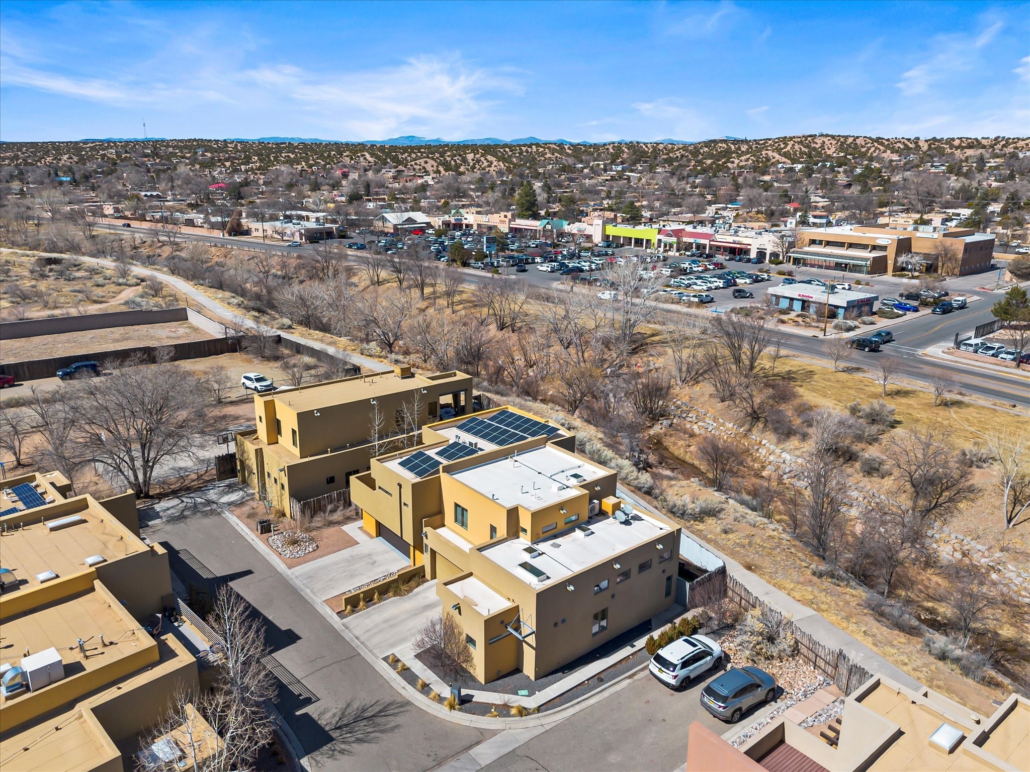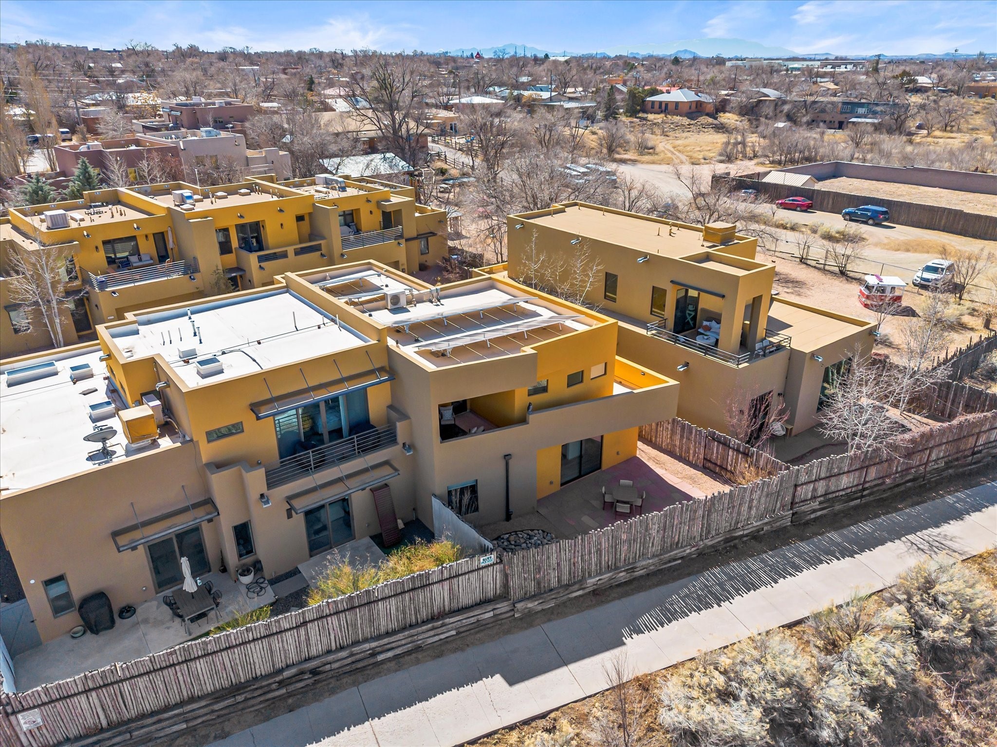 Experience exceptional Santa Fe living in this beautiful, Active Solar, contemporary condominium designed by the current owner. This all Electric, Energy Positive home boasts an Emerald Green NM Certification, Reverse Osmosis water system, new 50 AMP Electric car charger, Radiant Floor Heat (including the garage), Mitsubishi Mini splits and EnergyStar Bosch Kitchen appliances. Top of the line TPO roof with a traction layer covers the wrap-around outdoor deck where you can relax and enjoy views of the Sangre de Cristo mountains. Located in the no-outlet, highly desirable Rio Sendero Complex and nestled up against the Santa Fe River Walk Trail. The River Walk Trail accesses Downtown (1.2 miles); closely connected to two of Santa Fe's most valued areas: The Santa Fe Railyard Area with its restaurants and galleries, and the vibrant, ever-popular Santa Fe Farmers Market (1.1 miles) or go west to enjoy miles of open connected trails. For daily needs, across the street, are restaurants, groceries and a new gastro-pub. At home, the open-plan kitchen and living areas have beautiful soaring ceilings and access to a lovely ground floor rear patio. A downstairs bedroom could double as an office and the primary upstairs bedroom feels separate and cozy with its en suite bath. Low water landscape on drip irrigation. Less than five years old, this home is truly one of a kind and will garner much interest. Must see!The County Assessor shows Square footage at 1231 which differs from the builder's plans. Neither Listing Broker or Seller warrant the square footage of the lot or building. If the size of the home or lot is of material consideration to the Buyer, then the Buyer should have them measured.