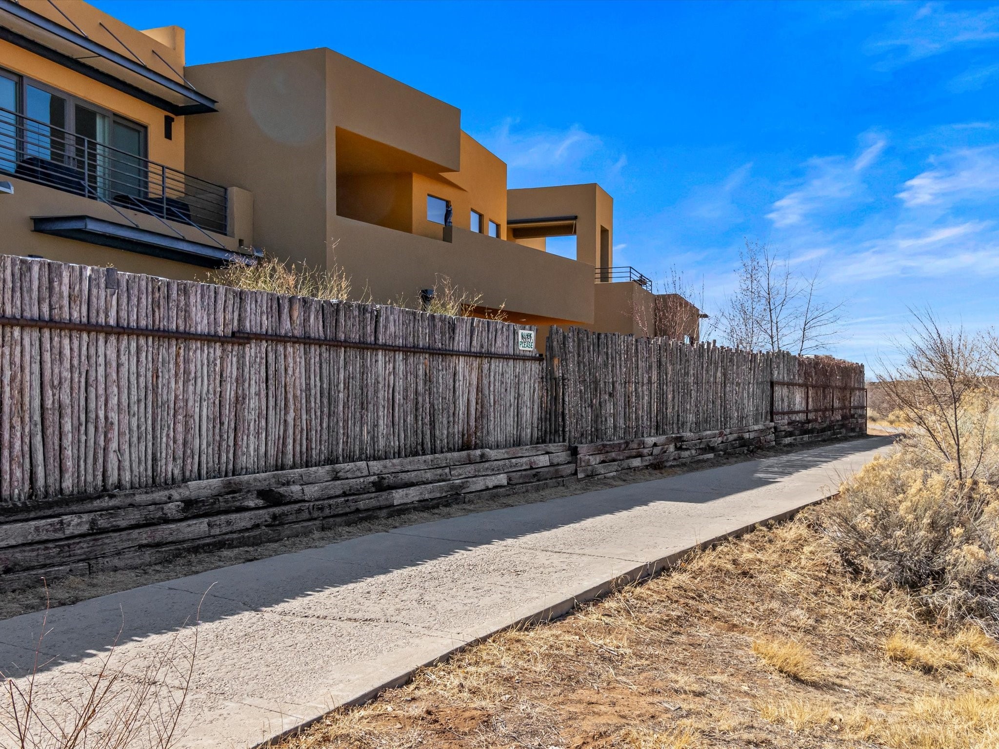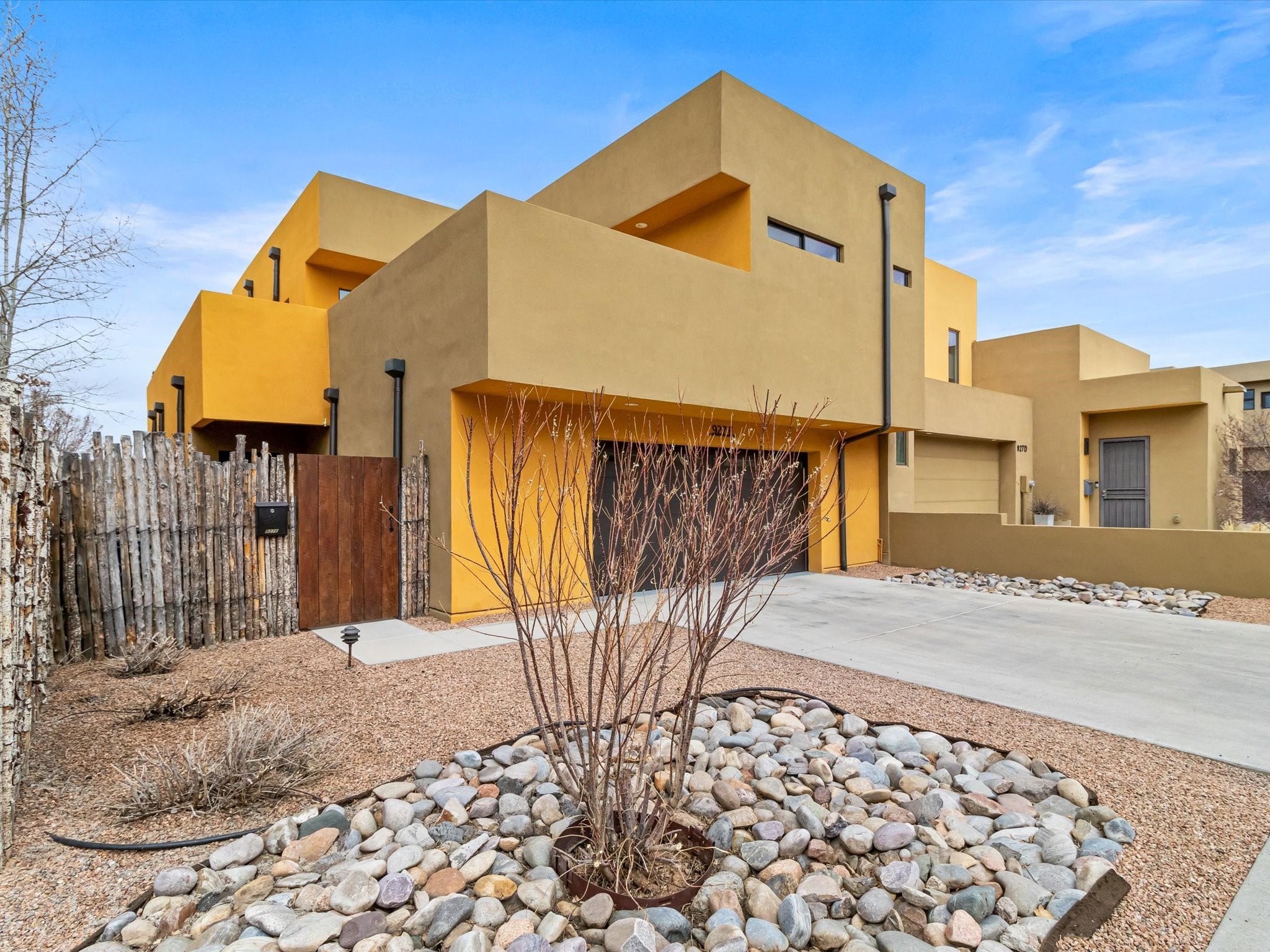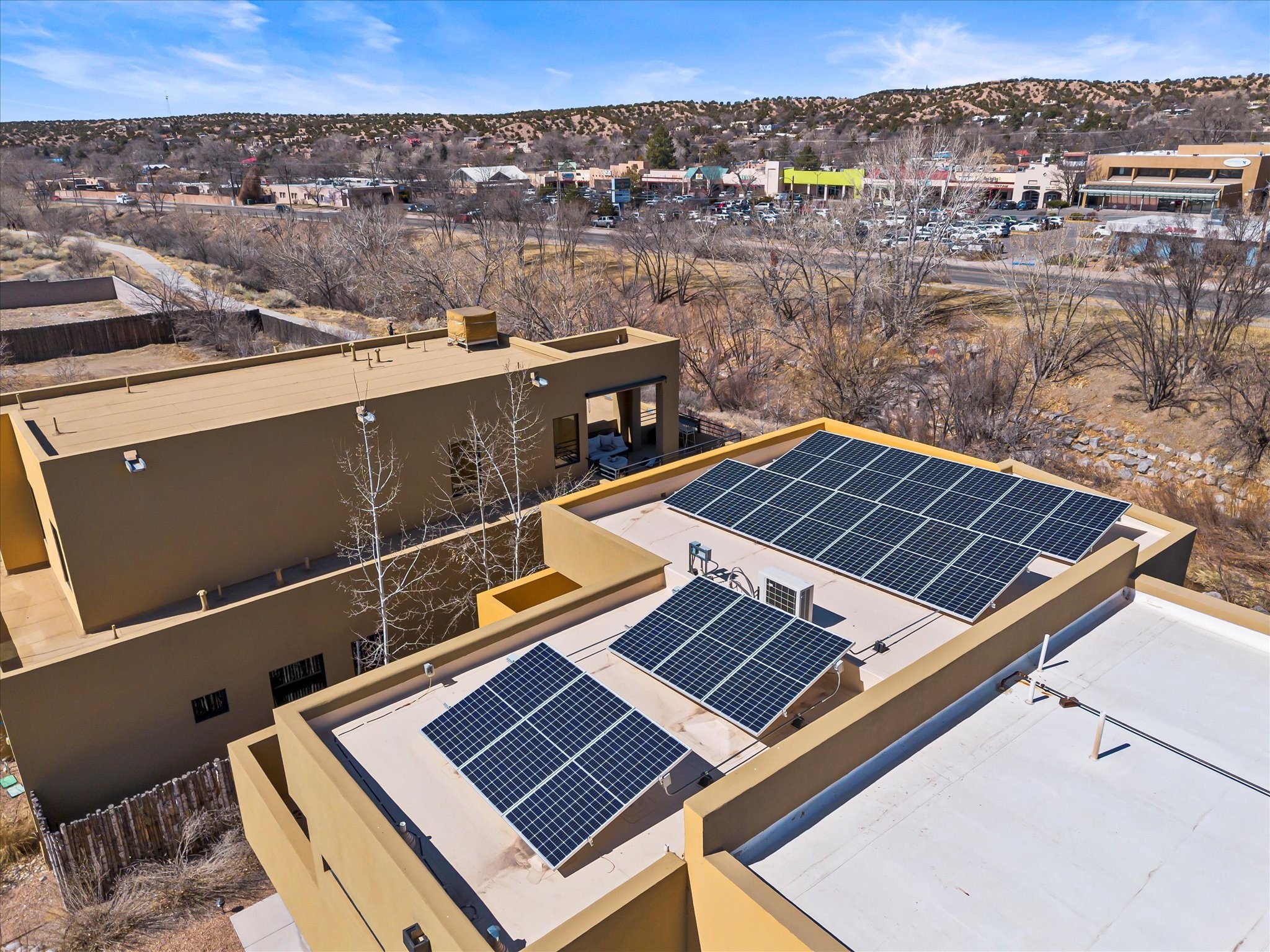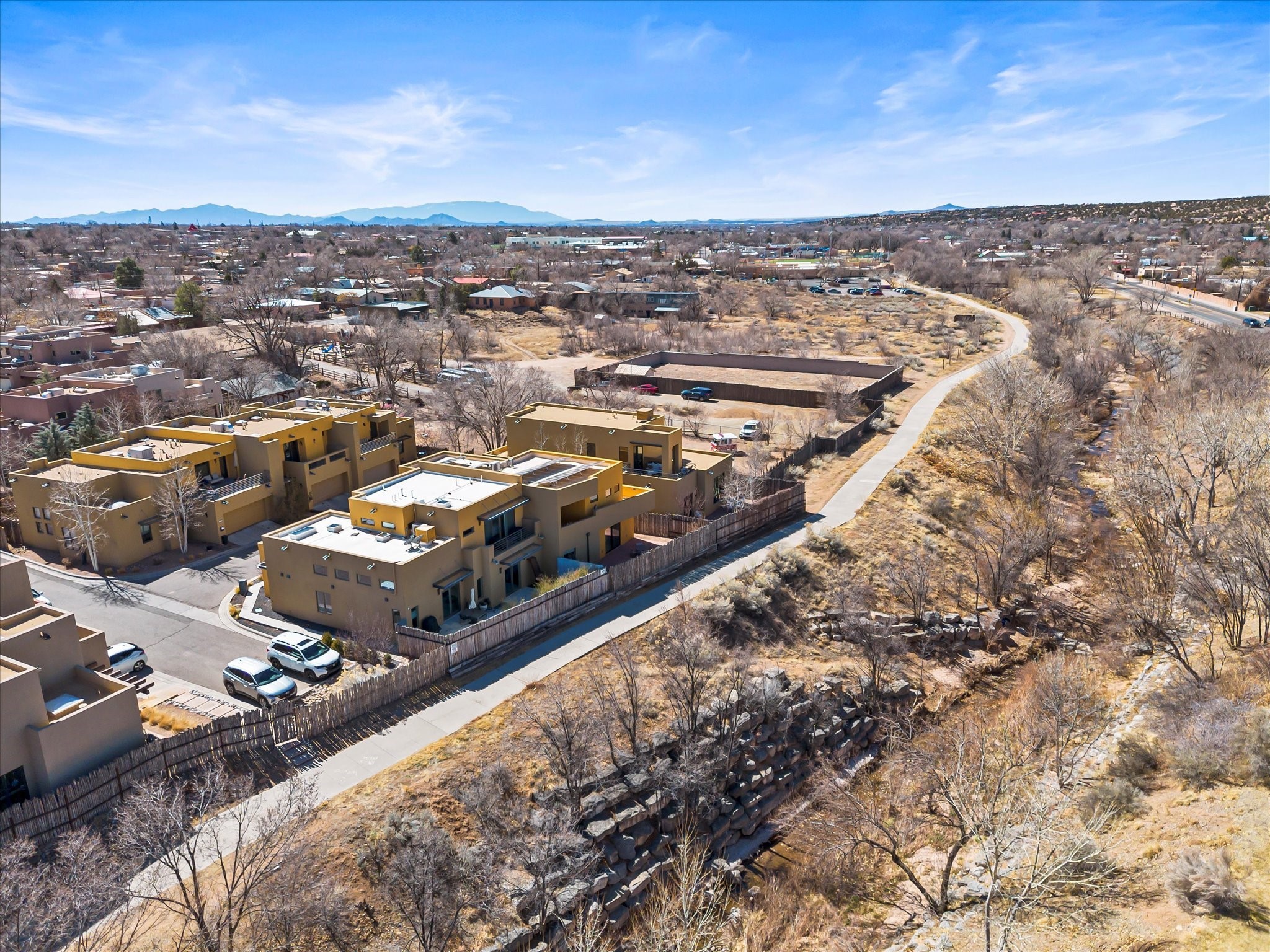Experience exceptional Santa Fe living in this beautiful, Active Solar, contemporary condominium designed by the current owner. This all Electric, Energy Positive home boasts an Emerald Green NM Certification, Reverse Osmosis water system, new 50 AMP Electric car charger, Radiant Floor Heat (including the garage), Mitsubishi Mini splits and EnergyStar Bosch Kitchen appliances. Top of the line TPO roof with a traction layer covers the wrap-around outdoor deck where you can relax and enjoy views of the Sangre de Cristo mountains. Located in the no-outlet, highly desirable Rio Sendero Complex and nestled up against the Santa Fe River Walk Trail. The River Walk Trail accesses Downtown (1.2 miles); closely connected to two of Santa Fe's most valued areas: The Santa Fe Railyard Area with its restaurants and galleries, and the vibrant, ever-popular Santa Fe Farmers Market (1.1 miles) or go west to enjoy miles of open connected trails. For daily needs, across the street, are restaurants, groceries and a new gastro-pub. At home, the open-plan kitchen and living areas have beautiful soaring ceilings and access to a lovely ground floor rear patio. A downstairs bedroom could double as an office and the primary upstairs bedroom feels separate and cozy with its en suite bath. Low water landscape on drip irrigation. Less than five years old, this home is truly one of a kind and will garner much interest. Must see!The County Assessor shows Square footage at 1231 which differs from the builder's plans. Neither Listing Broker or Seller warrant the square footage of the lot or building. If the size of the home or lot is of material consideration to the Buyer, then the Buyer should have them measured.