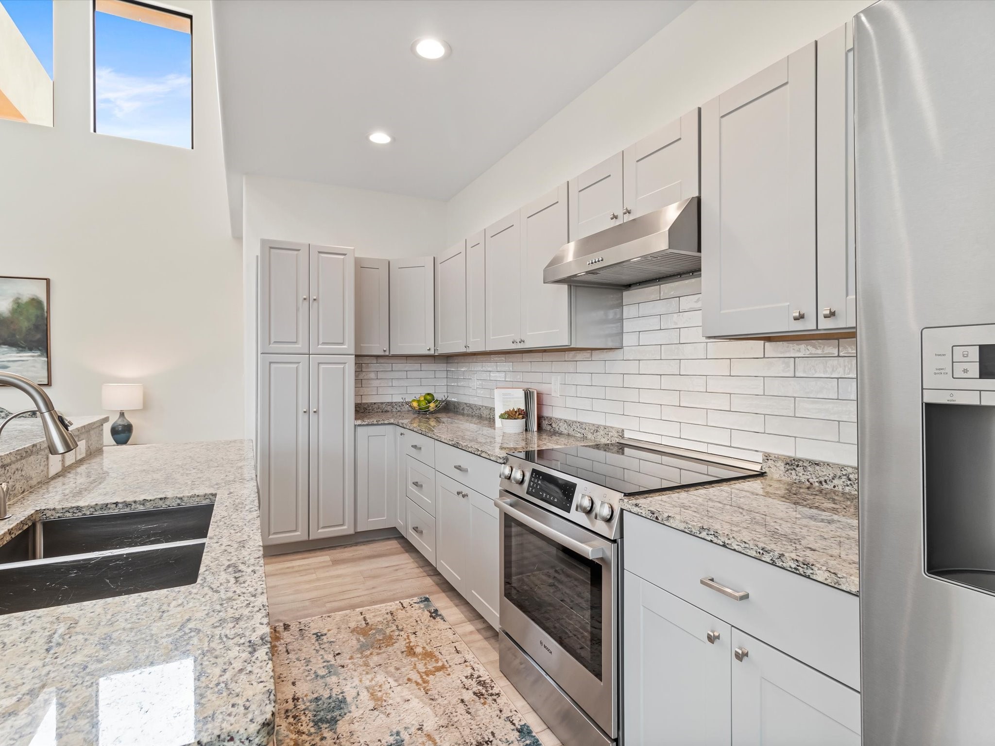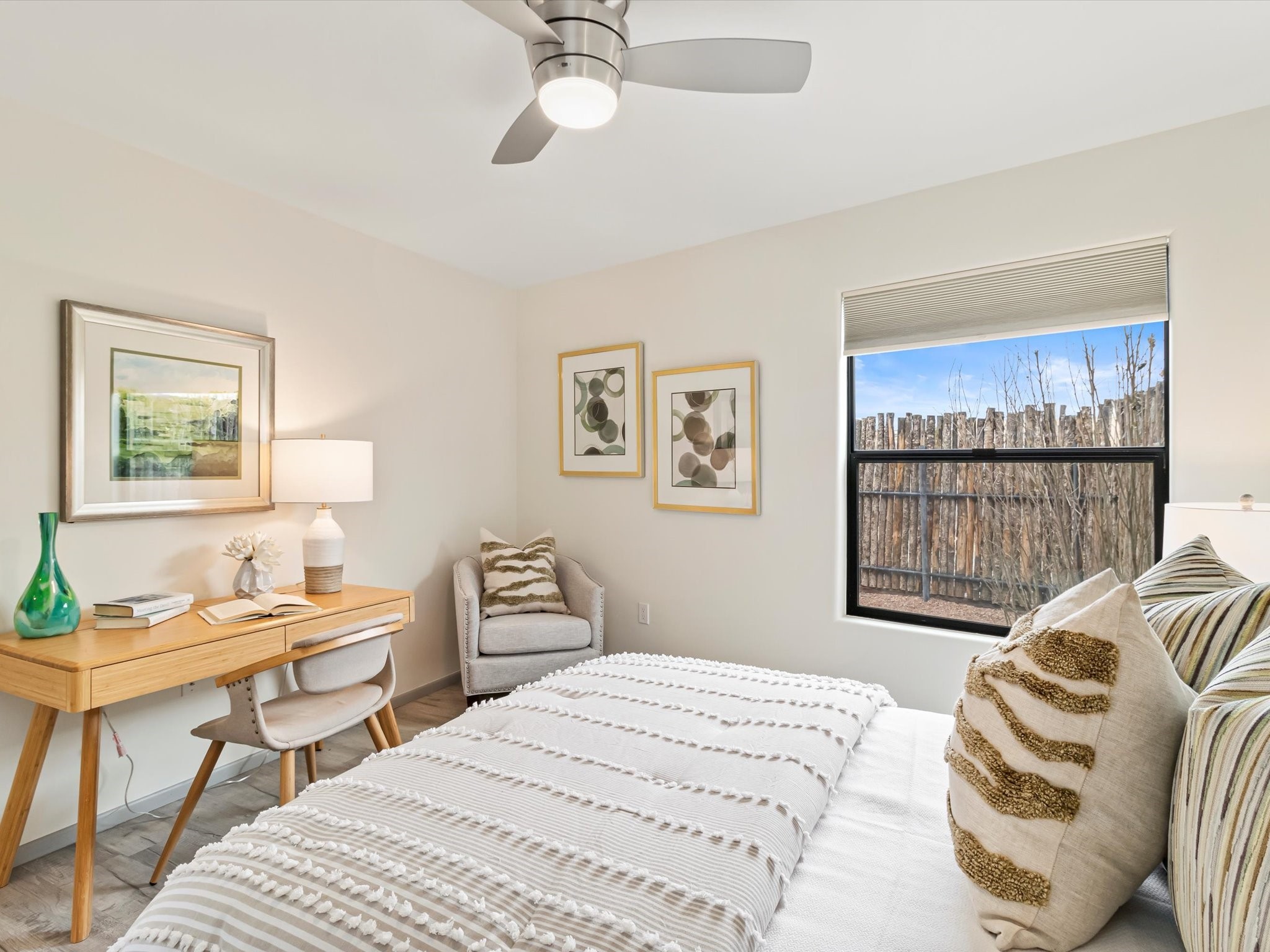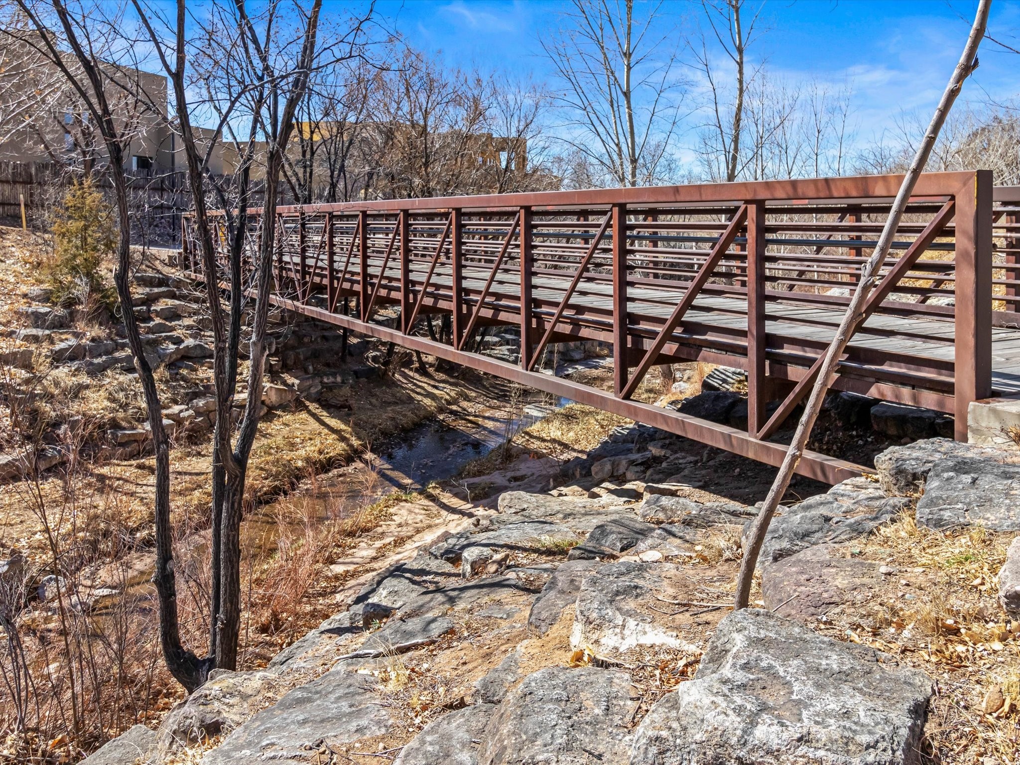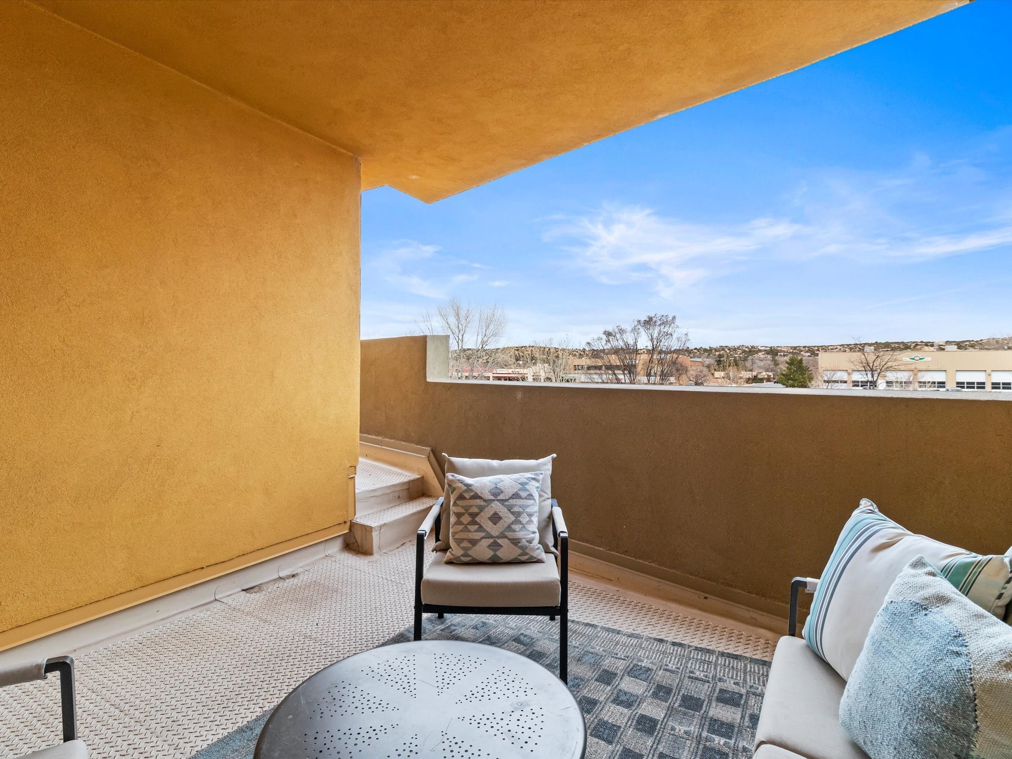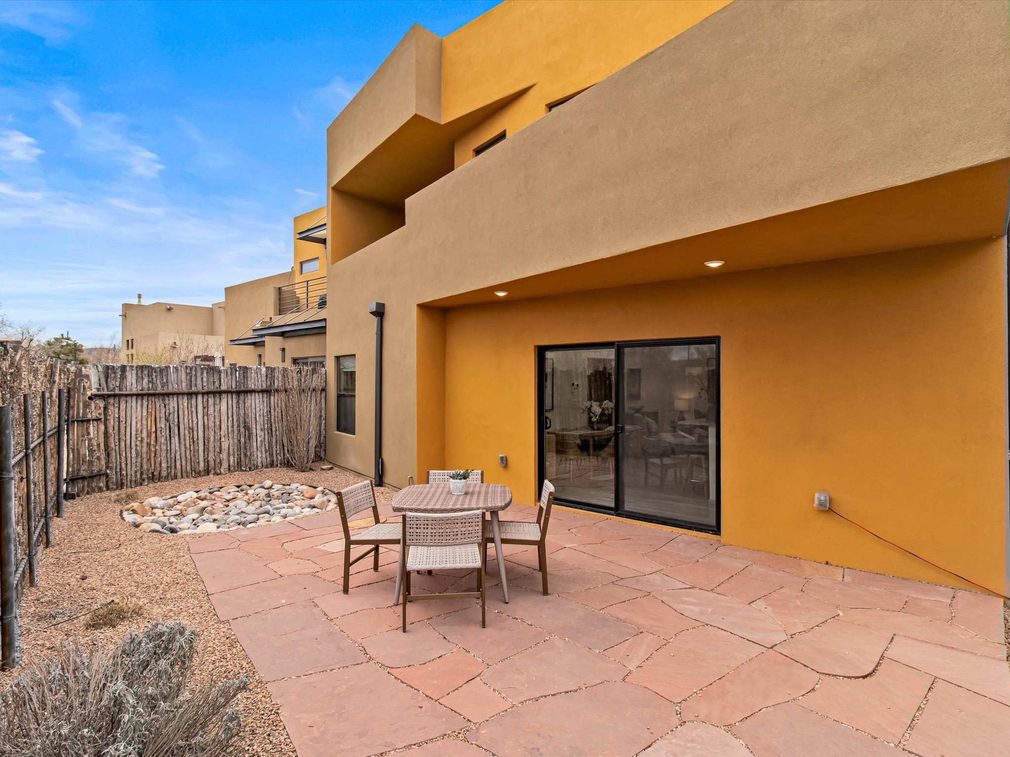 Experience exceptional Santa Fe living in this beautiful, Active Solar, contemporary condominium designed by the current owner. This all Electric, Energy Positive home boasts an Emerald Green NM Certification, Reverse Osmosis water system, new 50 AMP Electric car charger, Radiant Floor Heat (including the garage), Mitsubishi Mini splits and EnergyStar Bosch Kitchen appliances. Top of the line TPO roof with a traction layer covers the wrap-around outdoor deck where you can relax and enjoy views of the Sangre de Cristo mountains. Located in the no-outlet, highly desirable Rio Sendero Complex and nestled up against the Santa Fe River Walk Trail. The River Walk Trail accesses Downtown (1.2 miles); closely connected to two of Santa Fe's most valued areas: The Santa Fe Railyard Area with its restaurants and galleries, and the vibrant, ever-popular Santa Fe Farmers Market (1.1 miles) or go west to enjoy miles of open connected trails. For daily needs, across the street, are restaurants, groceries and a new gastro-pub. At home, the open-plan kitchen and living areas have beautiful soaring ceilings and access to a lovely ground floor rear patio. A downstairs bedroom could double as an office and the primary upstairs bedroom feels separate and cozy with its en suite bath. Low water landscape on drip irrigation. Less than five years old, this home is truly one of a kind and will garner much interest. Must see!The County Assessor shows Square footage at 1231 which differs from the builder's plans. Neither Listing Broker or Seller warrant the square footage of the lot or building. If the size of the home or lot is of material consideration to the Buyer, then the Buyer should have them measured.