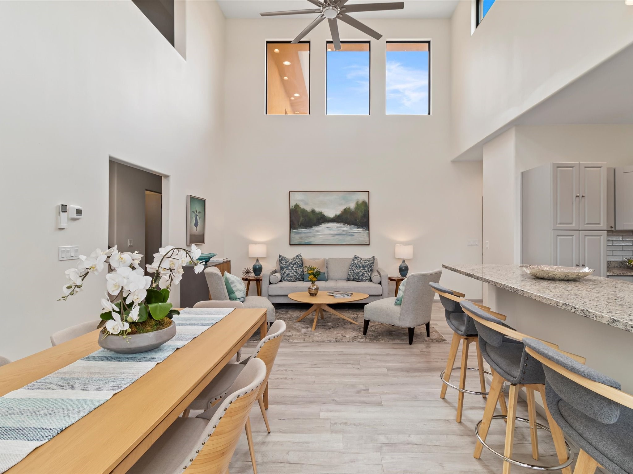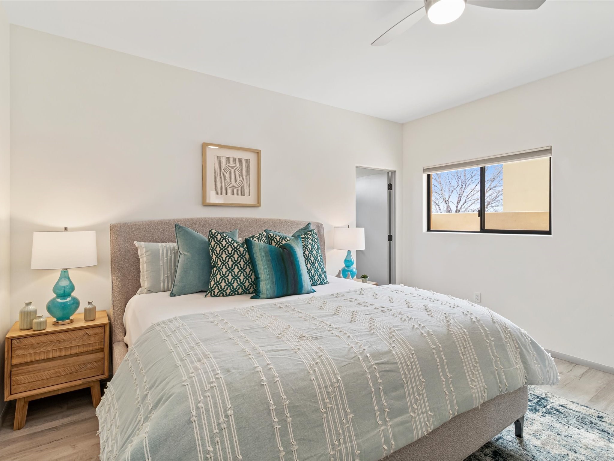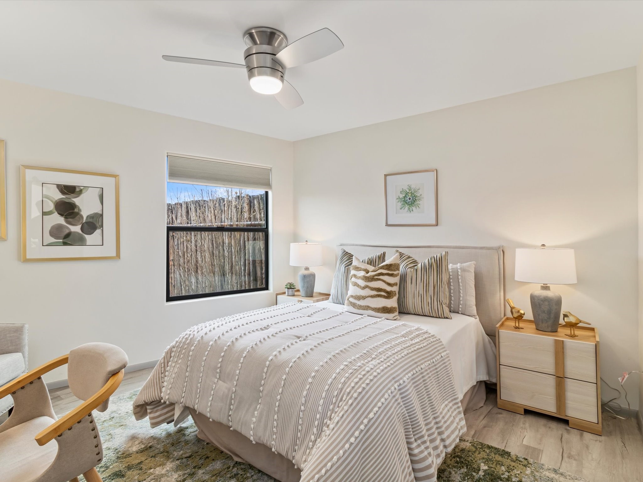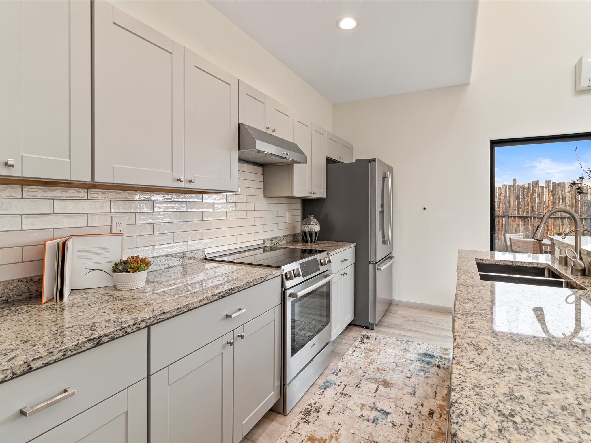 Experience exceptional Santa Fe living in this beautiful, Active Solar, contemporary condominium designed by the current owner. This all Electric, Energy Positive home boasts an Emerald Green NM Certification, Reverse Osmosis water system, new 50 AMP Electric car charger, Radiant Floor Heat (including the garage), Mitsubishi Mini splits and EnergyStar Bosch Kitchen appliances. Top of the line TPO roof with a traction layer covers the wrap-around outdoor deck where you can relax and enjoy views of the Sangre de Cristo mountains. Located in the no-outlet, highly desirable Rio Sendero Complex and nestled up against the Santa Fe River Walk Trail. The River Walk Trail accesses Downtown (1.2 miles); closely connected to two of Santa Fe's most valued areas: The Santa Fe Railyard Area with its restaurants and galleries, and the vibrant, ever-popular Santa Fe Farmers Market (1.1 miles) or go west to enjoy miles of open connected trails. For daily needs, across the street, are restaurants, groceries and a new gastro-pub. At home, the open-plan kitchen and living areas have beautiful soaring ceilings and access to a lovely ground floor rear patio. A downstairs bedroom could double as an office and the primary upstairs bedroom feels separate and cozy with its en suite bath. Low water landscape on drip irrigation. Less than five years old, this home is truly one of a kind and will garner much interest. Must see!The County Assessor shows Square footage at 1231 which differs from the builder's plans. Neither Listing Broker or Seller warrant the square footage of the lot or building. If the size of the home or lot is of material consideration to the Buyer, then the Buyer should have them measured.