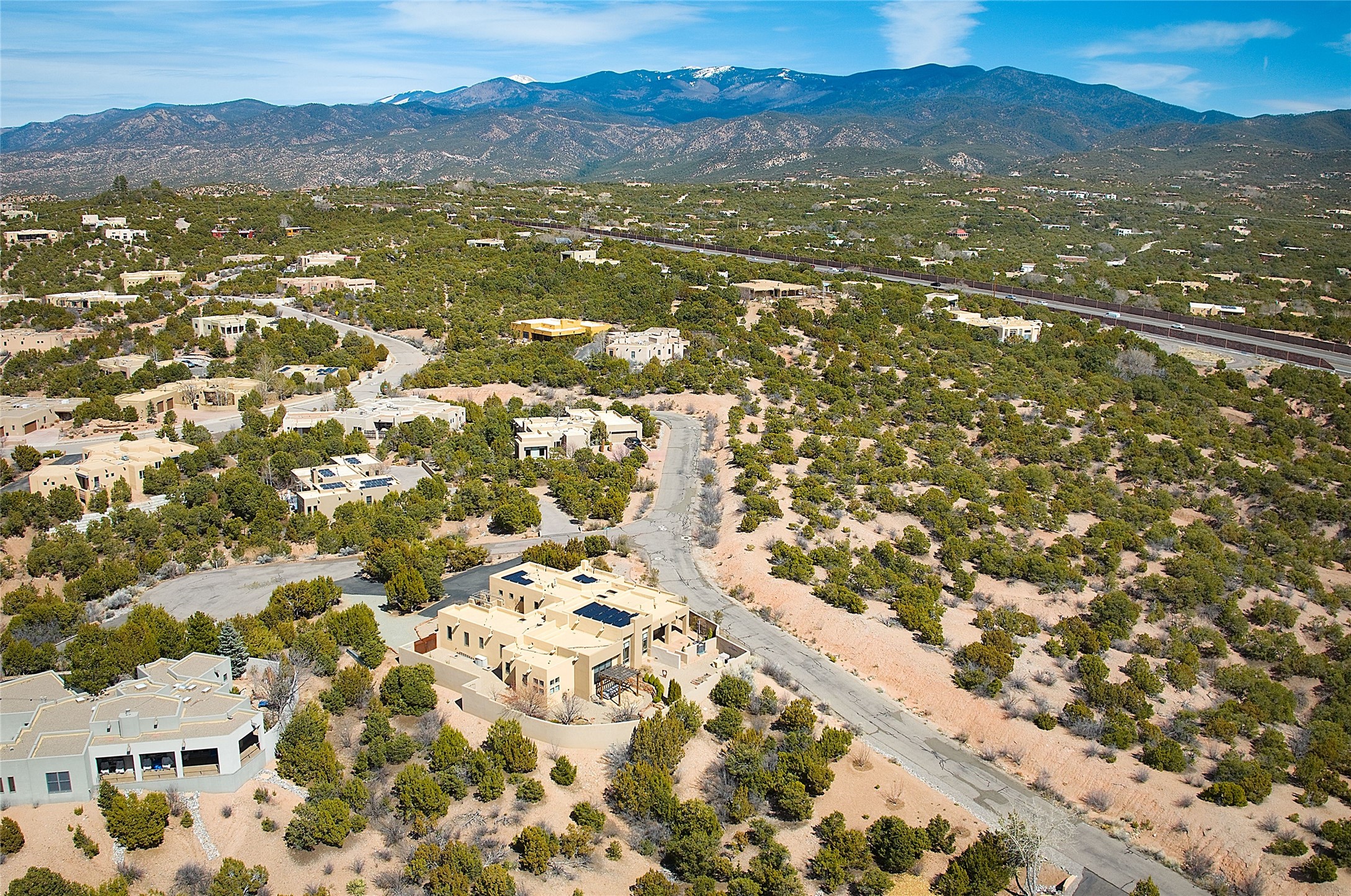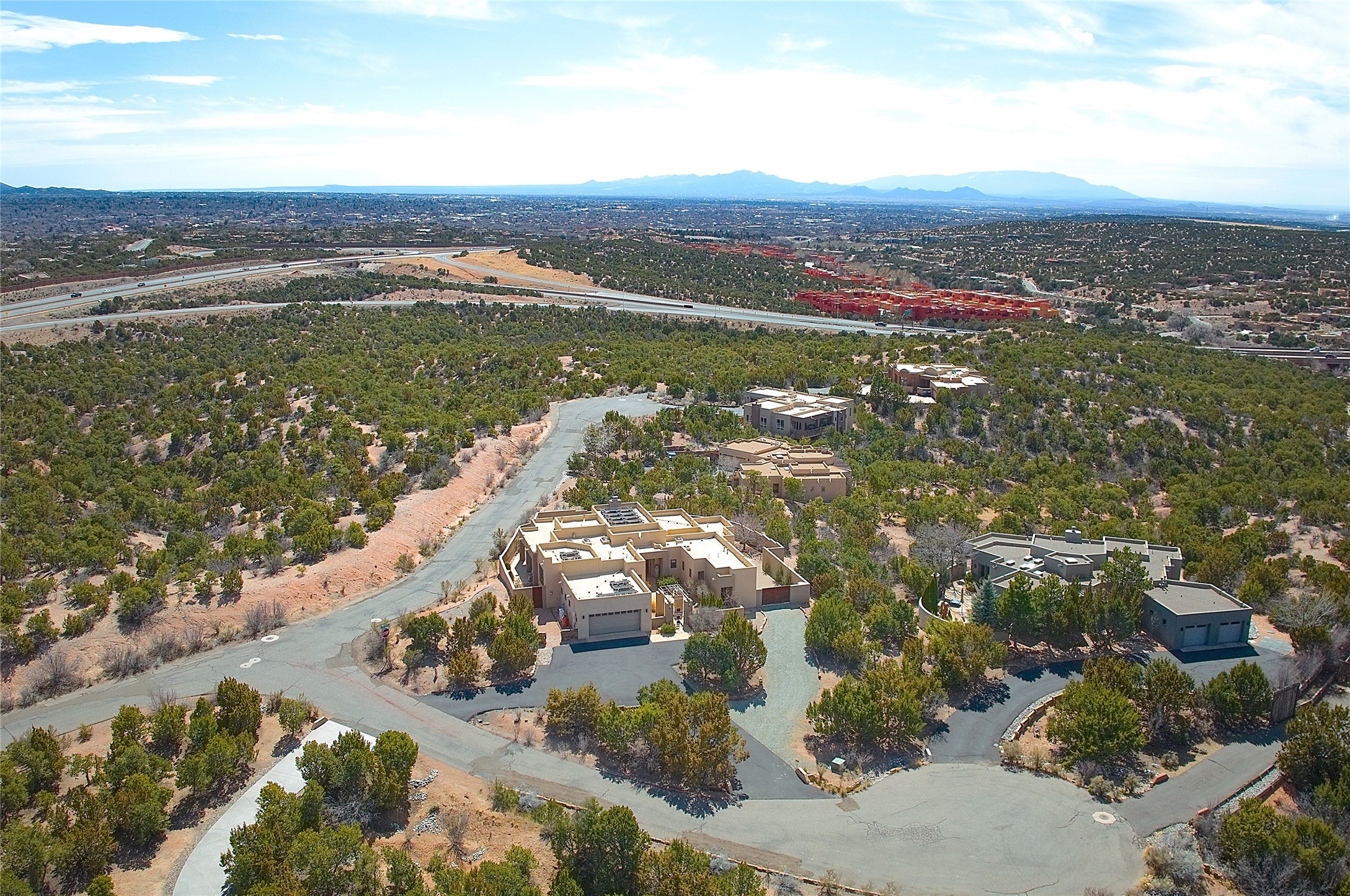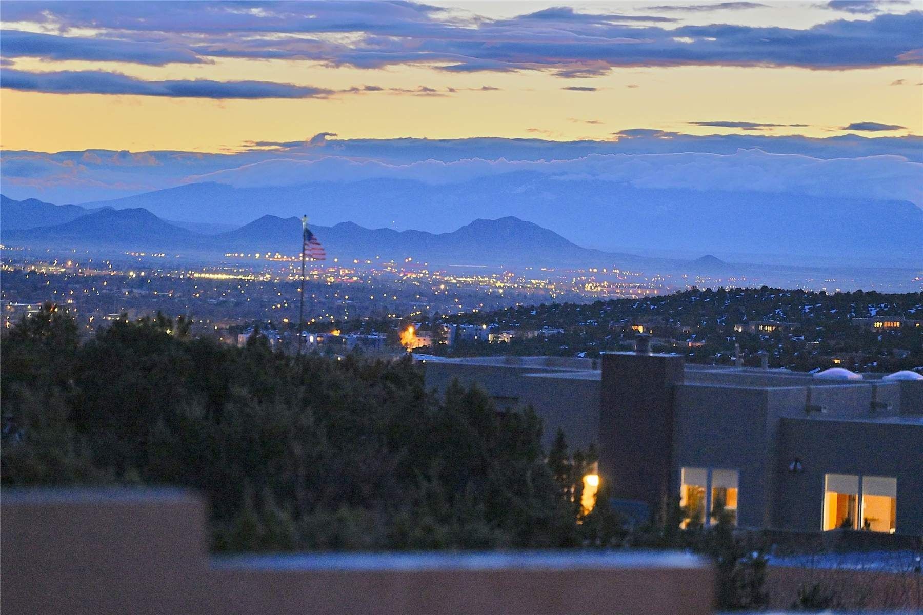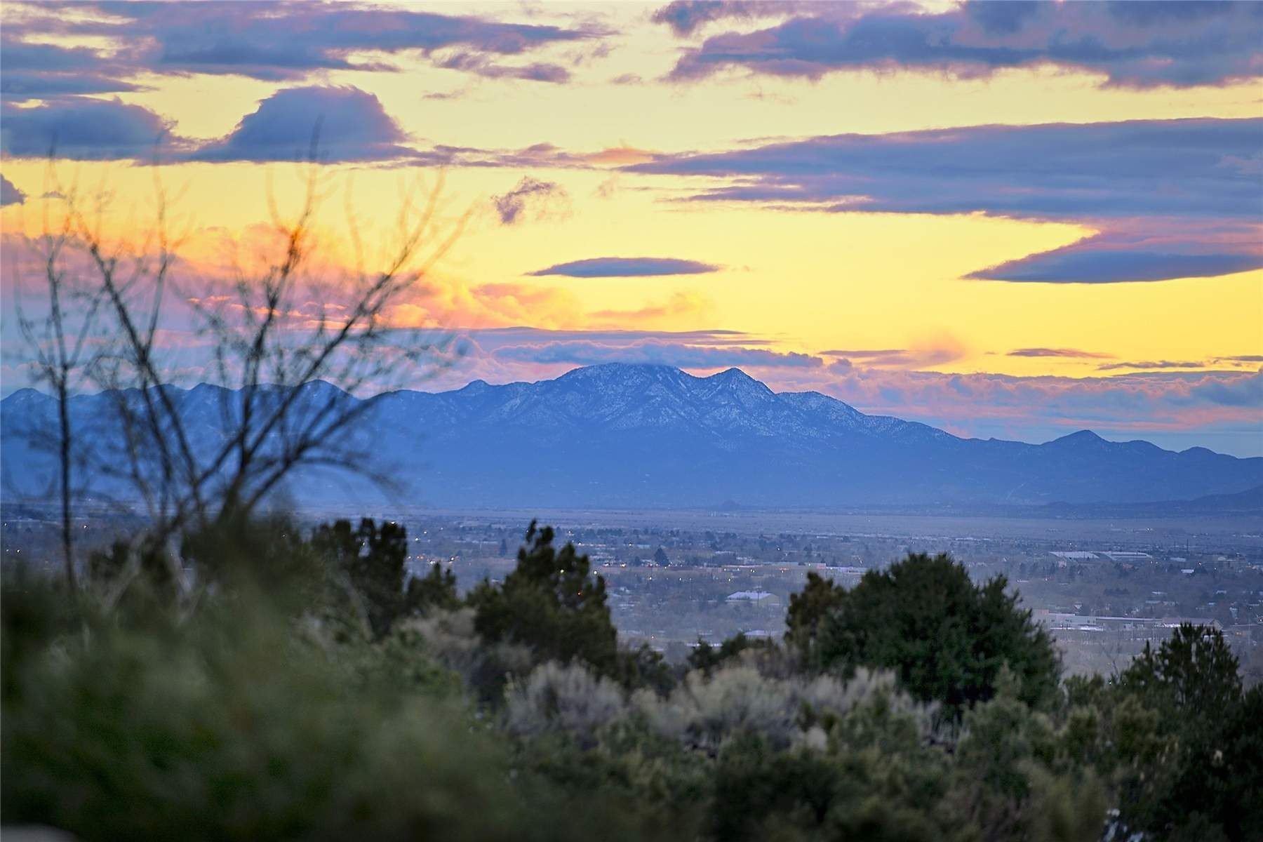 Perched on a hilltop with breathtaking views of the Sangre de Cristo Mountains and city lights, this exceptional home offers a unique blend of tranquility and convenience, just minutes from the historic Santa Fe Plaza. Enter through a dramatic Zen-like courtyard and step inside to see the spacious living room that will captivate you with tall, beamed ceilings, mesquite wood floors, and a stunning fireplace surrounded by tall view-filled windows. The gourmet kitchen features custom cabinetry, high-end appliances, and a central island with a stone countertop. Strategically located and open to the kitchen is an informal living and dining area, perfect for relaxing and movie watching. The dining room offers spectacular views of the mountains and city lights. The primary suite is a luxurious retreat, with rich wood accents, large southern windows, and a spa-like bathroom featuring dual vanities, dressing areas, a jetted tub, a spacious shower, and a deep walk-in closet. The guest bedrooms are intelligently positioned for privacy, while the third bedroom, with a courtyard entrance, provides versatility as an office space. Recent upgrades include a brand-new roof, fresh stucco, and solar energy, enhancing both efficiency and sustainability. Surrounded by protective walls, the grounds feature beautifully lush yet low-maintenance landscaping, creating a serene outdoor environment. Expansive patio areas under deep portals offer multiple options for alfresco dining and relaxation.PLEASE CLICK ON VIDEO LINK ICON ABOVE FOR WALK-THRU VIDEO