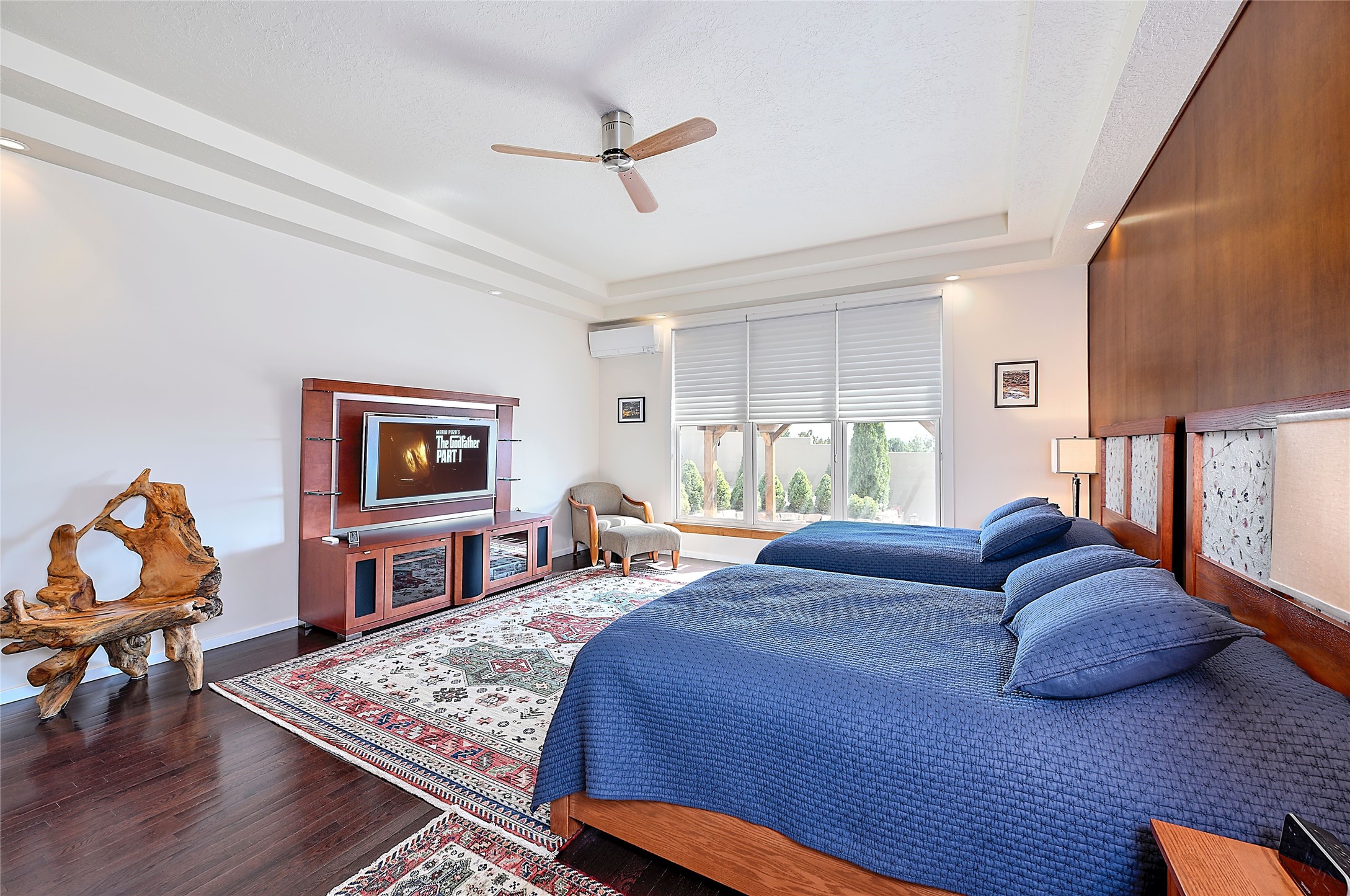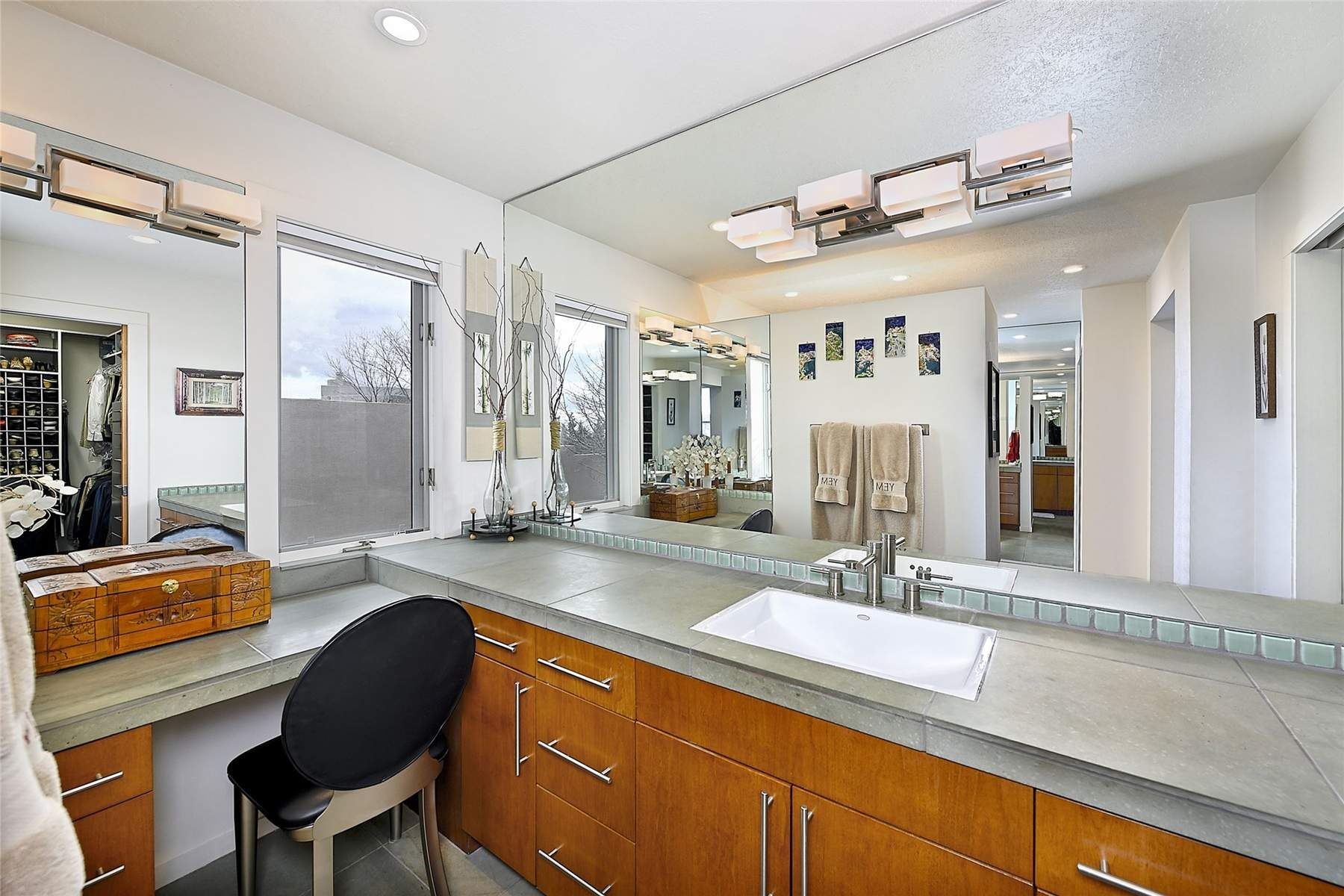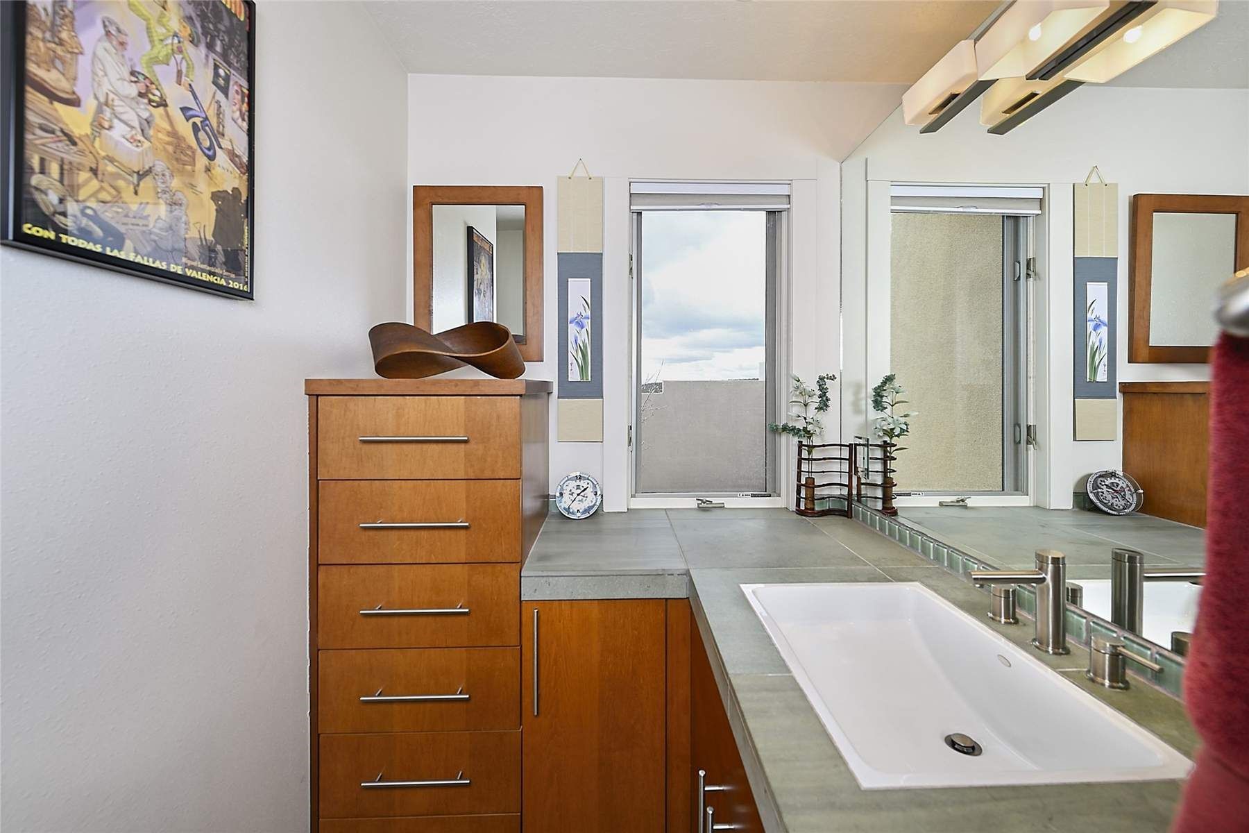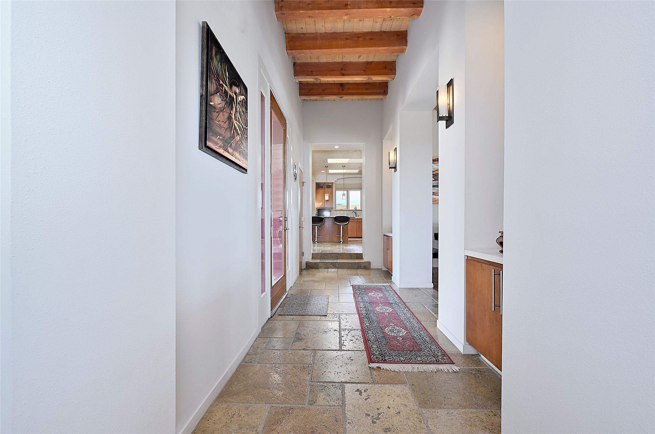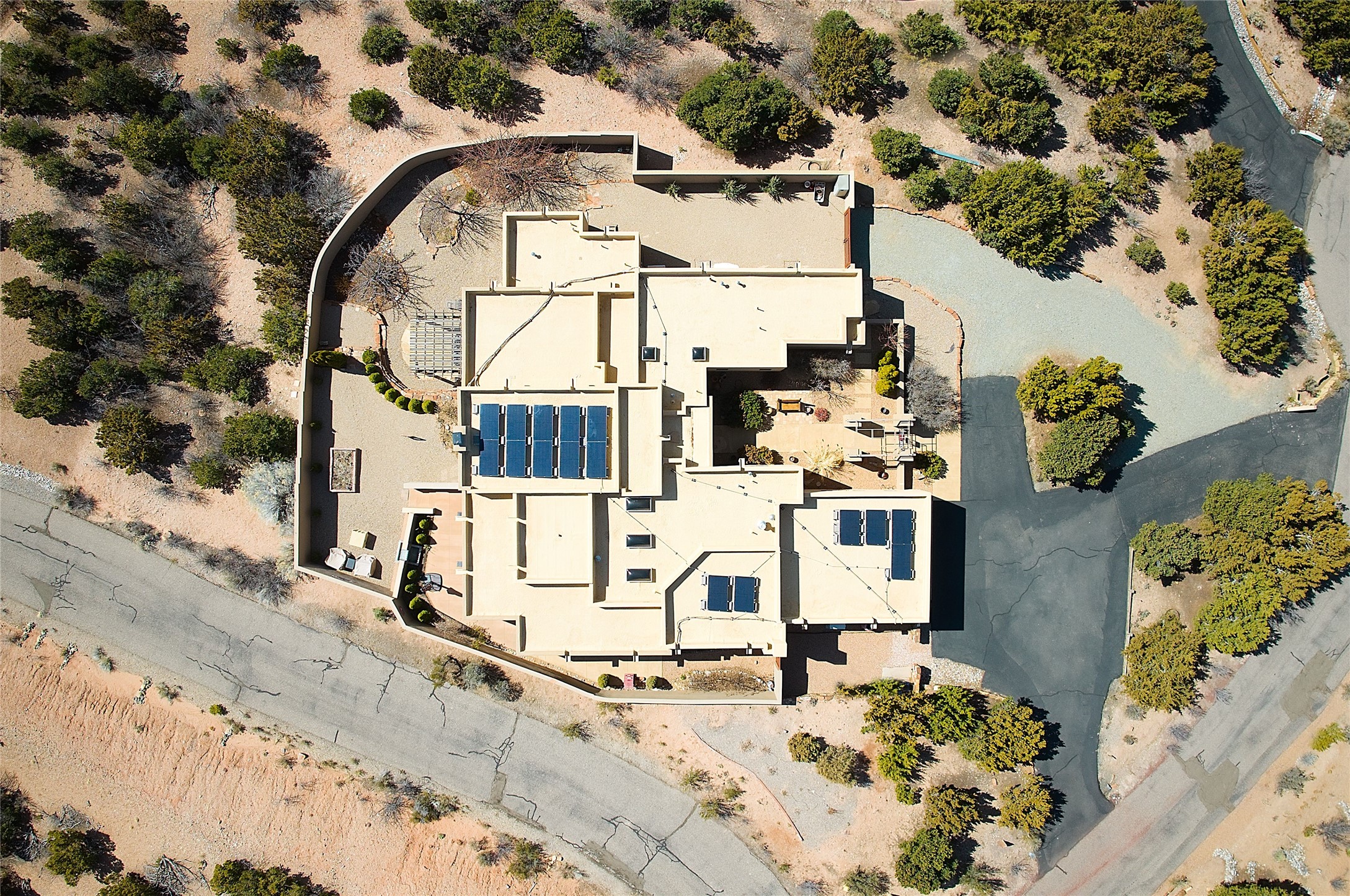 Perched on a hilltop with breathtaking views of the Sangre de Cristo Mountains and city lights, this exceptional home offers a unique blend of tranquility and convenience, just minutes from the historic Santa Fe Plaza. Enter through a dramatic Zen-like courtyard and step inside to see the spacious living room that will captivate you with tall, beamed ceilings, mesquite wood floors, and a stunning fireplace surrounded by tall view-filled windows. The gourmet kitchen features custom cabinetry, high-end appliances, and a central island with a stone countertop. Strategically located and open to the kitchen is an informal living and dining area, perfect for relaxing and movie watching. The dining room offers spectacular views of the mountains and city lights. The primary suite is a luxurious retreat, with rich wood accents, large southern windows, and a spa-like bathroom featuring dual vanities, dressing areas, a jetted tub, a spacious shower, and a deep walk-in closet. The guest bedrooms are intelligently positioned for privacy, while the third bedroom, with a courtyard entrance, provides versatility as an office space. Recent upgrades include a brand-new roof, fresh stucco, and solar energy, enhancing both efficiency and sustainability. Surrounded by protective walls, the grounds feature beautifully lush yet low-maintenance landscaping, creating a serene outdoor environment. Expansive patio areas under deep portals offer multiple options for alfresco dining and relaxation.PLEASE CLICK ON VIDEO LINK ICON ABOVE FOR WALK-THRU VIDEO