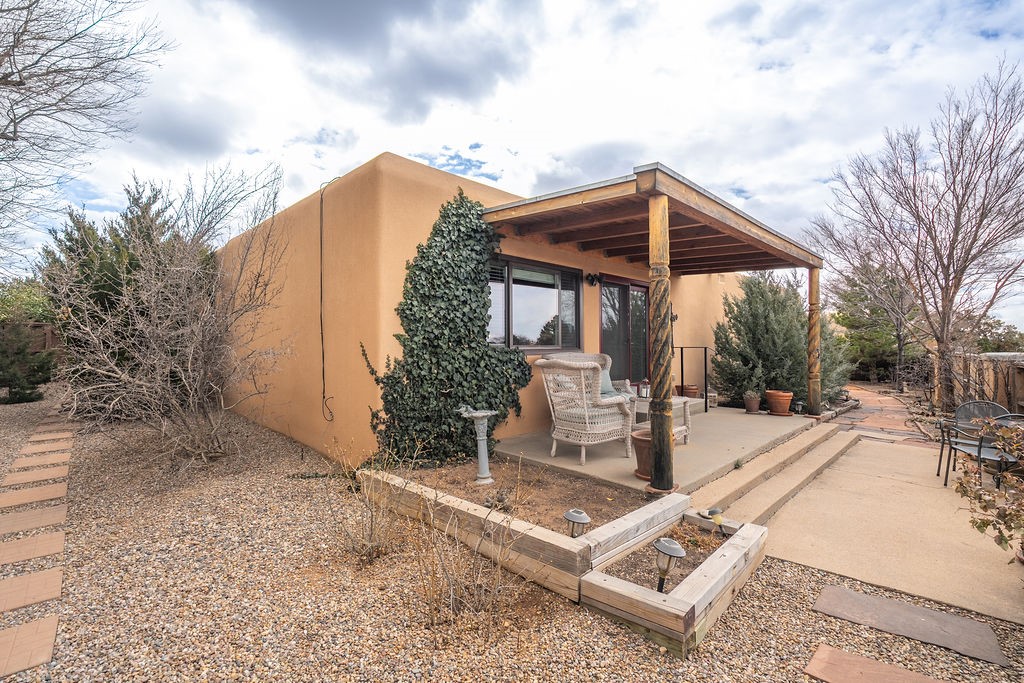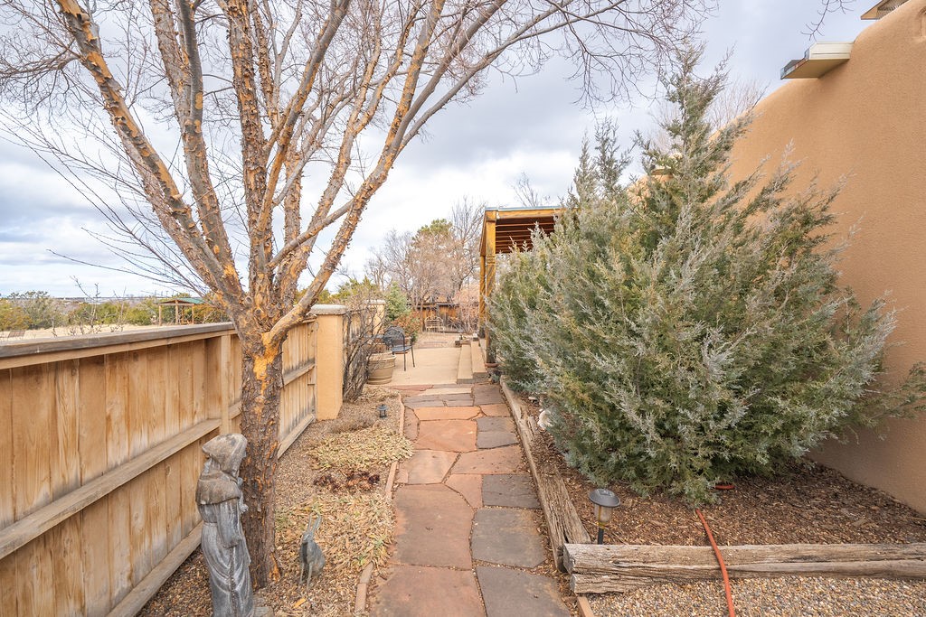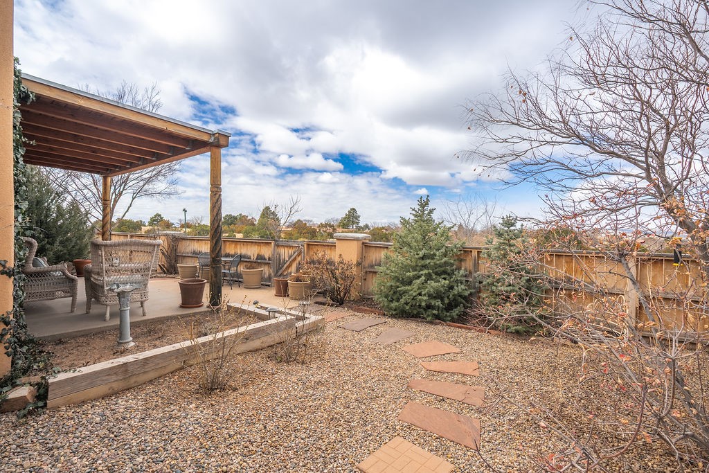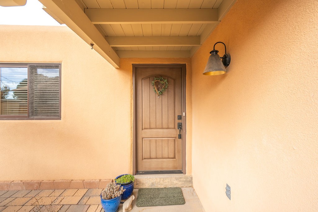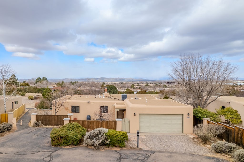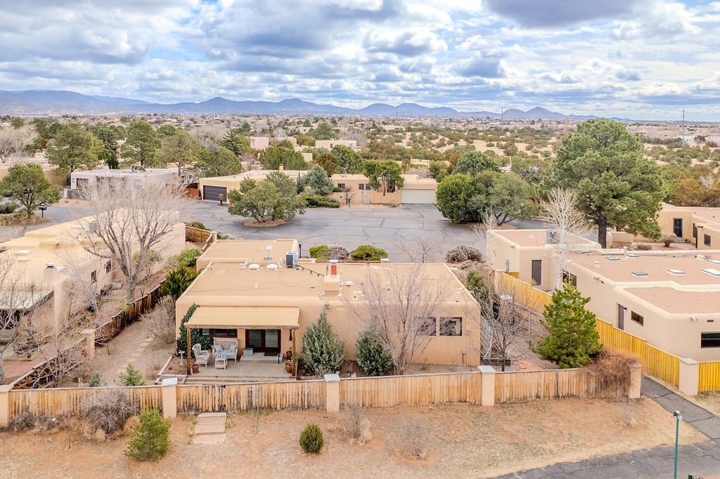 Nestled in a serene and private setting, this beautifully updated 1,632 sq. ft. home offers comfort, style, and breathtaking views of the Jemez Mountains. Featuring three bedrooms and two remodeled bathrooms, this home is designed for both relaxation and functionality. Step inside to discover updated tile floors throughout and an inviting living room with a wood-burning fireplace, built-in bookshelves, and French doors leading to a charming covered portal and landscaped backyard. The formal dining room, illuminated by two skylights, provides the perfect space for gatherings, while the renovated kitchen boasts newer appliances, a gas stove, and a pantry with pull-out shelves. The primary suite is a peaceful retreat with a walk-in closet and mountain views, while the third bedroom is a versatile space, complete with a built-in Murphy bed and office built-ins. Enjoy year-round comfort with forced air heating and refrigerated AC.Outdoor enthusiasts will love the generous front courtyard patio, perfect for lazy Summer breakfasts, and the walking path surrounding the property, leading to two raised garden beds--ideal for growing fresh produce or flowers. With community garden views and a quiet, peaceful atmosphere, this home is a rare gem waiting to be yours! TPO new roof with 10 year warranty has been ordered. Radon mitigation is being done on 4/3/25. Park Plazas is a unique and beautiful neighborhood, close to everything in Santa Fe, with miles of walking trails, a community garden, tennis courts, an off-leash dog park, and many other amenities, this neighborhood is one of the best values in Santa Fe.