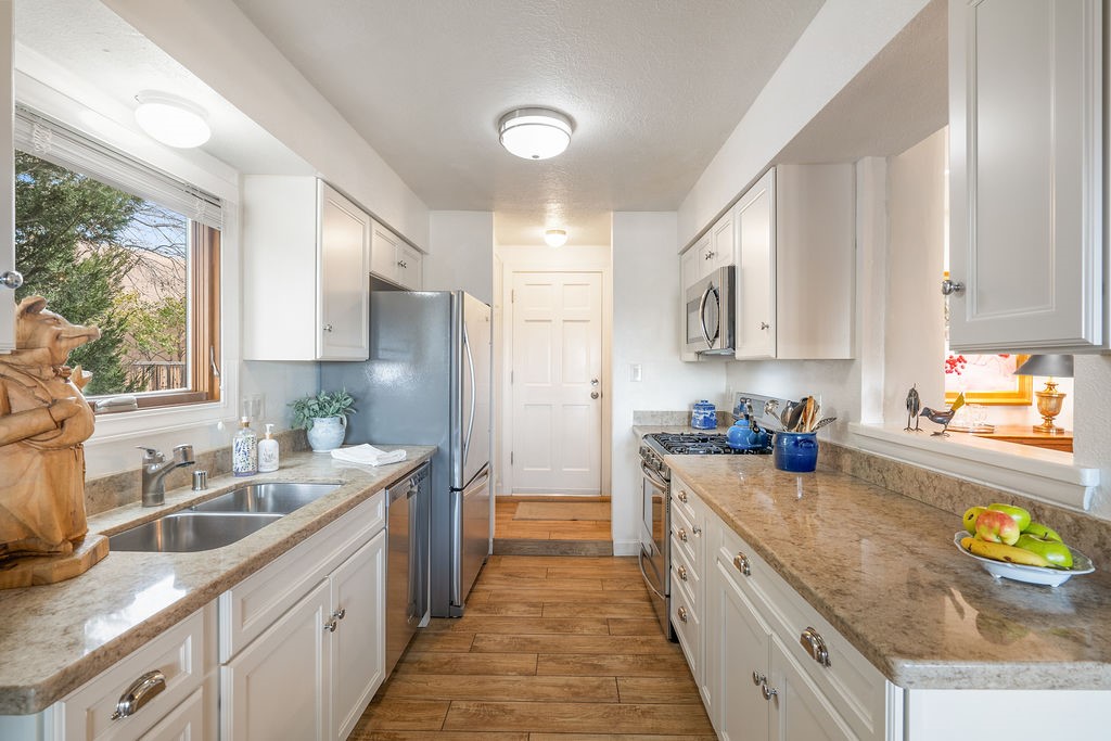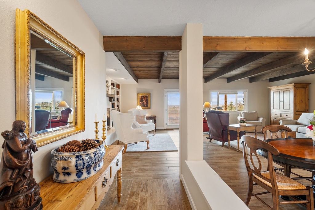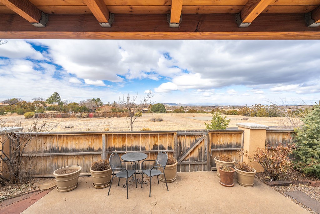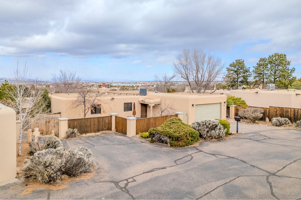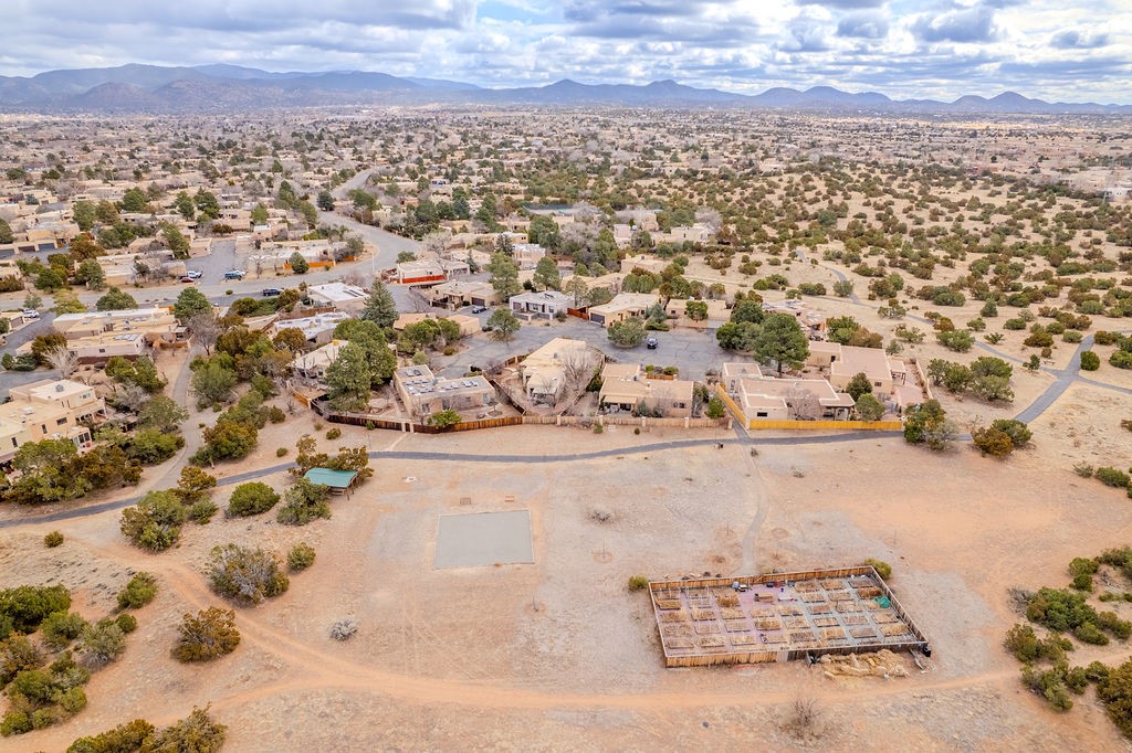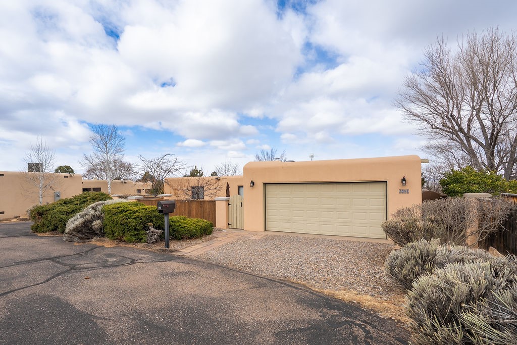 Nestled in a serene and private setting, this beautifully updated 1,632 sq. ft. home offers comfort, style, and breathtaking views of the Jemez Mountains. Featuring three bedrooms and two remodeled bathrooms, this home is designed for both relaxation and functionality. Step inside to discover updated tile floors throughout and an inviting living room with a wood-burning fireplace, built-in bookshelves, and French doors leading to a charming covered portal and landscaped backyard. The formal dining room, illuminated by two skylights, provides the perfect space for gatherings, while the renovated kitchen boasts newer appliances, a gas stove, and a pantry with pull-out shelves. The primary suite is a peaceful retreat with a walk-in closet and mountain views, while the third bedroom is a versatile space, complete with a built-in Murphy bed and office built-ins. Enjoy year-round comfort with forced air heating and refrigerated AC.Outdoor enthusiasts will love the generous front courtyard patio, perfect for lazy Summer breakfasts, and the walking path surrounding the property, leading to two raised garden beds--ideal for growing fresh produce or flowers. With community garden views and a quiet, peaceful atmosphere, this home is a rare gem waiting to be yours! TPO new roof with 10 year warranty has been ordered. Radon mitigation is being done on 4/3/25. Park Plazas is a unique and beautiful neighborhood, close to everything in Santa Fe, with miles of walking trails, a community garden, tennis courts, an off-leash dog park, and many other amenities, this neighborhood is one of the best values in Santa Fe.