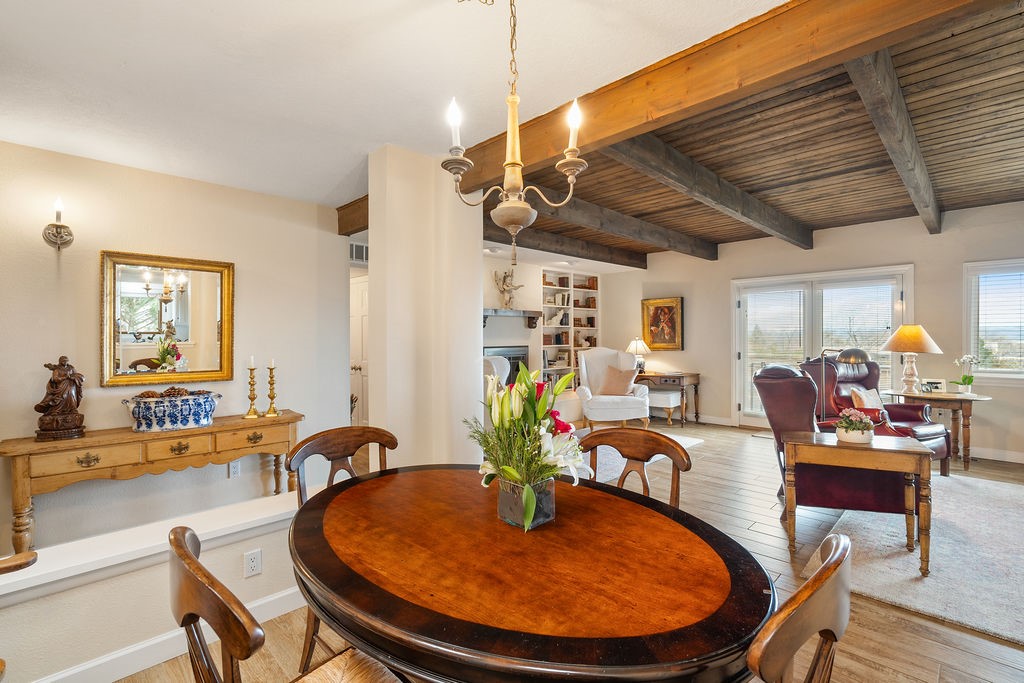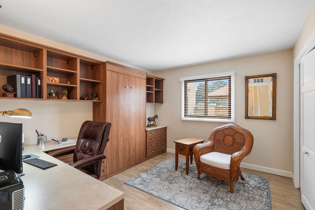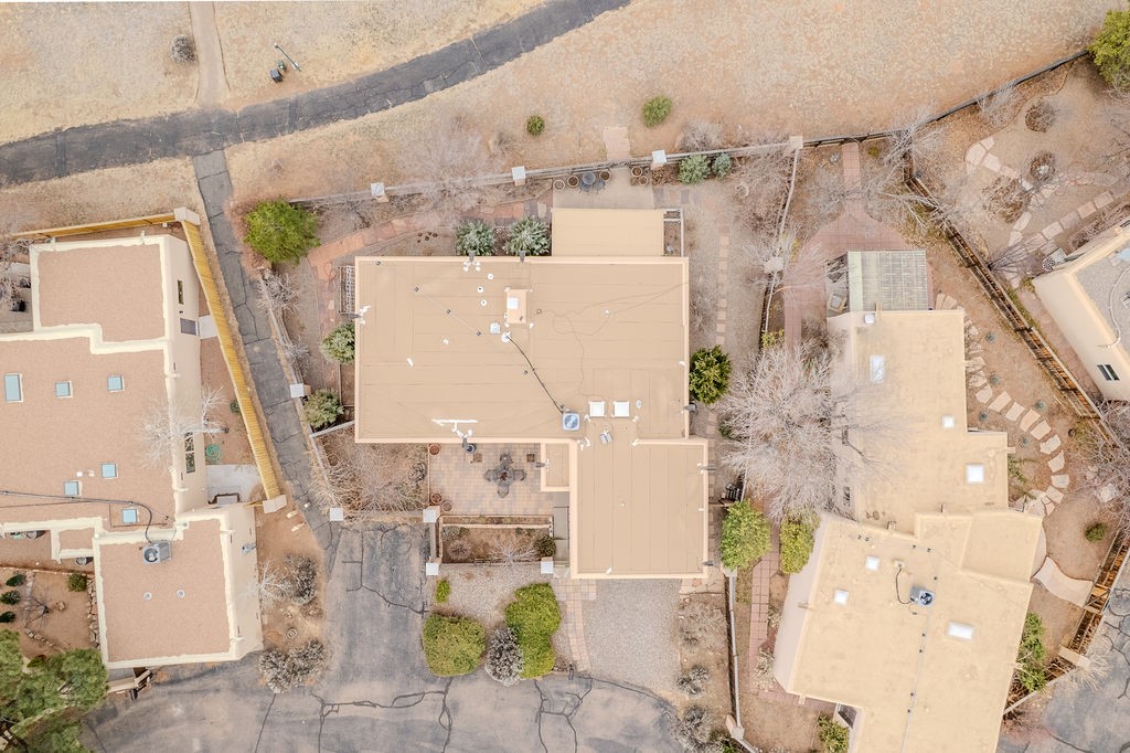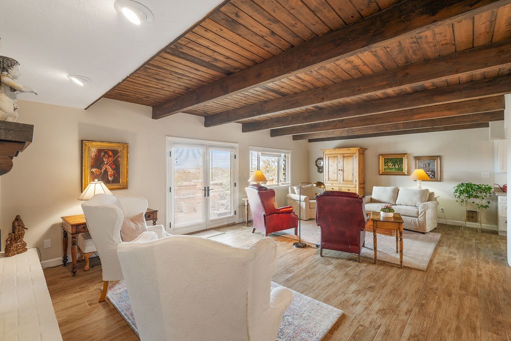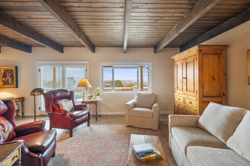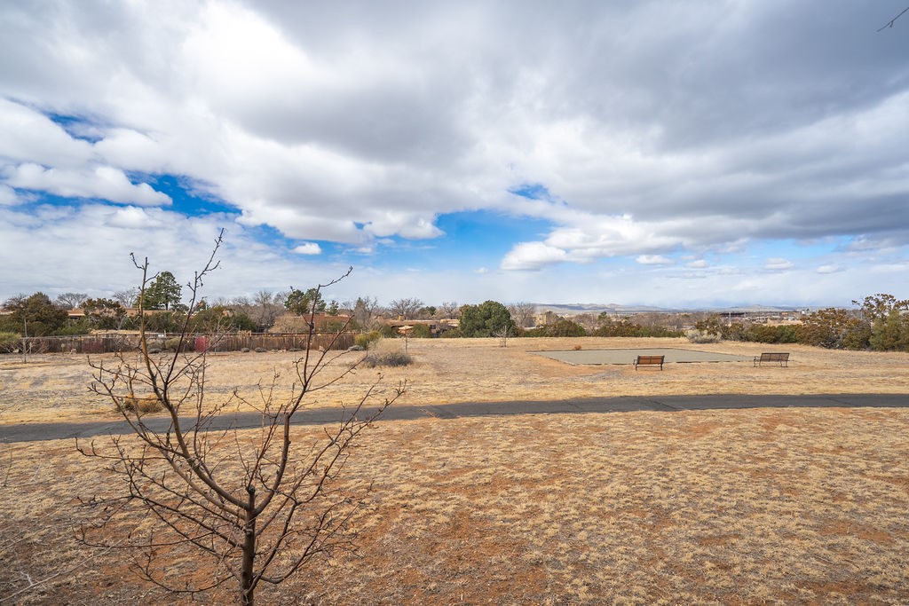 Nestled in a serene and private setting, this beautifully updated 1,632 sq. ft. home offers comfort, style, and breathtaking views of the Jemez Mountains. Featuring three bedrooms and two remodeled bathrooms, this home is designed for both relaxation and functionality. Step inside to discover updated tile floors throughout and an inviting living room with a wood-burning fireplace, built-in bookshelves, and French doors leading to a charming covered portal and landscaped backyard. The formal dining room, illuminated by two skylights, provides the perfect space for gatherings, while the renovated kitchen boasts newer appliances, a gas stove, and a pantry with pull-out shelves. The primary suite is a peaceful retreat with a walk-in closet and mountain views, while the third bedroom is a versatile space, complete with a built-in Murphy bed and office built-ins. Enjoy year-round comfort with forced air heating and refrigerated AC.Outdoor enthusiasts will love the generous front courtyard patio, perfect for lazy Summer breakfasts, and the walking path surrounding the property, leading to two raised garden beds--ideal for growing fresh produce or flowers. With community garden views and a quiet, peaceful atmosphere, this home is a rare gem waiting to be yours! TPO new roof with 10 year warranty has been ordered. Radon mitigation is being done on 4/3/25. Park Plazas is a unique and beautiful neighborhood, close to everything in Santa Fe, with miles of walking trails, a community garden, tennis courts, an off-leash dog park, and many other amenities, this neighborhood is one of the best values in Santa Fe.