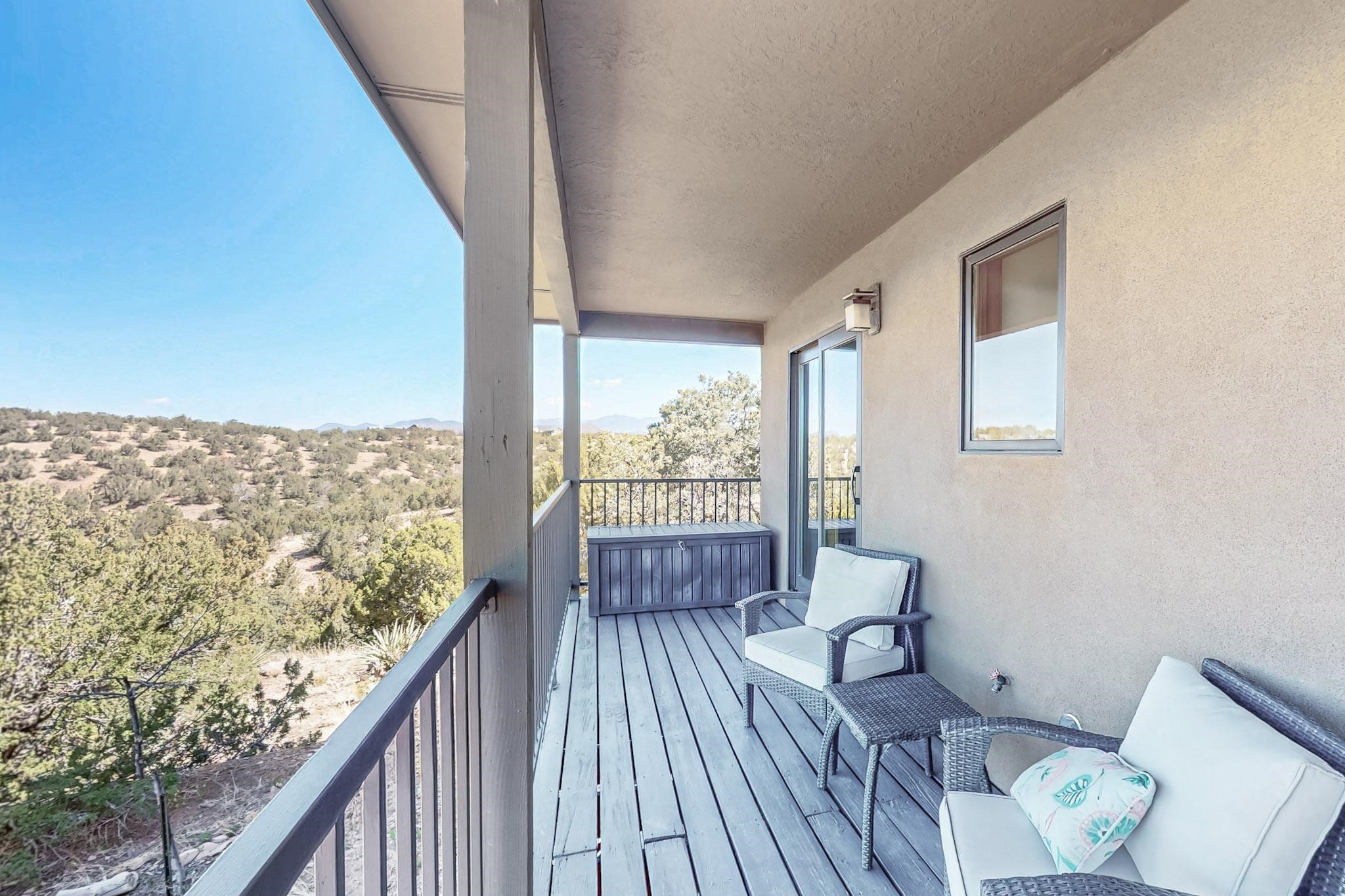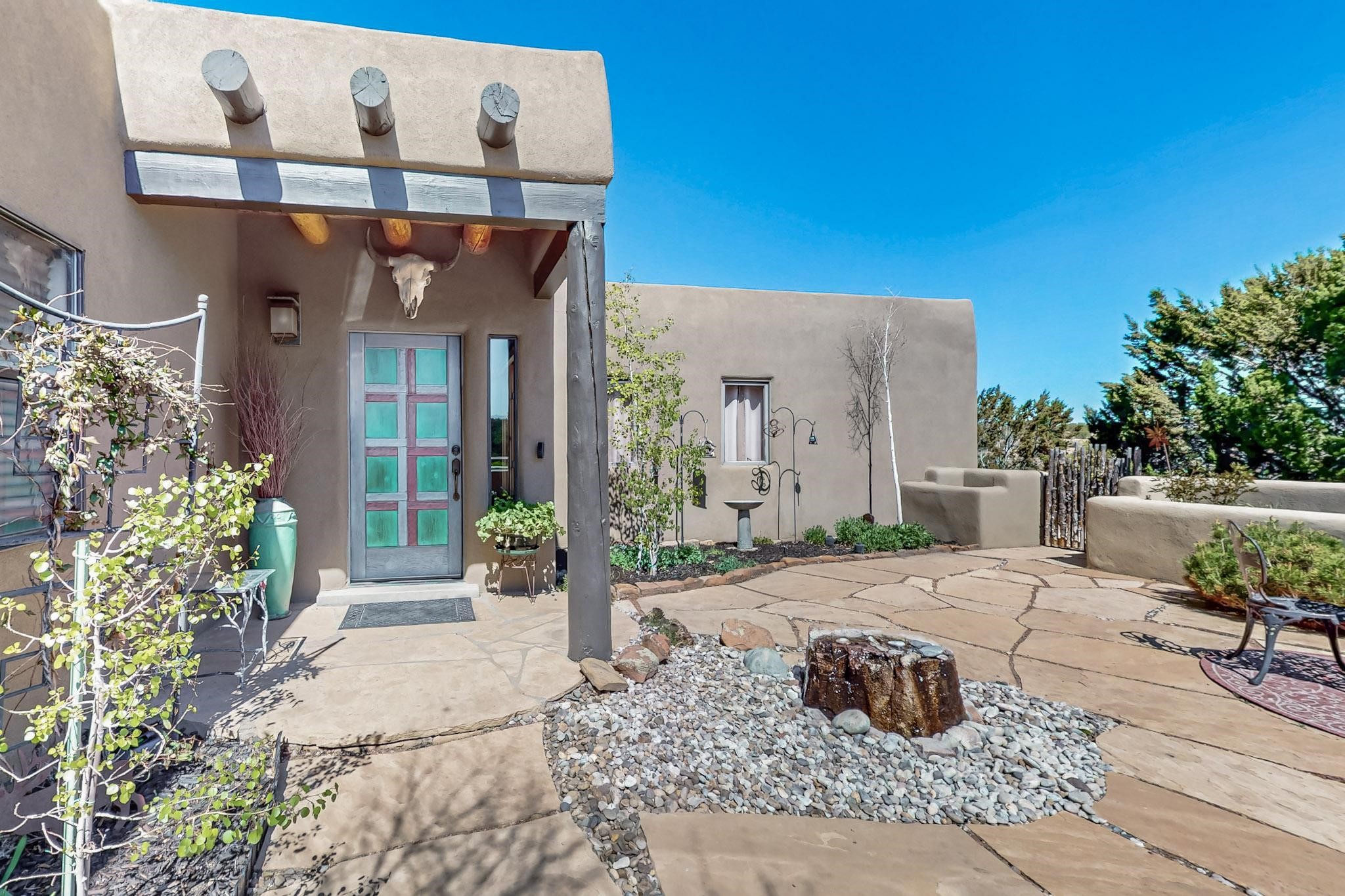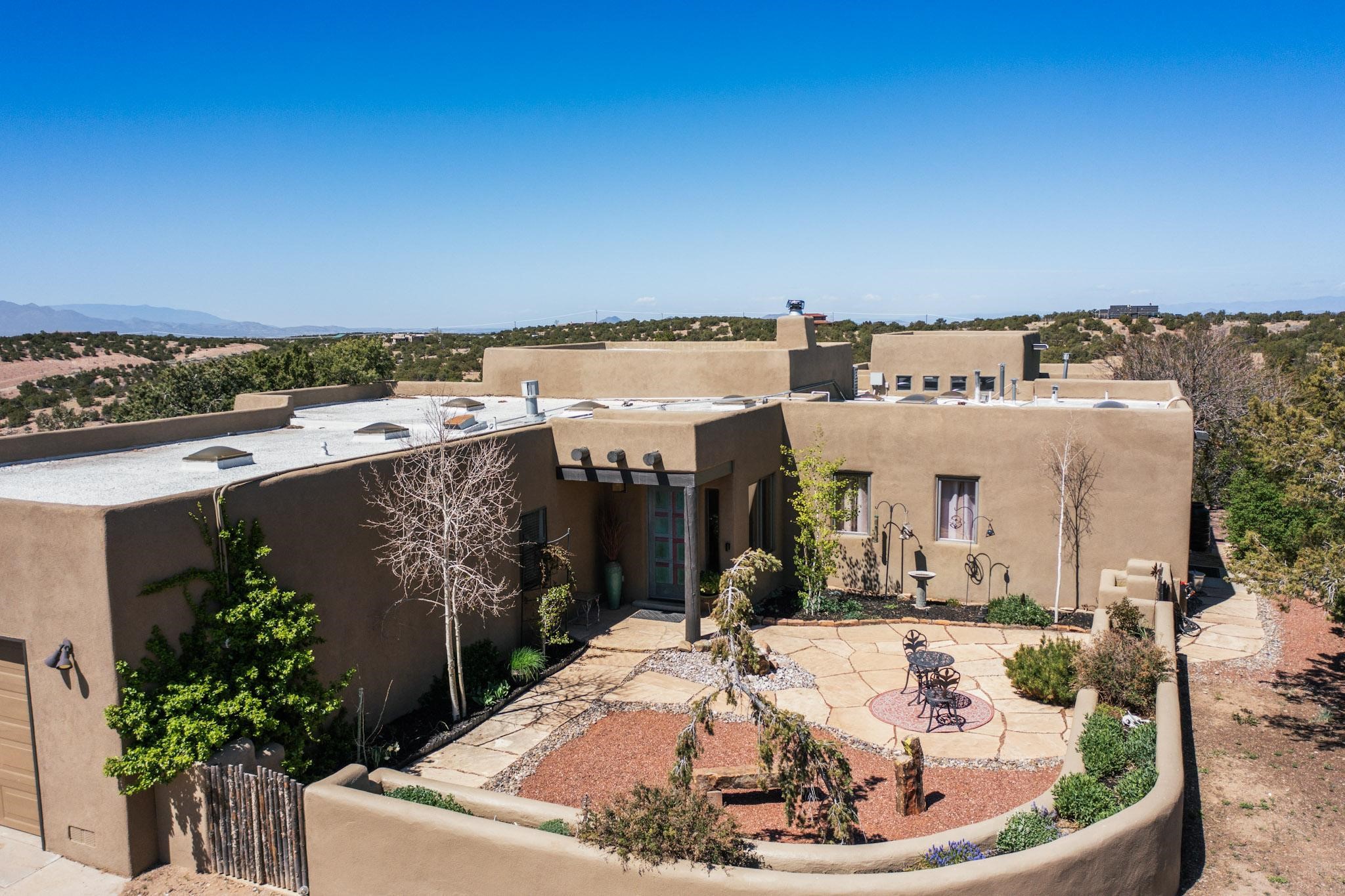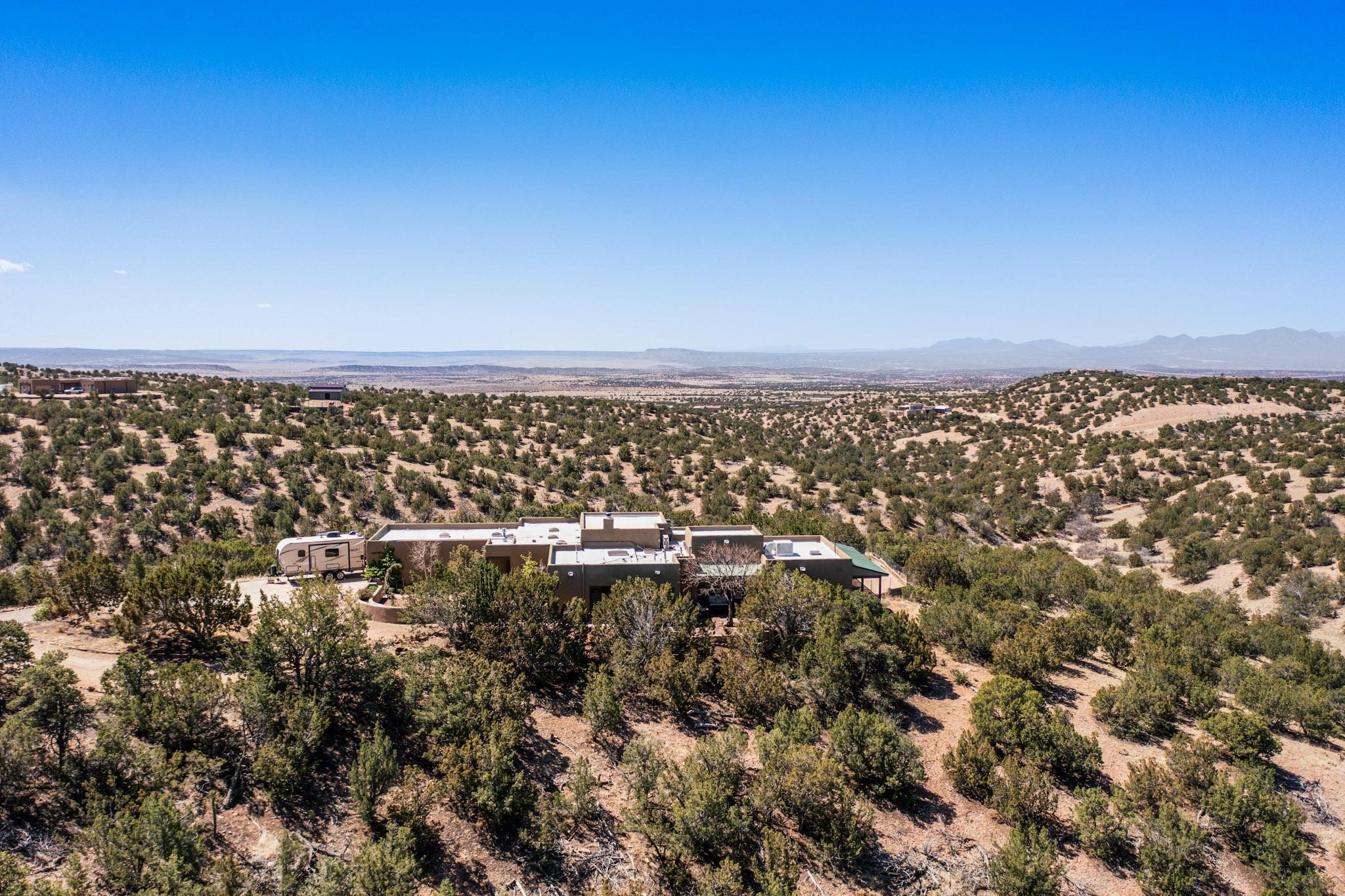 At the very end of a private road, where the world quiets and the landscape opens wide, you'll discover a hidden gem--an exceptional home perched above a sweeping arroyo, offering complete privacy and awe-inspiring panoramic views. This beautifully designed 4-bedroom, 3-bath home sits on 10 pristine acres in a small enclave that has been cherished by a single owner. From nearly every window and outdoor space, you'll be captivated by unobstructed vistas that stretch across the Galisteo Basin, Ortiz Mountains, Sandias, the majestic Sangre de Cristo range. Here, the sunsets paint the sky with color and the stars shine brighter than you've ever seen. Crafted by Jade Enterprises, the home features warm Southwest architectural touches, including hand-hewn vigas, high ceilings, and custom wood doors by local artisan Larry DeLeon. The open-concept kitchen with elegant serpentine stone countertops flows seamlessly into a generous living area, anchored by a beautiful fireplace and oriented toward some of the home's best views. The private primary suite occupies its own wing and includes a luxurious ensuite bath with a soaking tub, two-headed shower, walk-in closet, and a serene private patio. Two additional bedrooms at the rear of the home share a Jack-and-Jill bathroom and are joined by a flexible entertainment room with a wet bar and access to both the front and back outdoor living spaces. The oversized 2-car garage has cabinets, ample storage space, and a custom workbench. Outside, a fenced yard features a cozy flagstone fire-pit with seating, a spacious patio ideal for outdoor cooking, and a garden space ready for your vision. Every angle of this home was thoughtfully designed to celebrate the natural beauty that surrounds it. This is more than a home--it's a rare opportunity to own a piece of the New Mexico landscape, where peace, privacy, and panoramic beauty come together in perfect harmony. Covenants allow for additional casita/studio subject to HOA approval. Come see it.