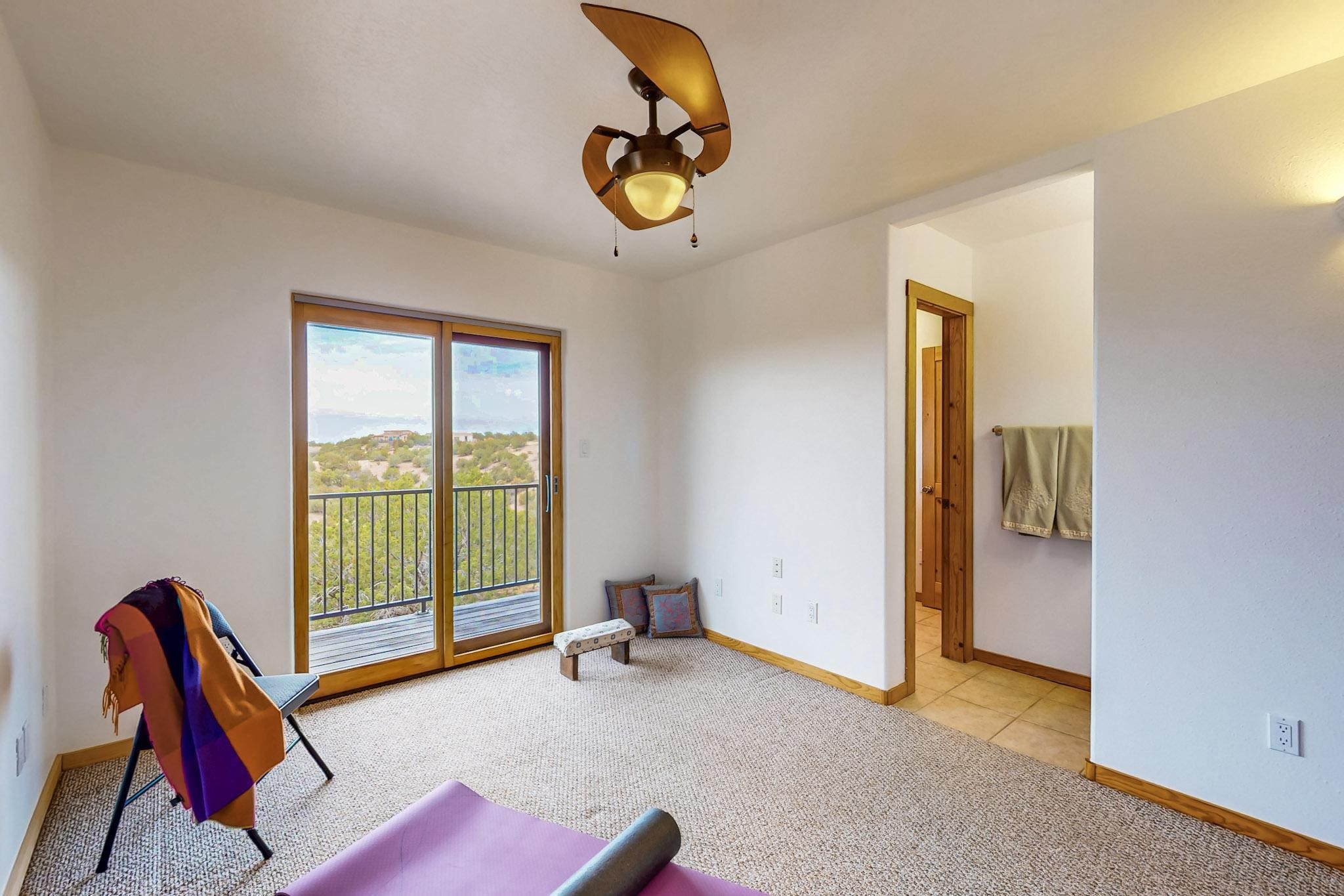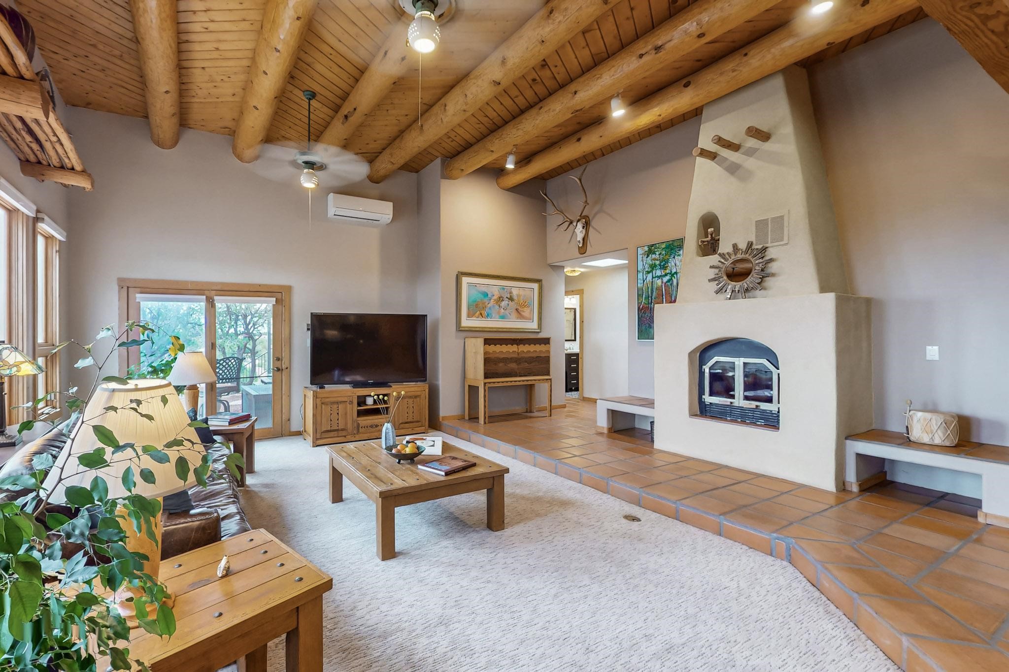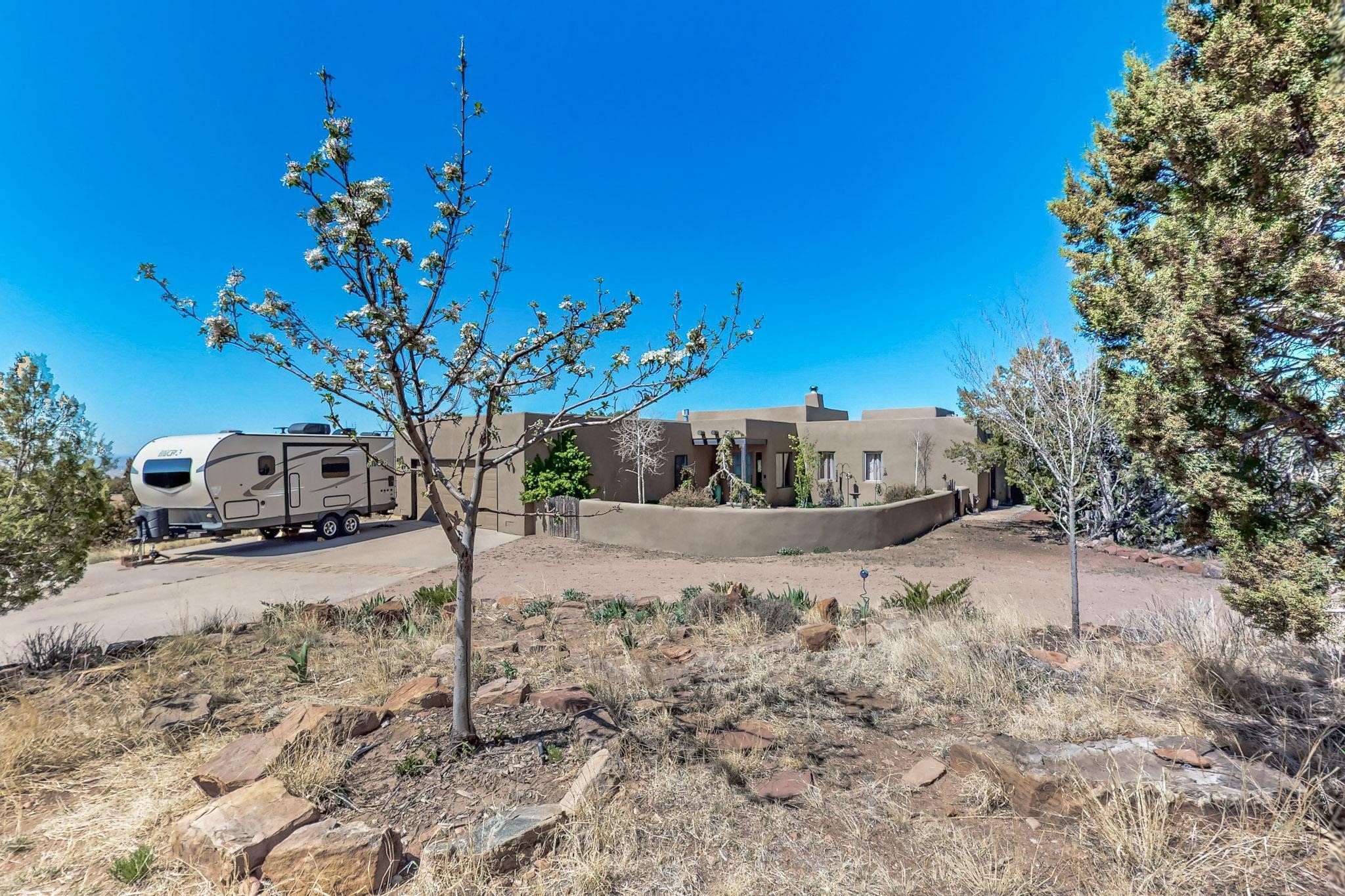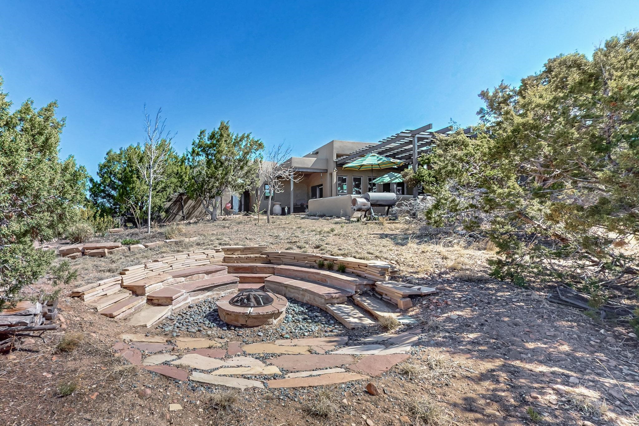At the very end of a private road, where the world quiets and the landscape opens wide, you'll discover a hidden gem--an exceptional home perched above a sweeping arroyo, offering complete privacy and awe-inspiring panoramic views. This beautifully designed 4-bedroom, 3-bath home sits on 10 pristine acres in a small enclave that has been cherished by a single owner. From nearly every window and outdoor space, you'll be captivated by unobstructed vistas that stretch across the Galisteo Basin, Ortiz Mountains, Sandias, the majestic Sangre de Cristo range. Here, the sunsets paint the sky with color and the stars shine brighter than you've ever seen. Crafted by Jade Enterprises, the home features warm Southwest architectural touches, including hand-hewn vigas, high ceilings, and custom wood doors by local artisan Larry DeLeon. The open-concept kitchen with elegant serpentine stone countertops flows seamlessly into a generous living area, anchored by a beautiful fireplace and oriented toward some of the home's best views. The private primary suite occupies its own wing and includes a luxurious ensuite bath with a soaking tub, two-headed shower, walk-in closet, and a serene private patio. Two additional bedrooms at the rear of the home share a Jack-and-Jill bathroom and are joined by a flexible entertainment room with a wet bar and access to both the front and back outdoor living spaces. The oversized 2-car garage has cabinets, ample storage space, and a custom workbench. Outside, a fenced yard features a cozy flagstone fire-pit with seating, a spacious patio ideal for outdoor cooking, and a garden space ready for your vision. Every angle of this home was thoughtfully designed to celebrate the natural beauty that surrounds it. This is more than a home--it's a rare opportunity to own a piece of the New Mexico landscape, where peace, privacy, and panoramic beauty come together in perfect harmony. Covenants allow for additional casita/studio subject to HOA approval. Come see it.