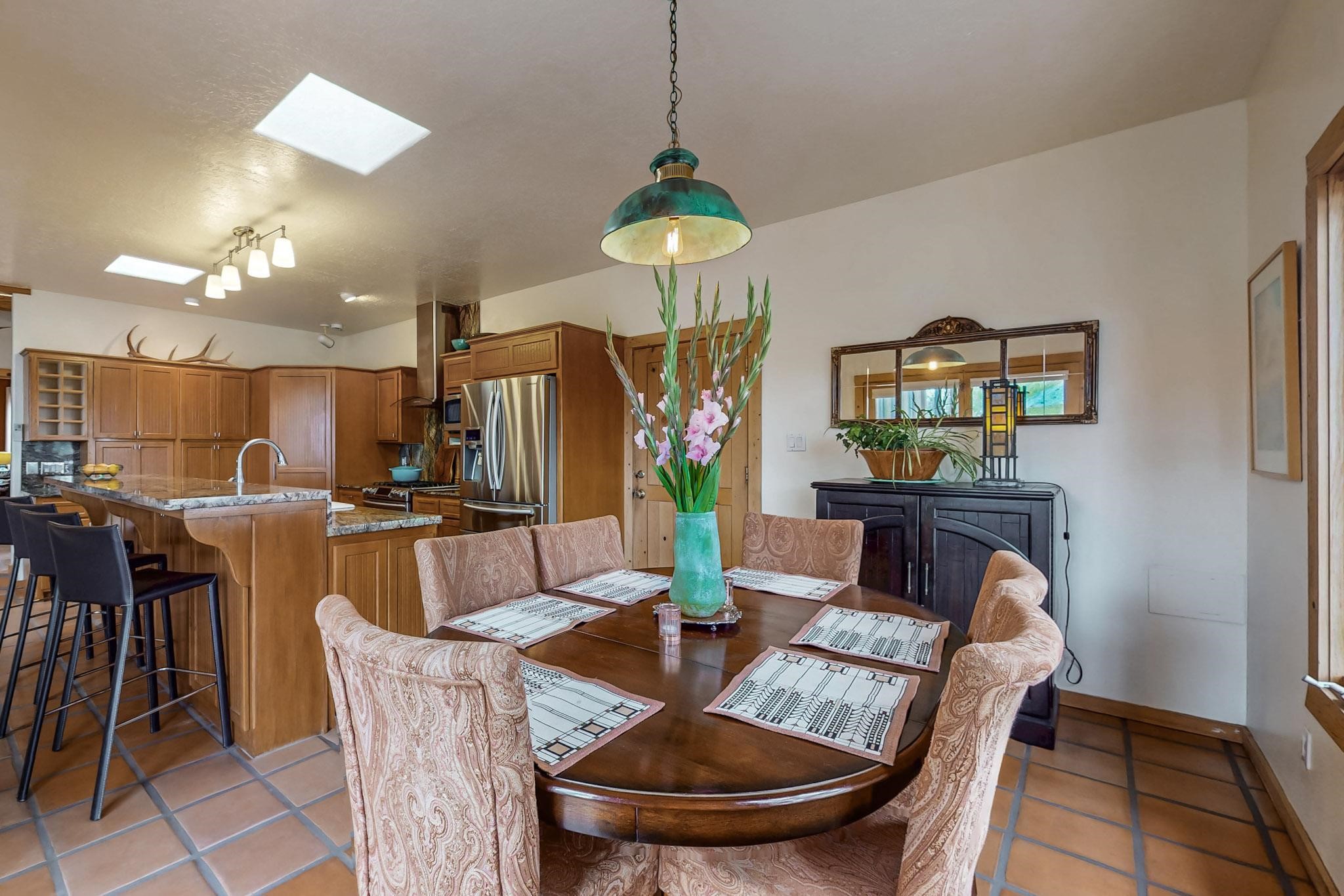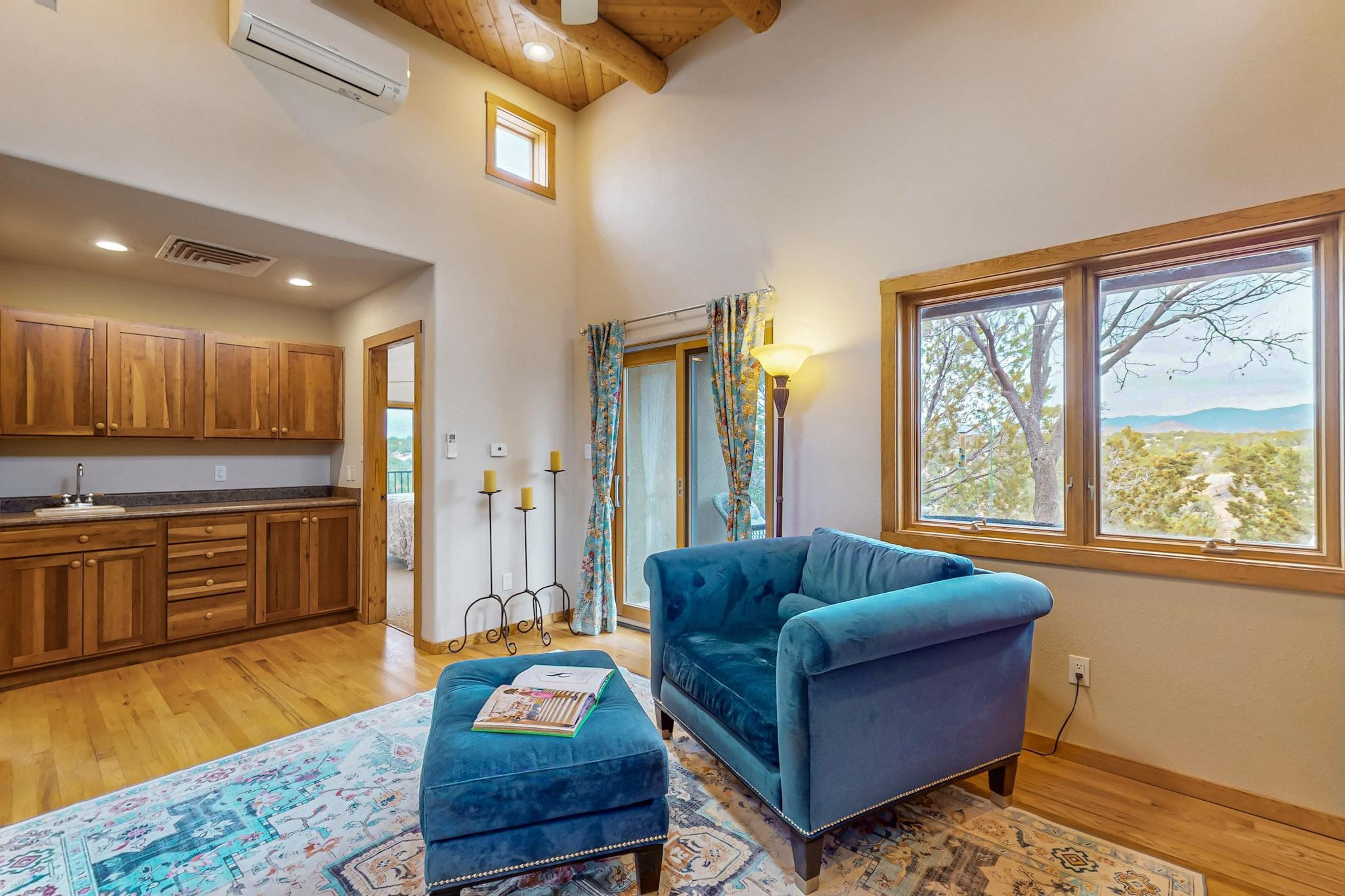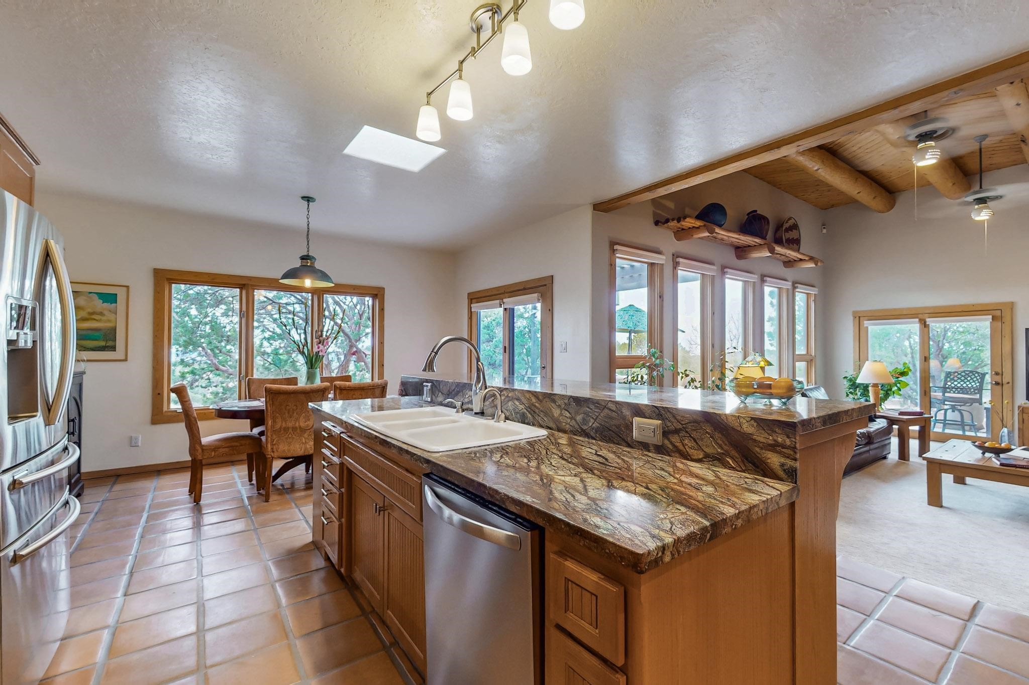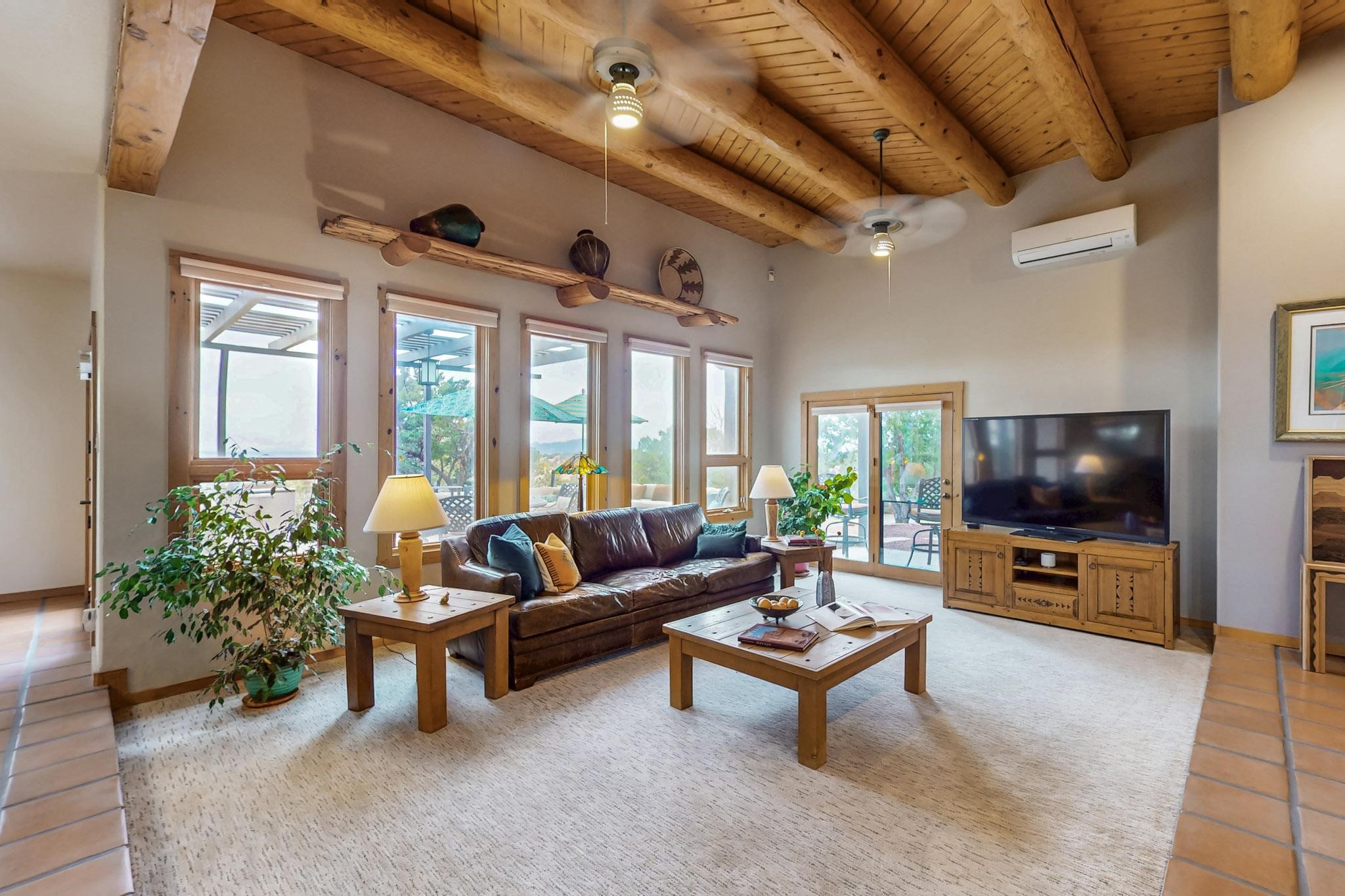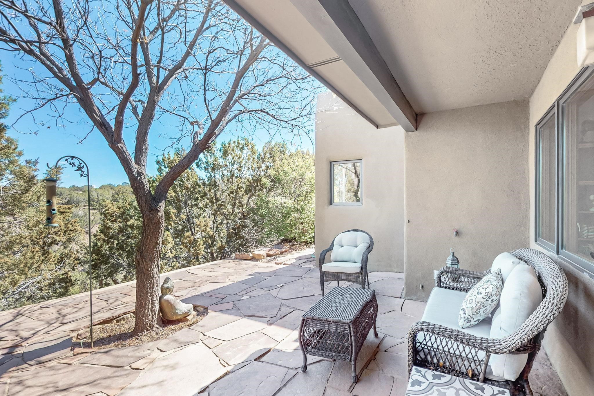 At the very end of a private road, where the world quiets and the landscape opens wide, you'll discover a hidden gem--an exceptional home perched above a sweeping arroyo, offering complete privacy and awe-inspiring panoramic views. This beautifully designed 4-bedroom, 3-bath home sits on 10 pristine acres in a small enclave that has been cherished by a single owner. From nearly every window and outdoor space, you'll be captivated by unobstructed vistas that stretch across the Galisteo Basin, Ortiz Mountains, Sandias, the majestic Sangre de Cristo range. Here, the sunsets paint the sky with color and the stars shine brighter than you've ever seen. Crafted by Jade Enterprises, the home features warm Southwest architectural touches, including hand-hewn vigas, high ceilings, and custom wood doors by local artisan Larry DeLeon. The open-concept kitchen with elegant serpentine stone countertops flows seamlessly into a generous living area, anchored by a beautiful fireplace and oriented toward some of the home's best views. The private primary suite occupies its own wing and includes a luxurious ensuite bath with a soaking tub, two-headed shower, walk-in closet, and a serene private patio. Two additional bedrooms at the rear of the home share a Jack-and-Jill bathroom and are joined by a flexible entertainment room with a wet bar and access to both the front and back outdoor living spaces. The oversized 2-car garage has cabinets, ample storage space, and a custom workbench. Outside, a fenced yard features a cozy flagstone fire-pit with seating, a spacious patio ideal for outdoor cooking, and a garden space ready for your vision. Every angle of this home was thoughtfully designed to celebrate the natural beauty that surrounds it. This is more than a home--it's a rare opportunity to own a piece of the New Mexico landscape, where peace, privacy, and panoramic beauty come together in perfect harmony. Covenants allow for additional casita/studio subject to HOA approval. Come see it.