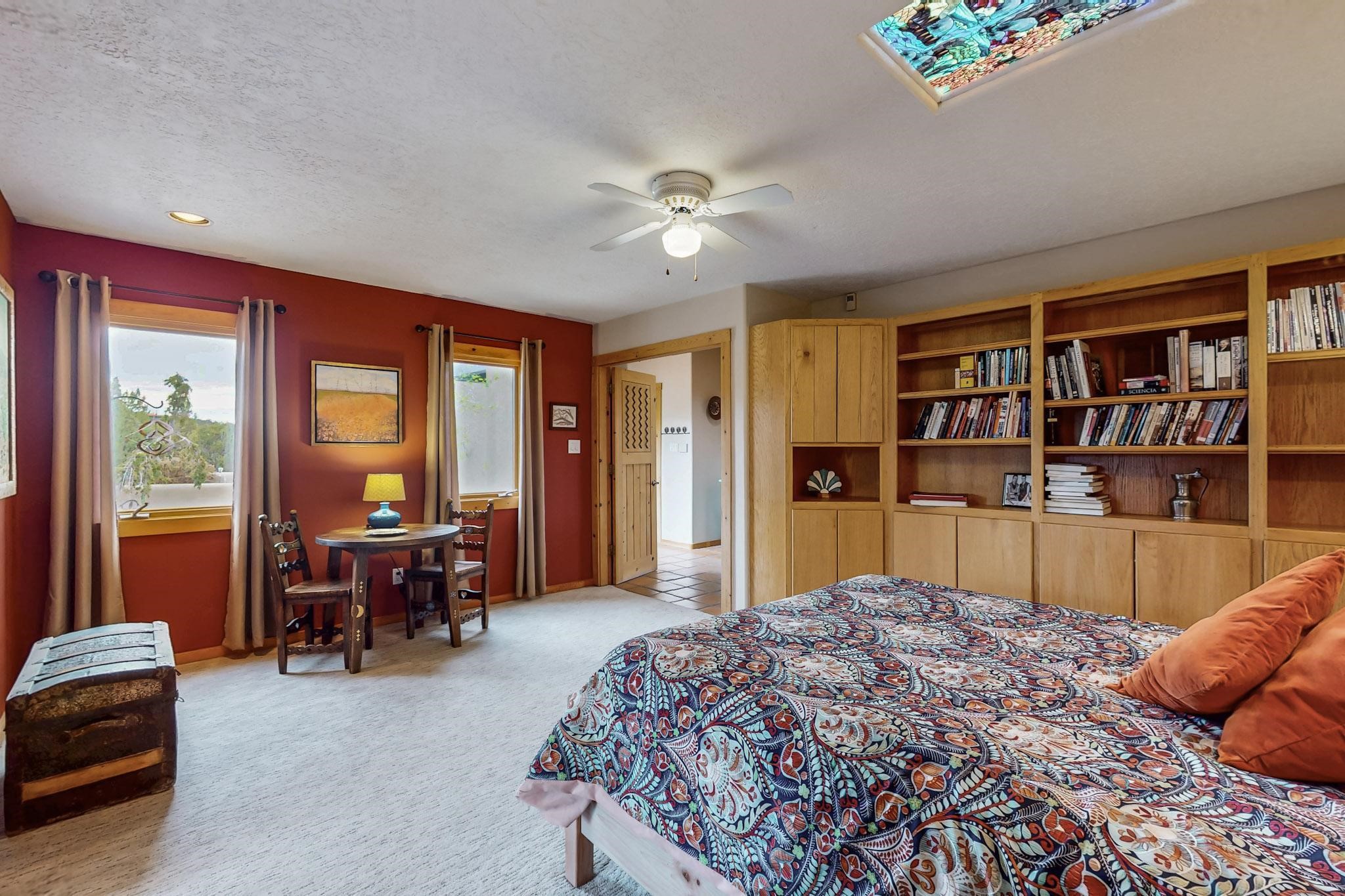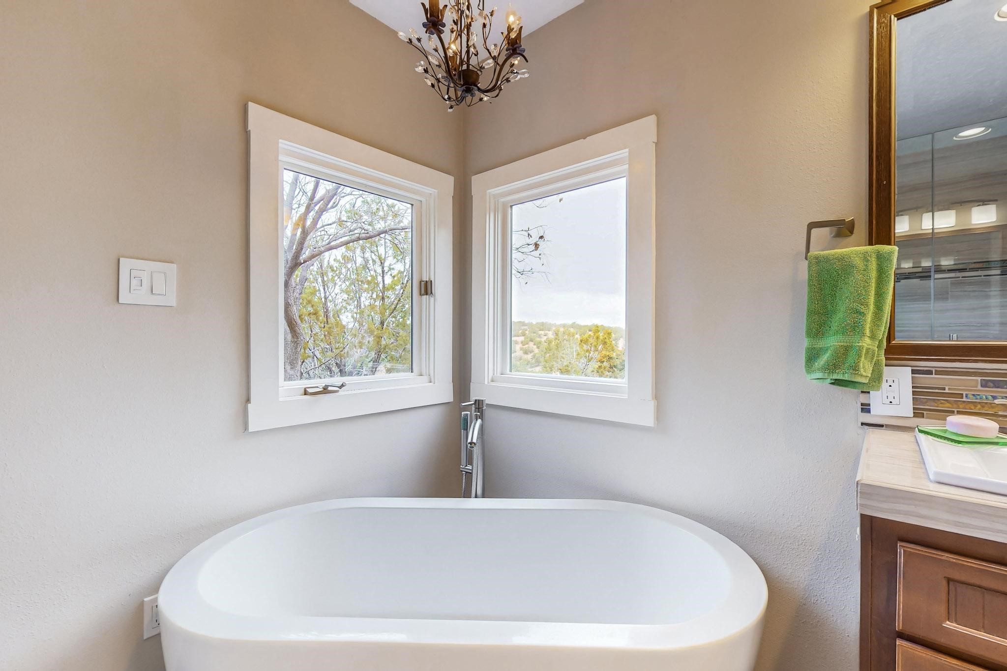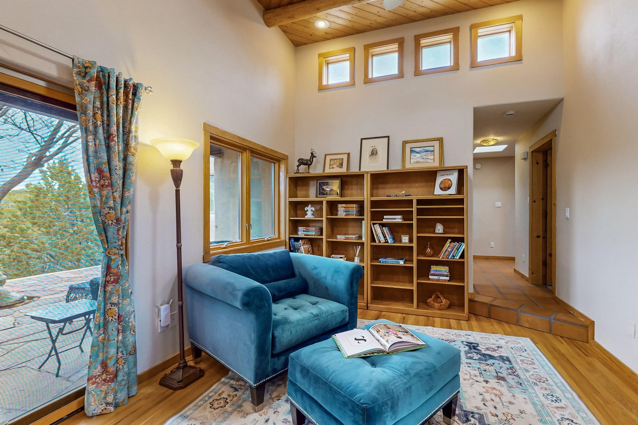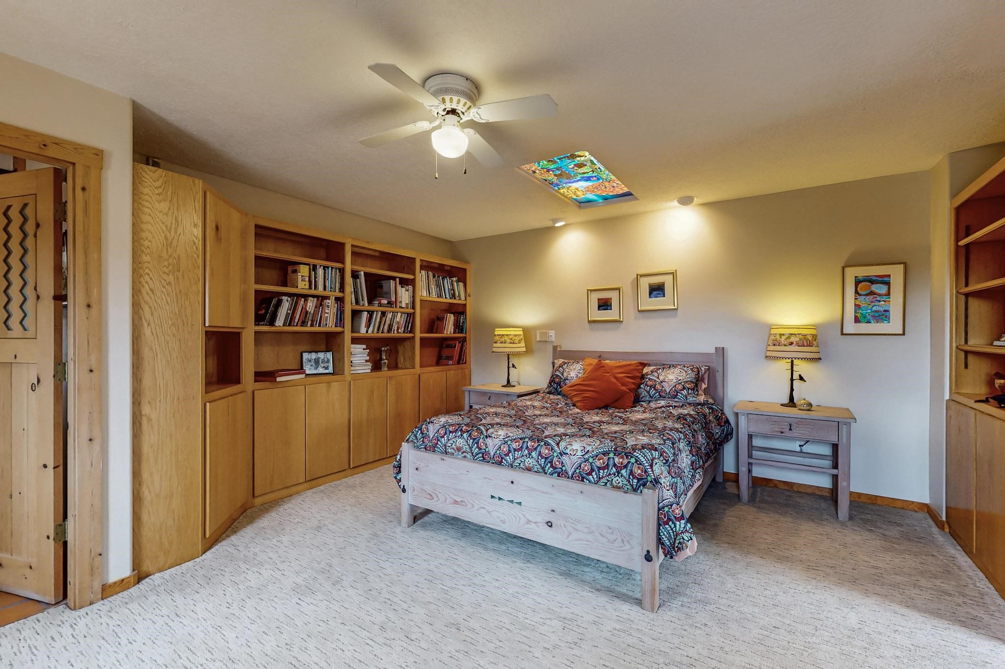 At the very end of a private road, where the world quiets and the landscape opens wide, you'll discover a hidden gem--an exceptional home perched above a sweeping arroyo, offering complete privacy and awe-inspiring panoramic views. This beautifully designed 4-bedroom, 3-bath home sits on 10 pristine acres in a small enclave that has been cherished by a single owner. From nearly every window and outdoor space, you'll be captivated by unobstructed vistas that stretch across the Galisteo Basin, Ortiz Mountains, Sandias, the majestic Sangre de Cristo range. Here, the sunsets paint the sky with color and the stars shine brighter than you've ever seen. Crafted by Jade Enterprises, the home features warm Southwest architectural touches, including hand-hewn vigas, high ceilings, and custom wood doors by local artisan Larry DeLeon. The open-concept kitchen with elegant serpentine stone countertops flows seamlessly into a generous living area, anchored by a beautiful fireplace and oriented toward some of the home's best views. The private primary suite occupies its own wing and includes a luxurious ensuite bath with a soaking tub, two-headed shower, walk-in closet, and a serene private patio. Two additional bedrooms at the rear of the home share a Jack-and-Jill bathroom and are joined by a flexible entertainment room with a wet bar and access to both the front and back outdoor living spaces. The oversized 2-car garage has cabinets, ample storage space, and a custom workbench. Outside, a fenced yard features a cozy flagstone fire-pit with seating, a spacious patio ideal for outdoor cooking, and a garden space ready for your vision. Every angle of this home was thoughtfully designed to celebrate the natural beauty that surrounds it. This is more than a home--it's a rare opportunity to own a piece of the New Mexico landscape, where peace, privacy, and panoramic beauty come together in perfect harmony. Covenants allow for additional casita/studio subject to HOA approval. Come see it.