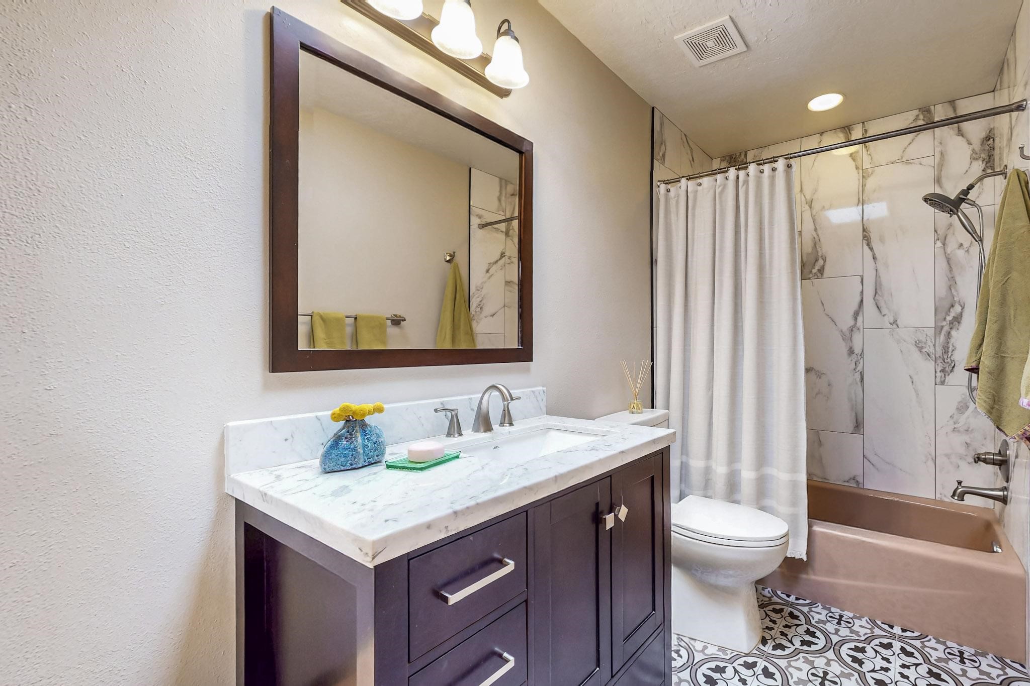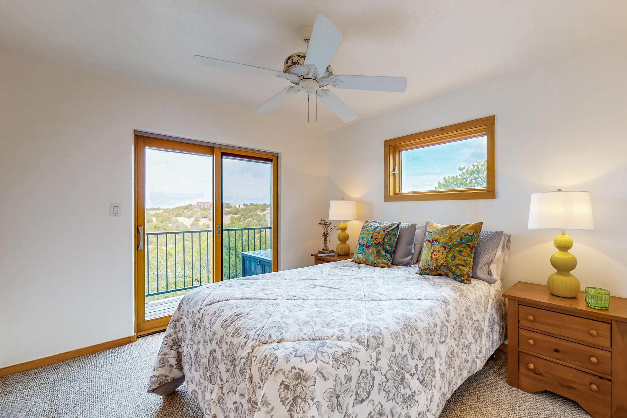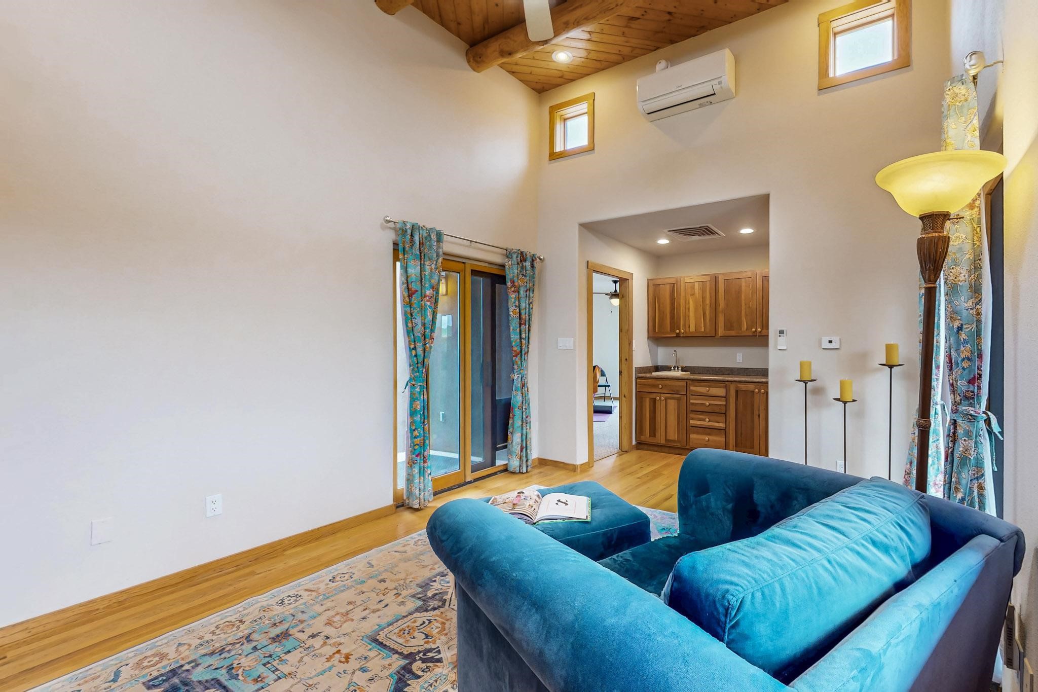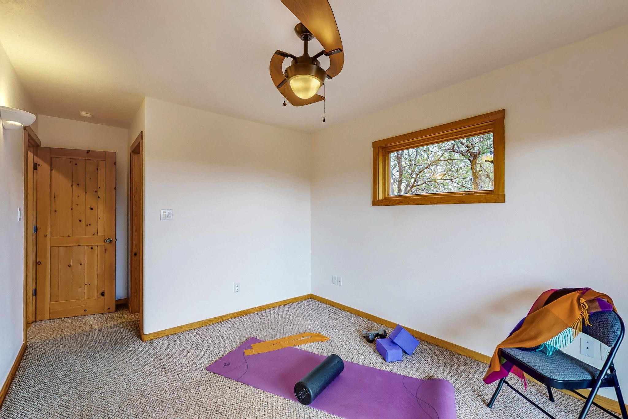 At the very end of a private road, where the world quiets and the landscape opens wide, you'll discover a hidden gem--an exceptional home perched above a sweeping arroyo, offering complete privacy and awe-inspiring panoramic views. This beautifully designed 4-bedroom, 3-bath home sits on 10 pristine acres in a small enclave that has been cherished by a single owner. From nearly every window and outdoor space, you'll be captivated by unobstructed vistas that stretch across the Galisteo Basin, Ortiz Mountains, Sandias, the majestic Sangre de Cristo range. Here, the sunsets paint the sky with color and the stars shine brighter than you've ever seen. Crafted by Jade Enterprises, the home features warm Southwest architectural touches, including hand-hewn vigas, high ceilings, and custom wood doors by local artisan Larry DeLeon. The open-concept kitchen with elegant serpentine stone countertops flows seamlessly into a generous living area, anchored by a beautiful fireplace and oriented toward some of the home's best views. The private primary suite occupies its own wing and includes a luxurious ensuite bath with a soaking tub, two-headed shower, walk-in closet, and a serene private patio. Two additional bedrooms at the rear of the home share a Jack-and-Jill bathroom and are joined by a flexible entertainment room with a wet bar and access to both the front and back outdoor living spaces. The oversized 2-car garage has cabinets, ample storage space, and a custom workbench. Outside, a fenced yard features a cozy flagstone fire-pit with seating, a spacious patio ideal for outdoor cooking, and a garden space ready for your vision. Every angle of this home was thoughtfully designed to celebrate the natural beauty that surrounds it. This is more than a home--it's a rare opportunity to own a piece of the New Mexico landscape, where peace, privacy, and panoramic beauty come together in perfect harmony. Covenants allow for additional casita/studio subject to HOA approval. Come see it.